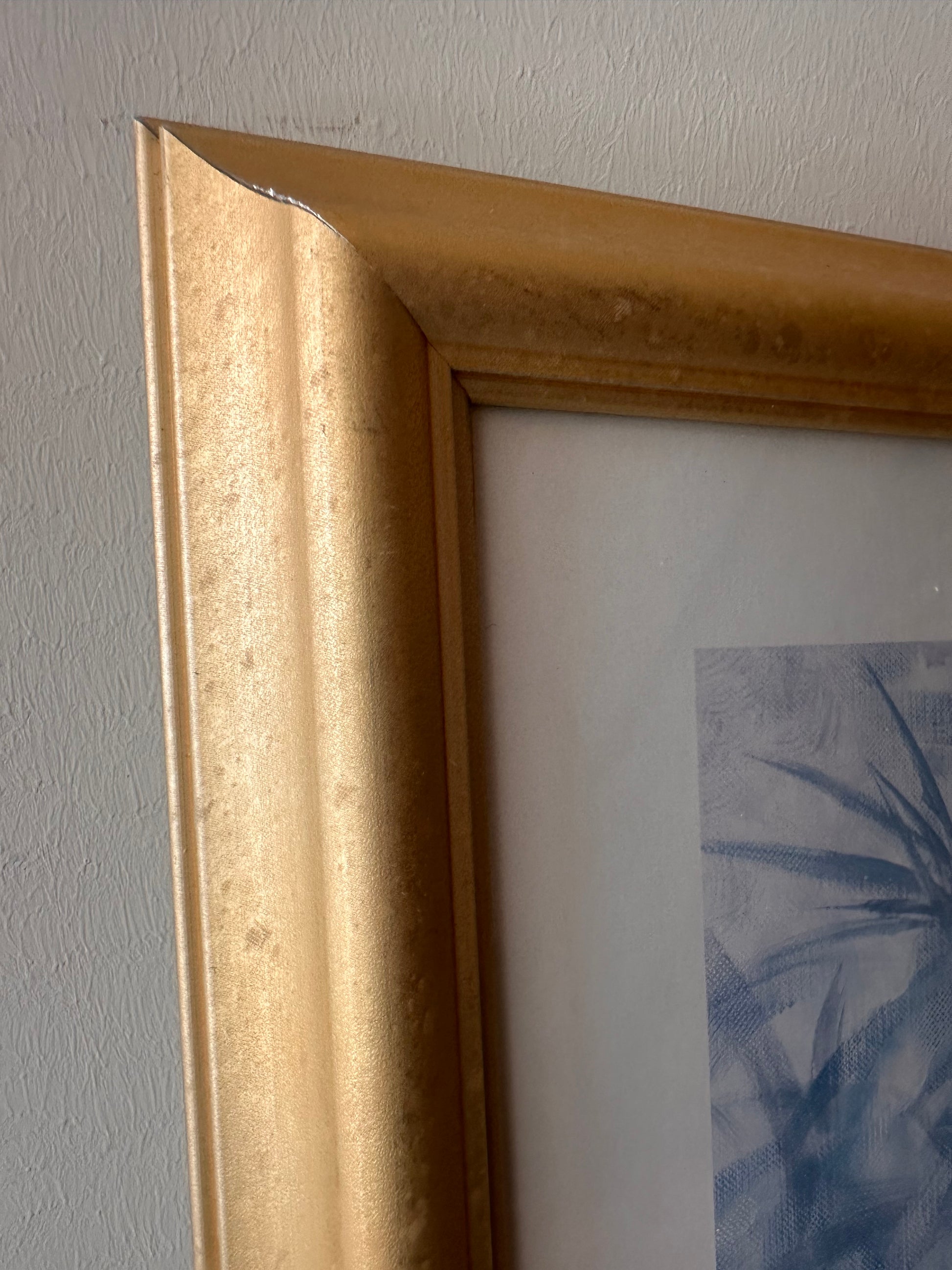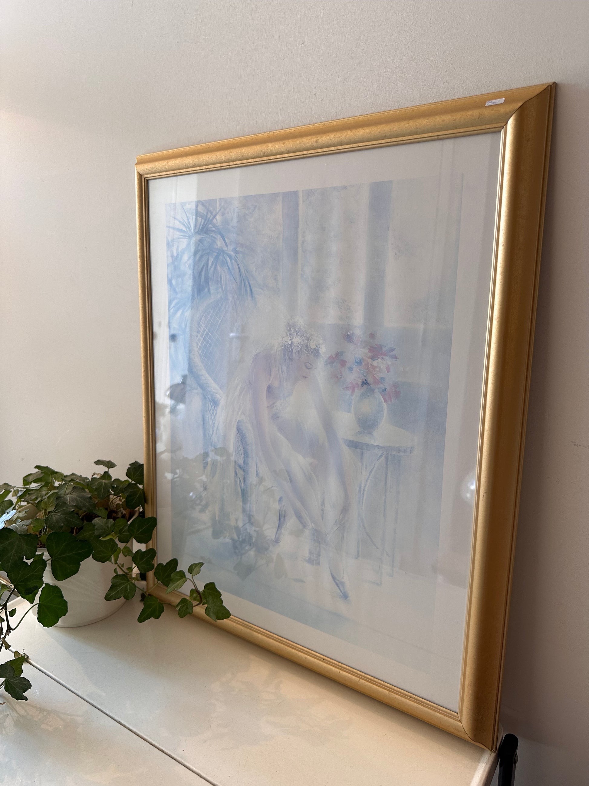Dromerige prent van een ballerina in zachte pasteltinten, in een vintage lijst met matte goudkleur. De sfeer is echt jaren 80: romantisch, licht en een tikje dromerig. De lijst heeft wat gebruikssporen, maar past perfect bij het zachte karakter van de afbeelding. De afbeelding is in het “echt” duidelijker dan hij op de foto overkomt. Q172