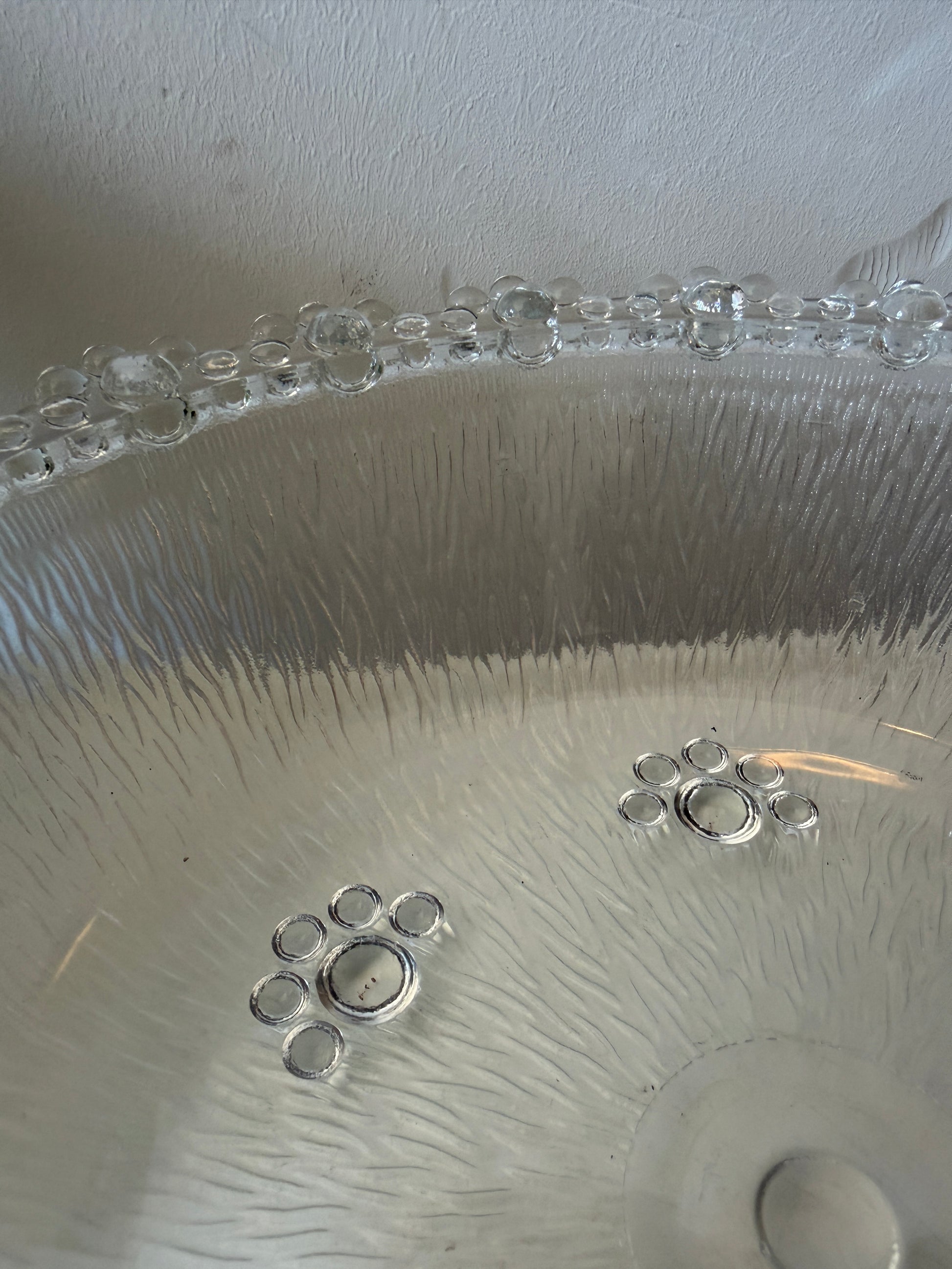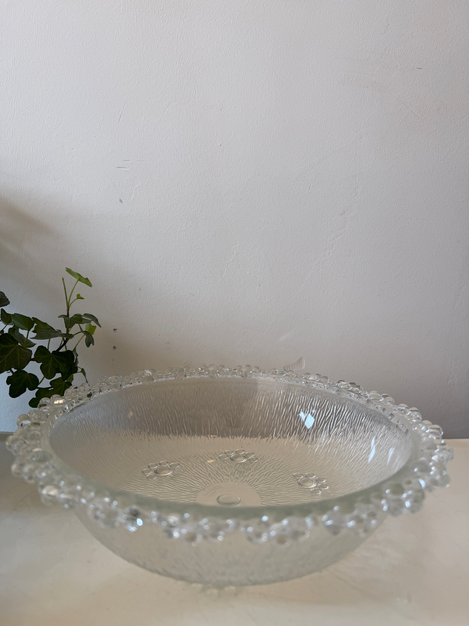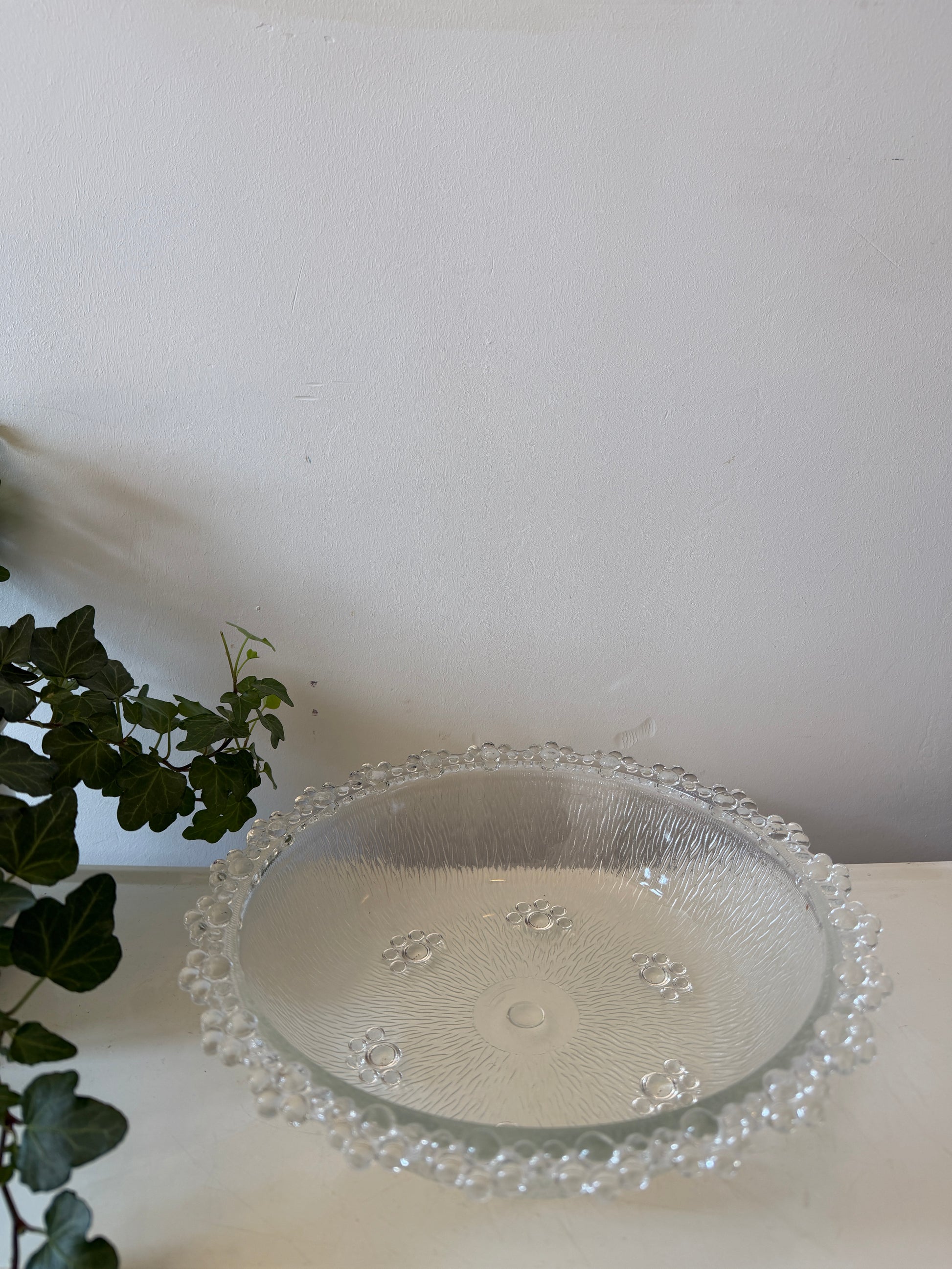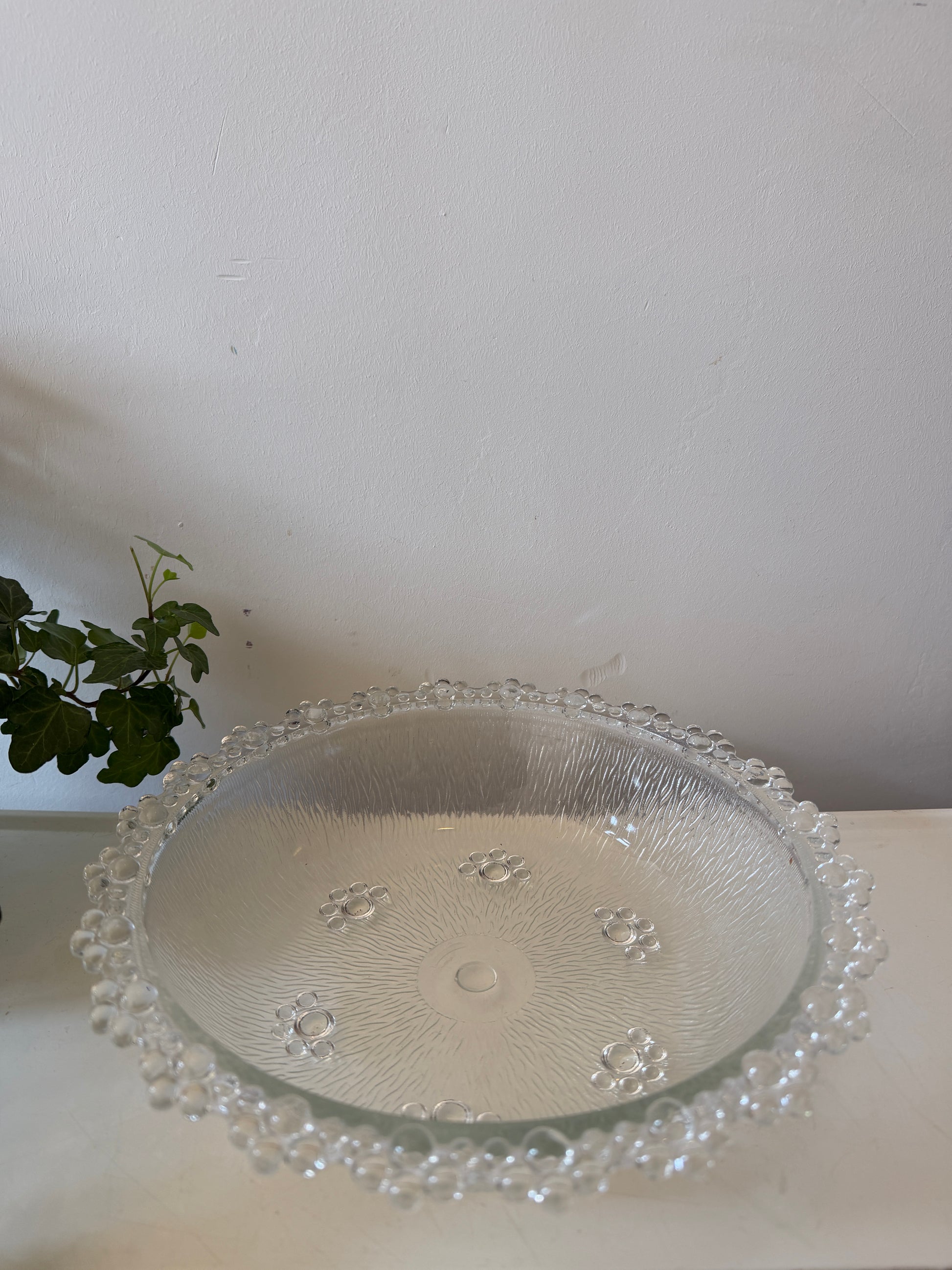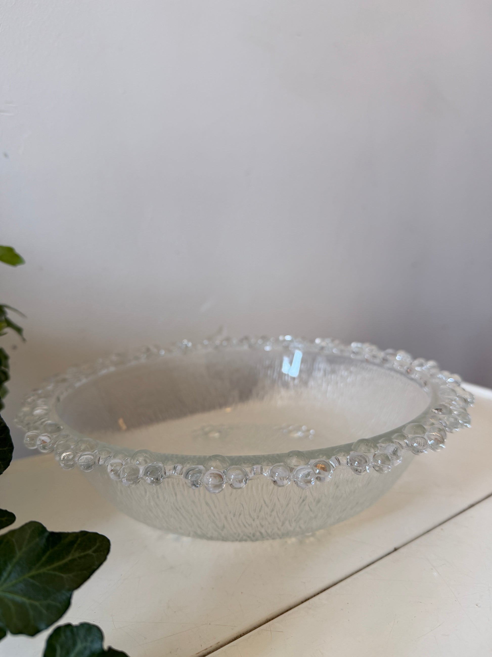 Hele mooie glazen schaal met een matte structuur aan de binnenkant en een rand vol bolletjes rondom. Mooie lage vorm met kleine verhoging in het midden en subtiele details in het glas. Q115