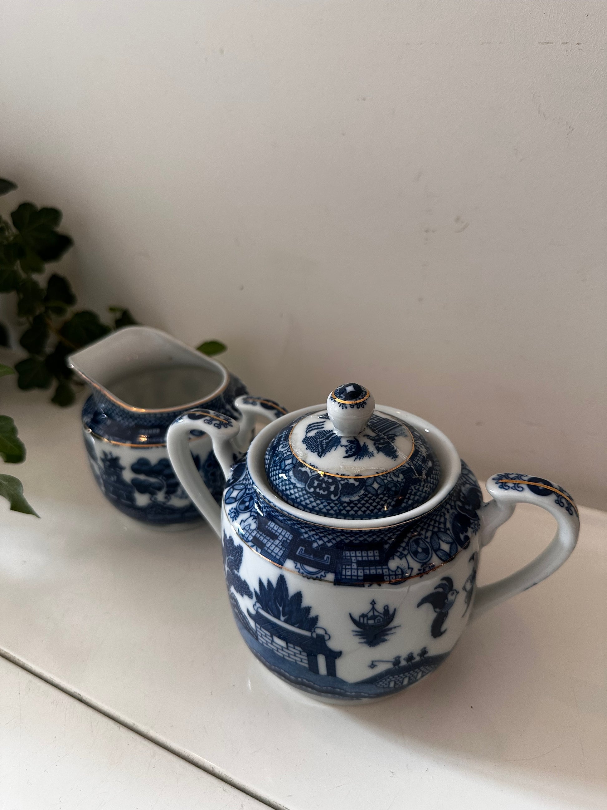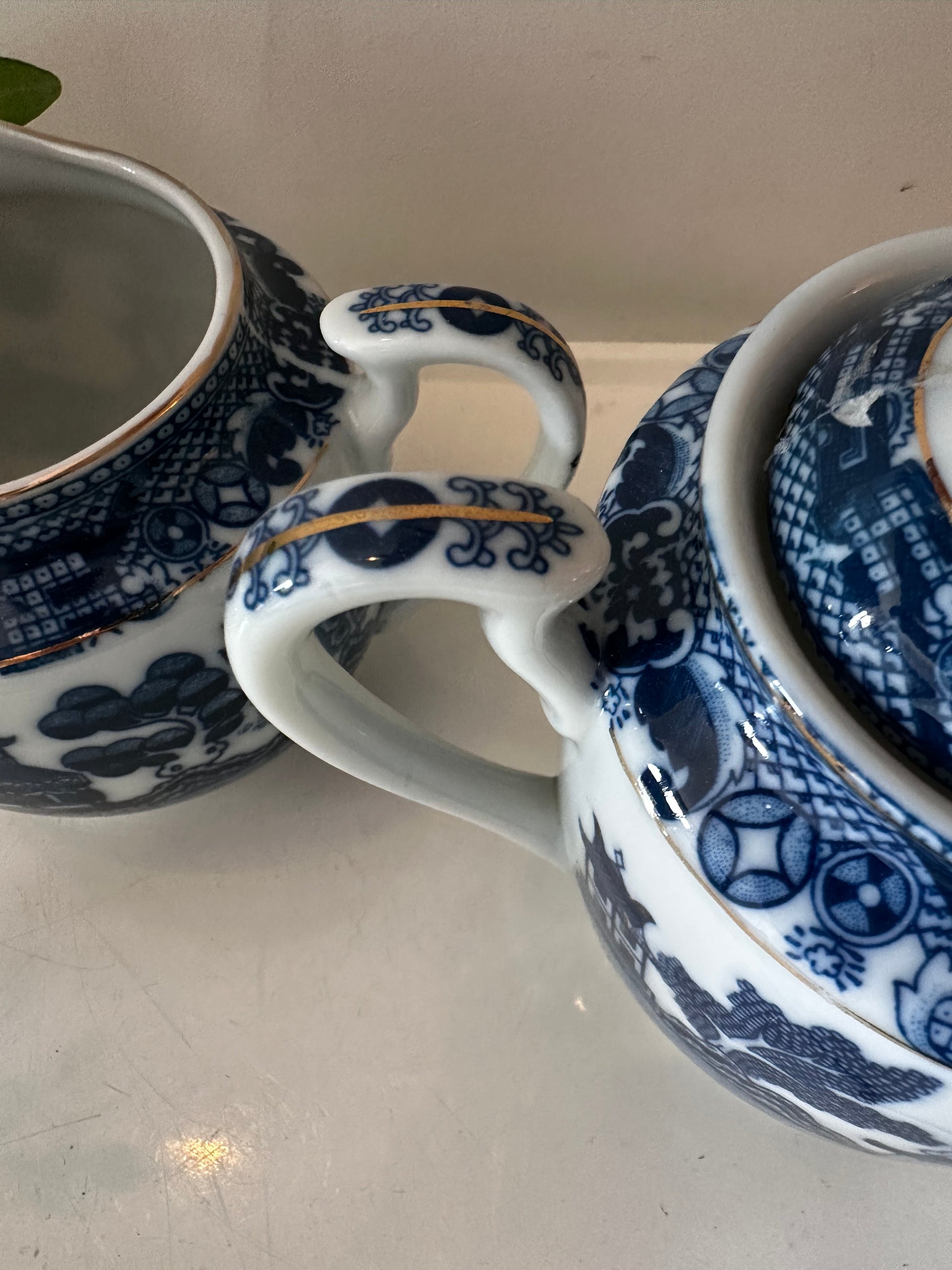 Prachtig porseleinen setje met het iconische Blue Willow patroon: een klassiek blauw-wit landschap met tempels, bruggetjes en bomen. Dit decor is geïnspireerd op Chinees porselein en werd vooral populair in Engeland vanaf de 18e eeuw. Q13