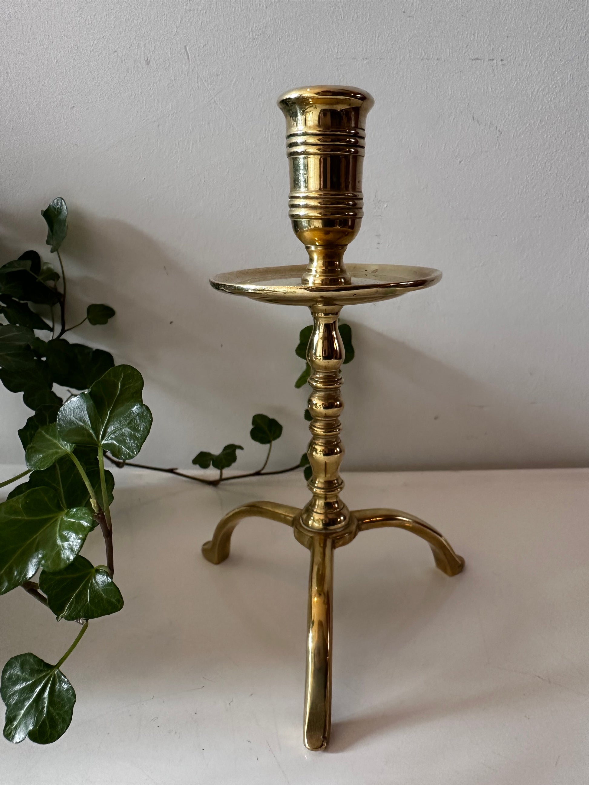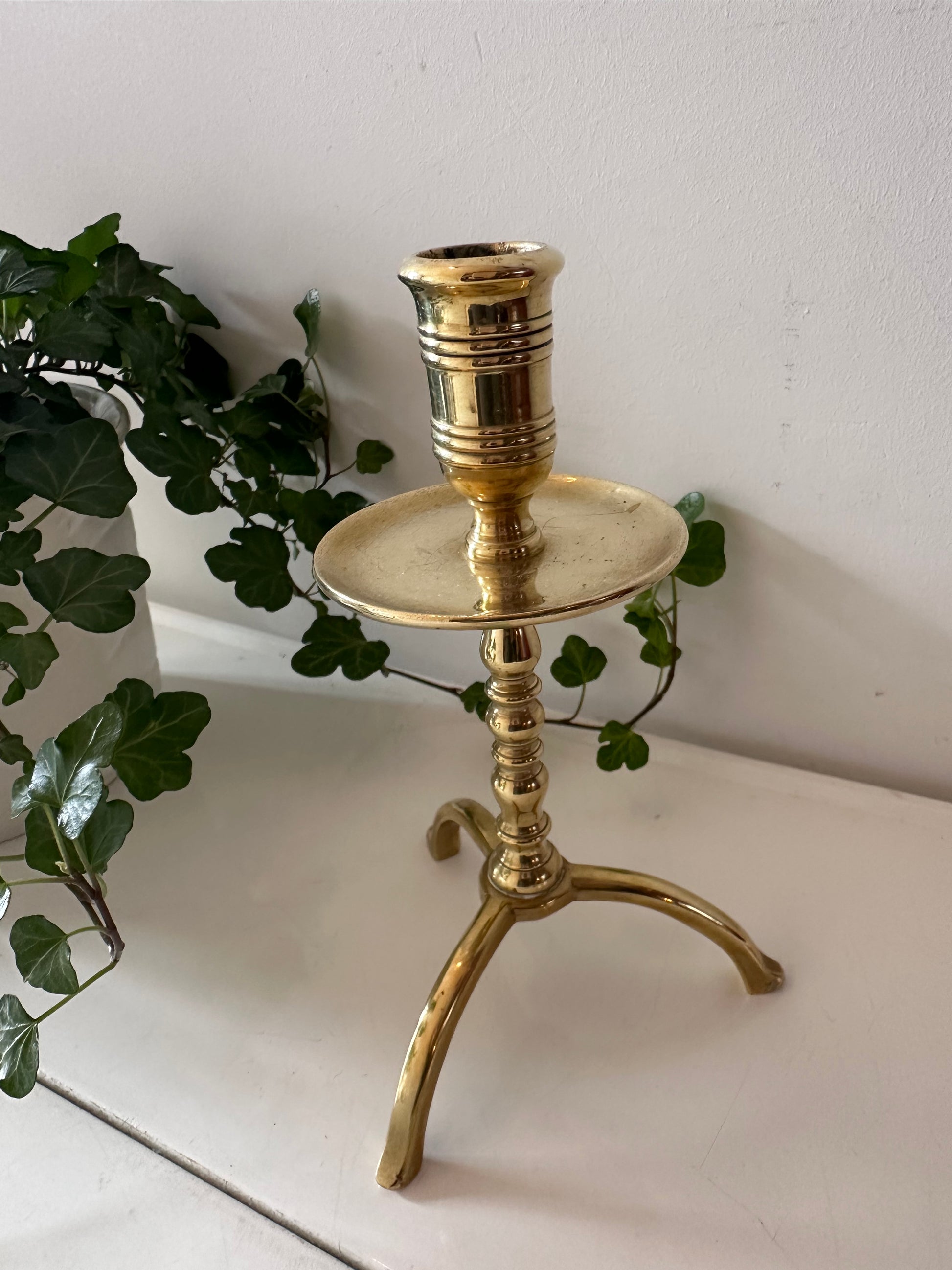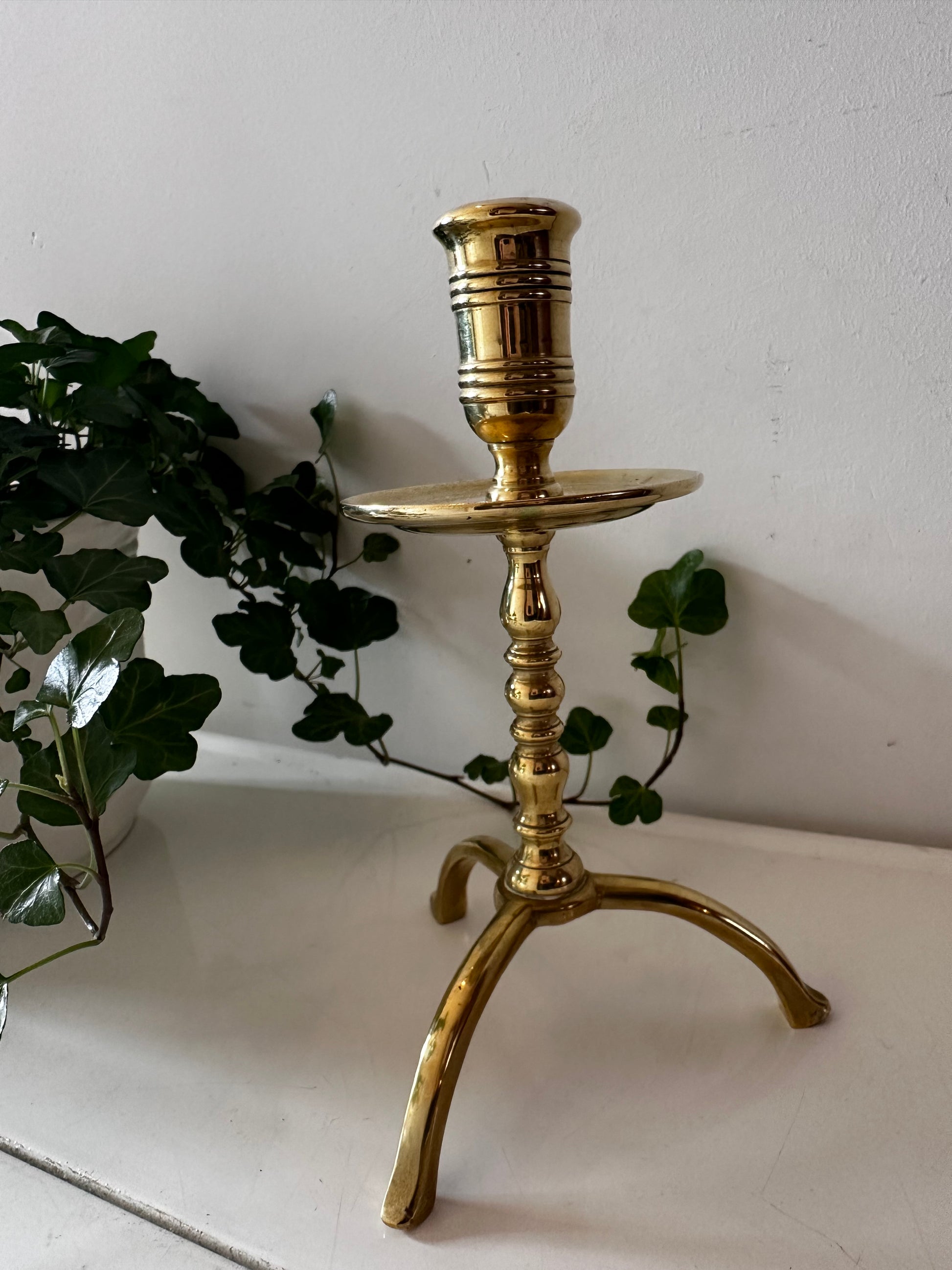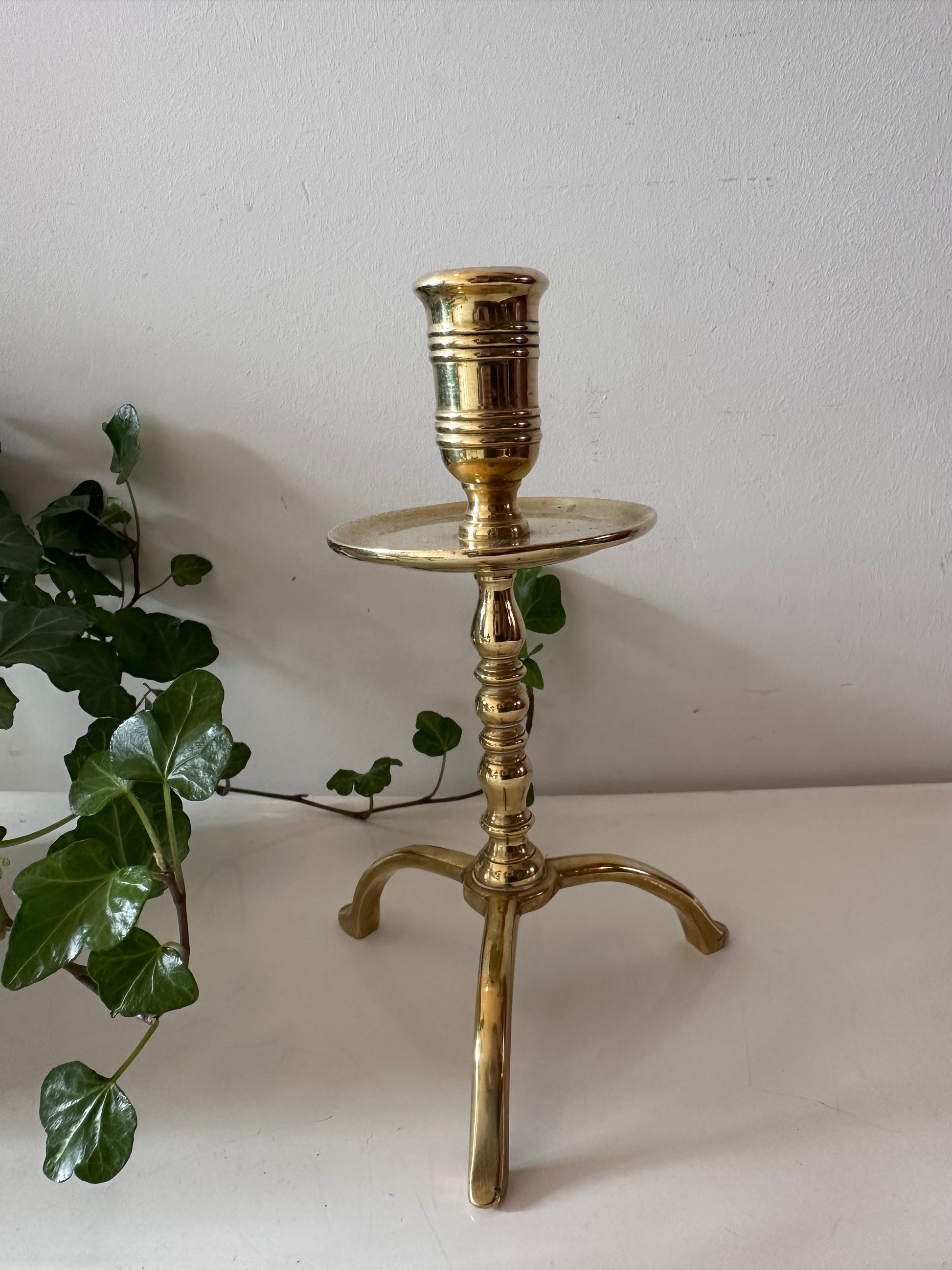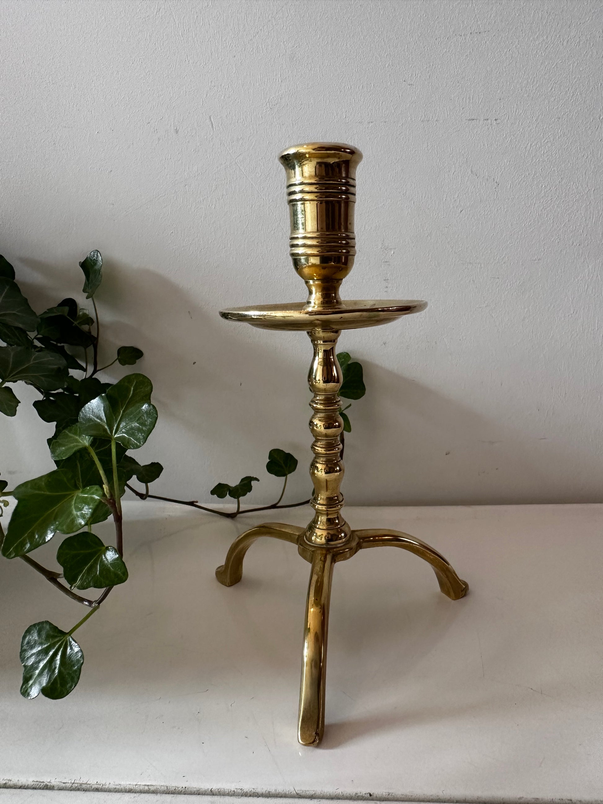 Een prachtige vintage messing kandelaar met een elegante vorm. Staat op een driepoot voet. In een supermooie vintage staat. Q732