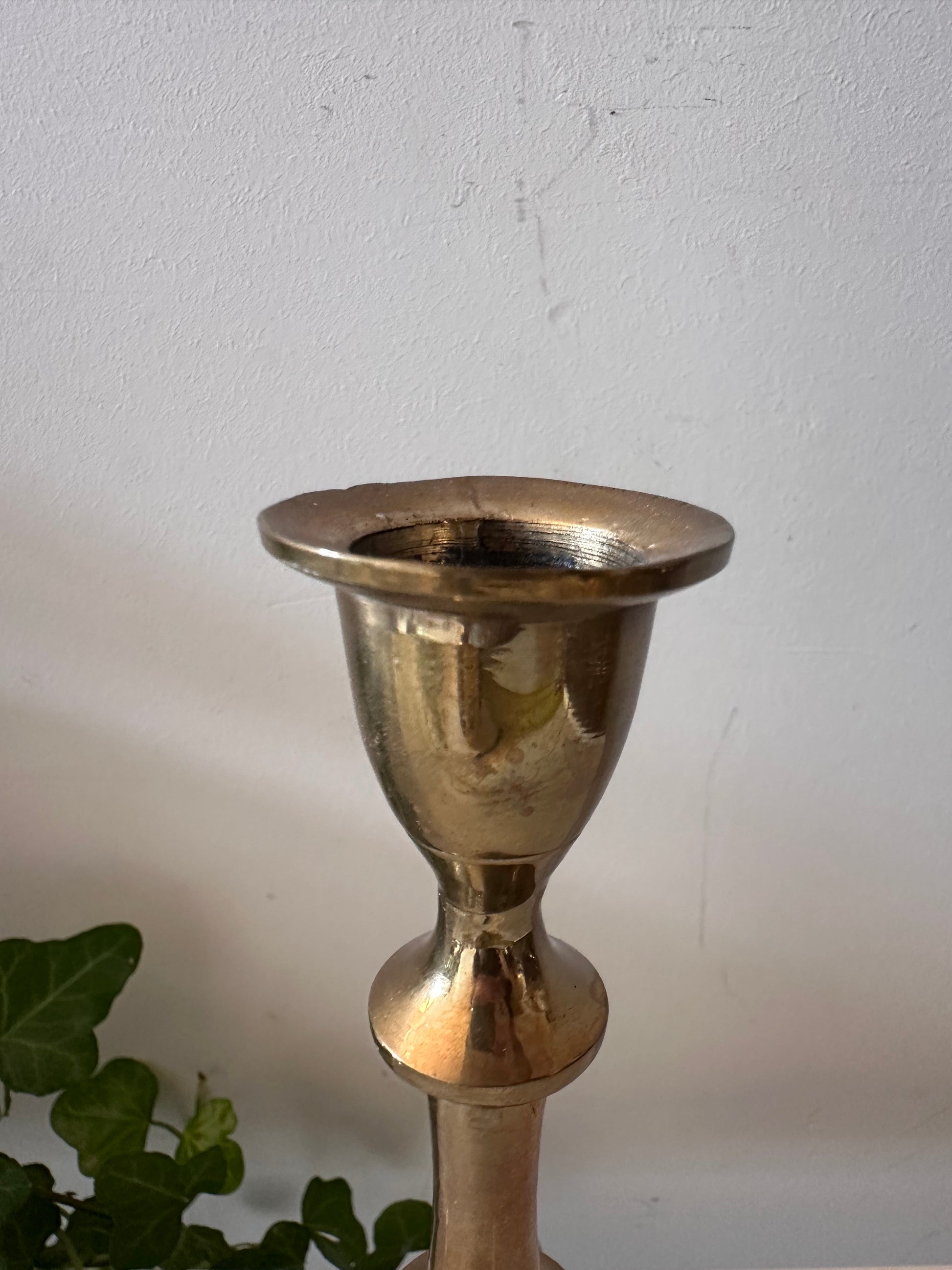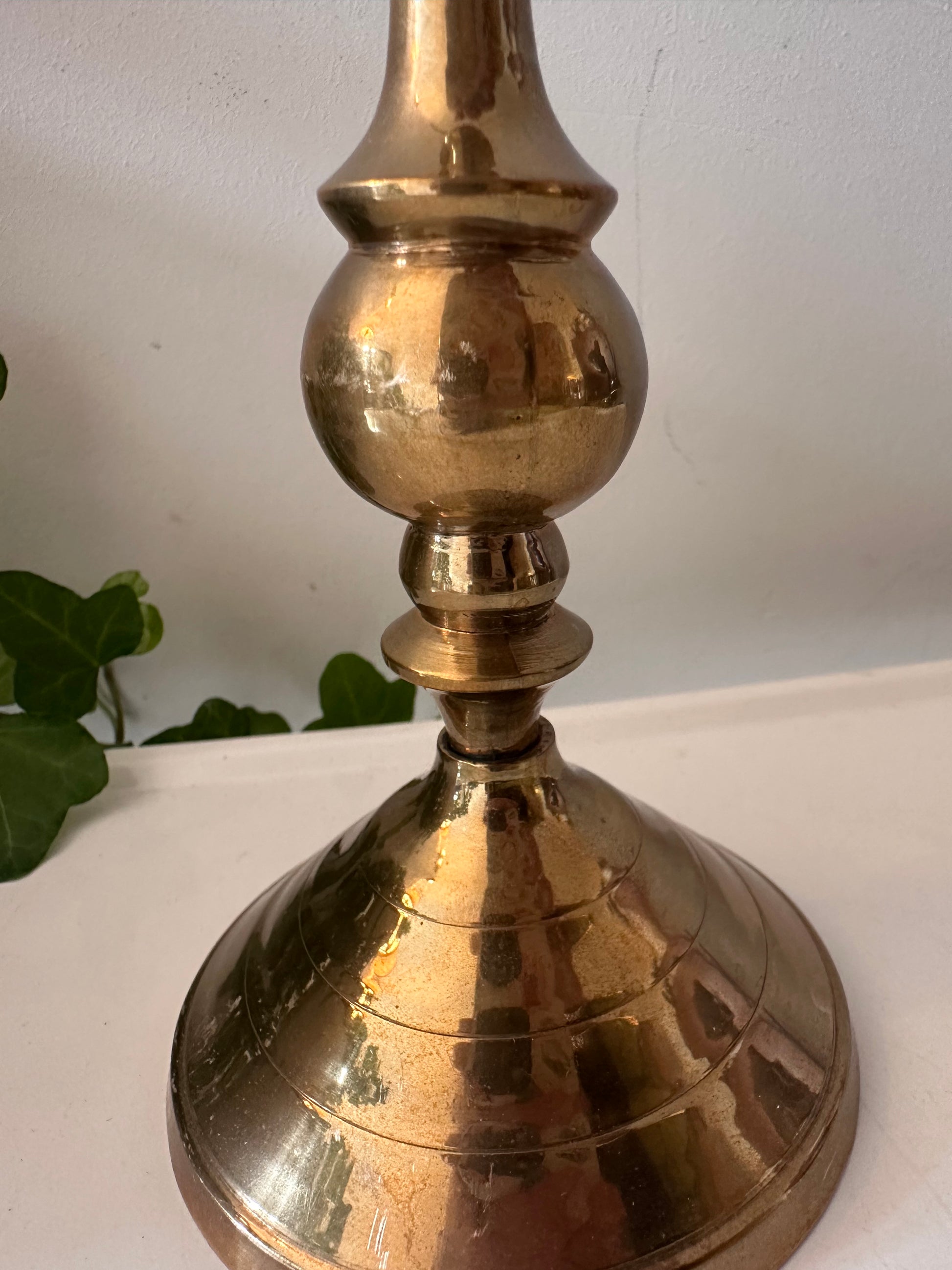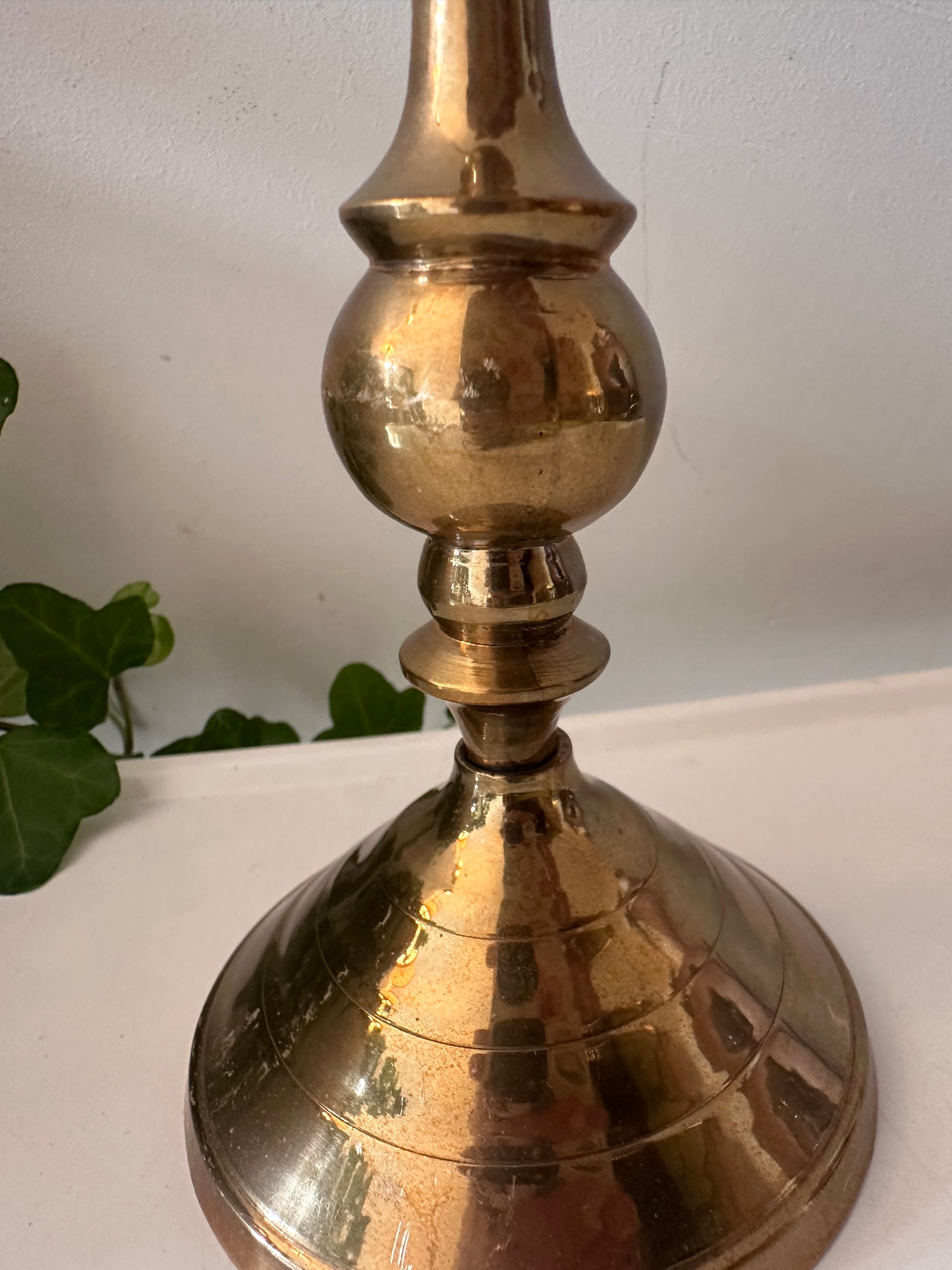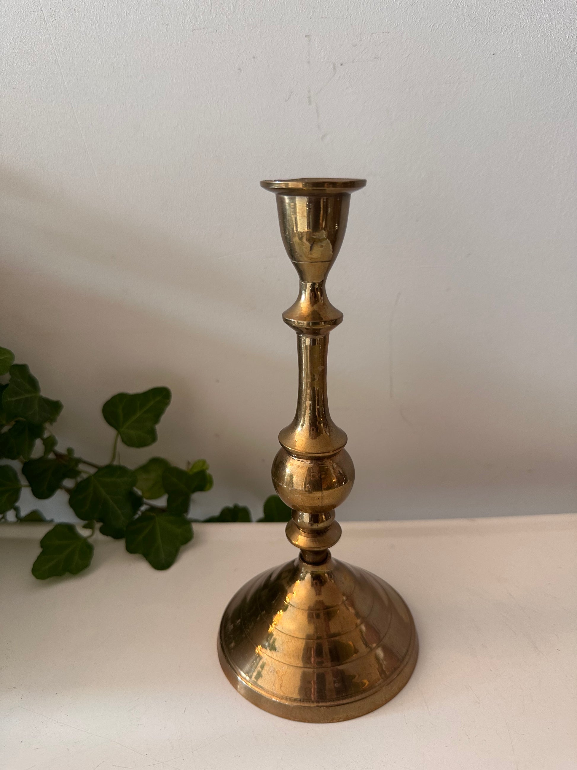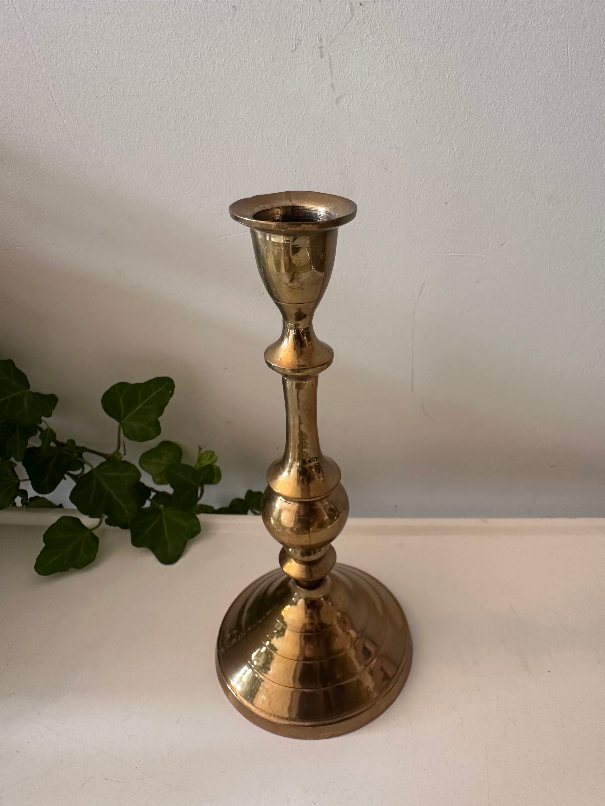 Hele mooie vintage messing kandelaar met een warme glans en tijdloze look. Klassiek model met ringen in de voet. Q537