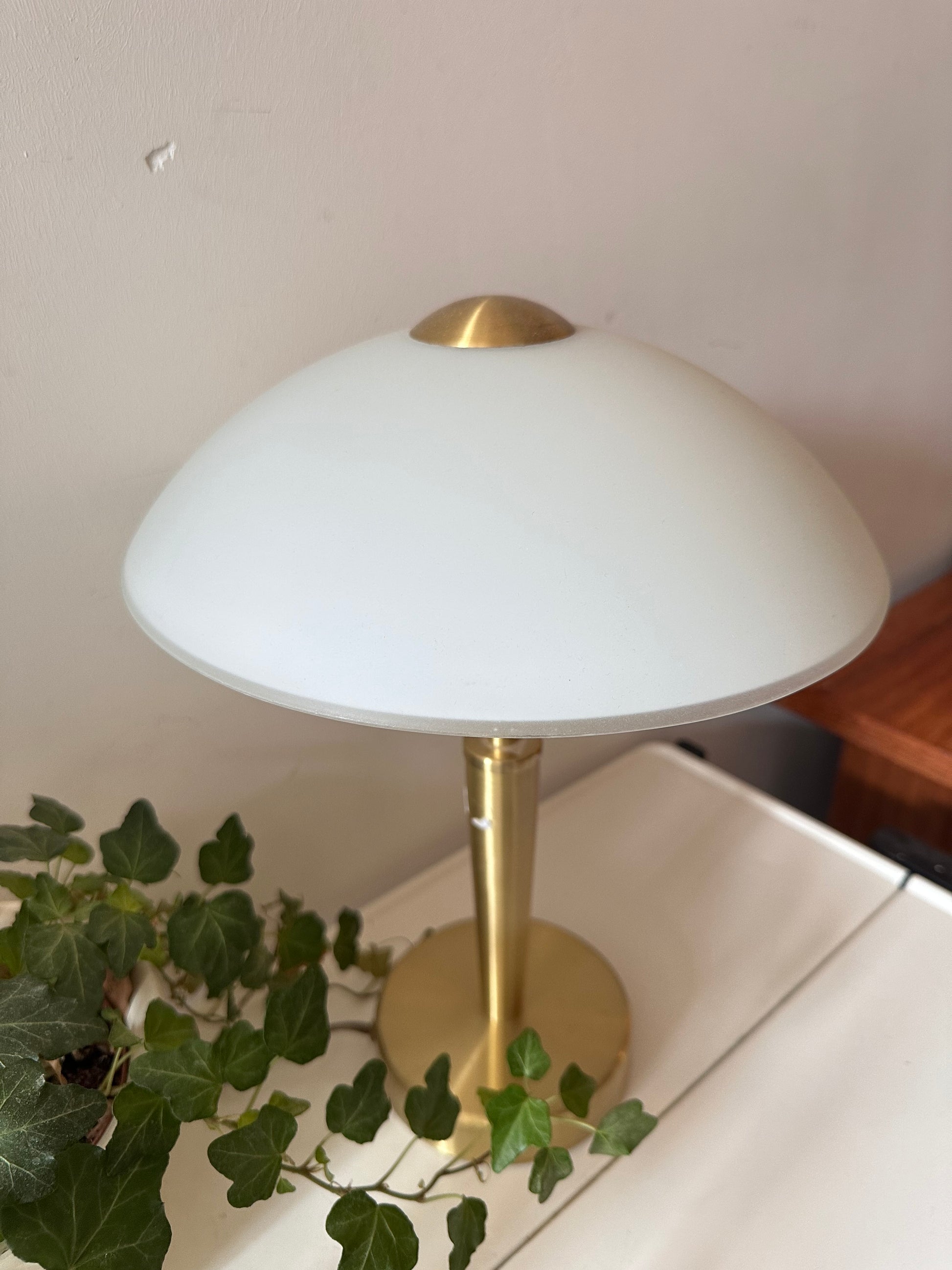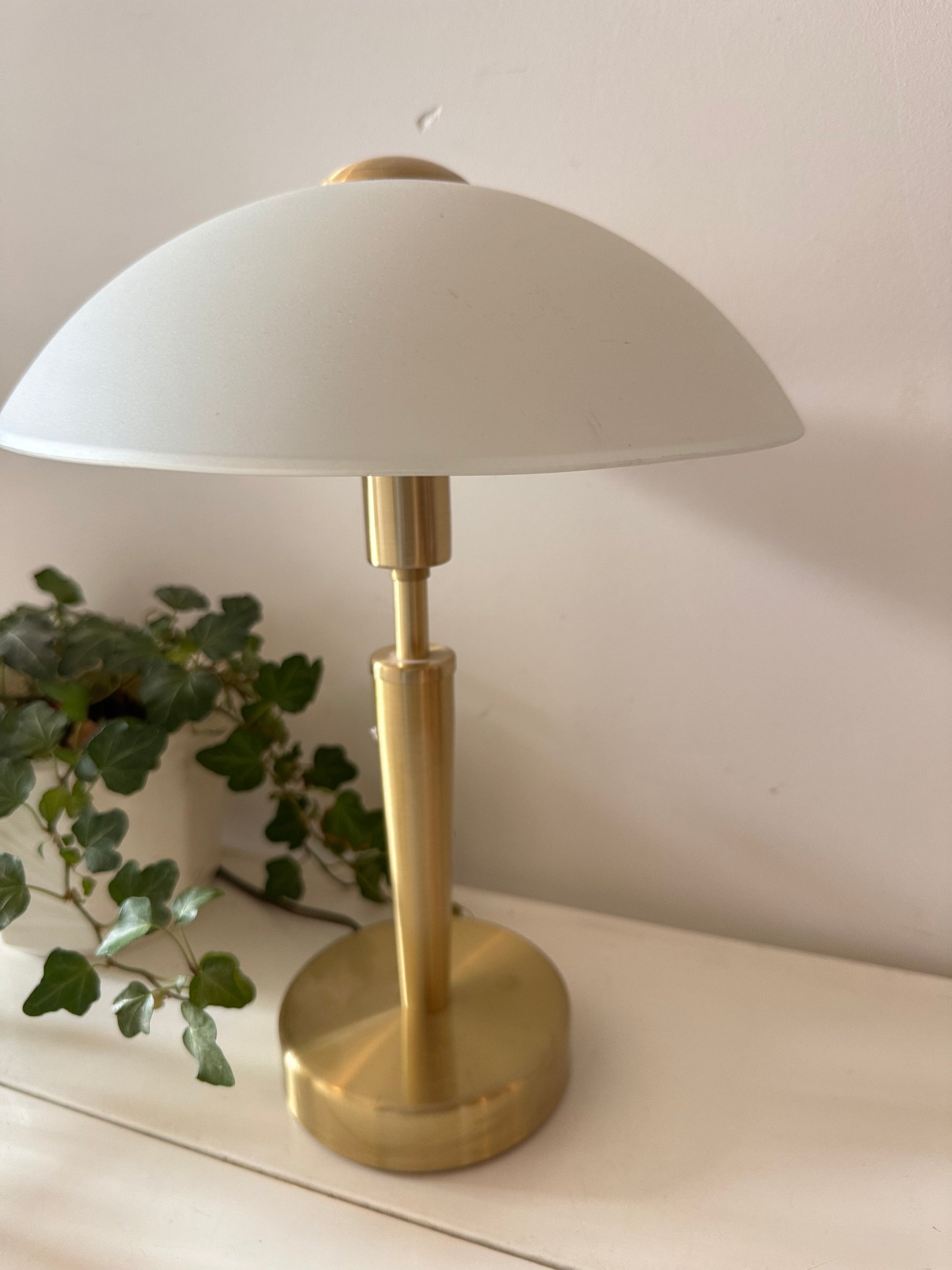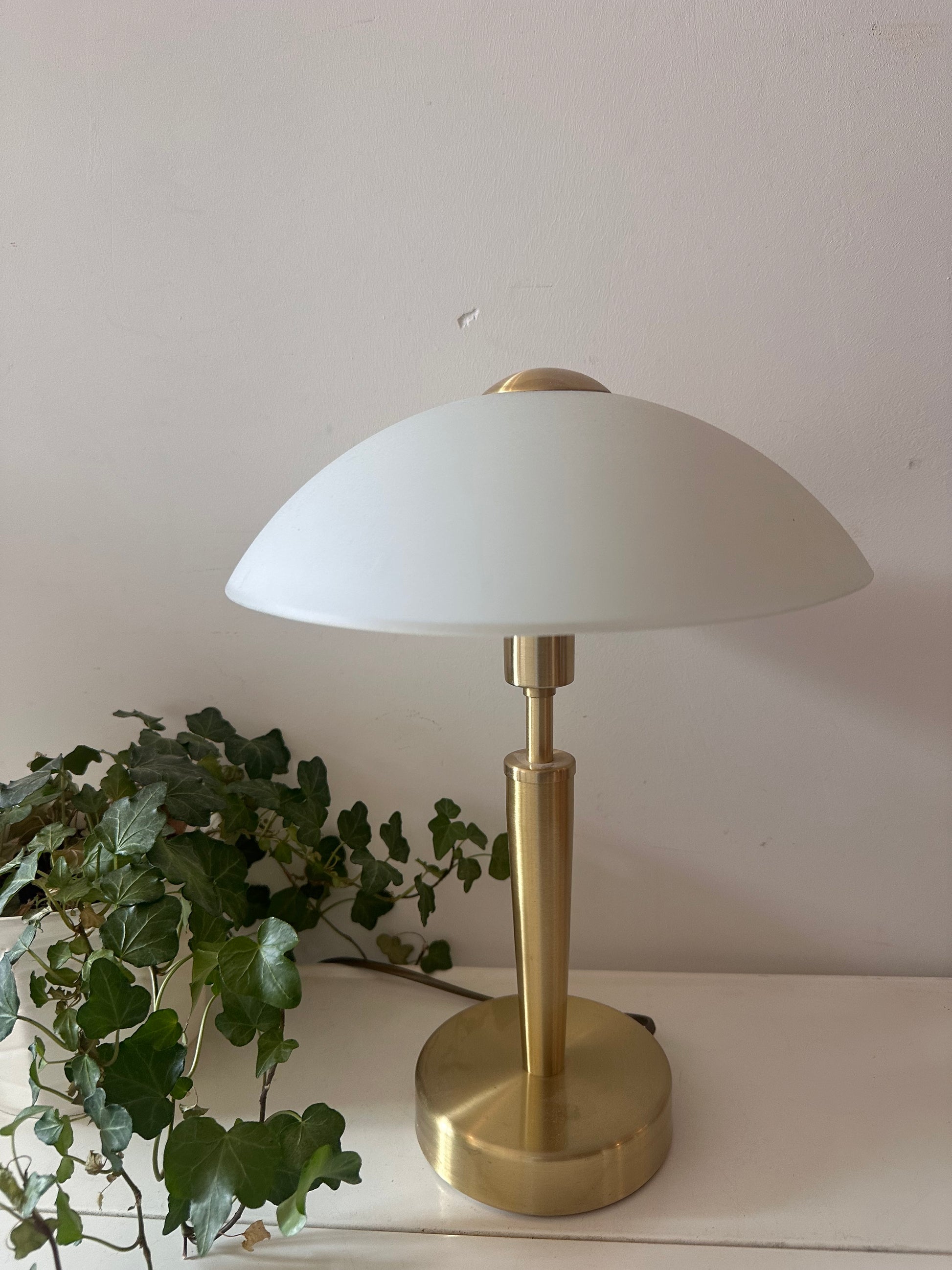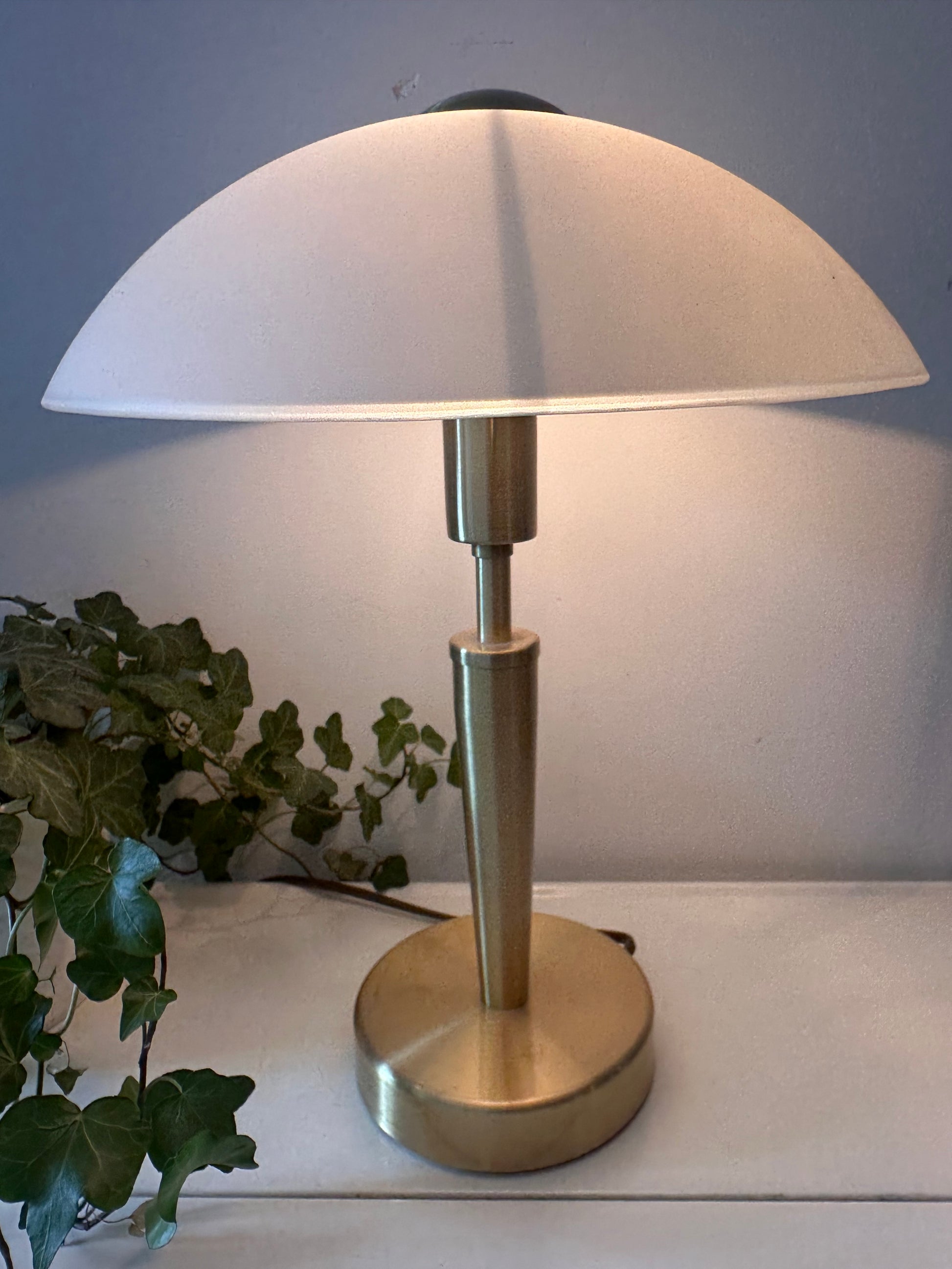 Chique en strak tegelijk – deze lamp heeft een messing voet en steel met een zachte, matte glazen kap in mushroom-vorm. Hij werkt op touch en heeft drie lichtstanden. In een mooie vintage staat! Q219