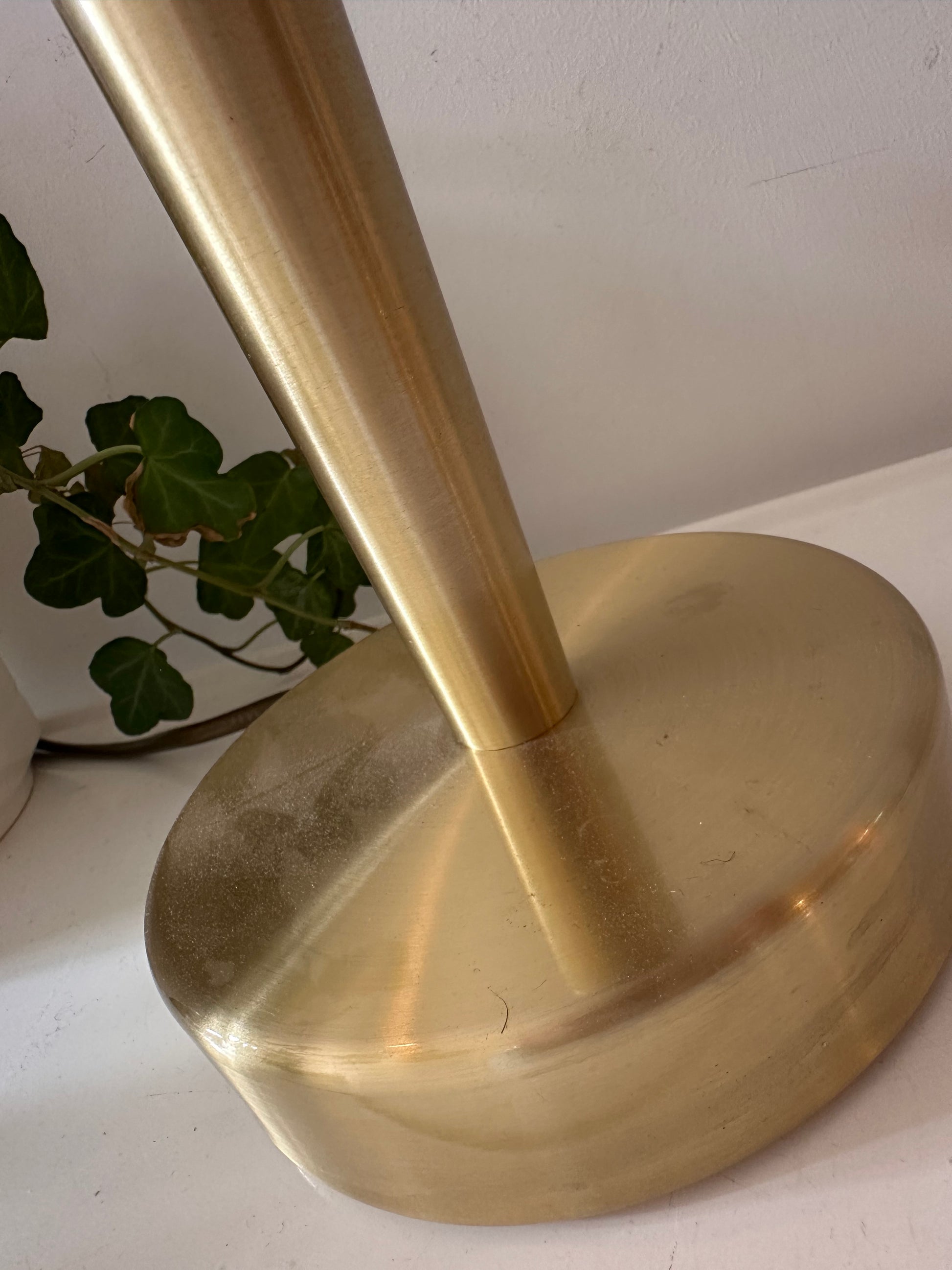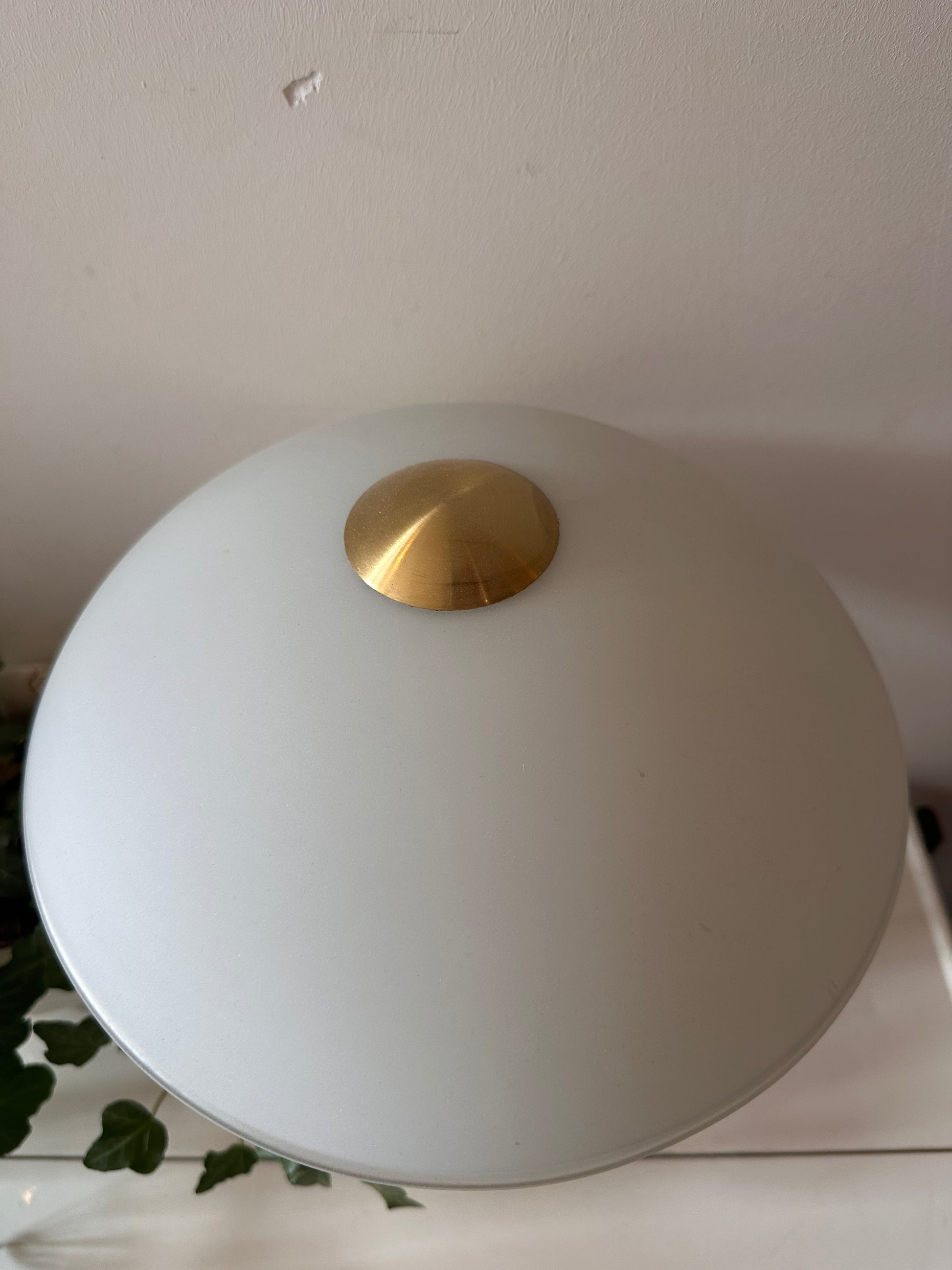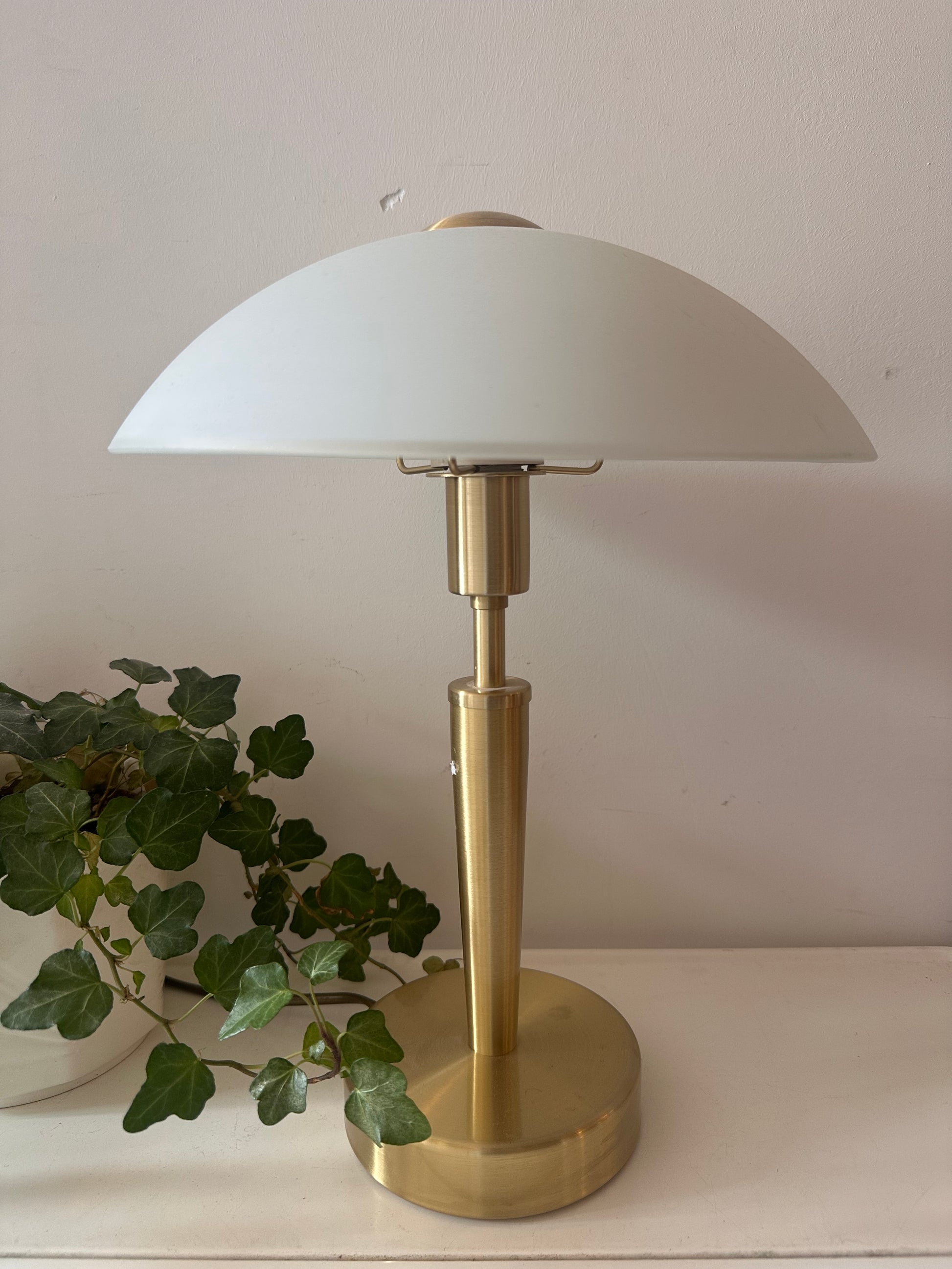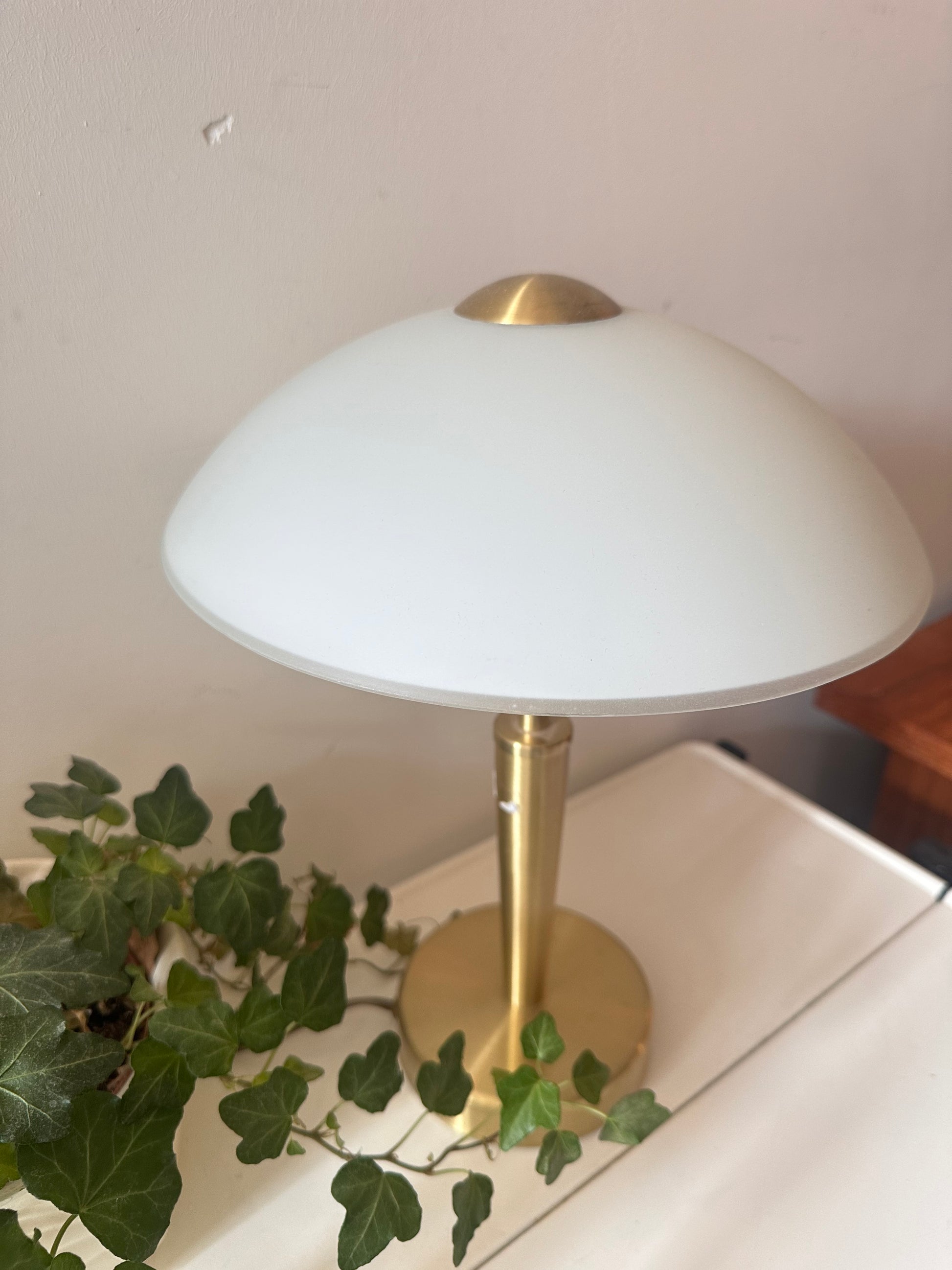 Chique en strak tegelijk – deze lamp heeft een messing voet en steel met een zachte, matte glazen kap in mushroom-vorm. Hij werkt op touch en heeft drie lichtstanden. In een mooie vintage staat! Q219