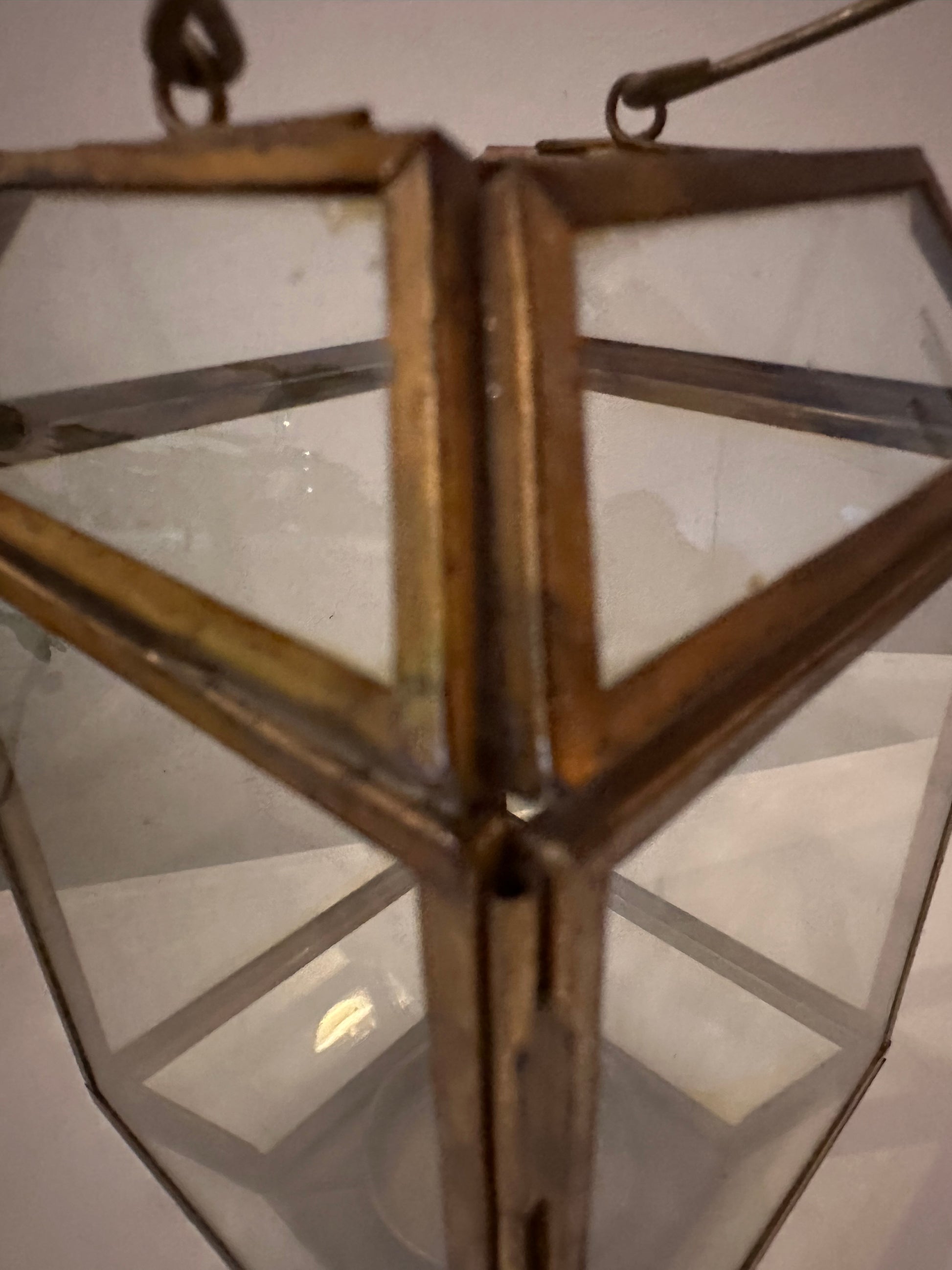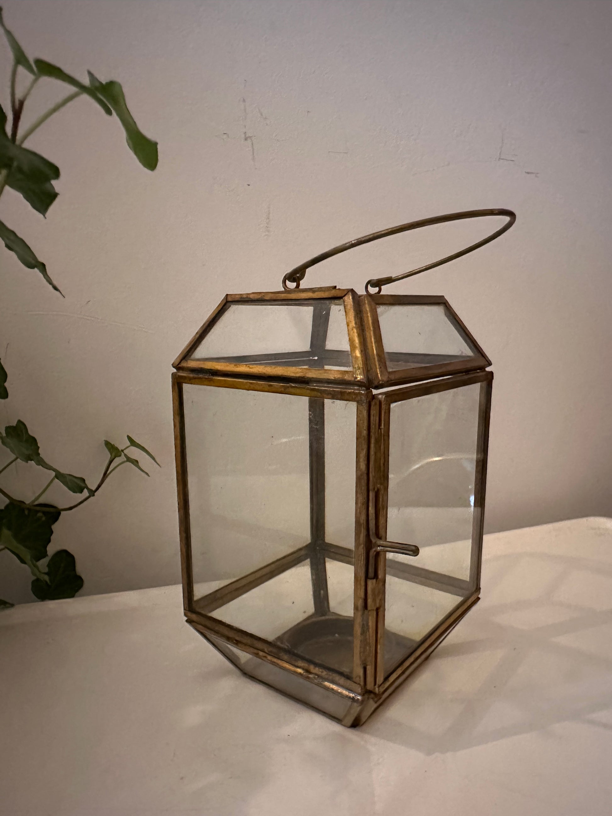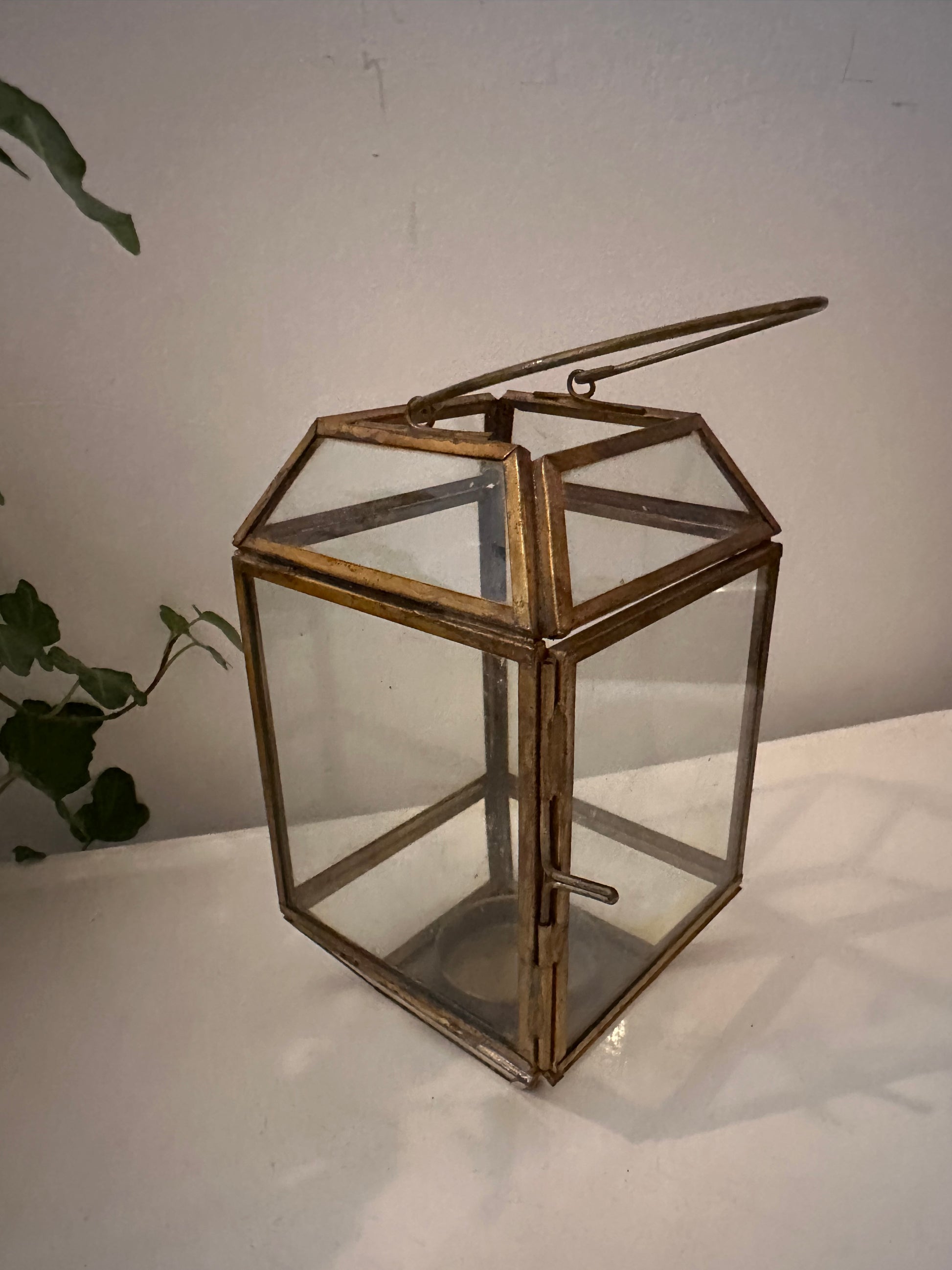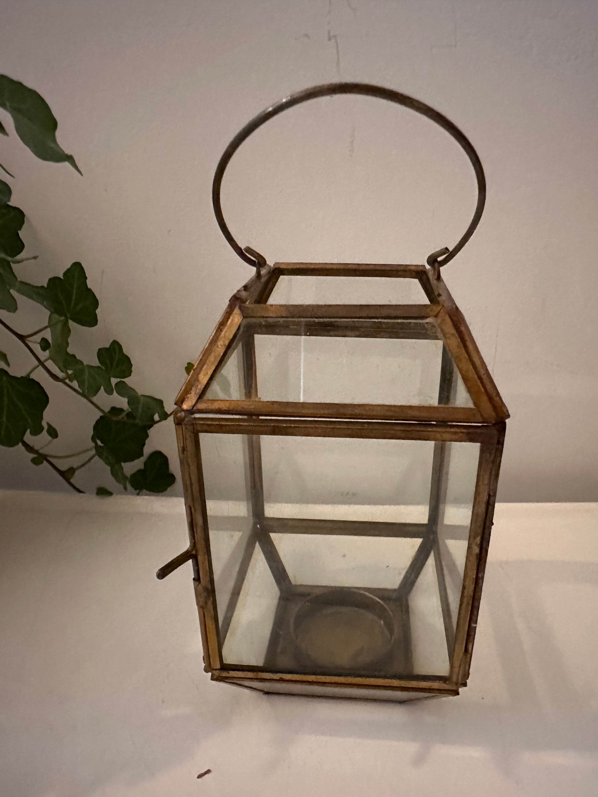 Onwijs leuk klein lantaarntje van glas met messing frame — perfect formaatje voor een waxinelichtje of klein plantje. Mooi vintage patina op het metaal en deurtje aan de voorkant dat goed sluit. Q604