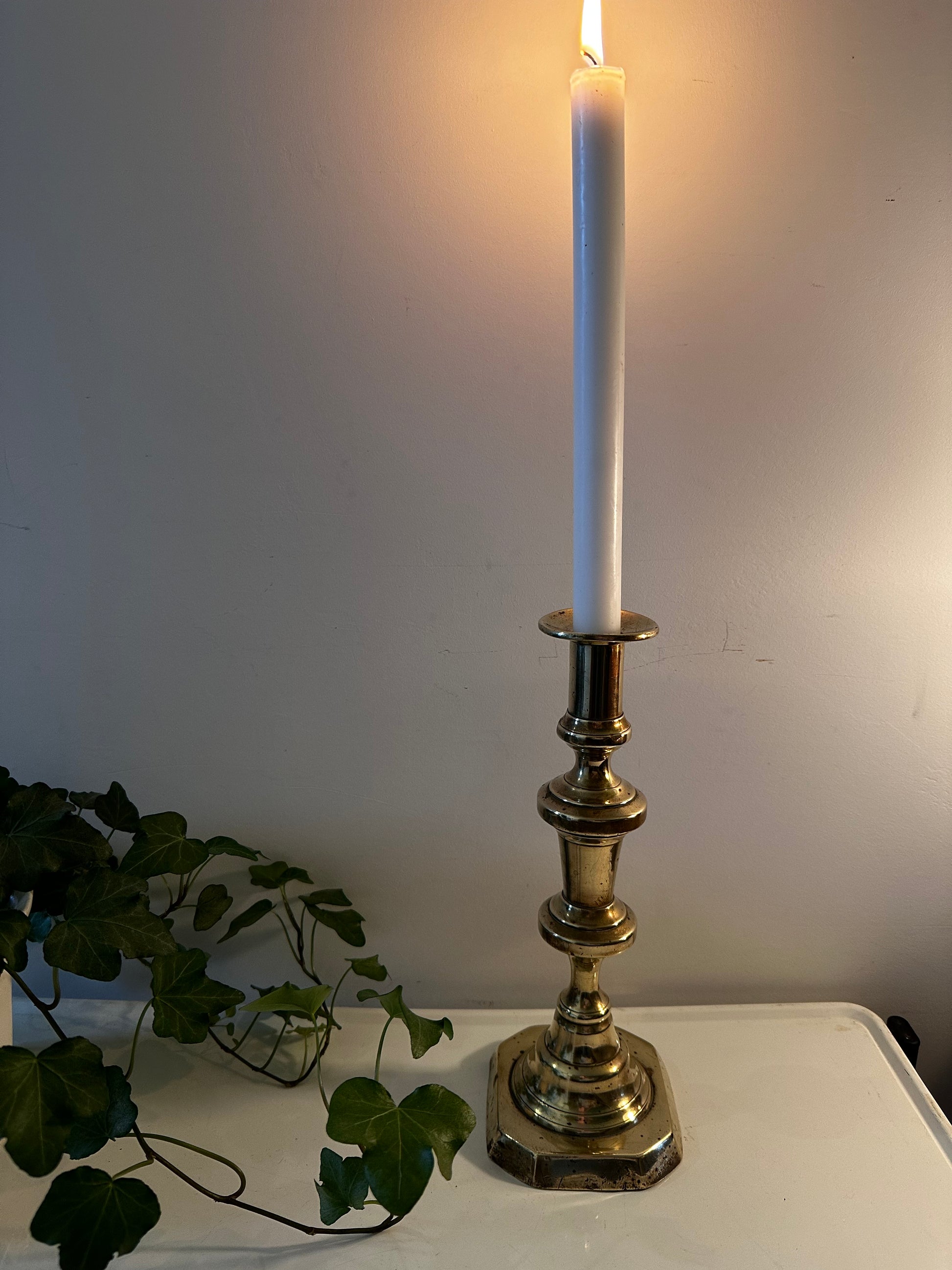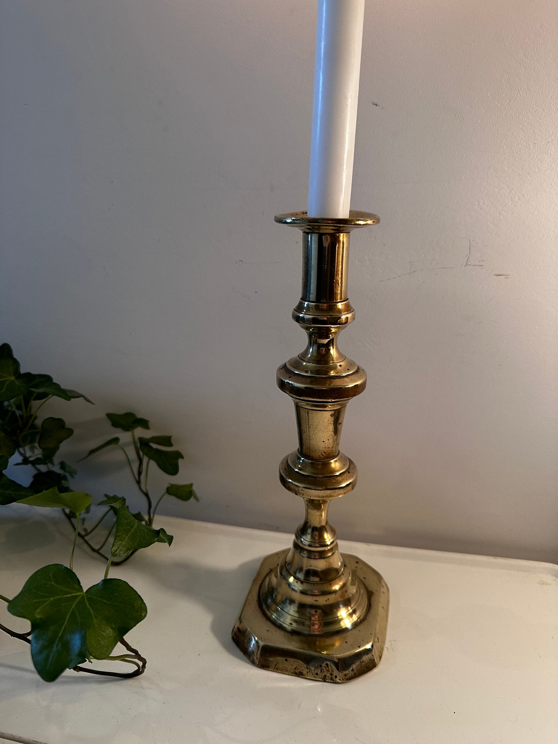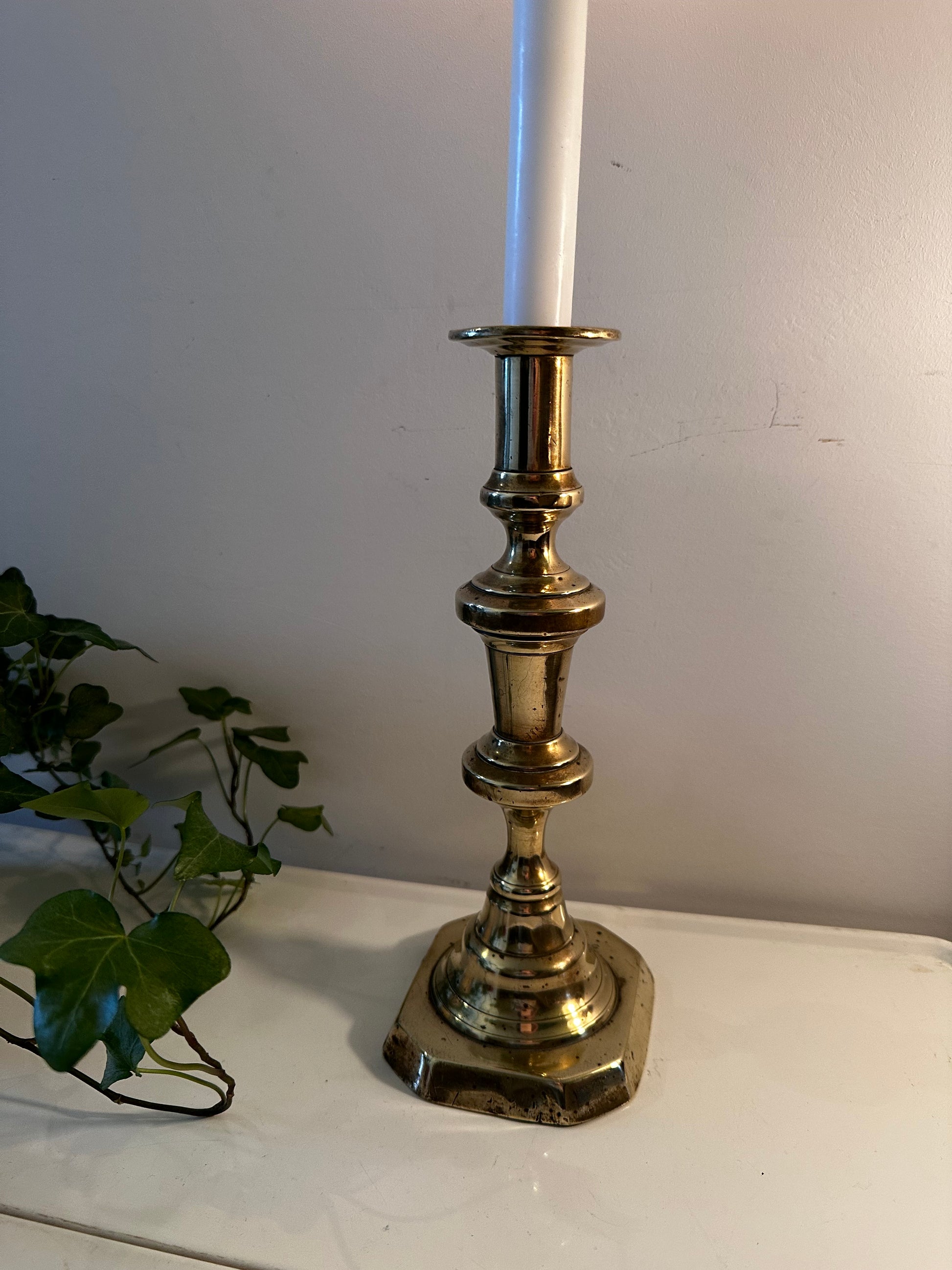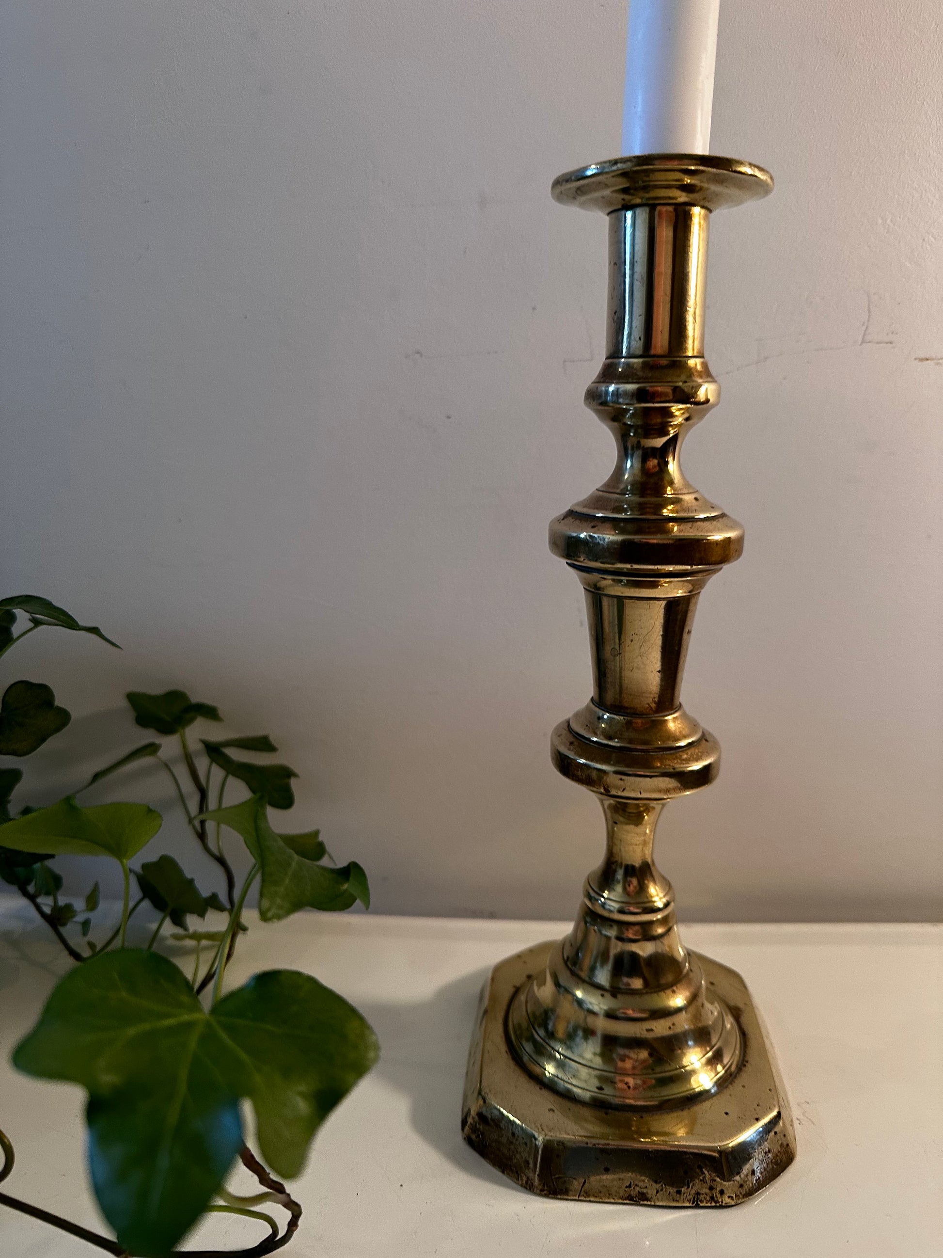 Deze messing kandelaar is in een mooie vintage staat met hier en daar wat patina plekjes. Mooi hoog en elegant model.