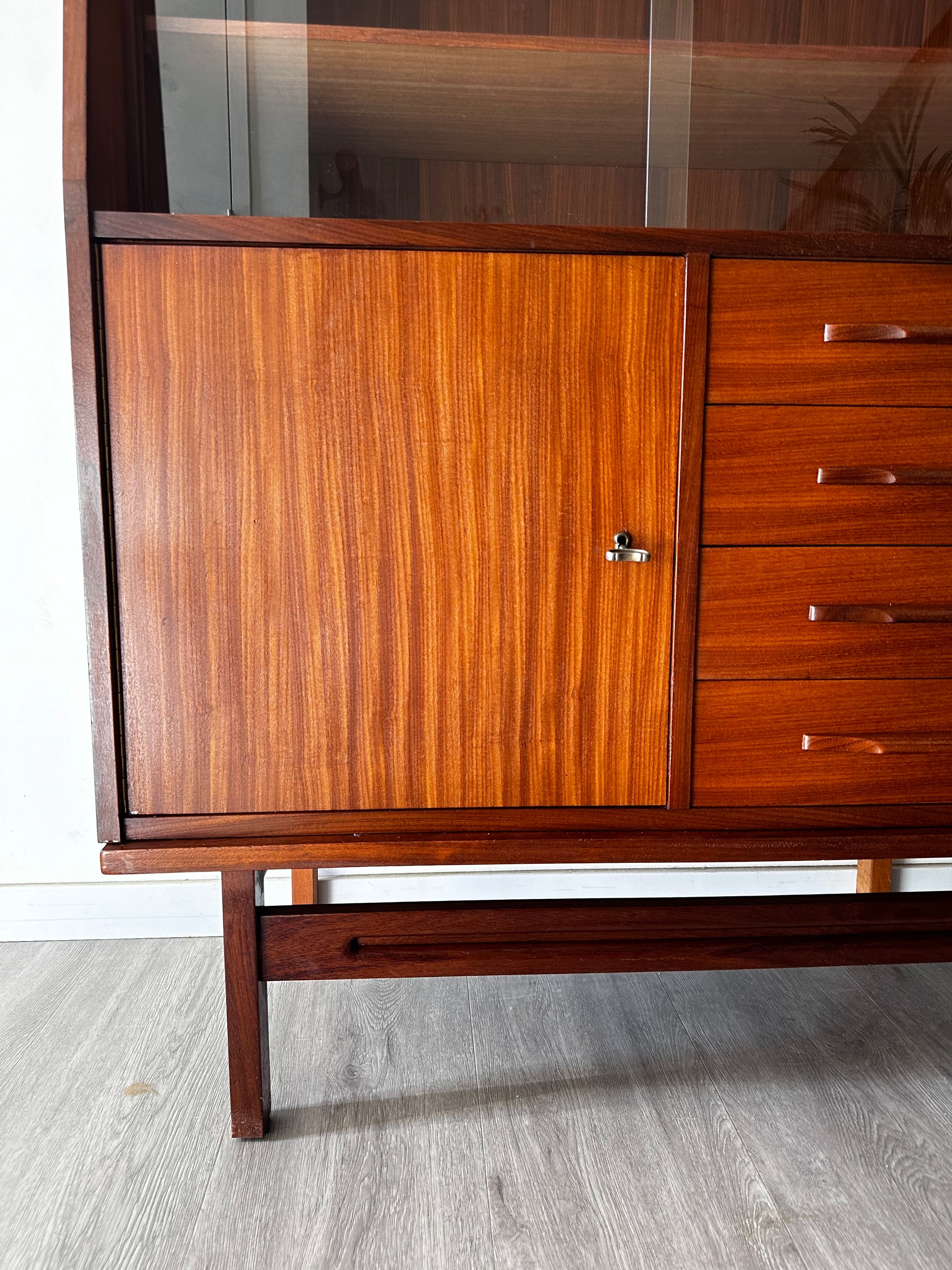 Een onwijs toffe Mid Century Highboard kast uit de jaren. Scandinavisch design. In een mooie vintage staat met liefdevolle sporen van gebruik. Kast is helemaal schoongemaakt en in de olie gezet. De bovenkast heeft twee originele glazen schuiframen met ingefreesde inkeping om te openen. Twee planken in de kast boven. Onder een deurtje met daarachter 1 plank. 4 lades met supermooie handgrepen. Bovenste lade is een bestek lade. Staat op een mooi onderstel.