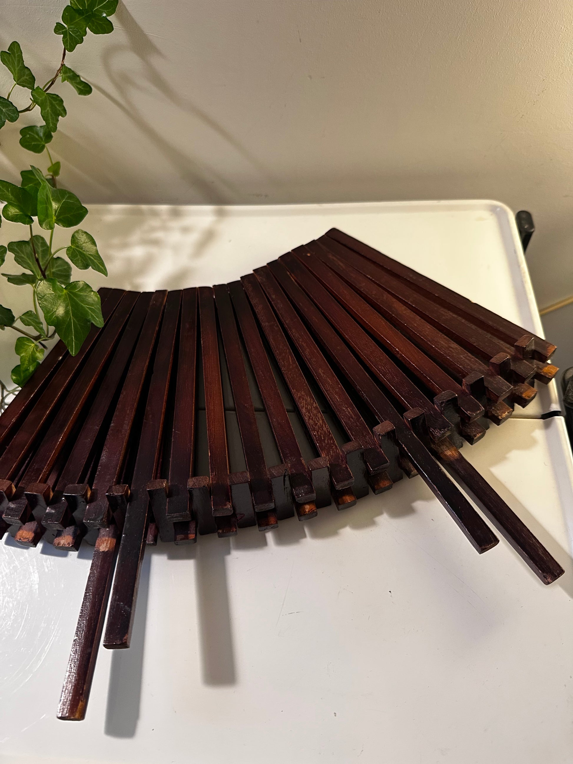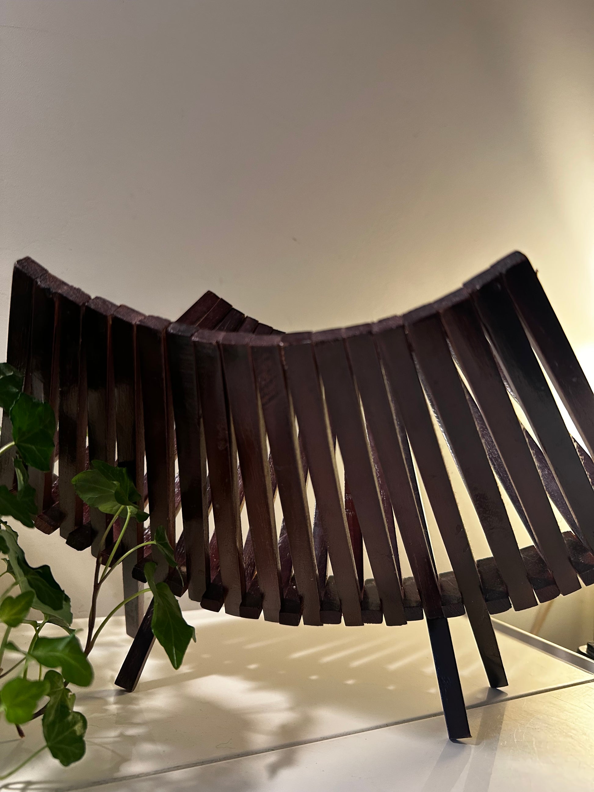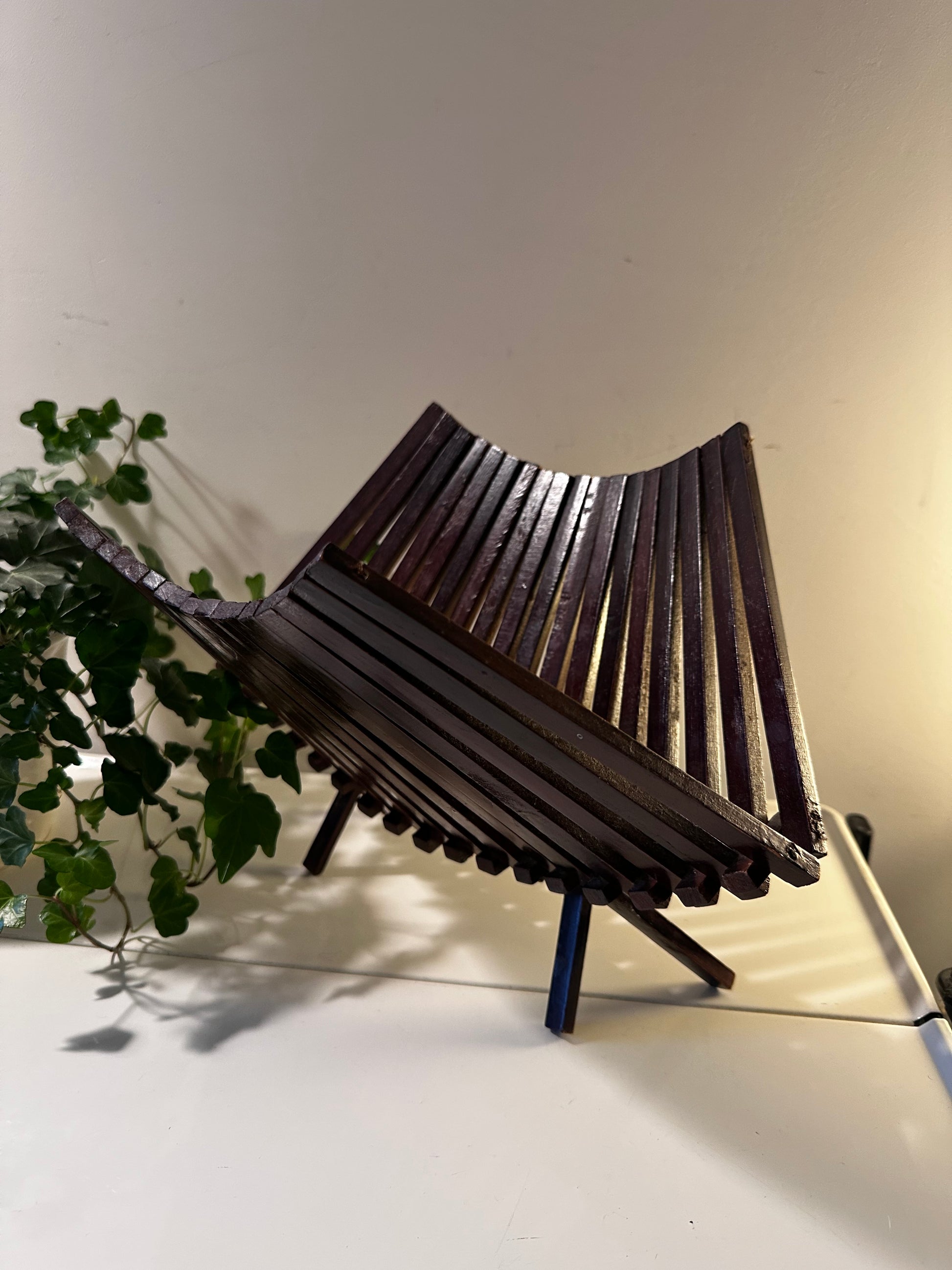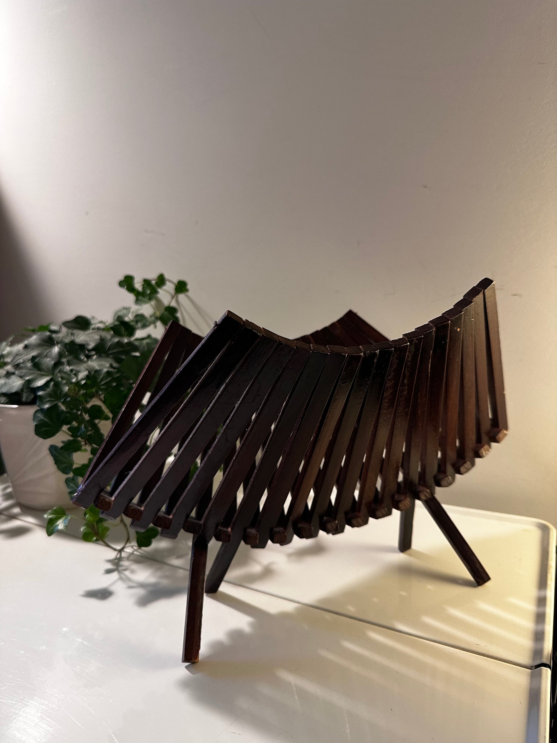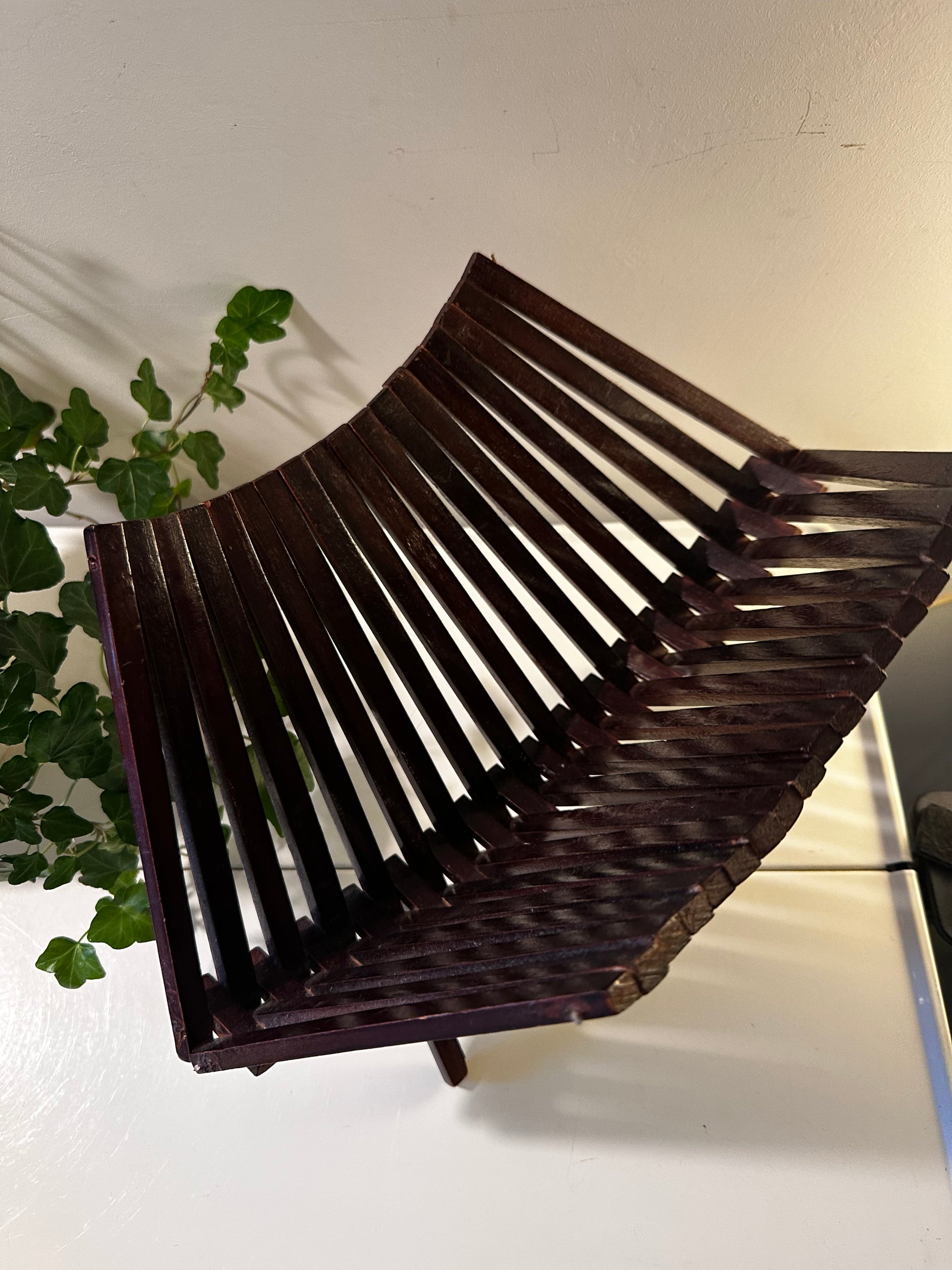 Een prachtige mid-century houten fruitmand uit de jaren ’60. Perfect voor fruit, tijdschriften of als stijlvolle eye-catcher in huis! Fruitmand is in een mooie vintage staat en heel makkelijk opvouwbaar. Q746