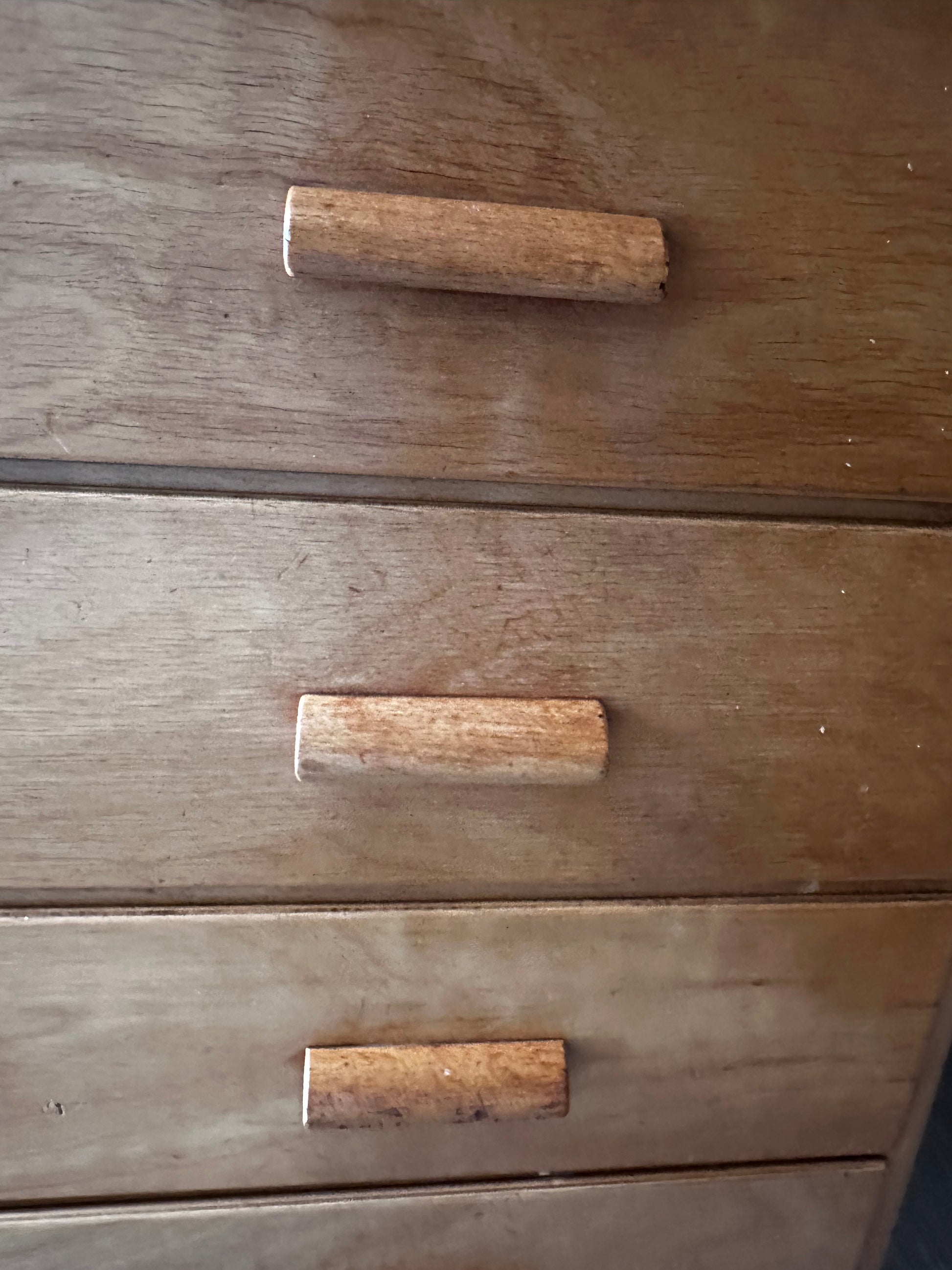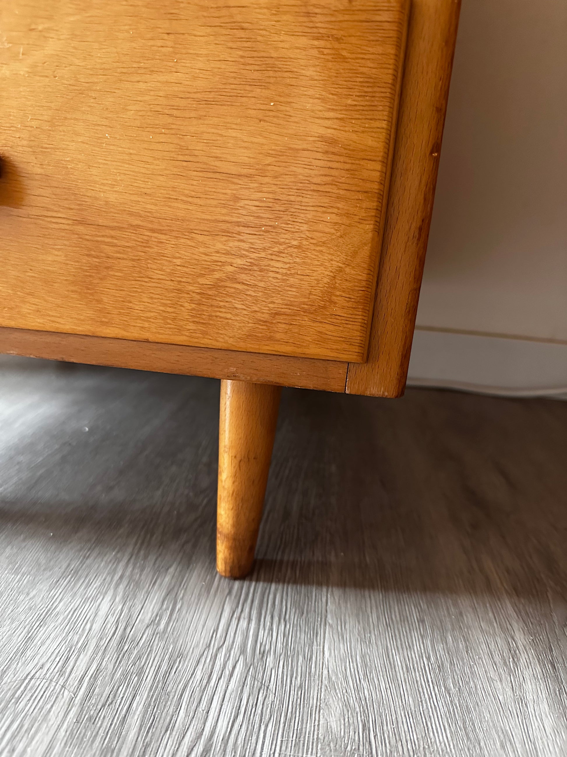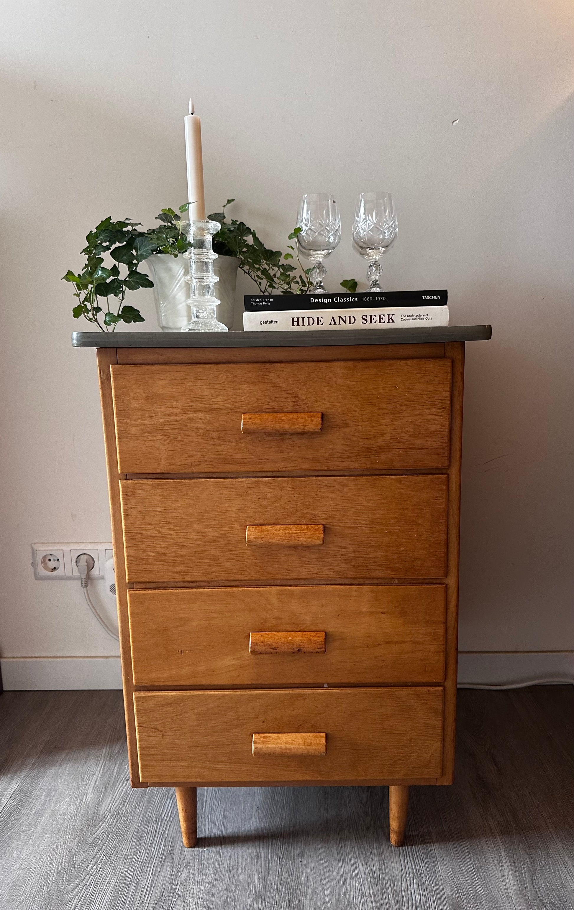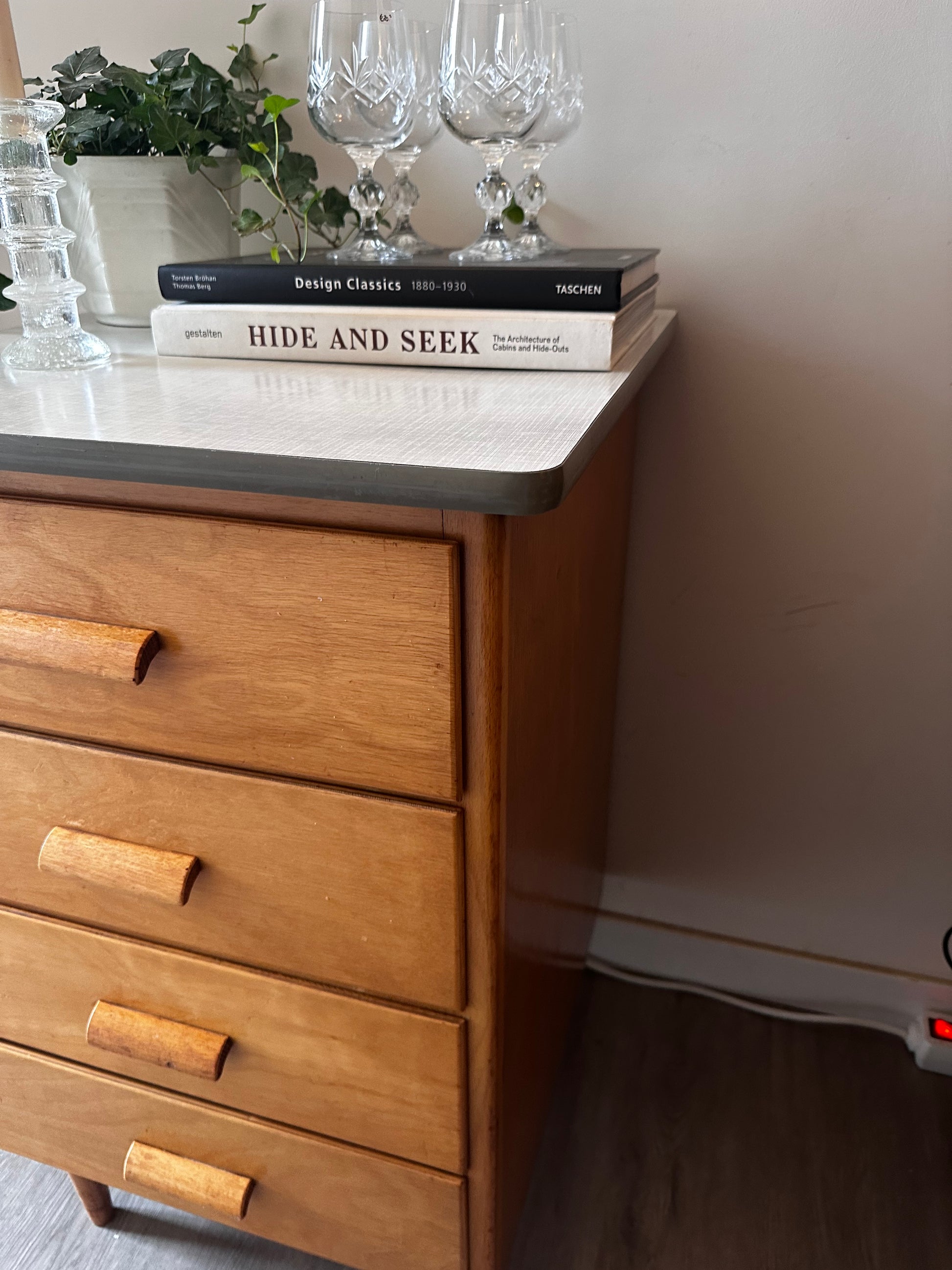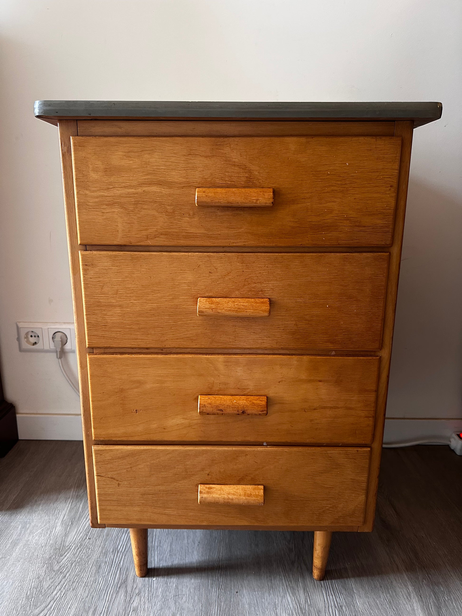 Top Mid Century ladekastje. In een mooie vintage staat. Kastje heeft 4 laatjes en staat op ronde pootjes. Blad boven is van formica.
