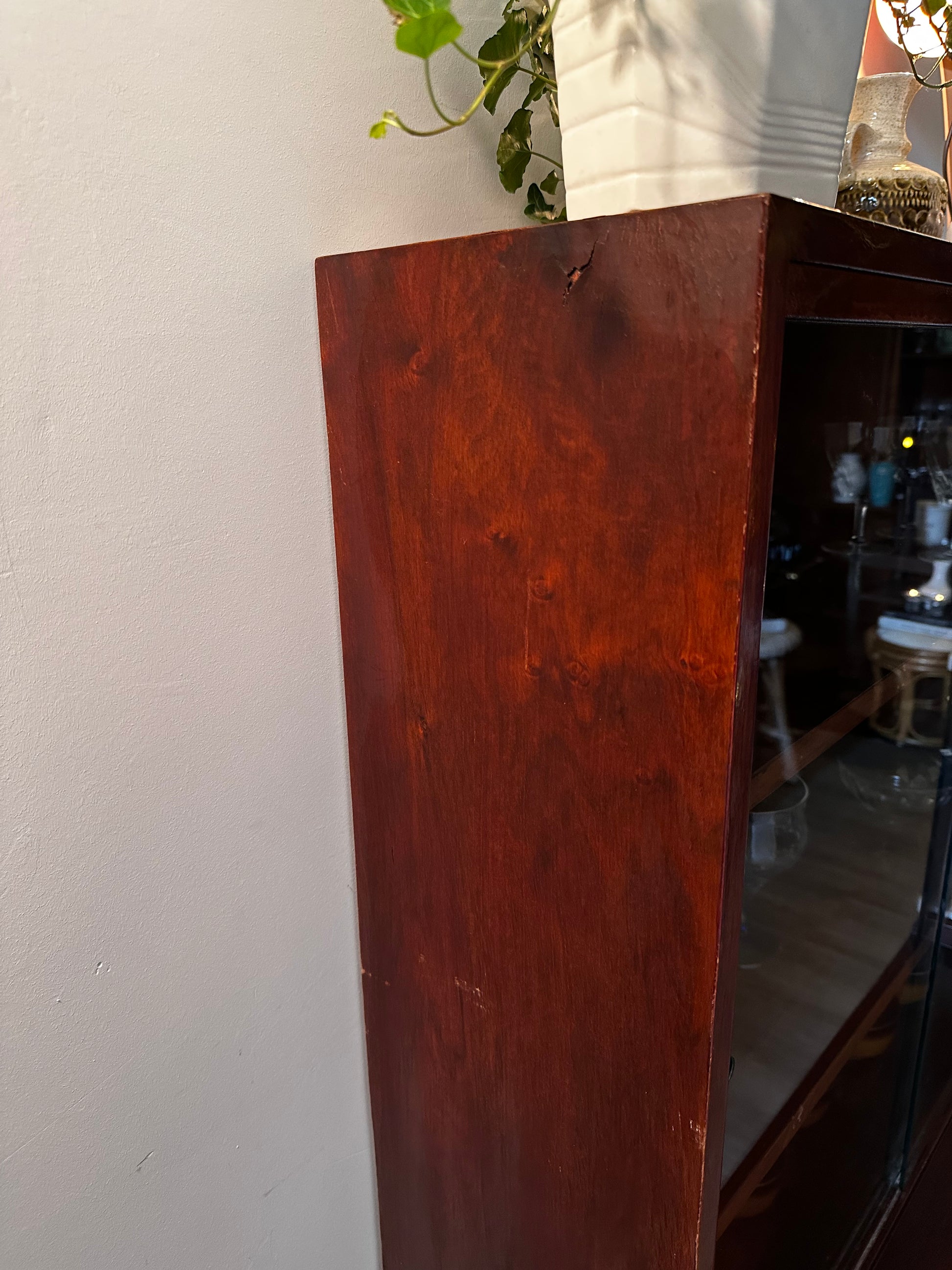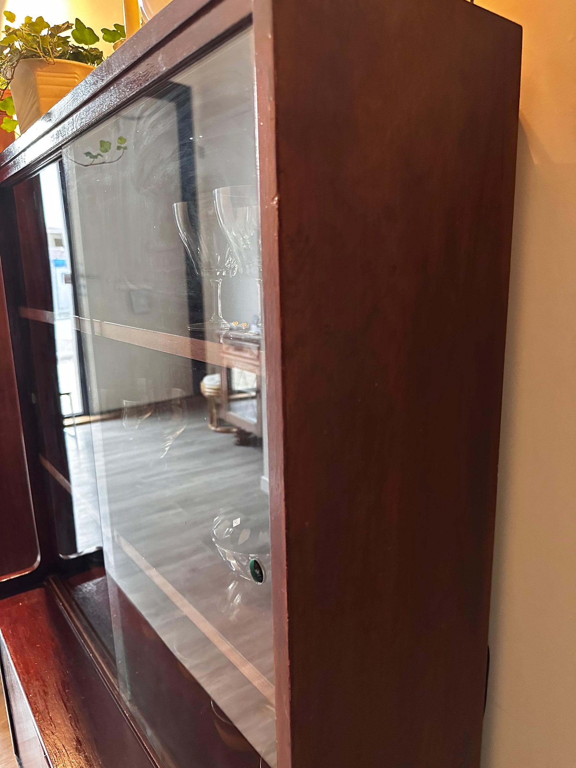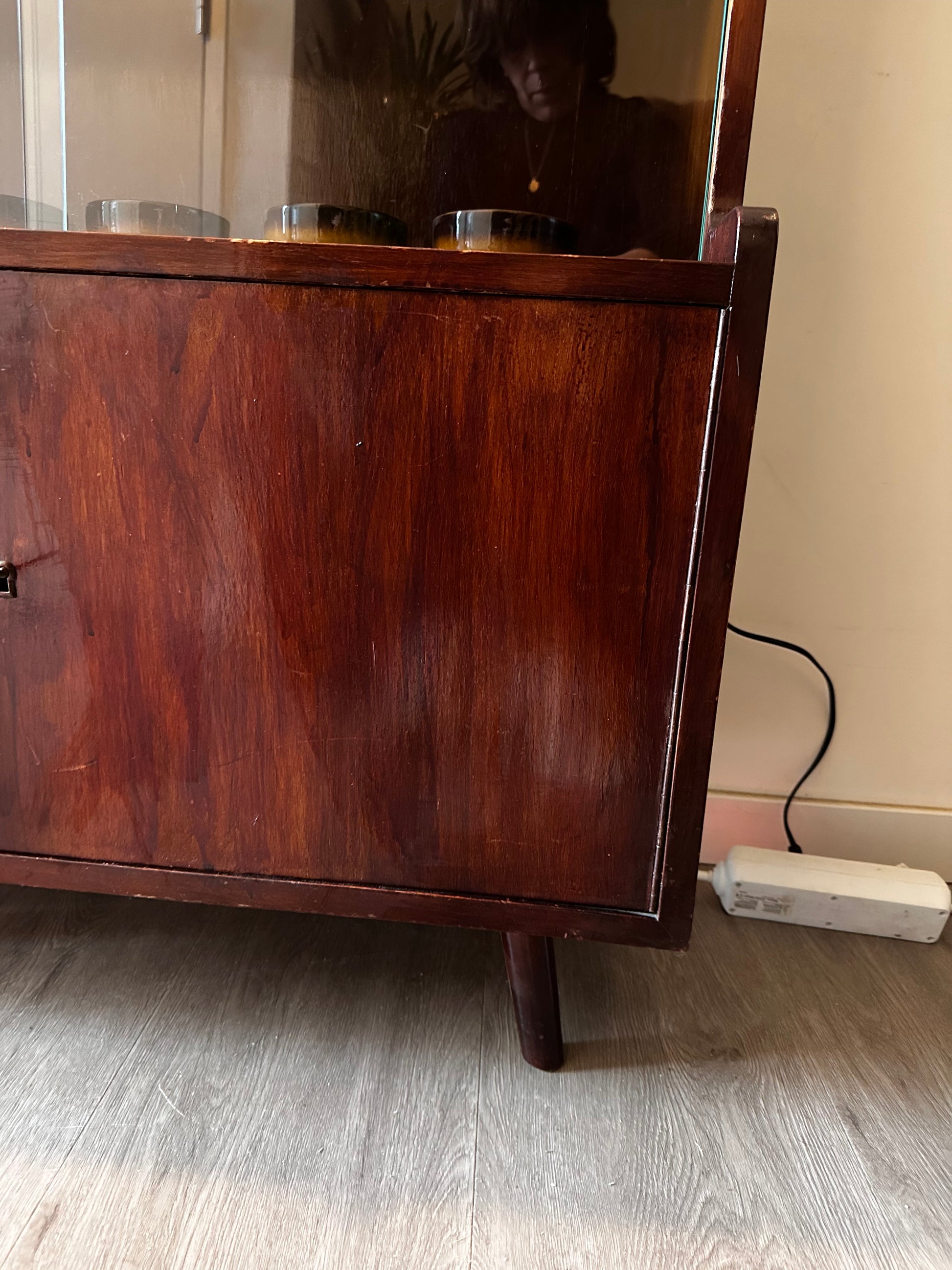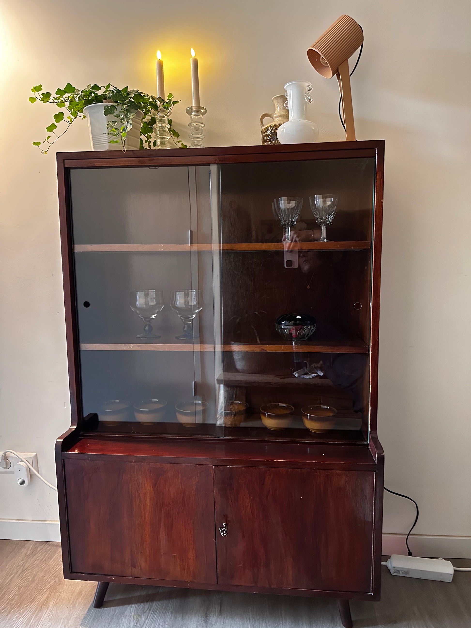 Een te gekke vintage Highboard kast. Het bovenste gedeelte is een vitrine kast met glazen schuifdeuren. De vitrine kast heeft twee planken die in hoogte kunnen worden versteld. Onder een kast met twee deurtjes. Kast dateert jaren 60/70. Is in een mooie vintage staat met gebruikssporen passend bij de leeftijd