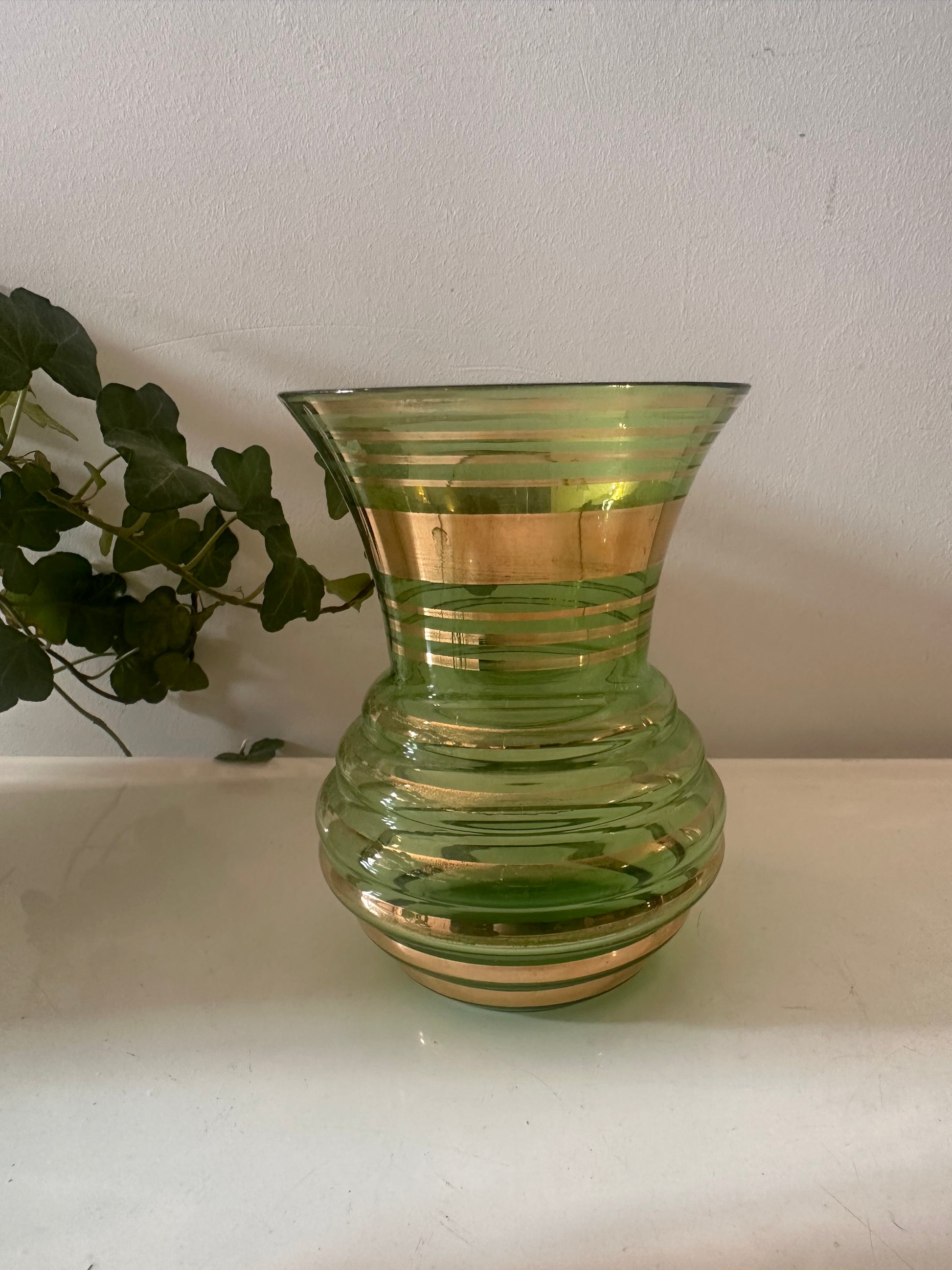 Superleuk vaasje van groen glas met die shiny gouden accenten, waardoor het meteen een opvallend item is. Door de ribbels en brede hals heeft het vaasje een speelse vorm, helemaal passend bij glaswerk uit de jaren 60/70. Mooi om zo neer te zetten of met een klein bosje bloemen. In een mooie vintage staat, wat slijtage aan de gouden banden.