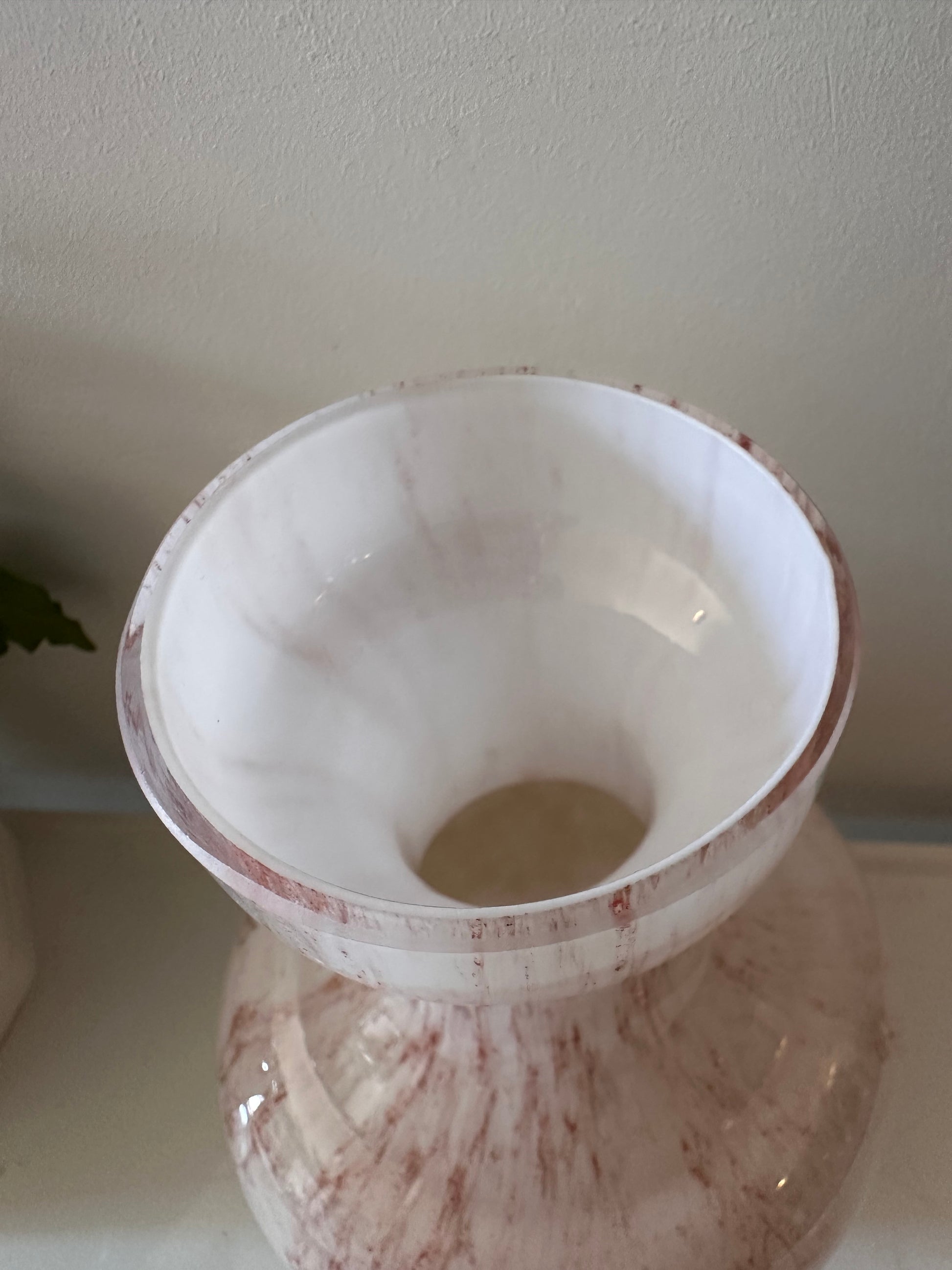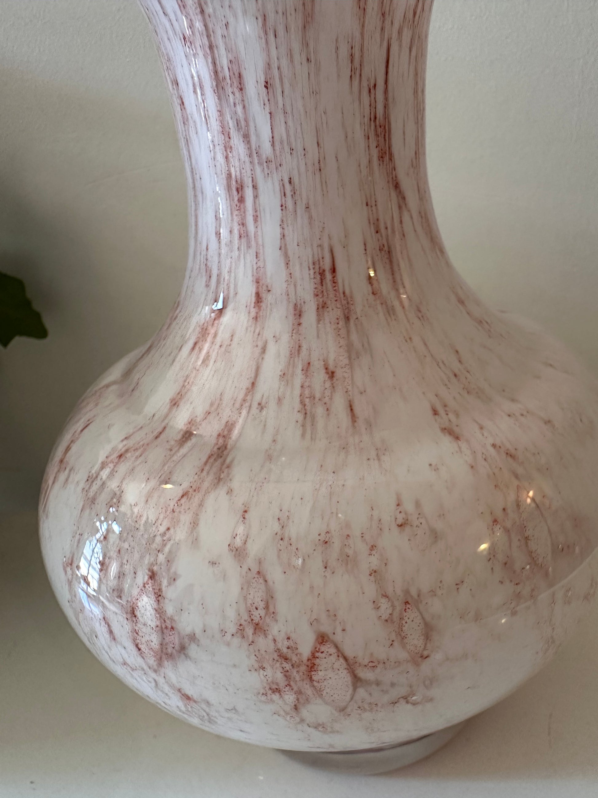Supermooie Murano vaas in wit glas met rode ‘veins’ die als adertjes door het glas lopen. Handgeblazen en typisch voor de jaren ’70. Echt een toffe blikvanger die je zowel met als zonder bloemen kan neerzetten. Q322