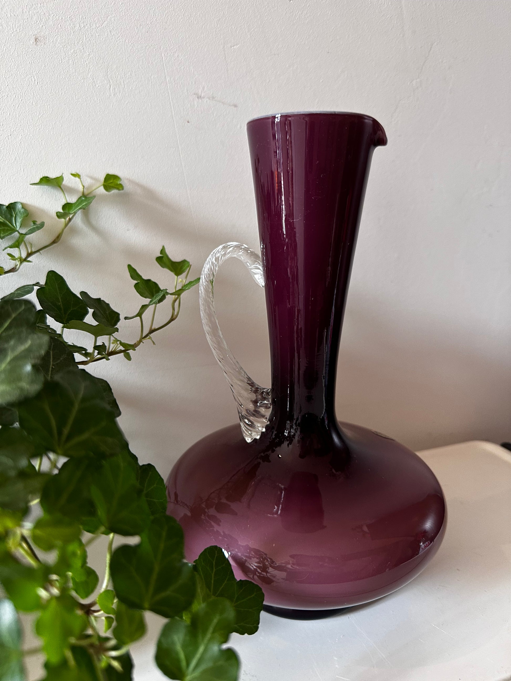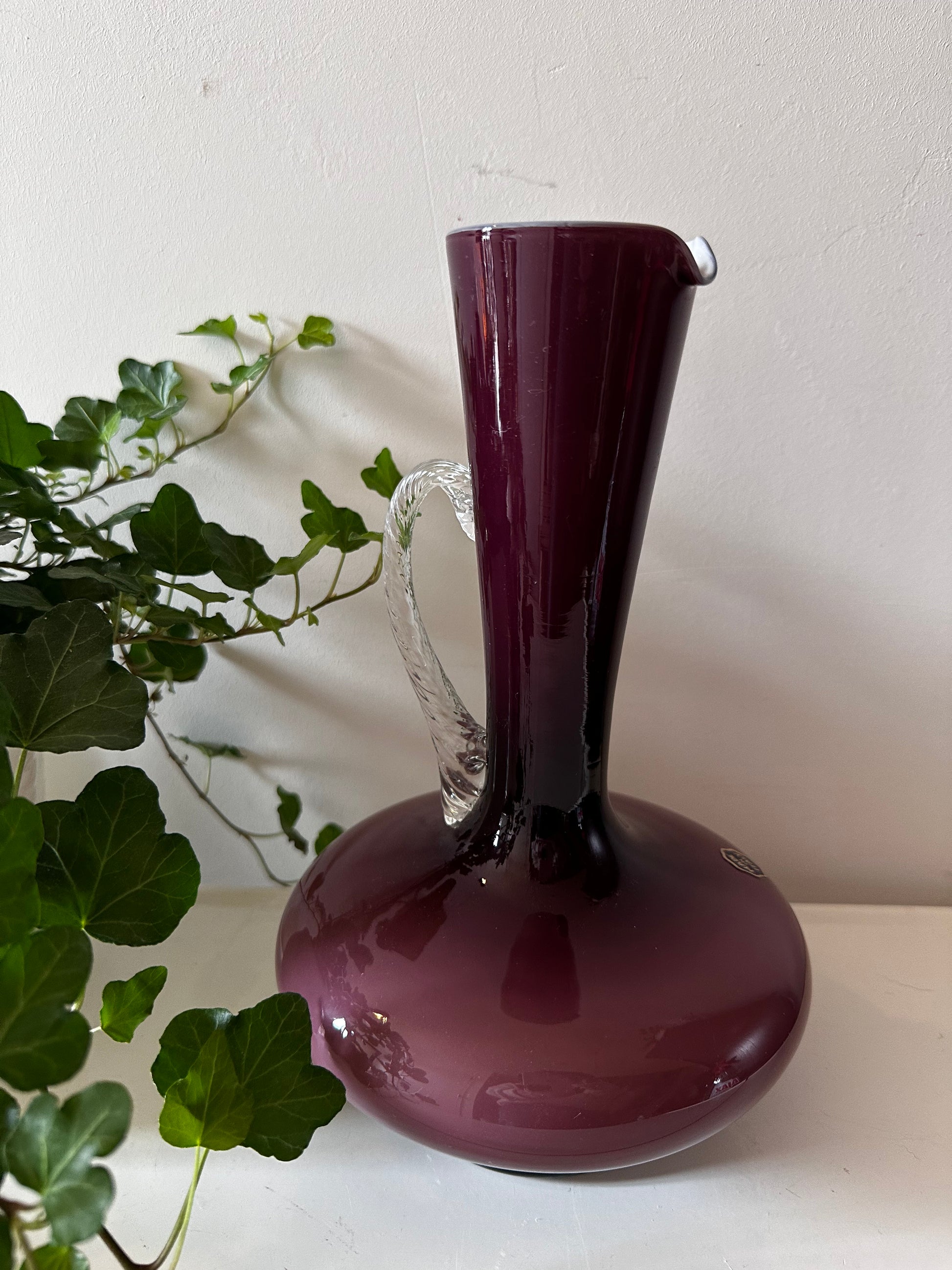 Een beauty van een vaas. De vaas is gemaakt rond de jaren 70 in Italy. Vaas is van Murano glas, heeft een paars bruine kleur met een doorzichtig handvat welke een gedraaide vorm heeft.