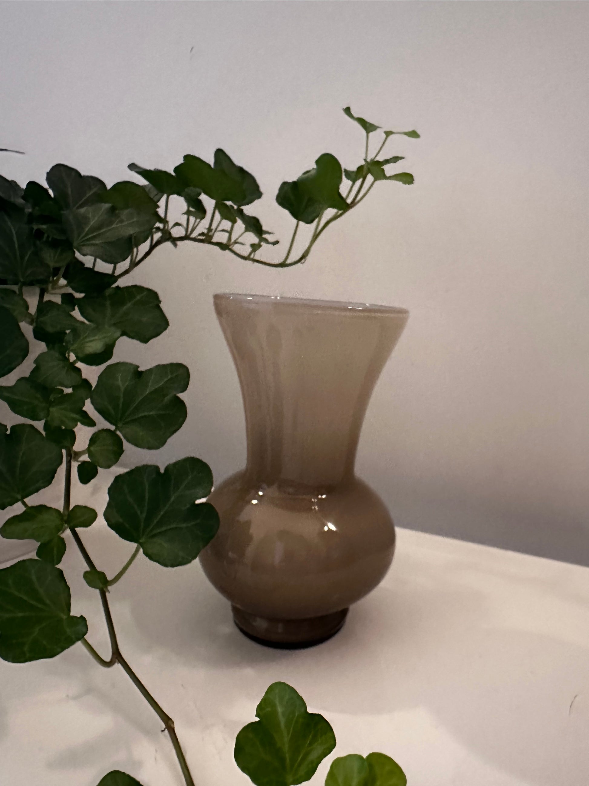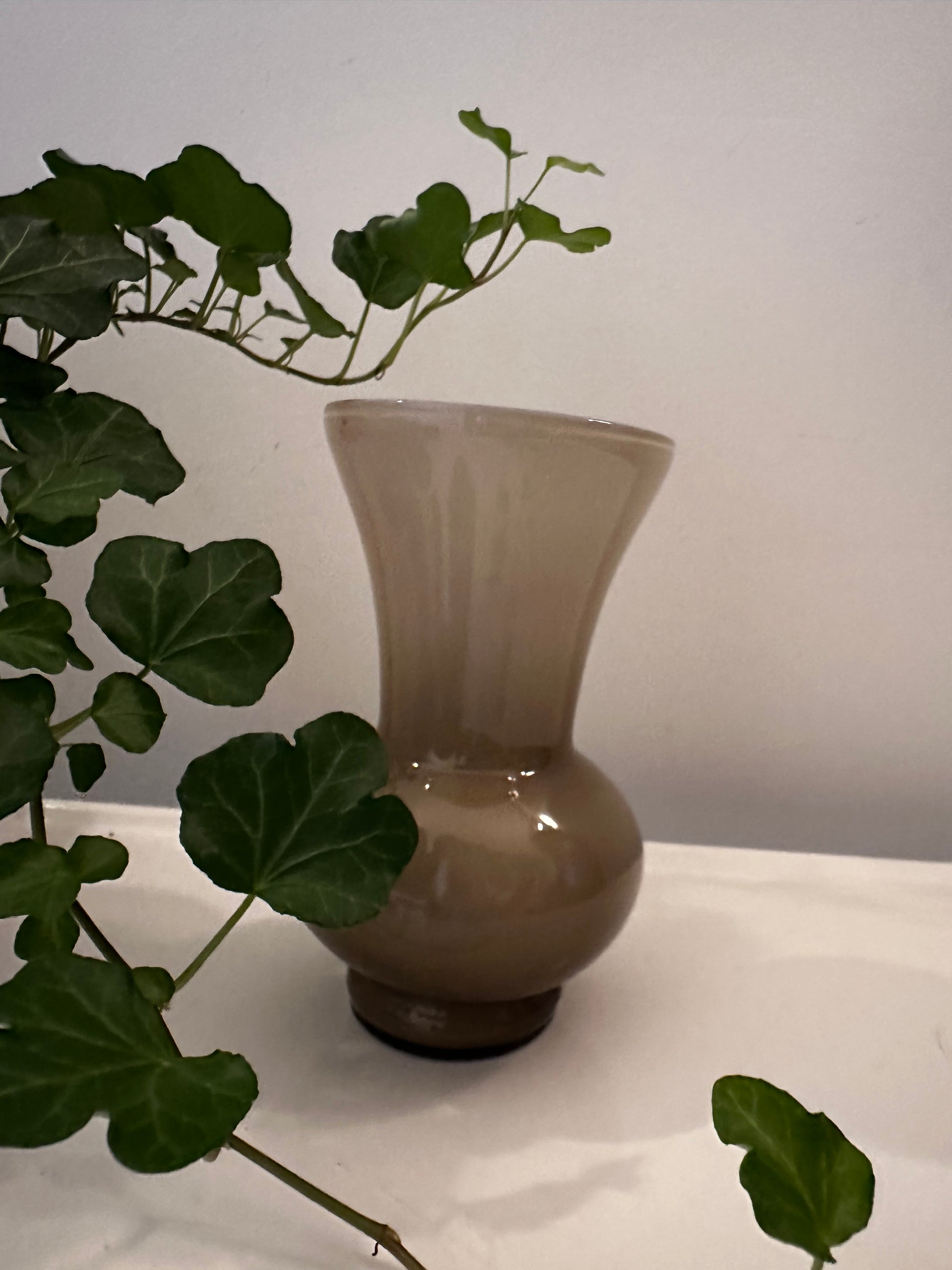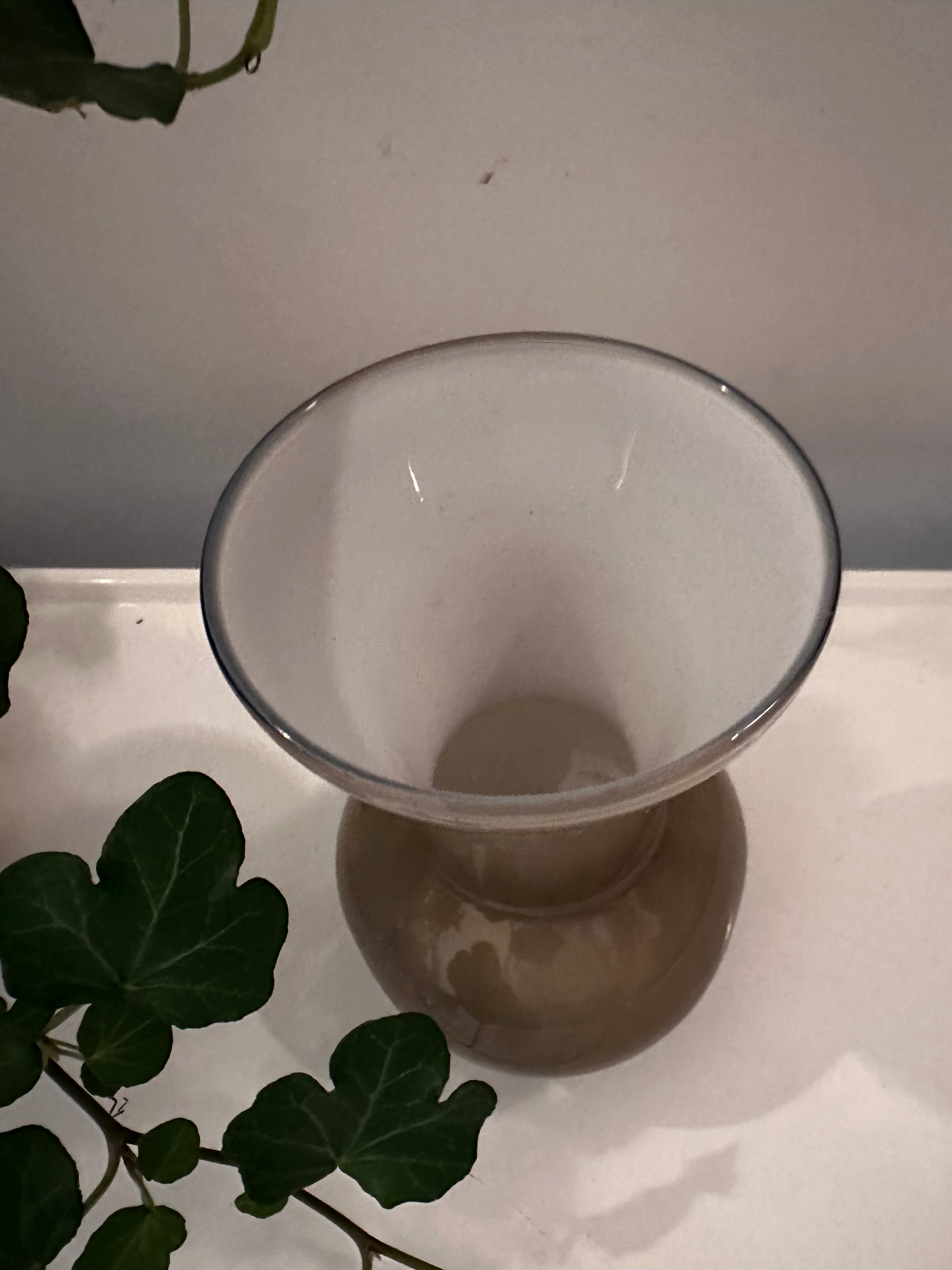 Een lief Murano glazen vaasje. In een mooie vintage staat. Heeft een soort taupe kleur en een witte binnenkant.