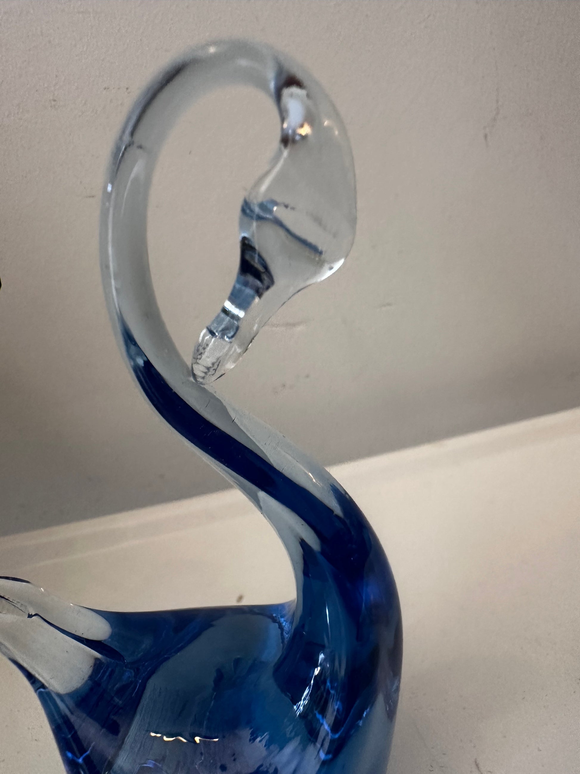 Elegante zwaan van blauw en helder Murano glas. Mondgeblazen in een sierlijk golvende vorm — een klein kunstwerkje op zich. Zwaantje heeft aan de onderkant een chipje eraf maar dat zie je niet als hij staat. Q5