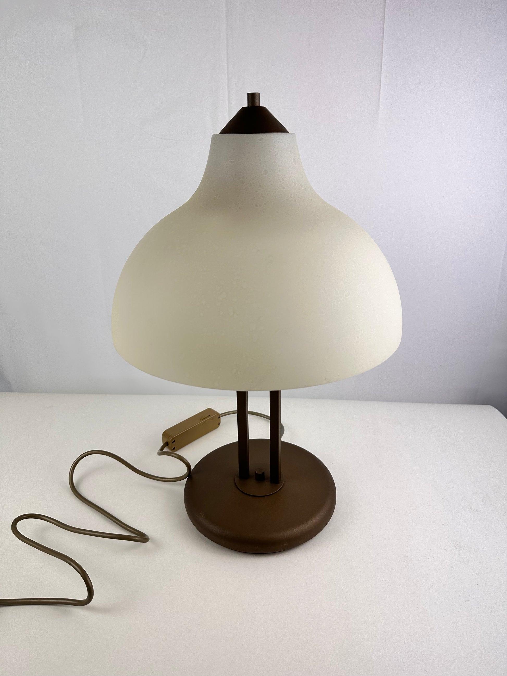 Wat een leuk mushroom lampje. Donkerbruine voet met melkglazen soort gepoederde kap. Lamp komt uit de jaren ‘80 en is in een mooie vintage staat met hele lichte gebruikssporen. Natuurlijk werkt de lamp!