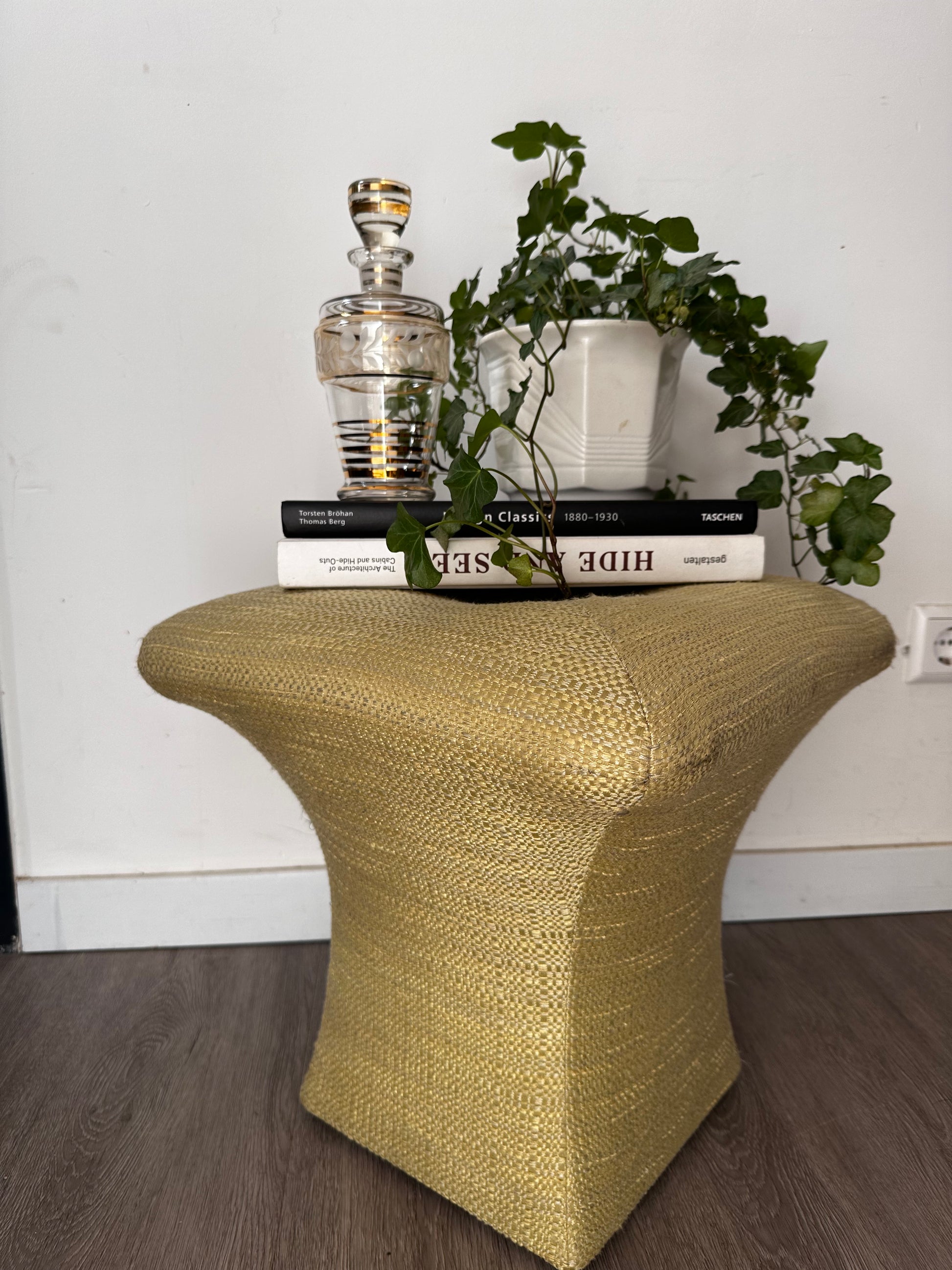 Een onwijs leuke poef in mushroom vorm. Gefabiceerd in de Stokking fabriek in Terwolde omstreeks de jaren 70. Ontworpen door Clemence Claessens. In een hele mooie vintage staat met lichte liefdevolle gebruikssporen. De poef is bekleed met een licht gele gemêleerde stof. Is best een zwaar model.