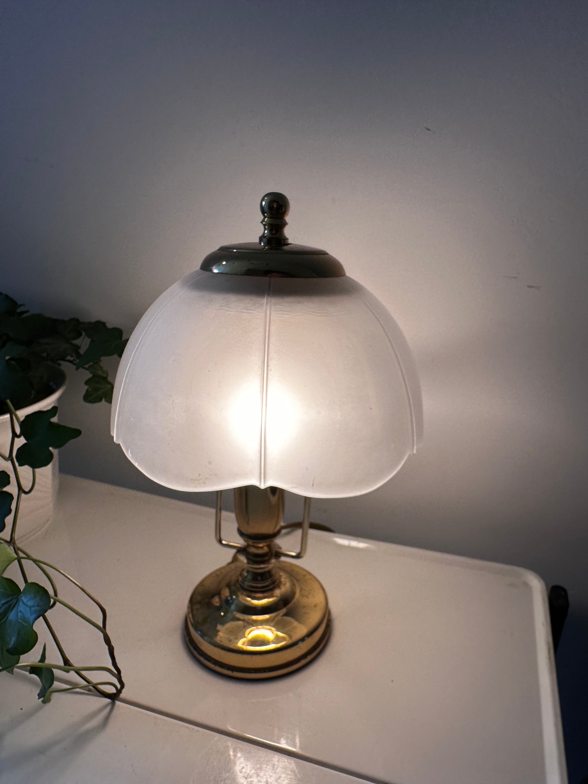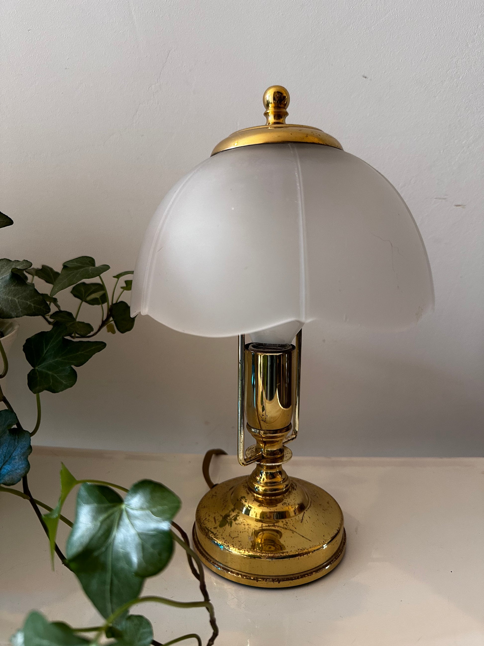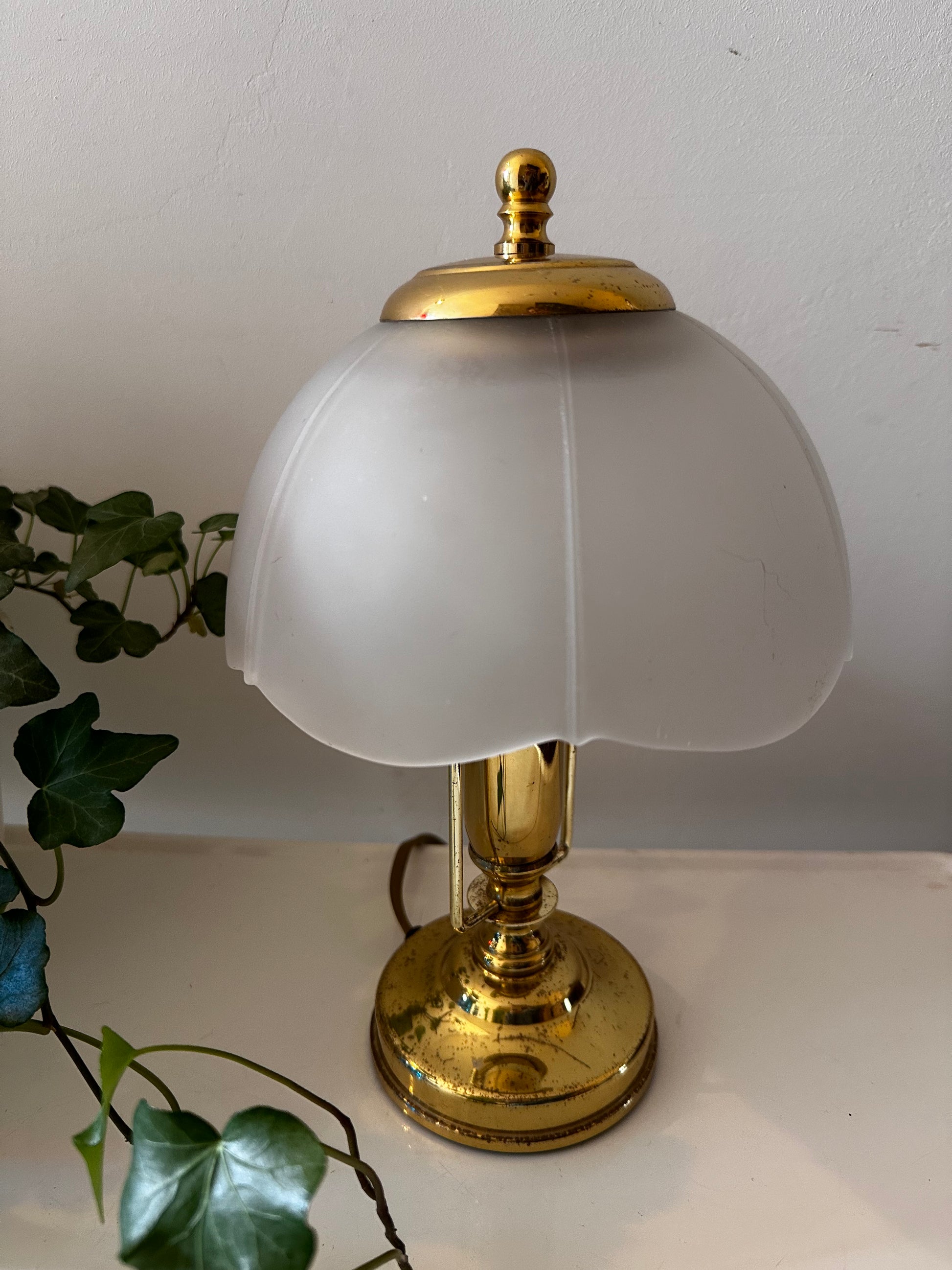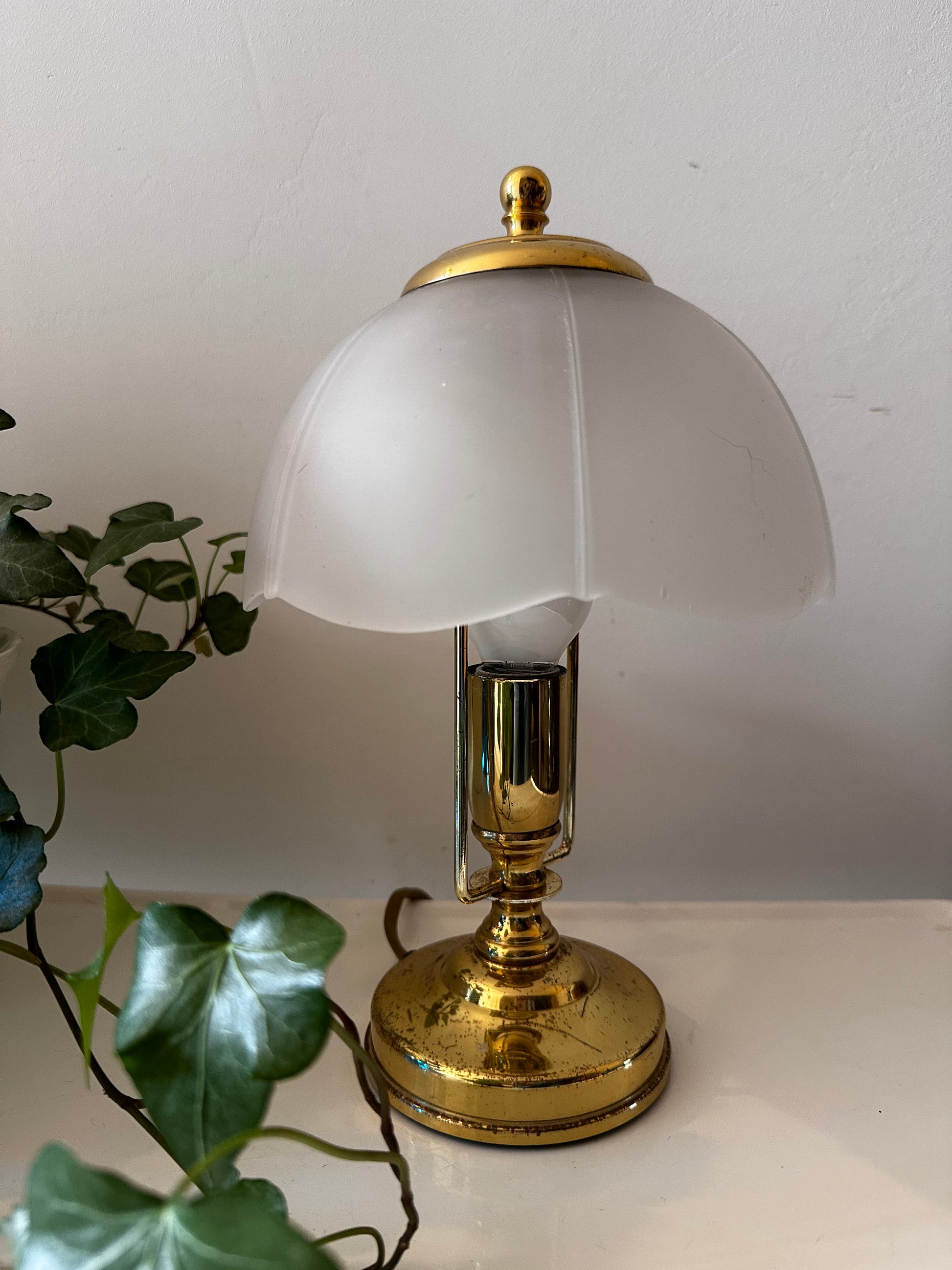 Wat een schat van een lampje. Jaren 80 Hollywood Regency stijl. In een mooie pantina vintage staat. Melkglazen kap op messing voetje. Messing heeft patina vlekjes. Snoer met aan en uit schakelaar.