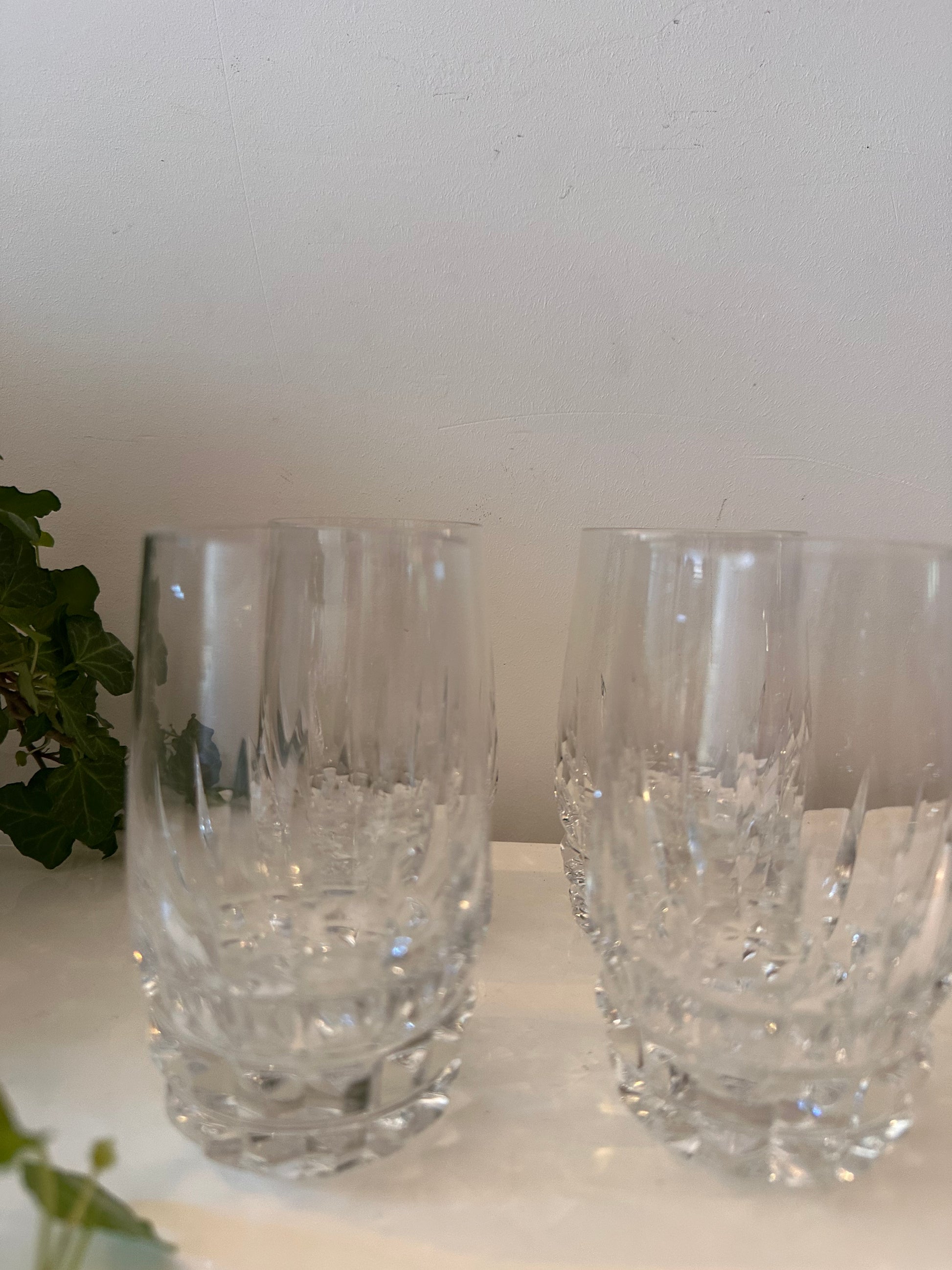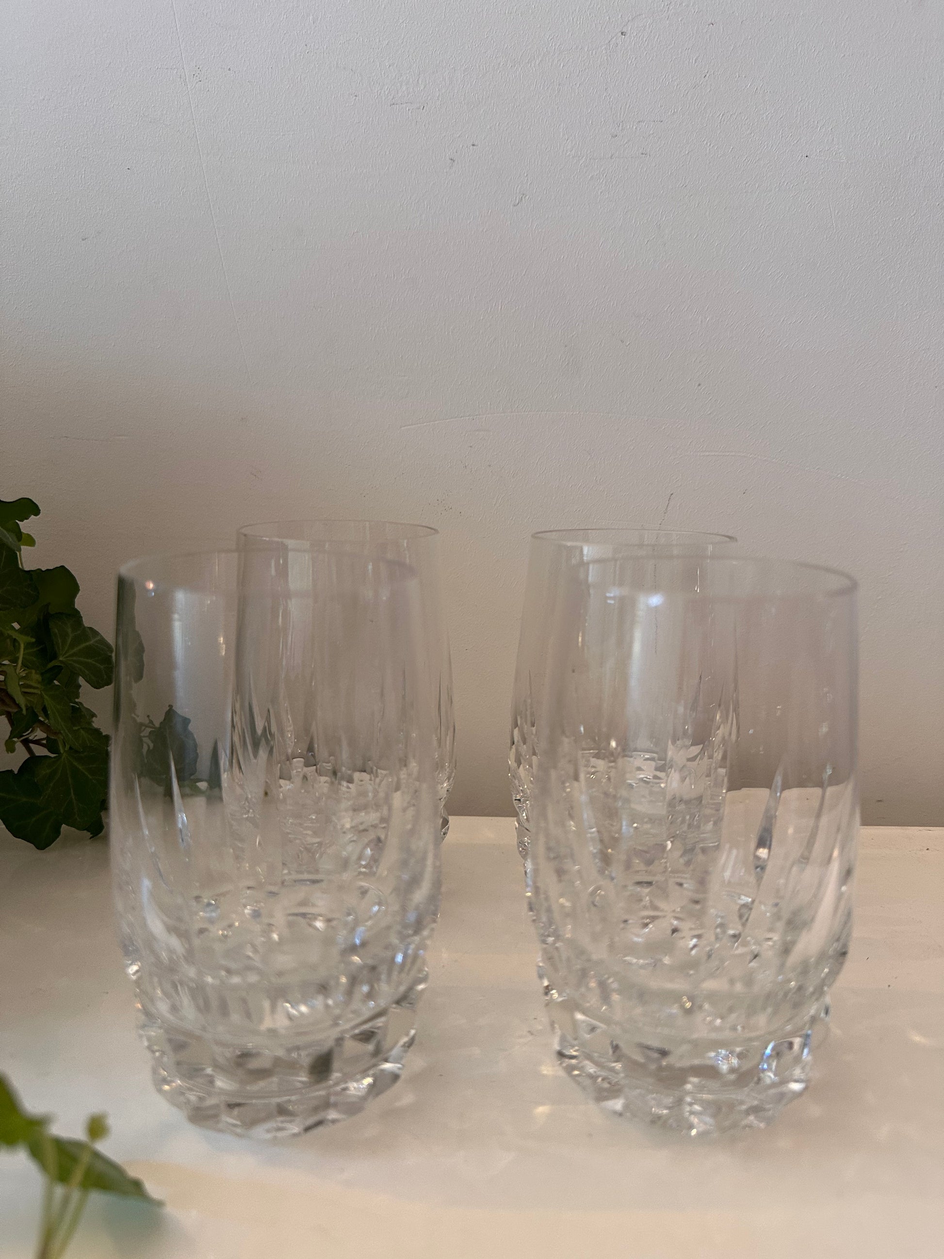 Mooie set van vier kristallen glazen met facetgeslepen bodem en strak jaren 80-design. Ze komen uit Duitsland en hebben dat typische zware kristalgevoel waar je meteen de kwaliteit aan herkent. Perfect formaat om water of een mixdrankje in te serveren. Q385