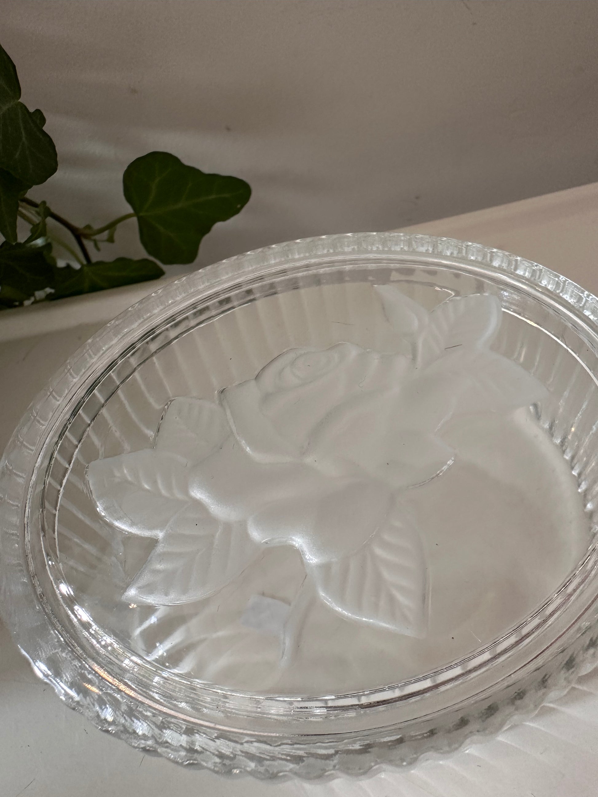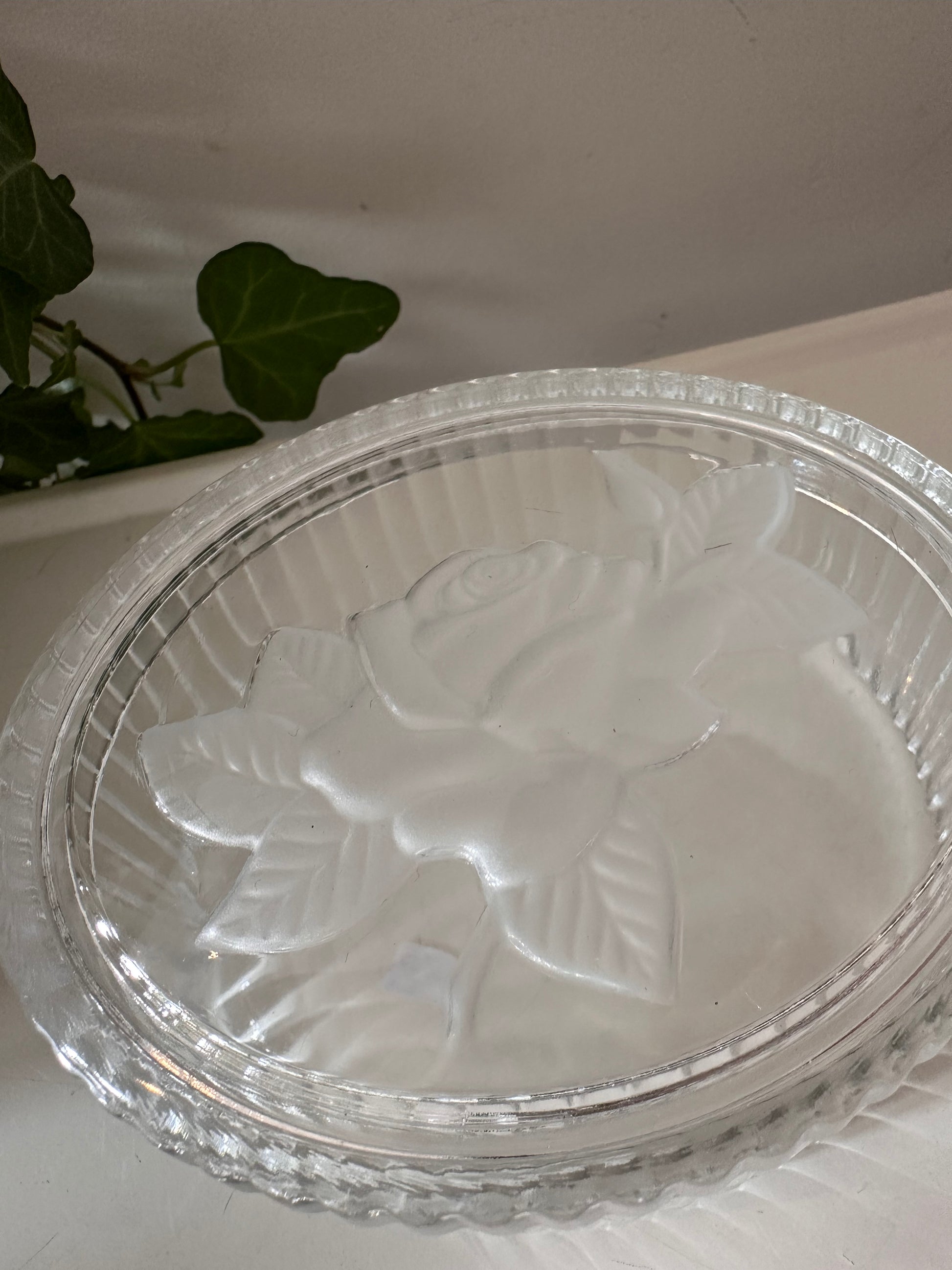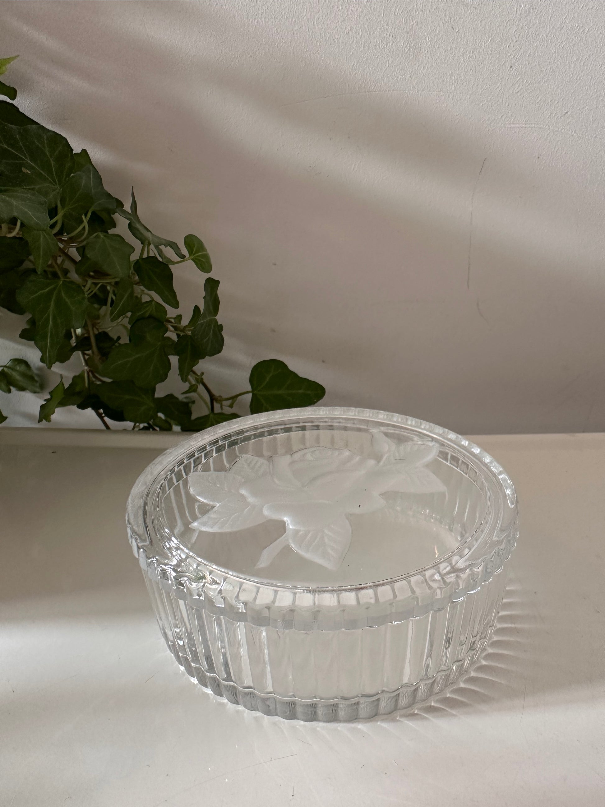 Superleuk vintage glazen doosje uit de jaren 70, met reliëf van een roos op het deksel. Mooi dik glas met verticale ribbelstructuur aan de zijkant. Leuk voor sieraden, sleutels of gewoon als blikvanger op je kastje. Q519