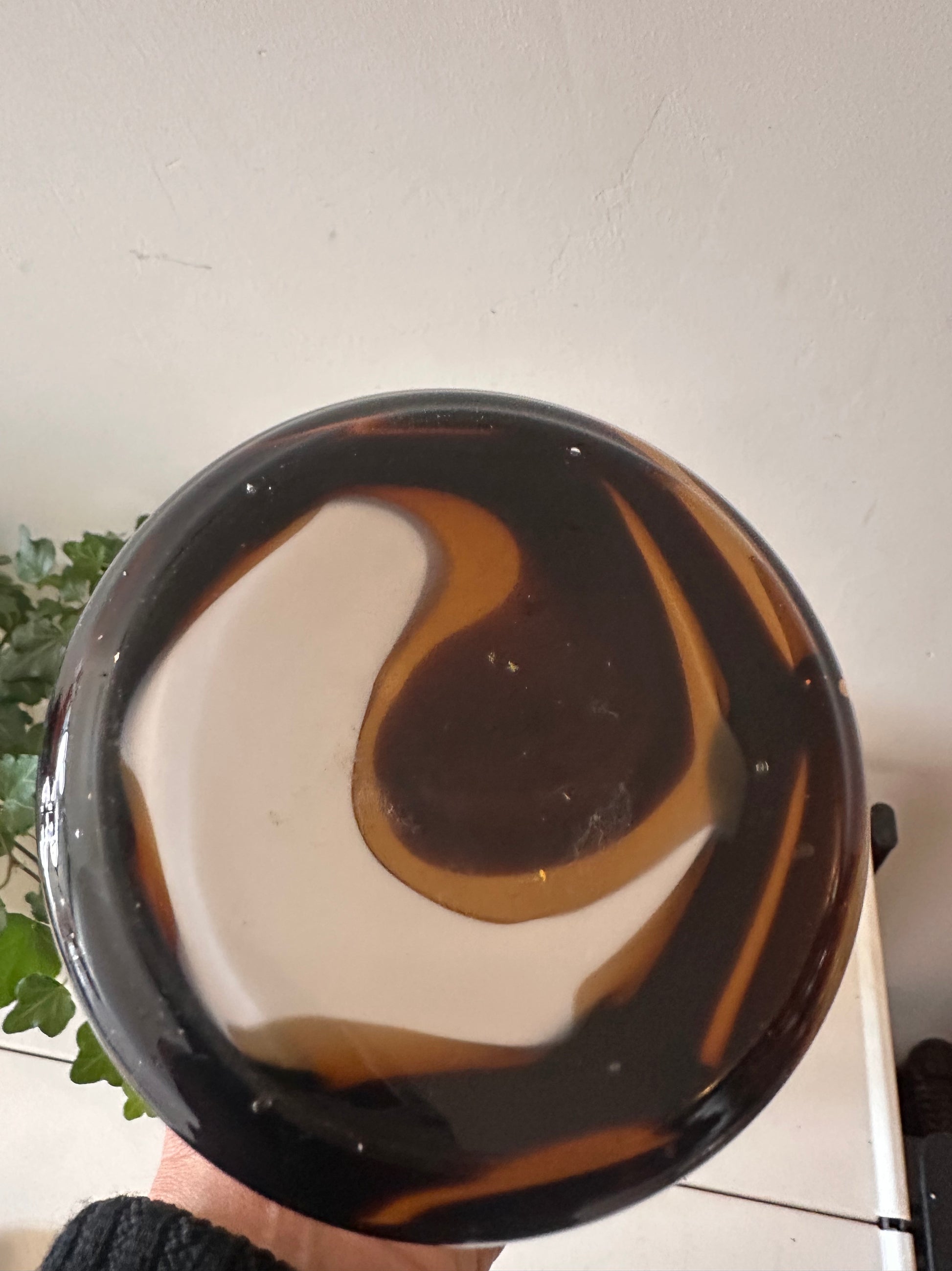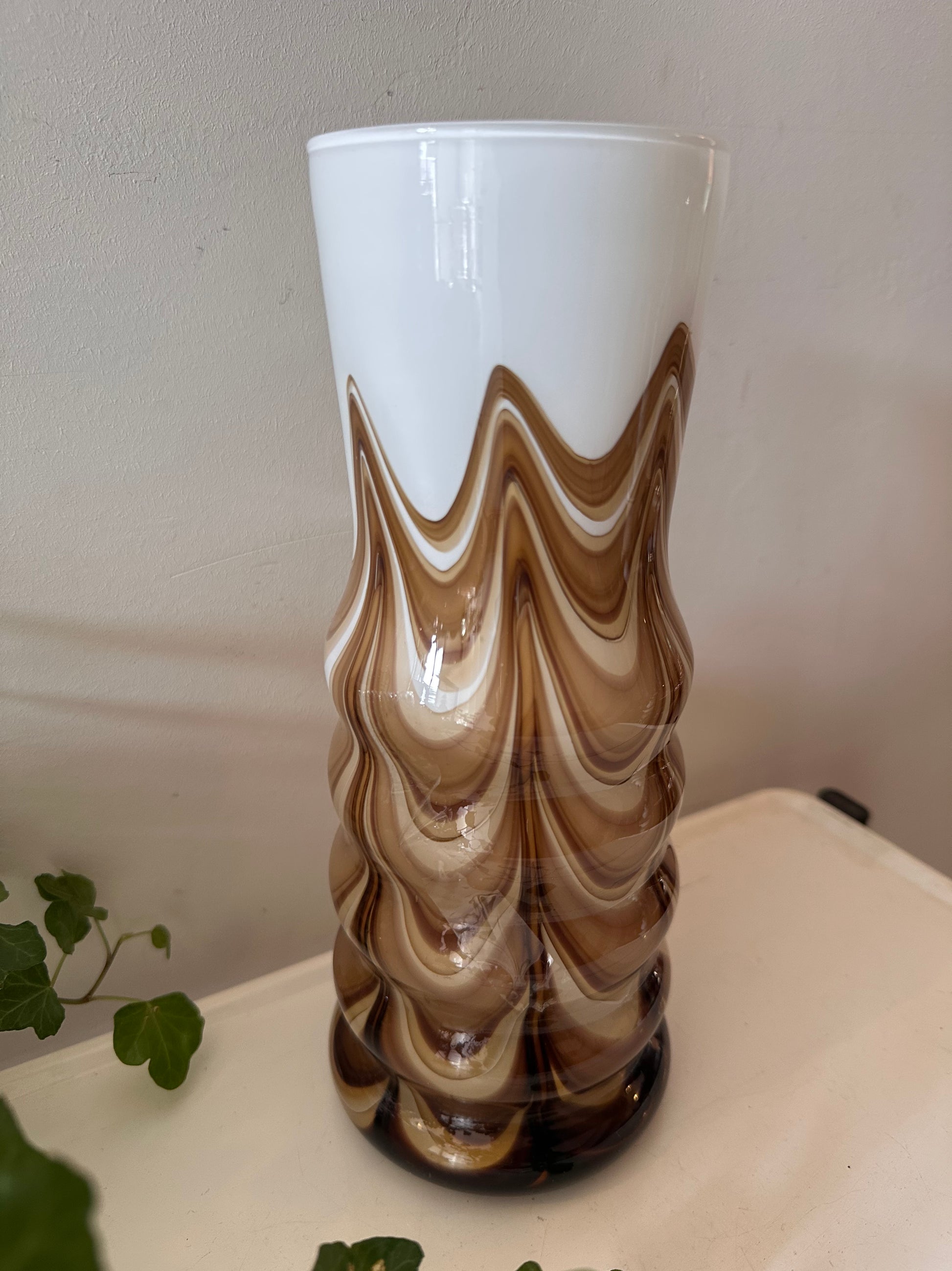 Mooie vintage opaline glazen vaas met een golvend swirl-patroon in bruin en wit. Handgeblazen en met dikke wand, waardoor de kleuren echt diepte krijgen. De vaas heeft een hoge vorm met mooie welvingen in het glas – een typisch jaren 70 design! Q371