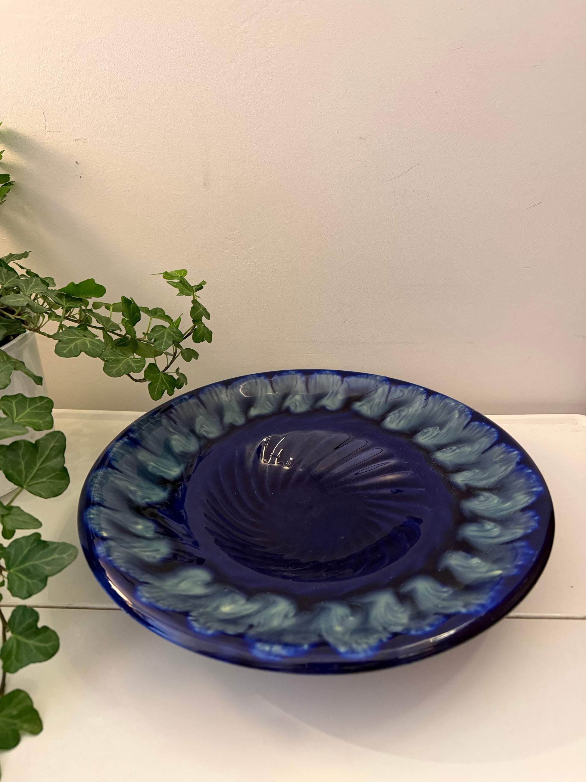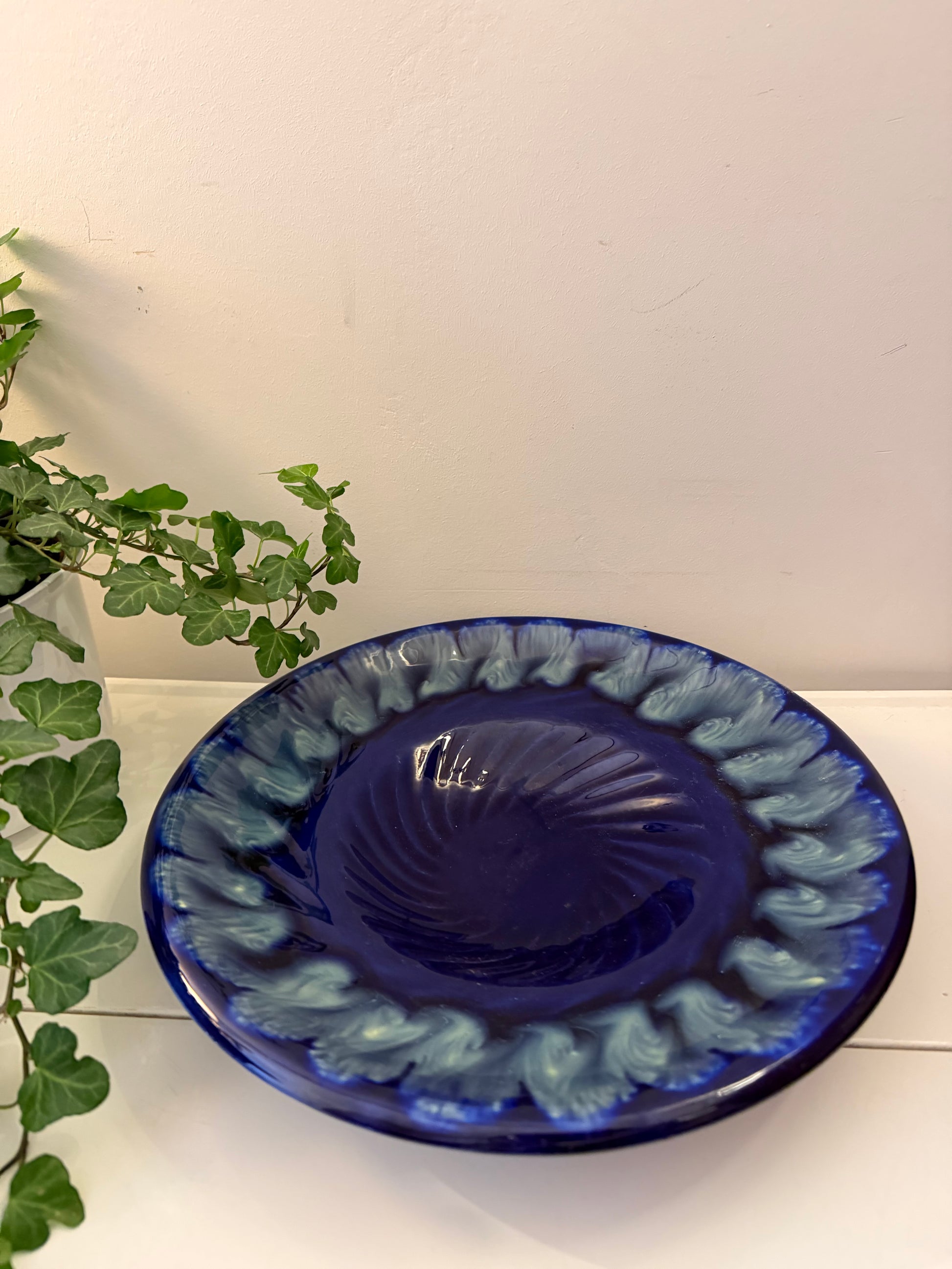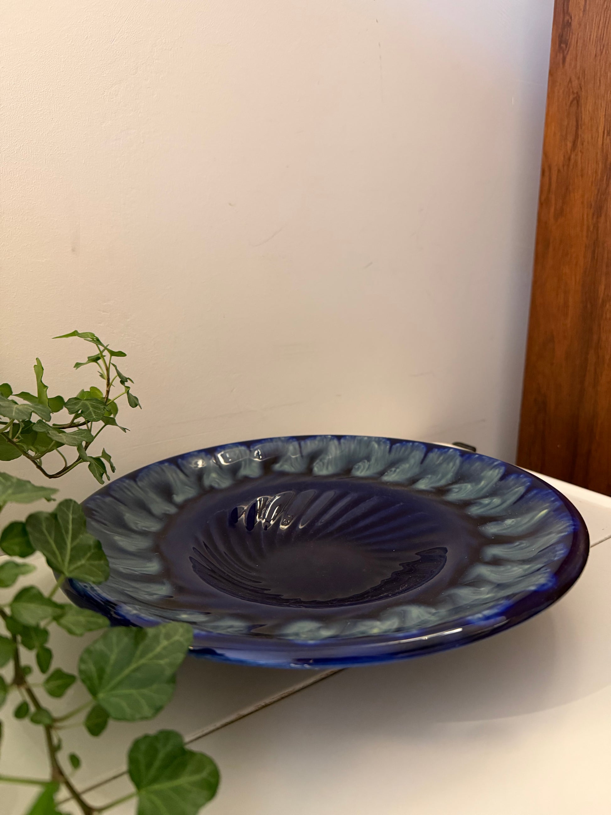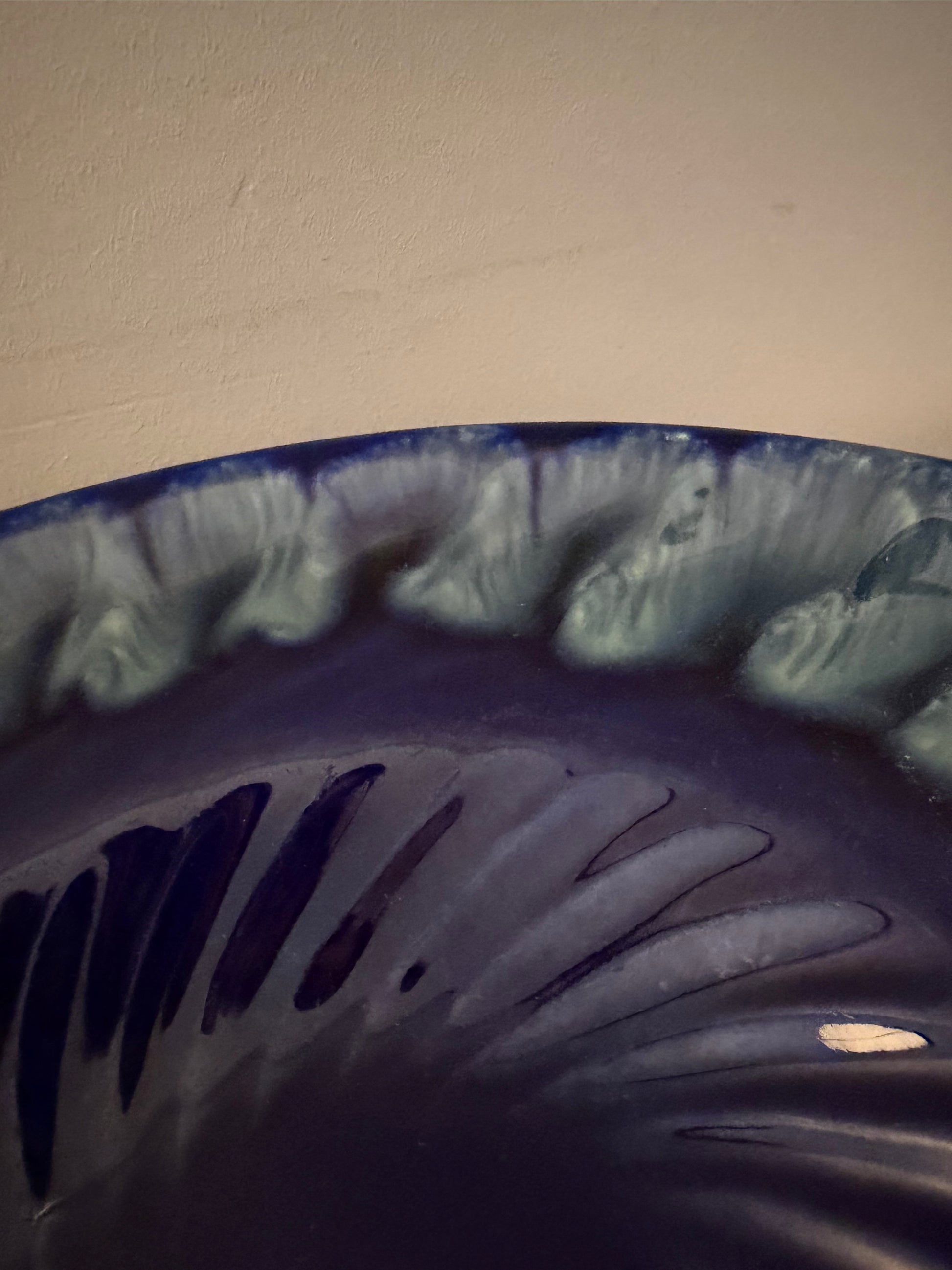Hele mooie grote schaal in diep donkerblauw met zo’n gave gemêleerde rand. Echt jaren 70 keramiek: glanzend glazuur, stevige vorm en dat swirl reliëf in het midden. Q835