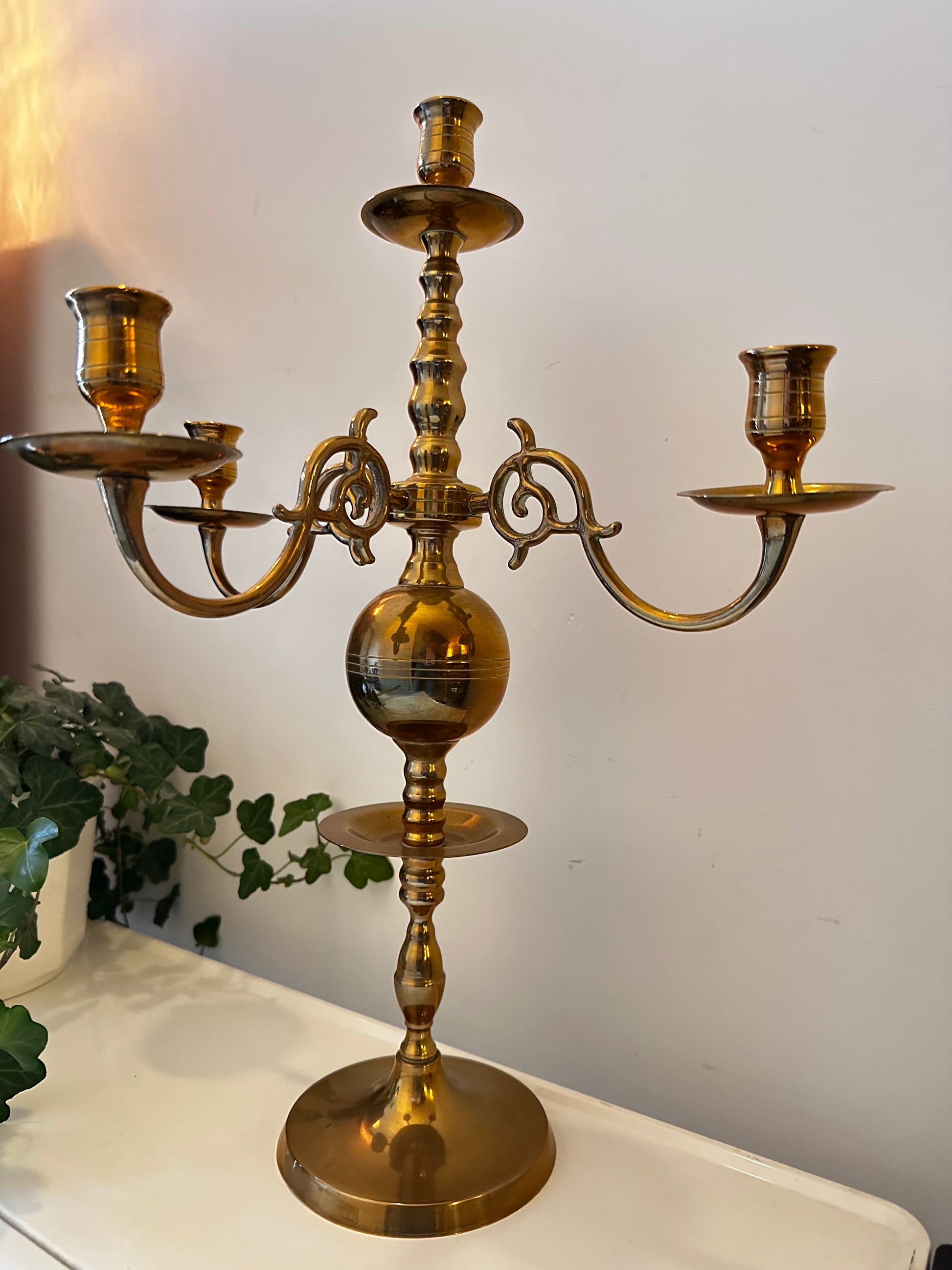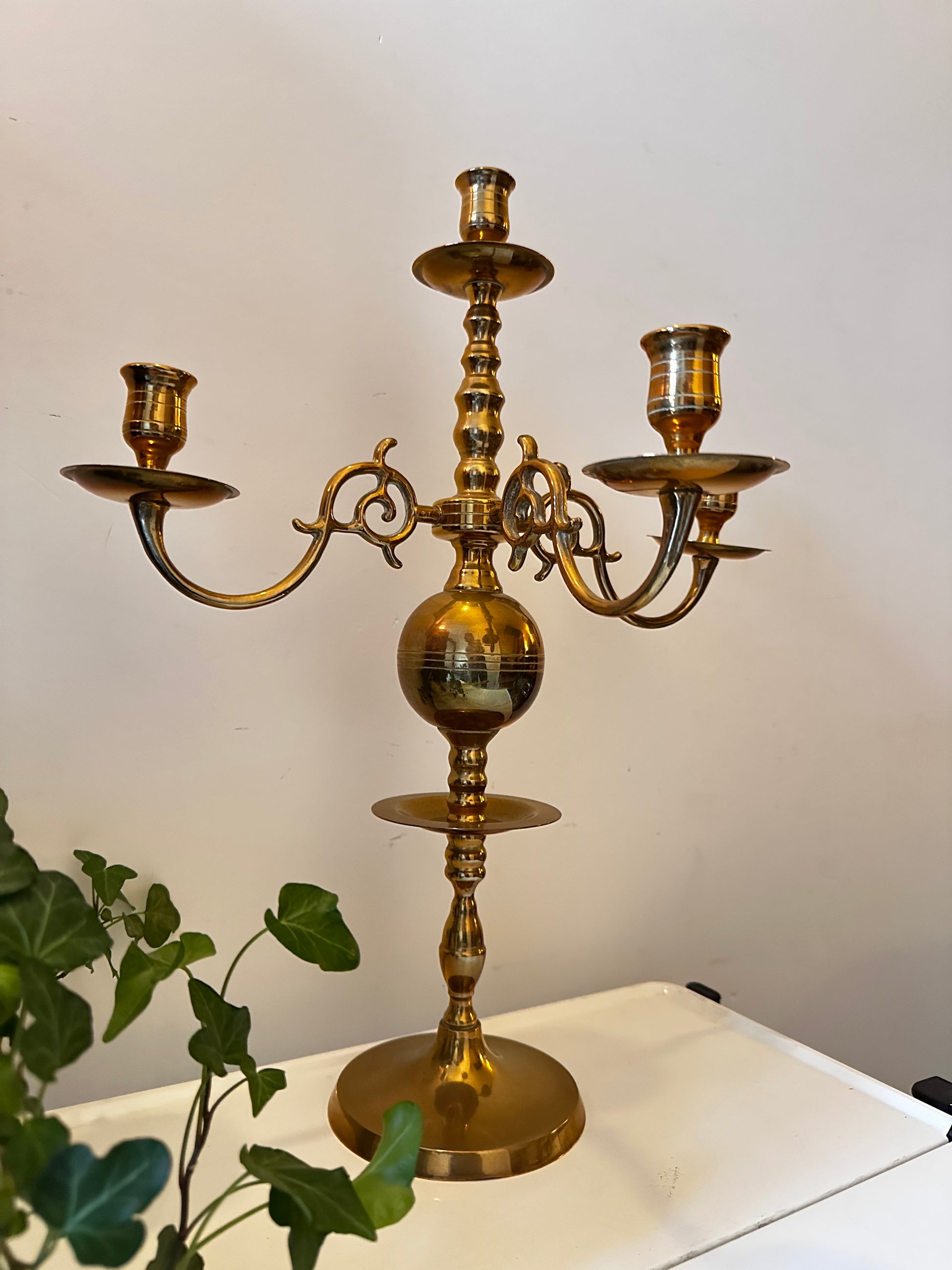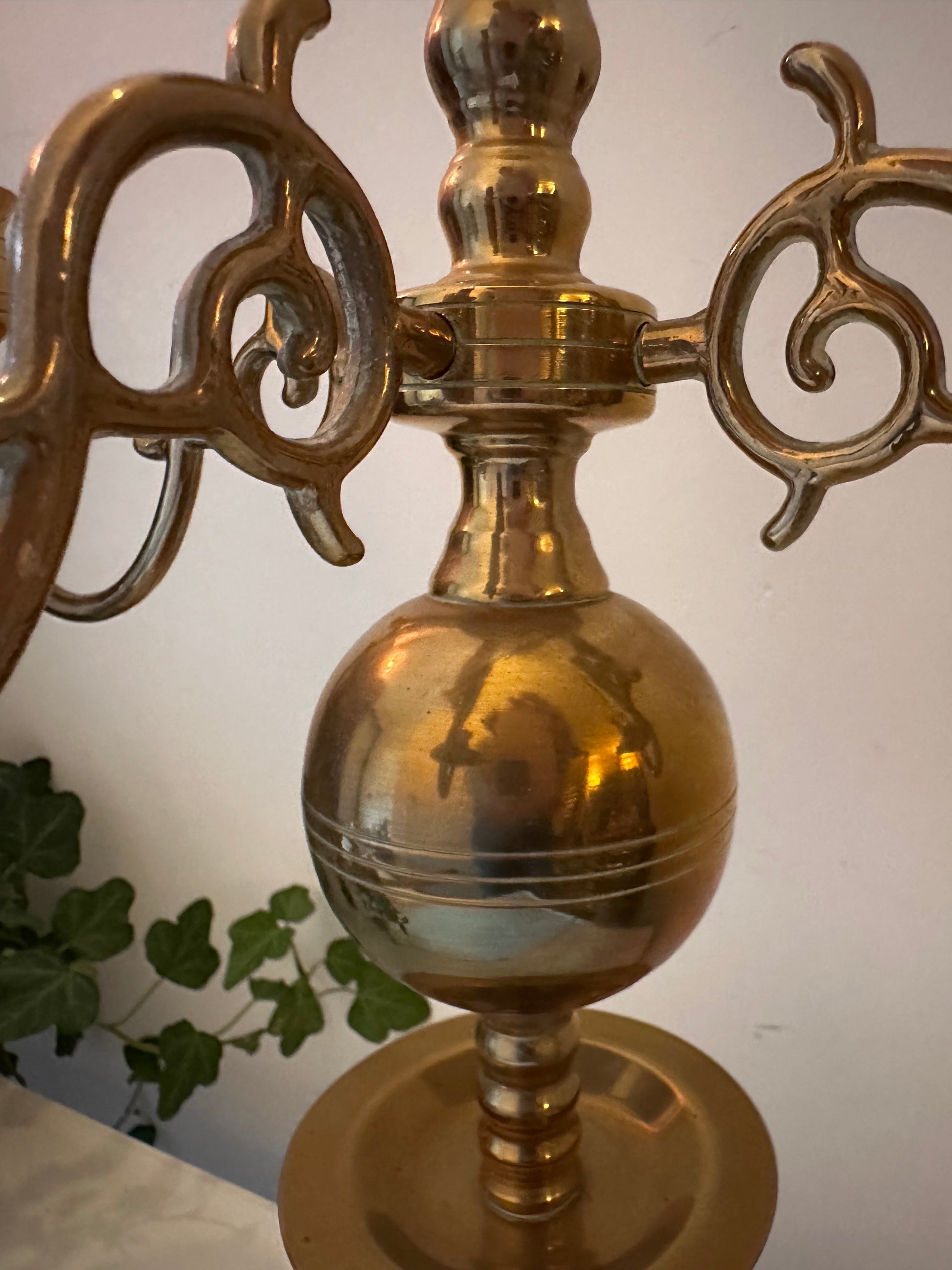 Statement piece alert! Deze vintage messing kandelaar heeft sierlijke krullen, een klassieke bolvorm in het midden en plek voor 3 kaarsen. Mooi gepolijst en in goede staat – met een beetje patina die hem die typische old-school charme geeft. Perfect voor op een dressoir of als centerpiece op tafel.