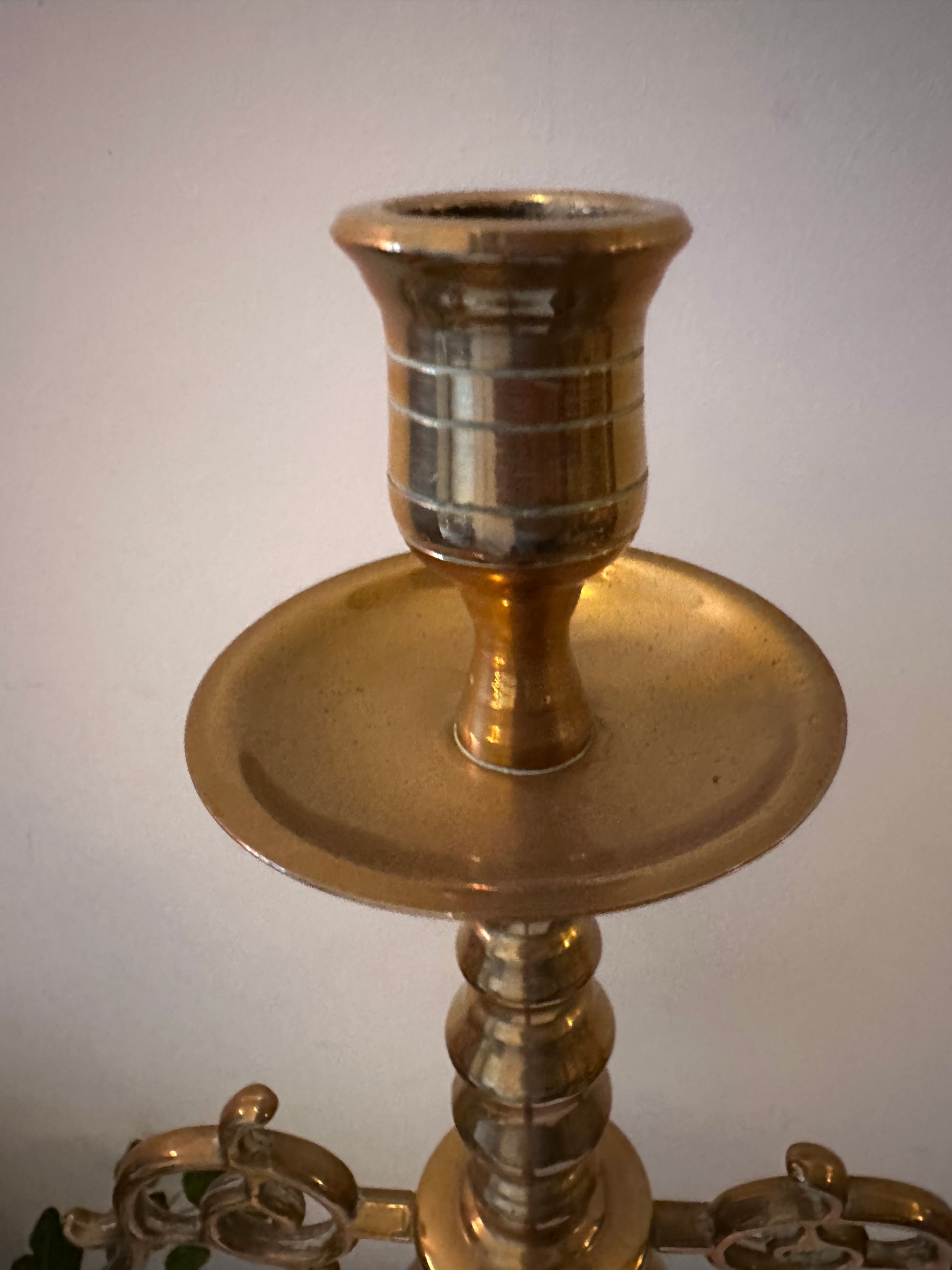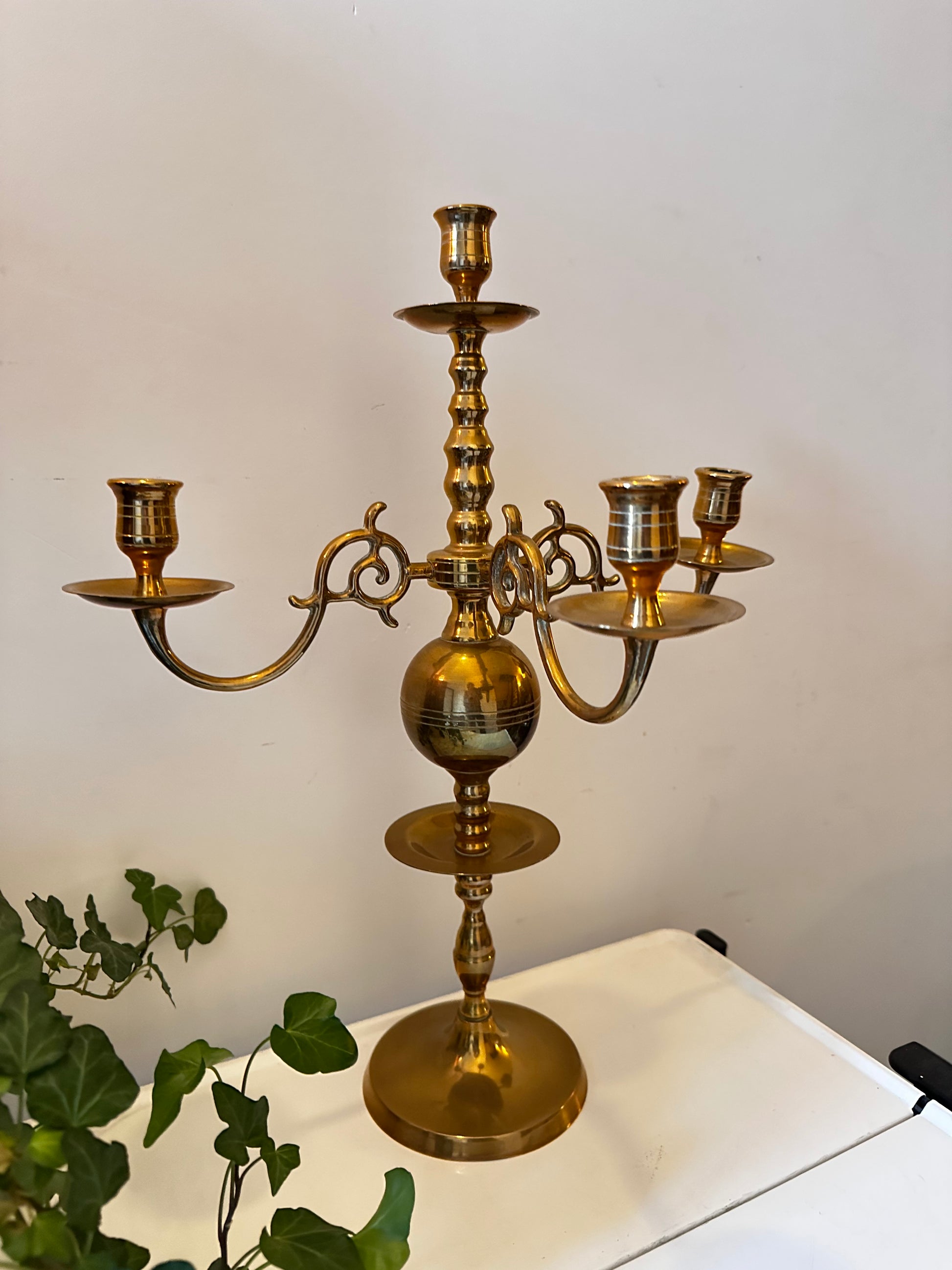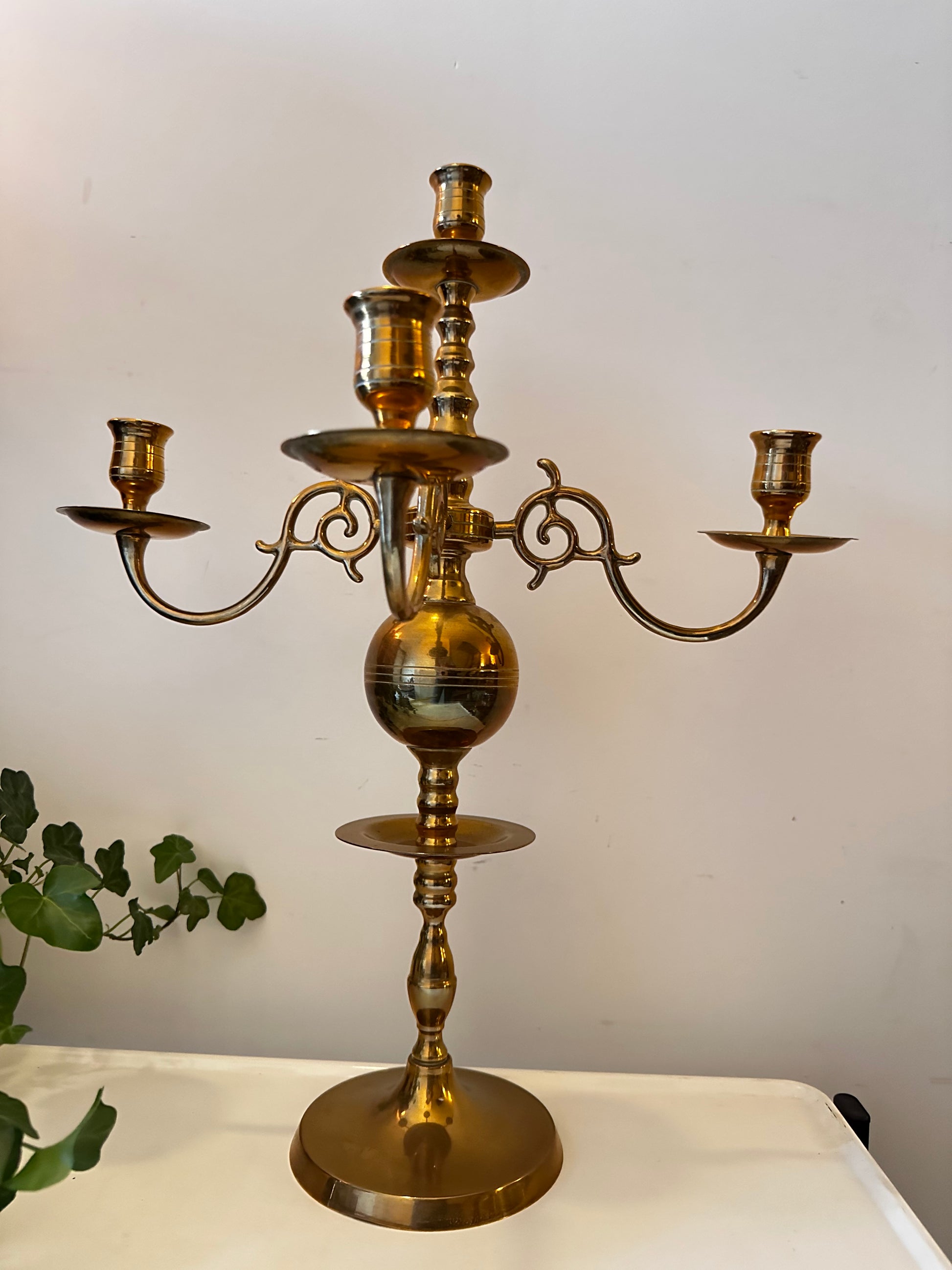 Statement piece alert! Deze vintage messing kandelaar heeft sierlijke krullen, een klassieke bolvorm in het midden en plek voor 3 kaarsen. Mooi gepolijst en in goede staat – met een beetje patina die hem die typische old-school charme geeft. Perfect voor op een dressoir of als centerpiece op tafel.