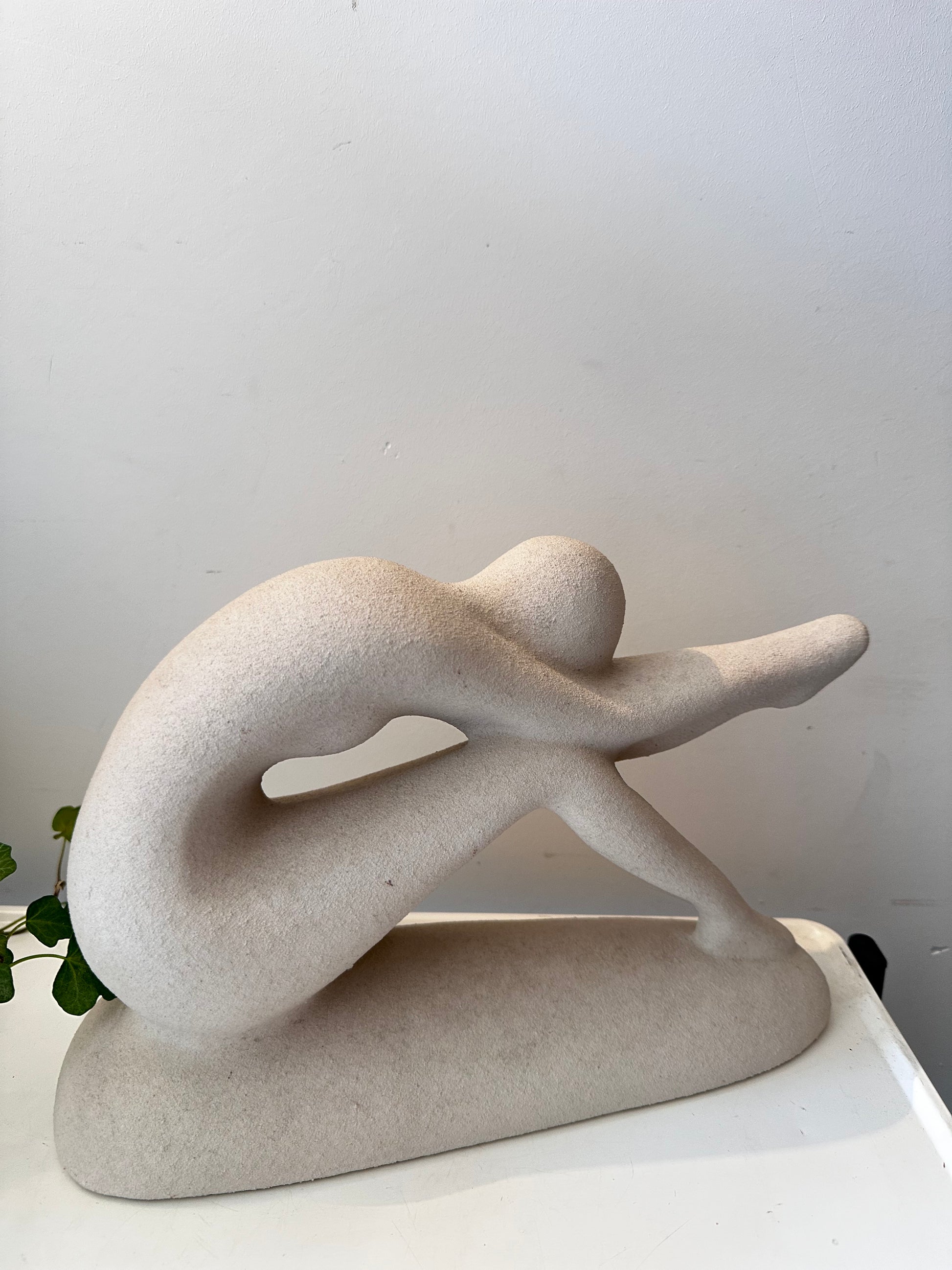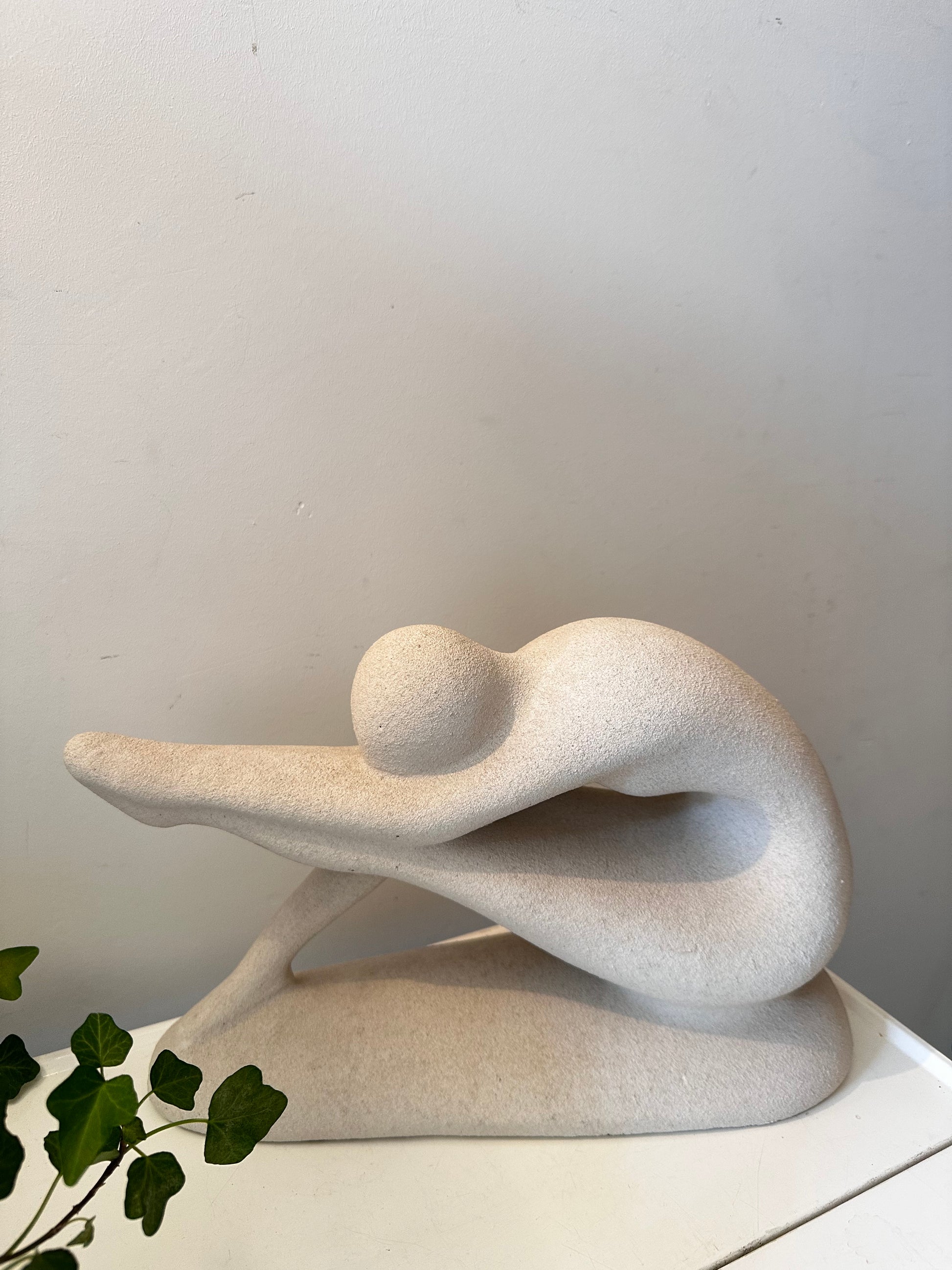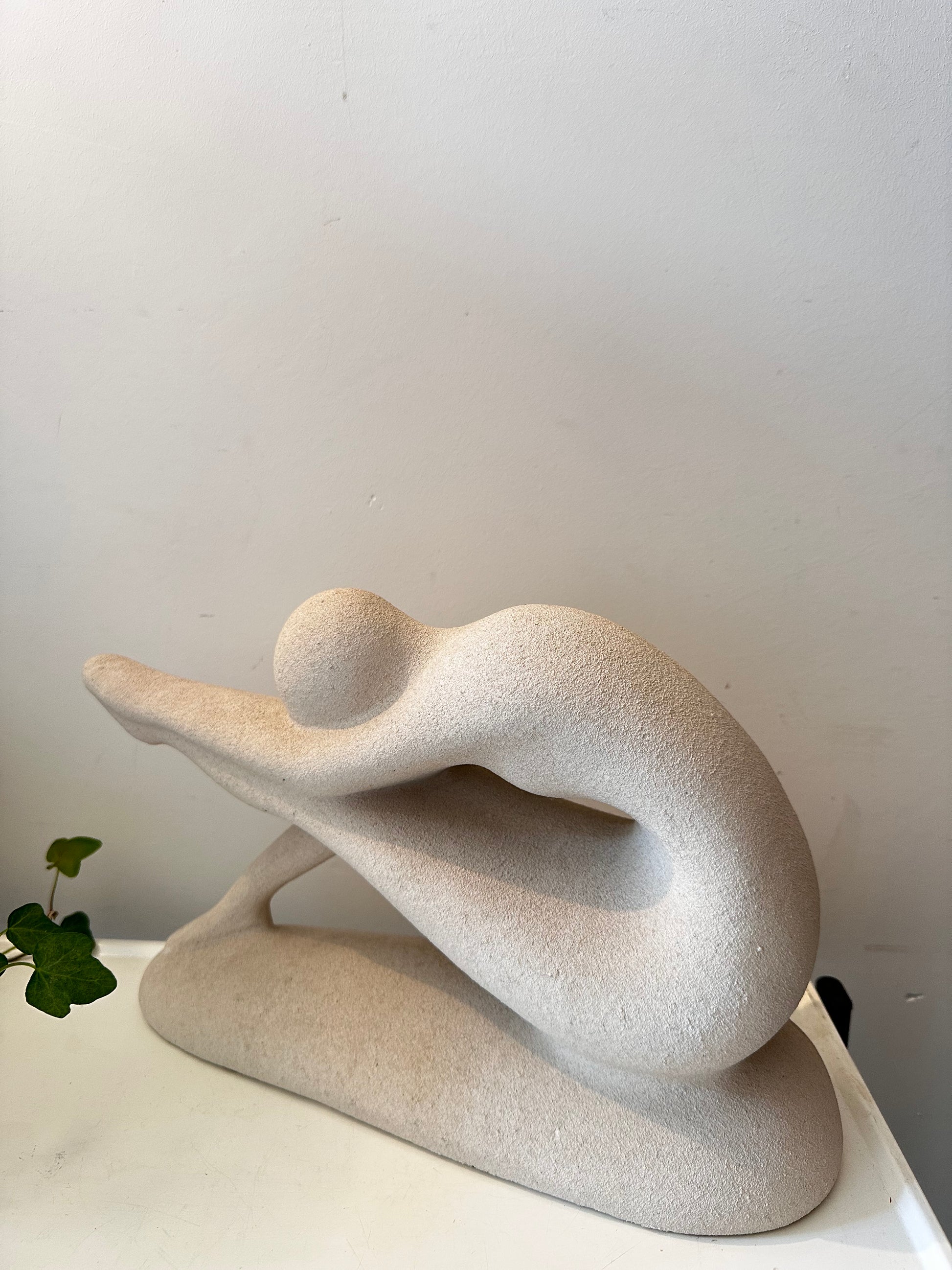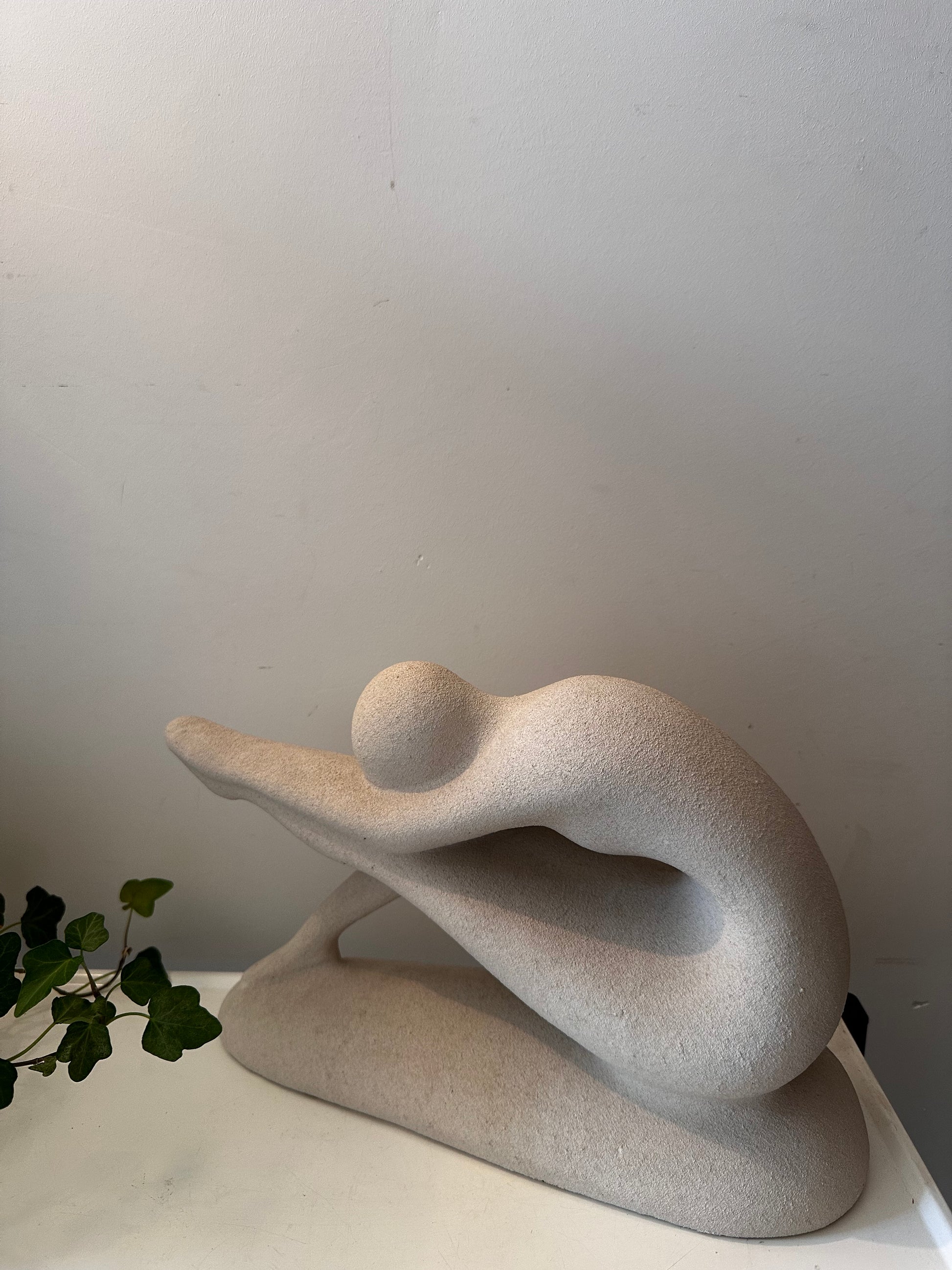 Minimalistisch en organisch vormgegeven beeld in een zachte zandkleur. De houding is elegant en sierlijk, met vloeiende lijnen en een rustige uitstraling. Gemaakt van een soort lichtgewicht materiaal met een korrelige, steenachtige textuur. In een mooie vintage staat. Q212
