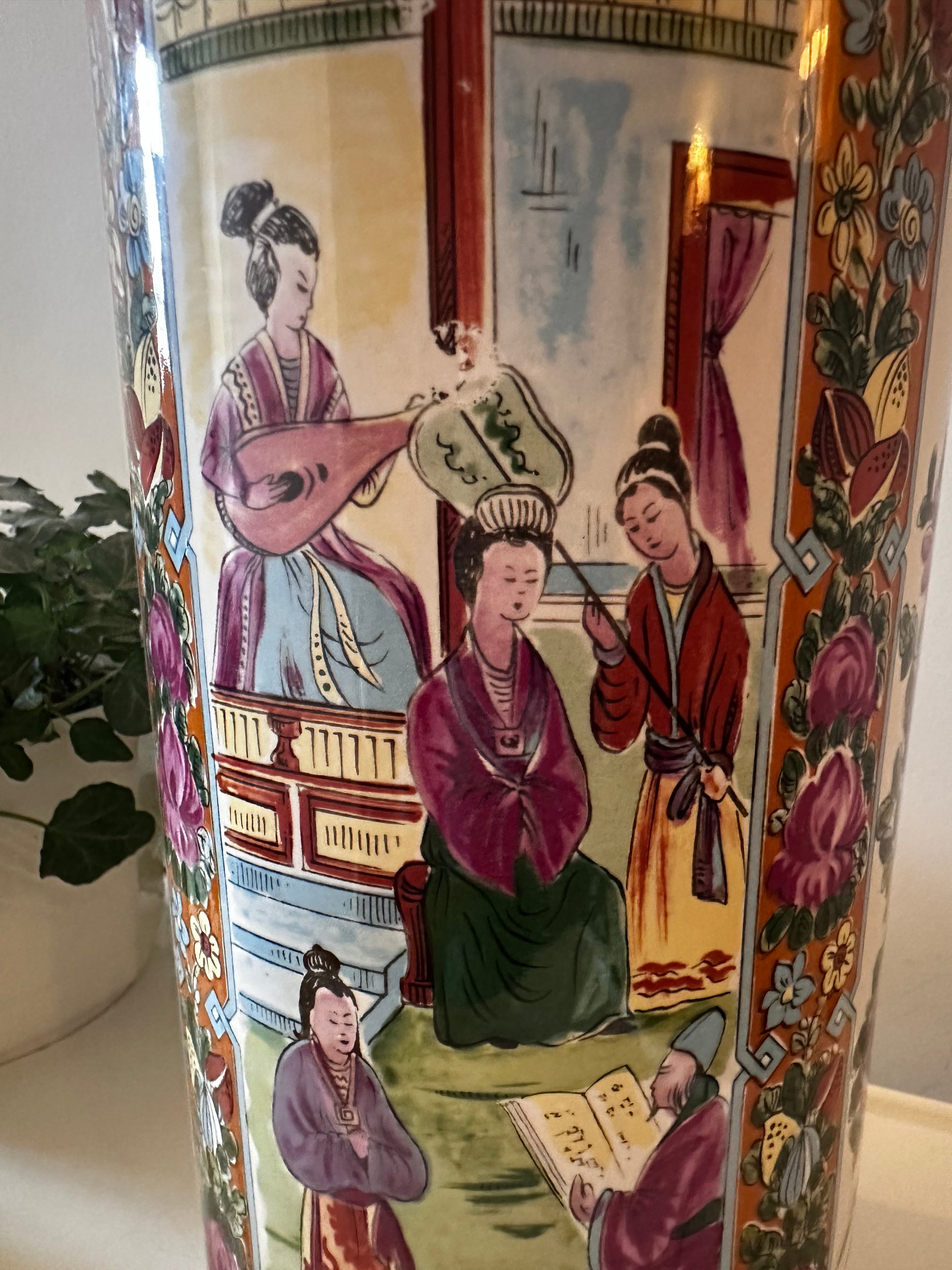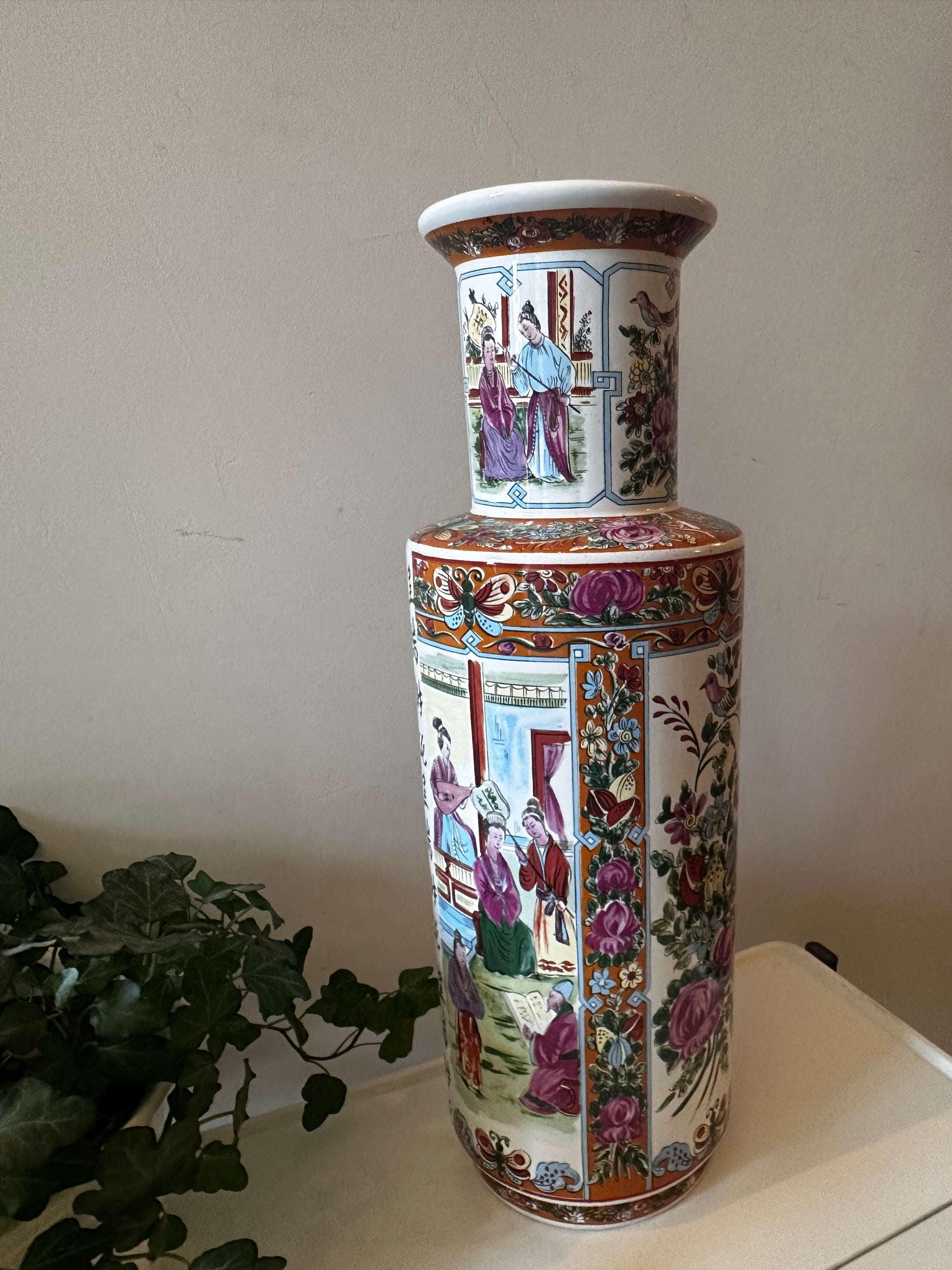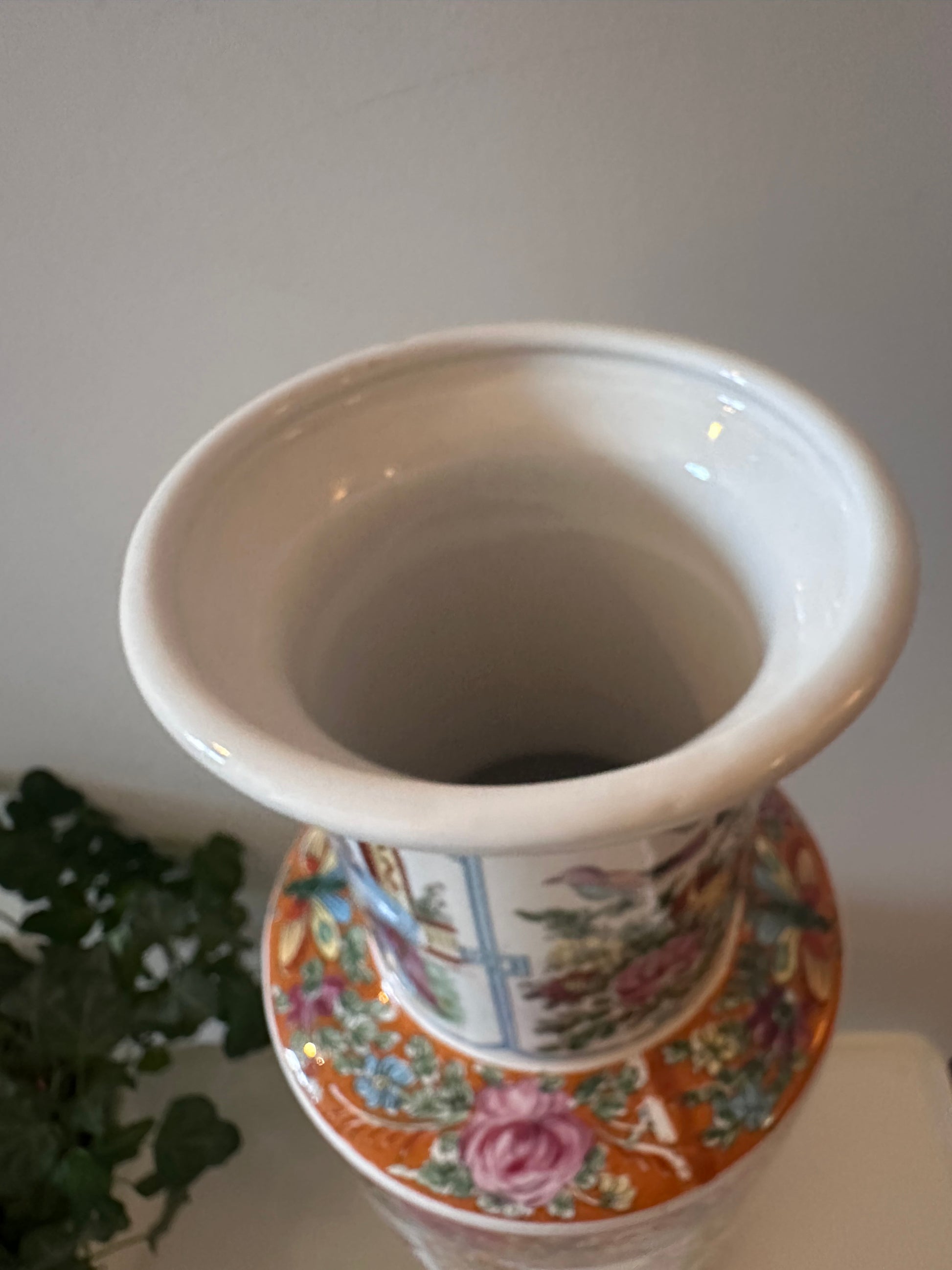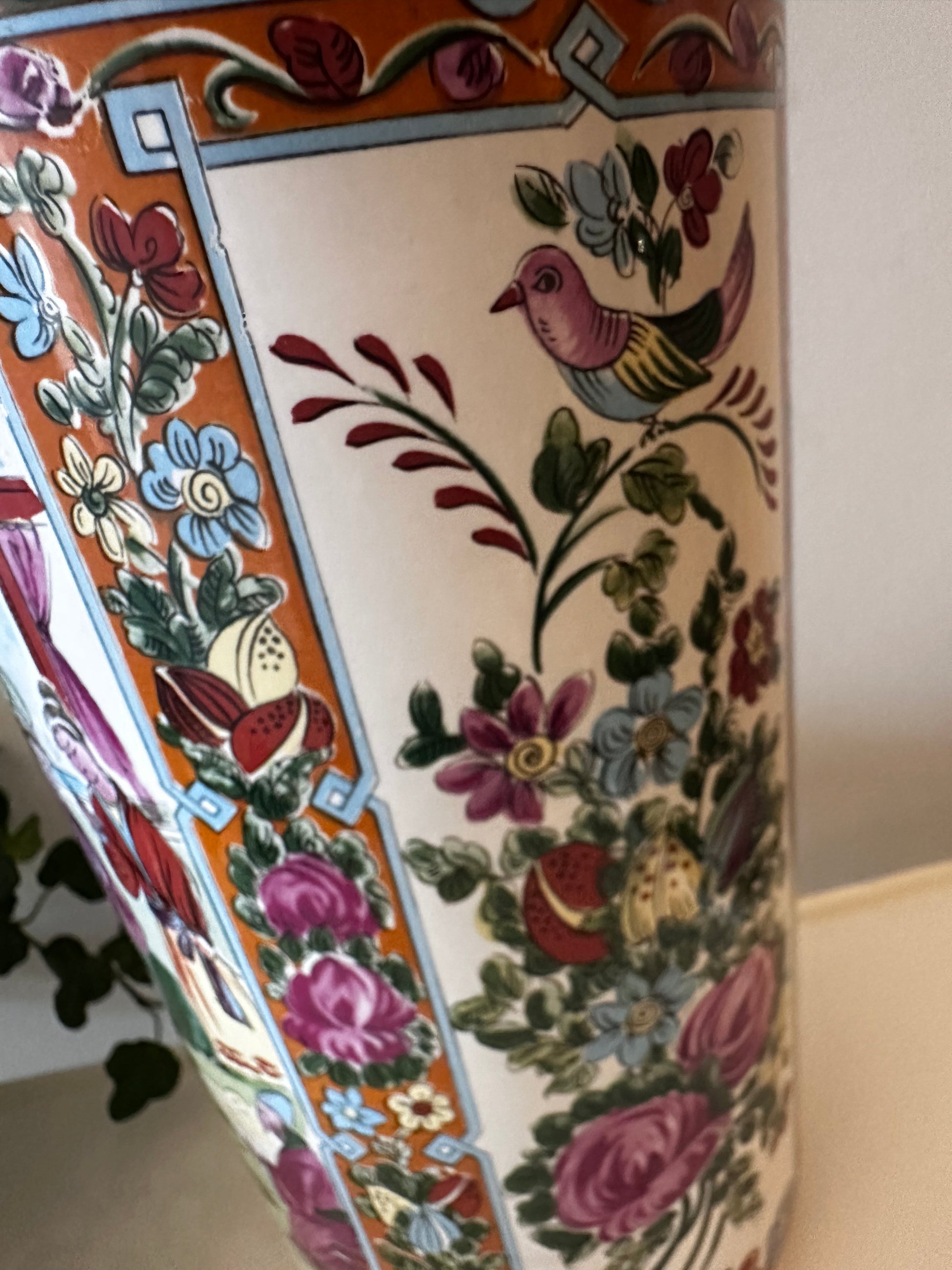 Te gekke vaas met prachtige Chinese taferelen. Kleurrijk handbeschilderd met onder andere bloemen, vogels en figuren in traditionele kleding. Echt een opvallende vaas! Q58
