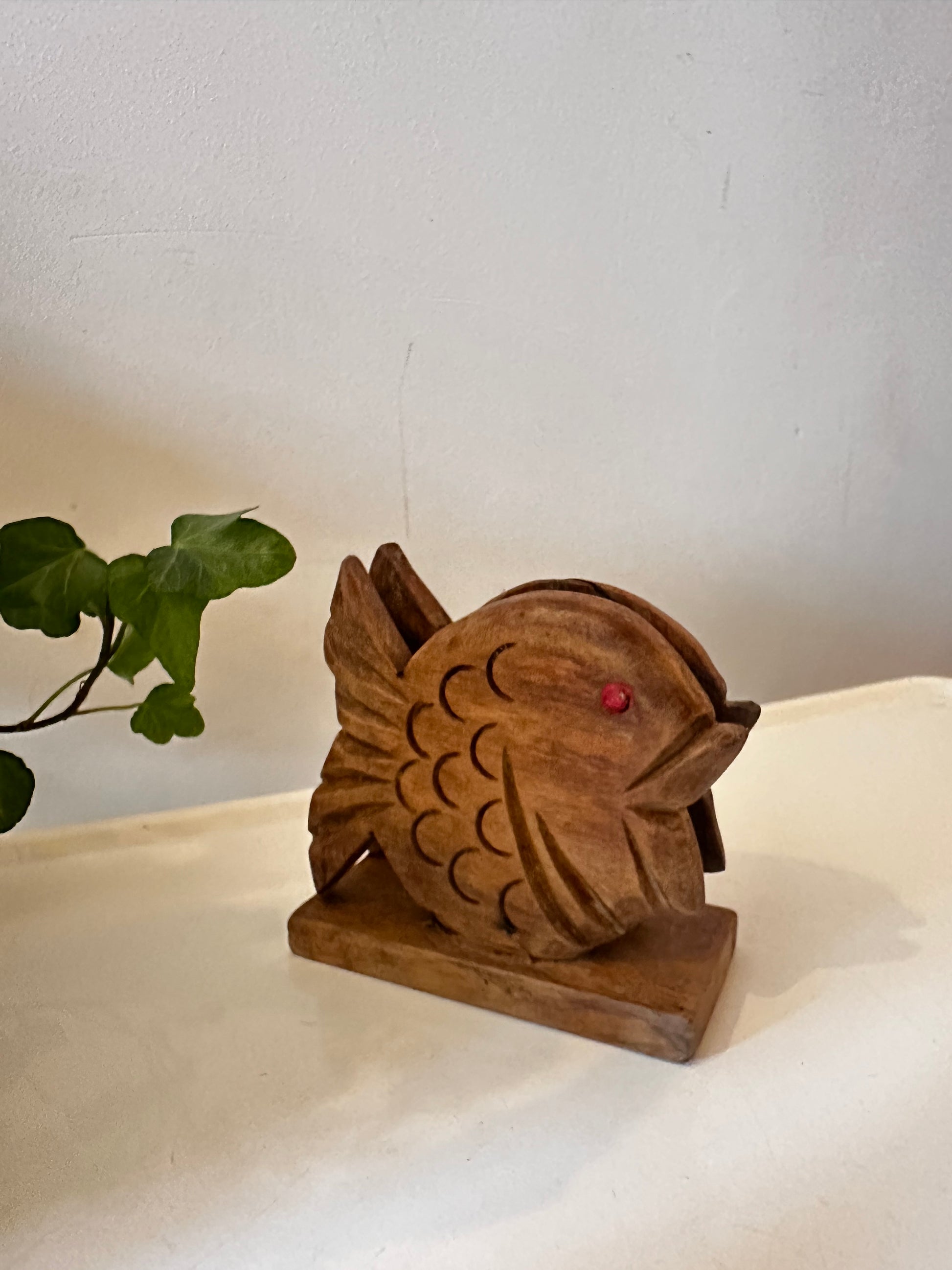 Superleuke houten brievenhouder in de vorm van een vis. Met de hand gesneden uit massief hout en afgewerkt met een rood kraaltje als oog. Door de gleuf in het midden ideaal om post of kaartjes in te zetten. Q101