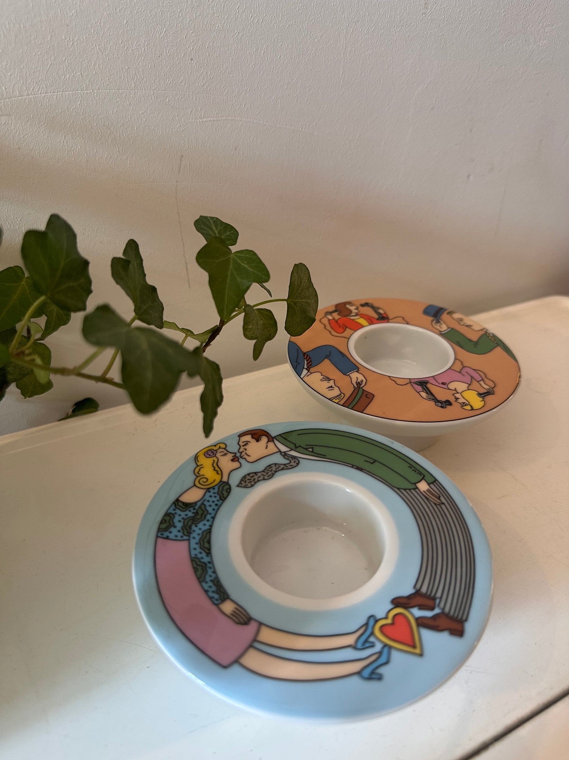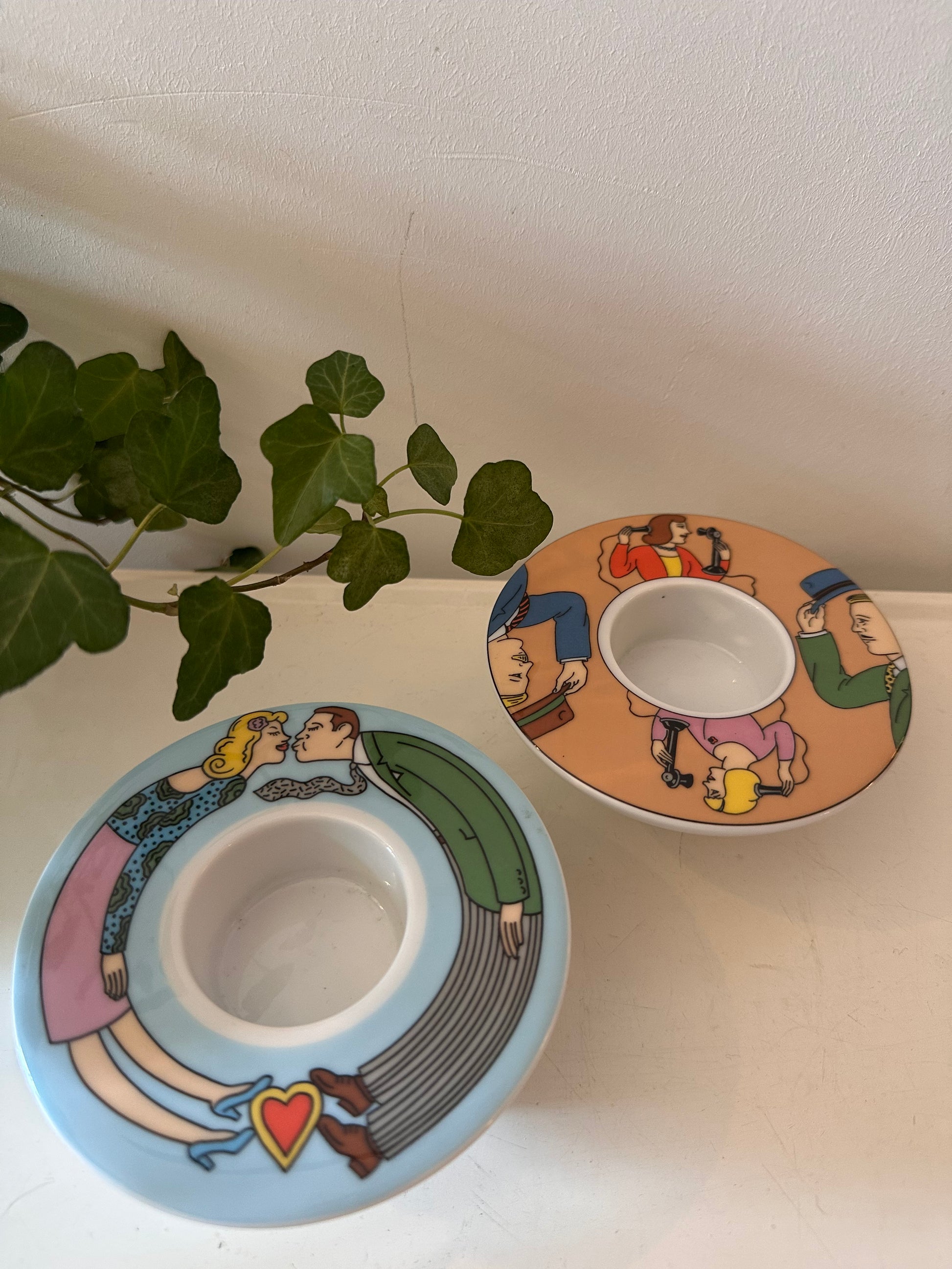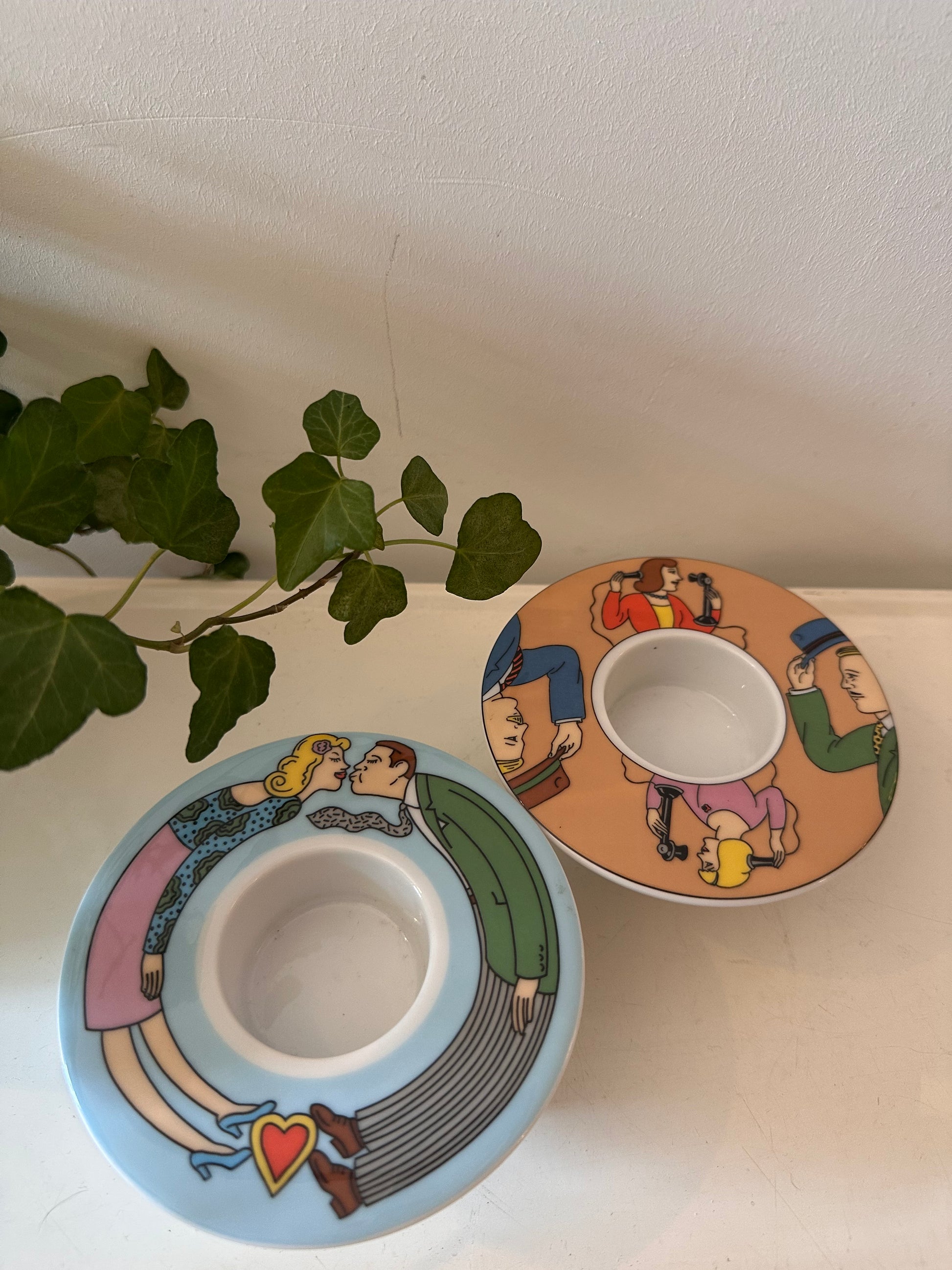 Hoe leuk zijn deze vrolijke jaren 80/90 waxinelichtjes van Arzberg? Bekend om hun strakke porselein maar hier in een kleurrijk ontwerp met stripachtige illustraties in echte Memphis/postmodern stijl. In een top vintage staat. Gemerkt onder en genummerd. Q292/3