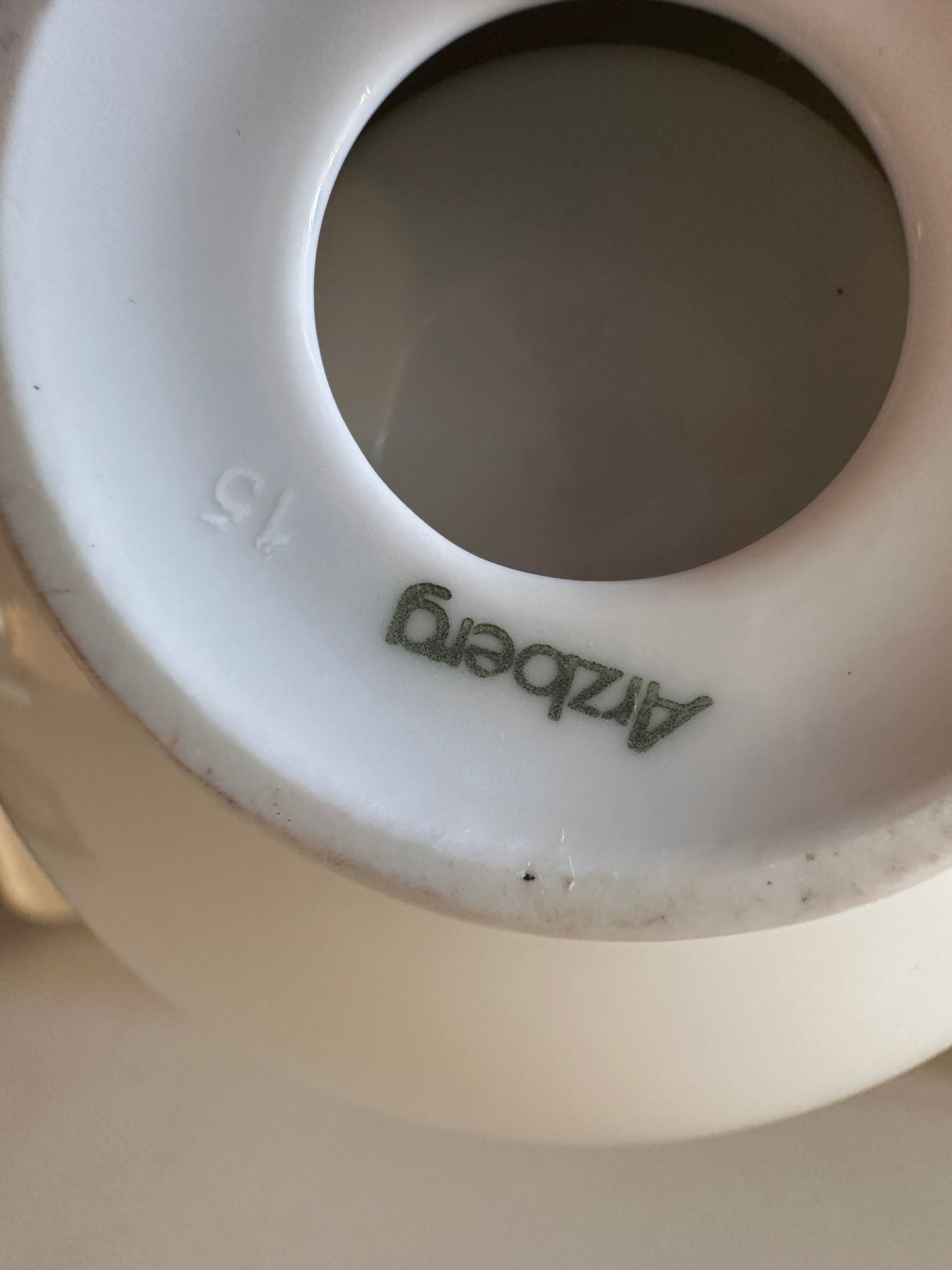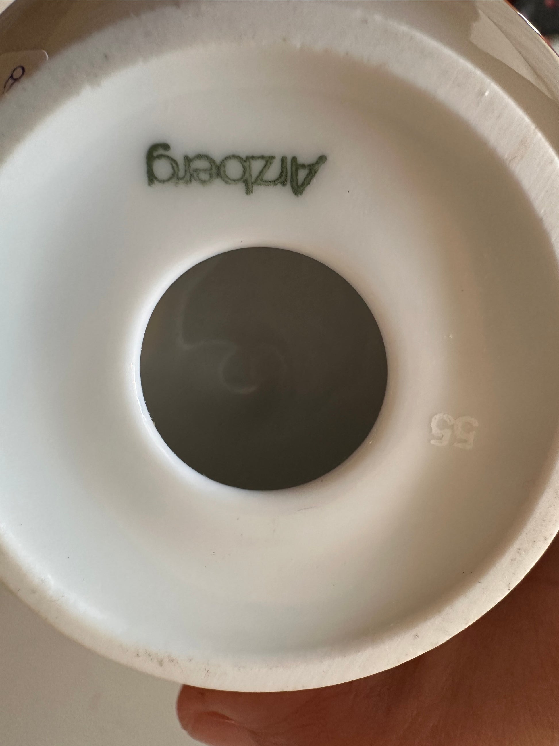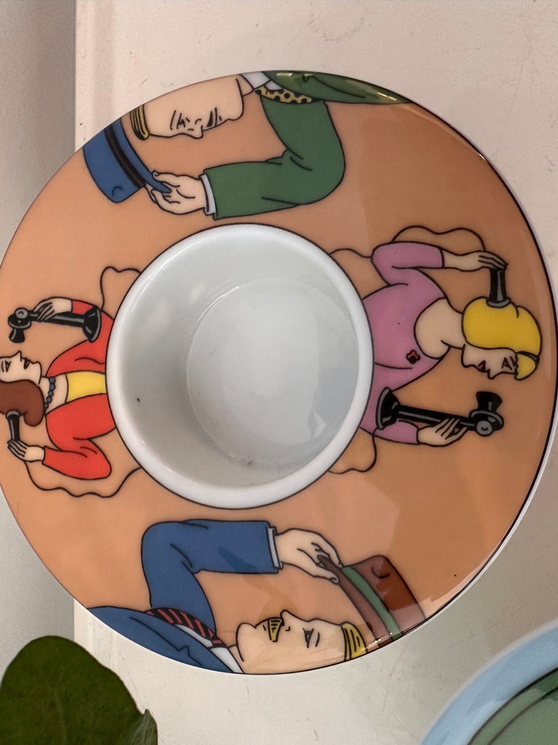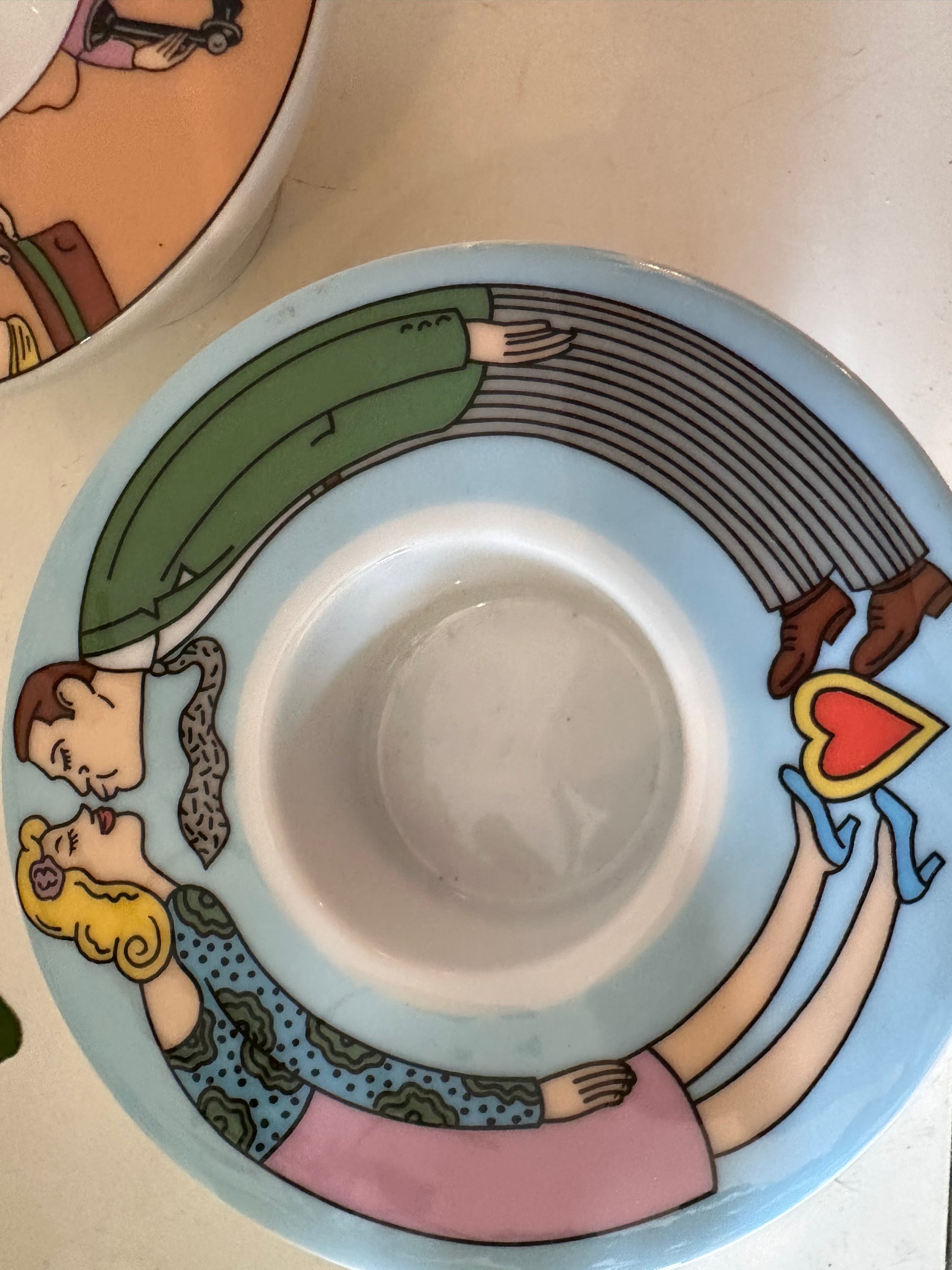 Hoe leuk zijn deze vrolijke jaren 80/90 waxinelichtjes van Arzberg? Bekend om hun strakke porselein maar hier in een kleurrijk ontwerp met stripachtige illustraties in echte Memphis/postmodern stijl. In een top vintage staat. Gemerkt onder en genummerd. Q292/3