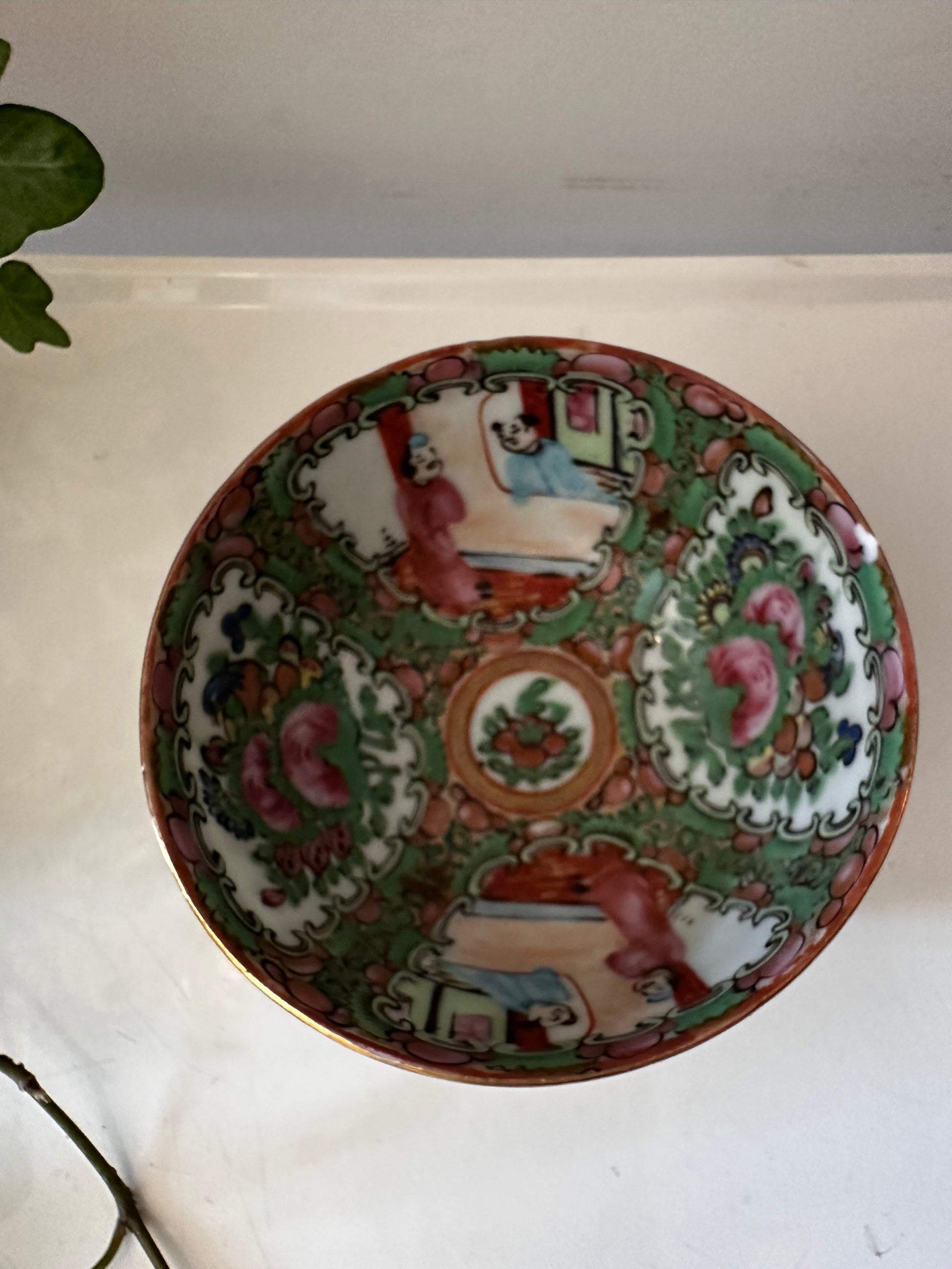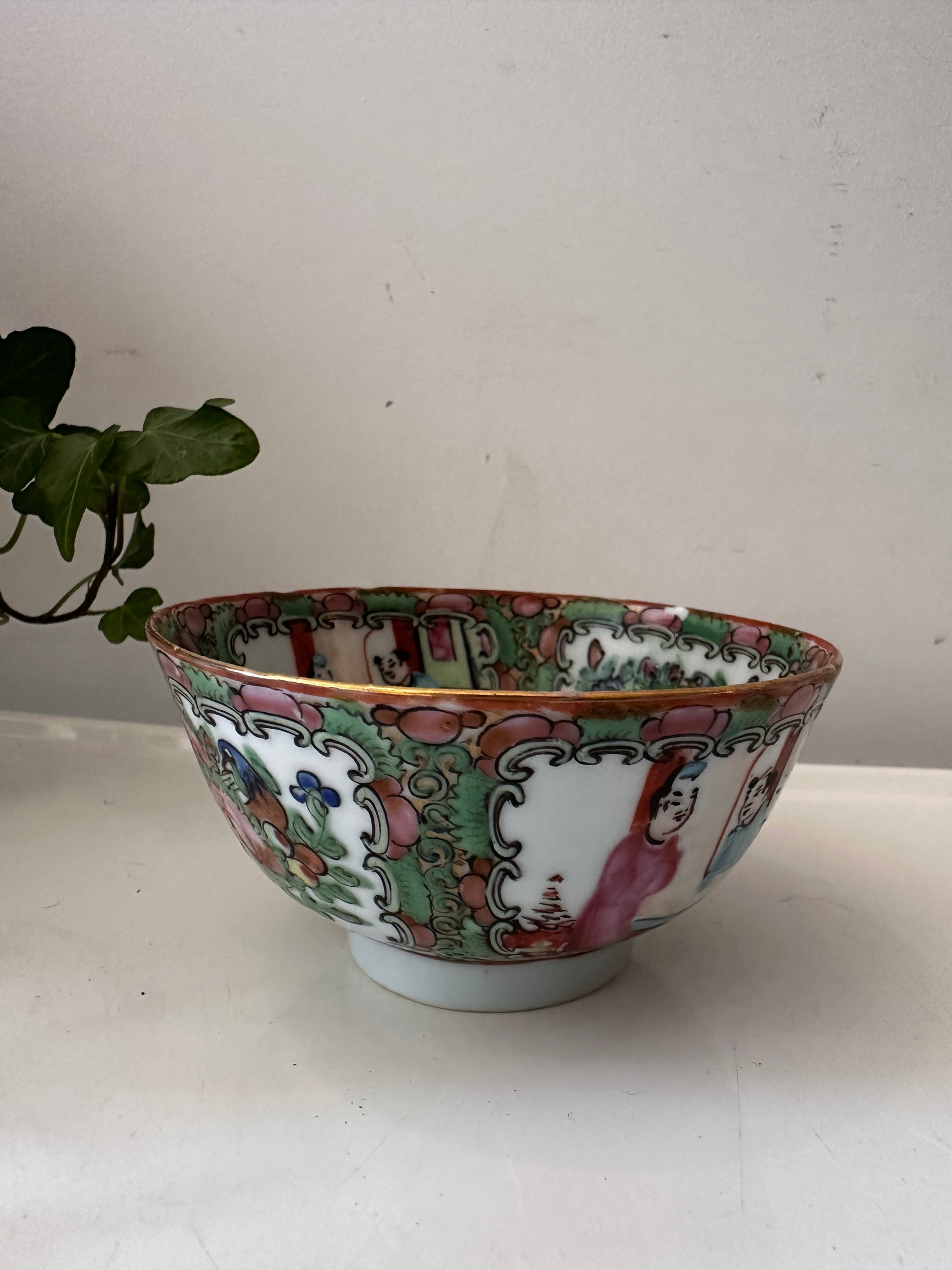 Handbeschilderd schaaltje in Rose Medallion-stijl met kleurrijke figuren, florale details en gouden accenten. Vintage porselein uit China. Q998
