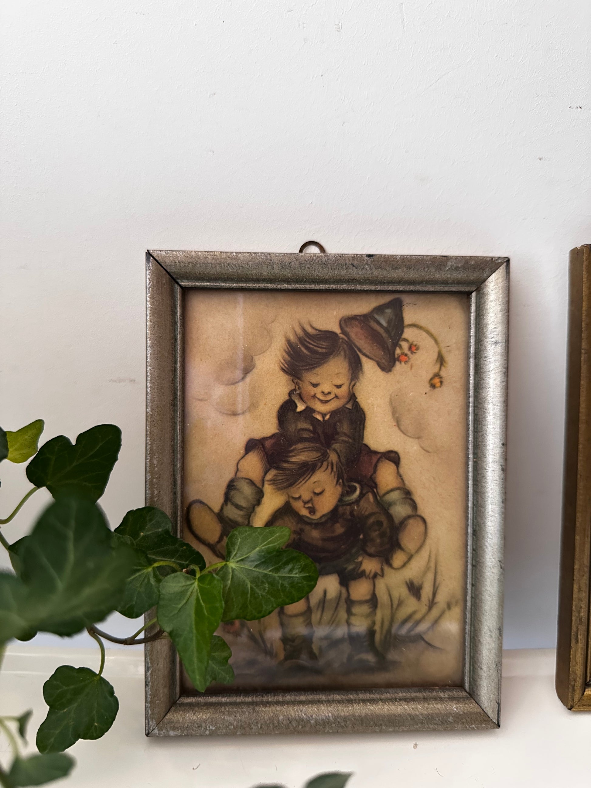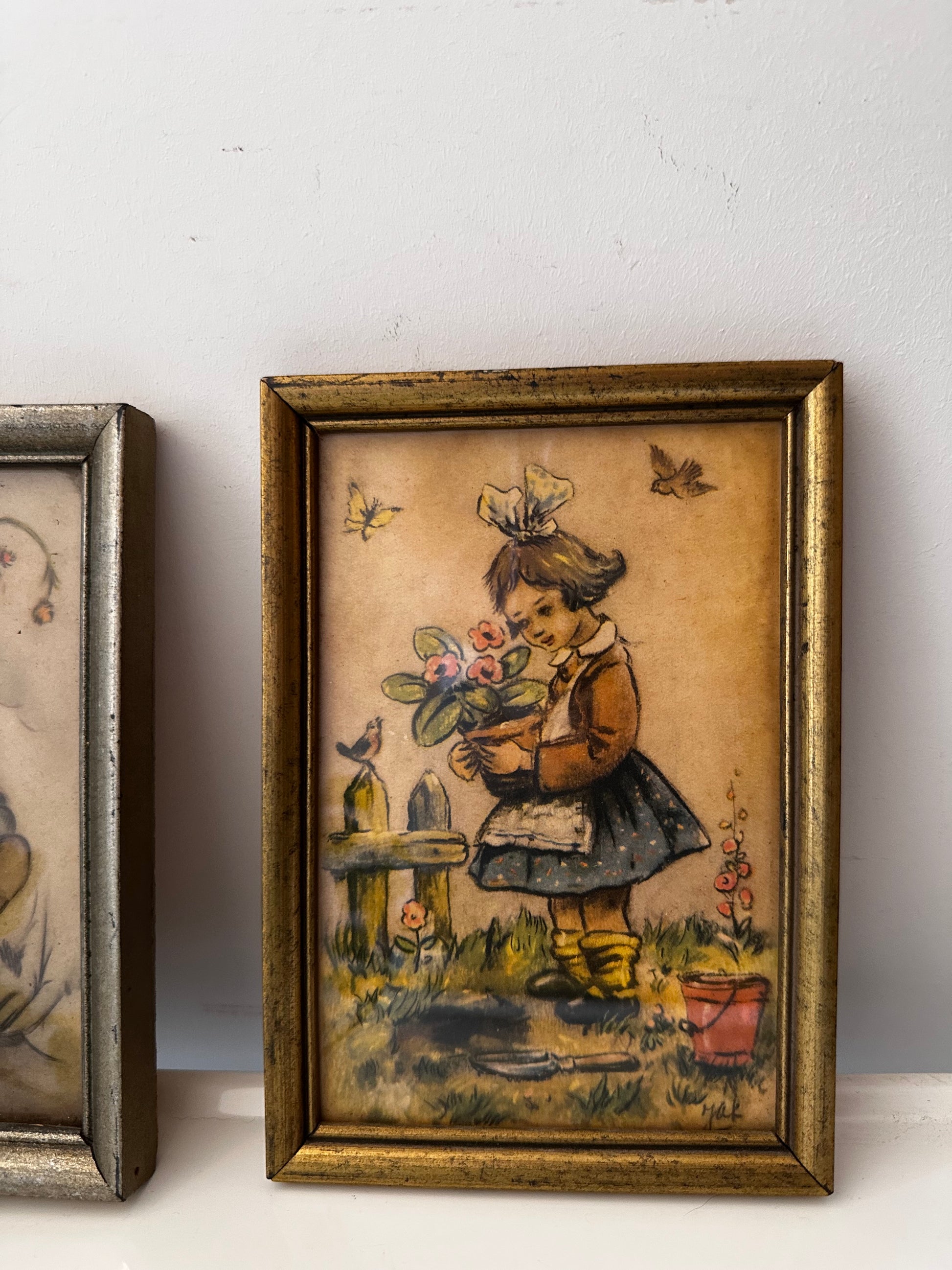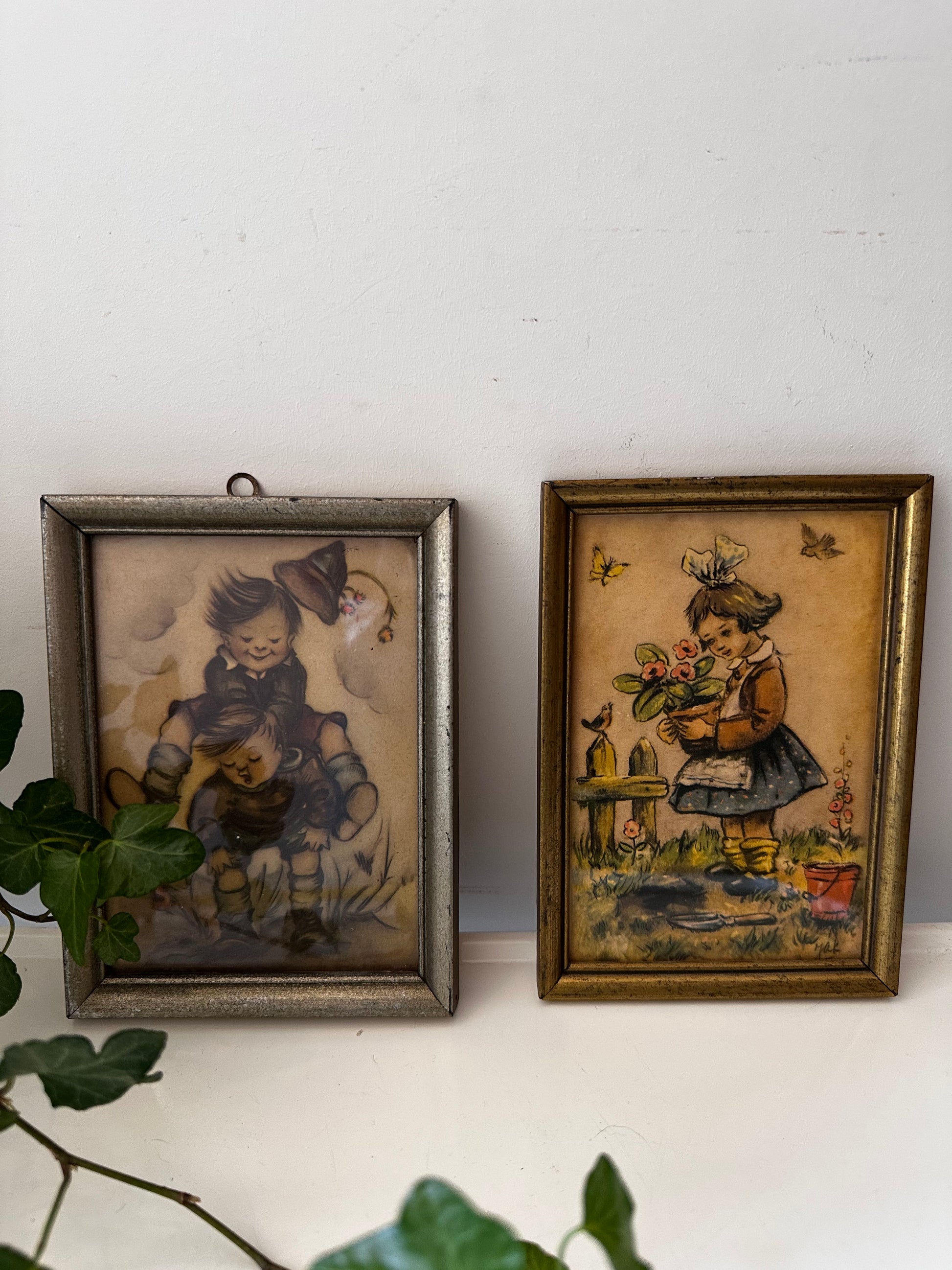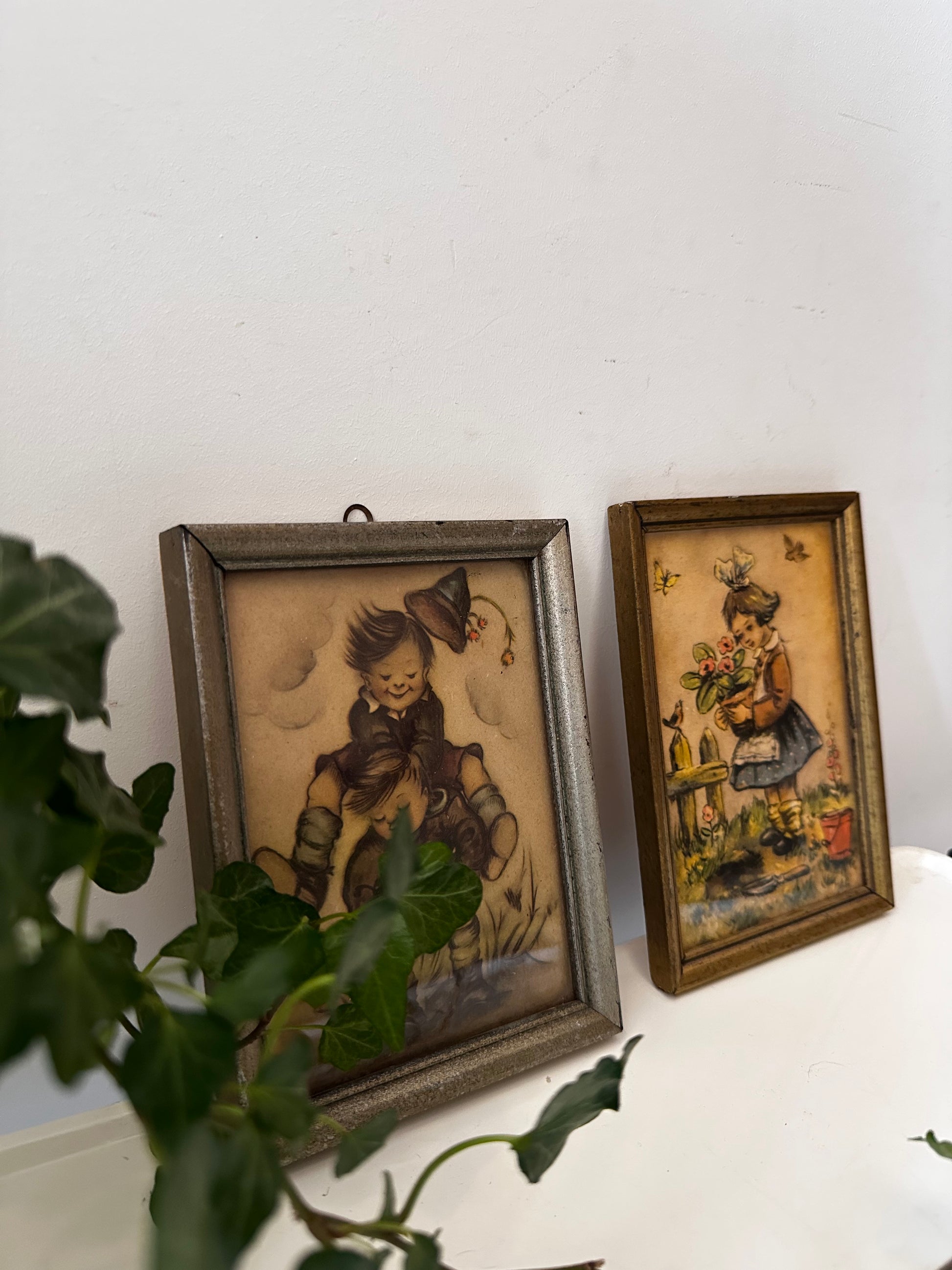 Schattige duo wandlijstjes met nostalgische illustraties in zachte kleuren. Eén met een meisje in de tuin, de ander met twee kinderen in een knusse scène. Helemaal in die typische jaren ‘50/’60 stijl. Q91/92
