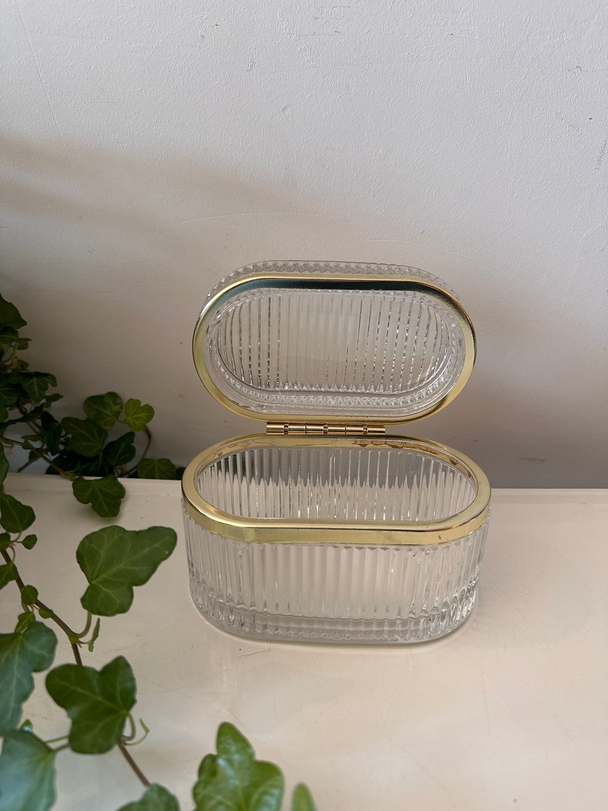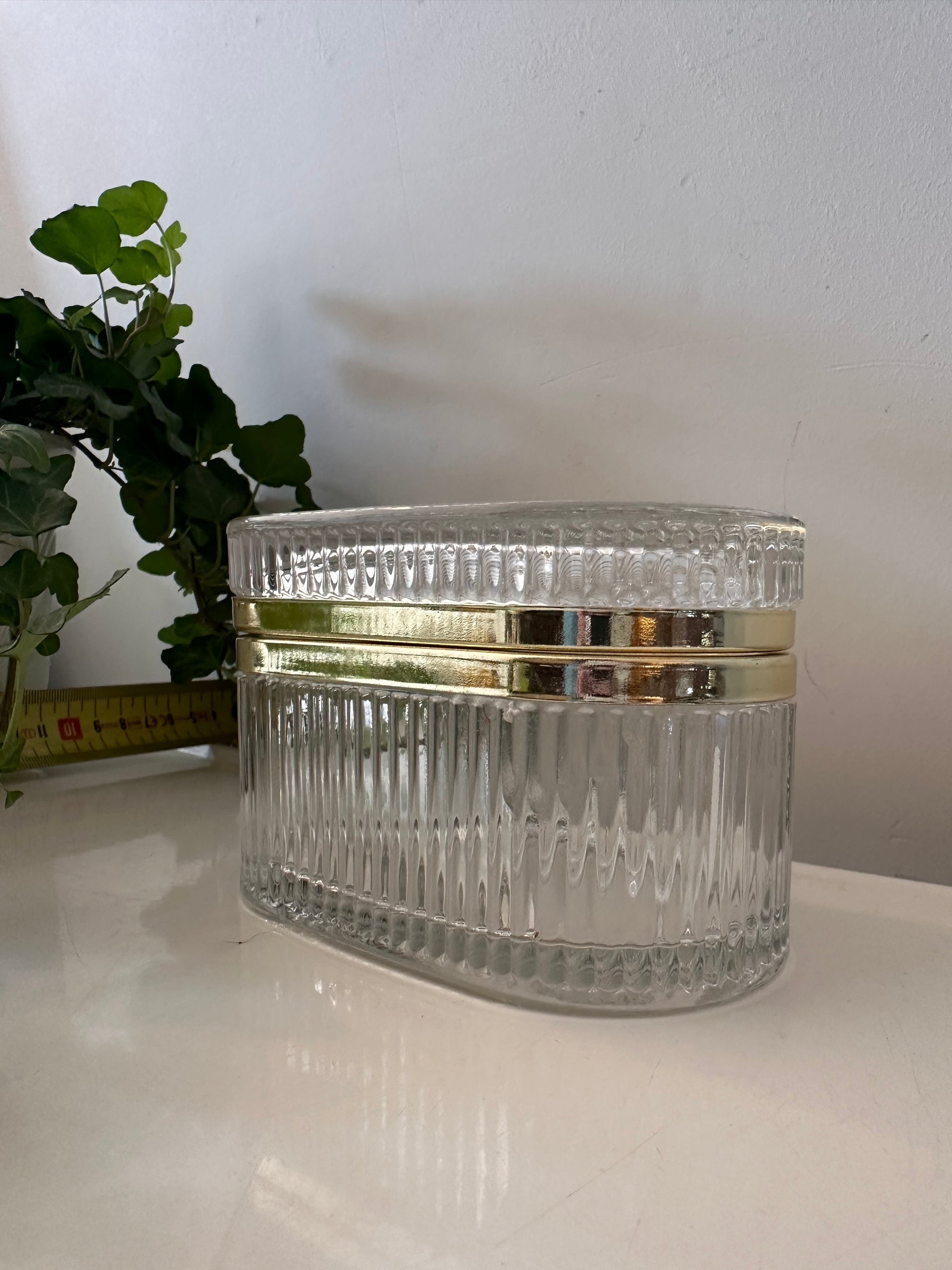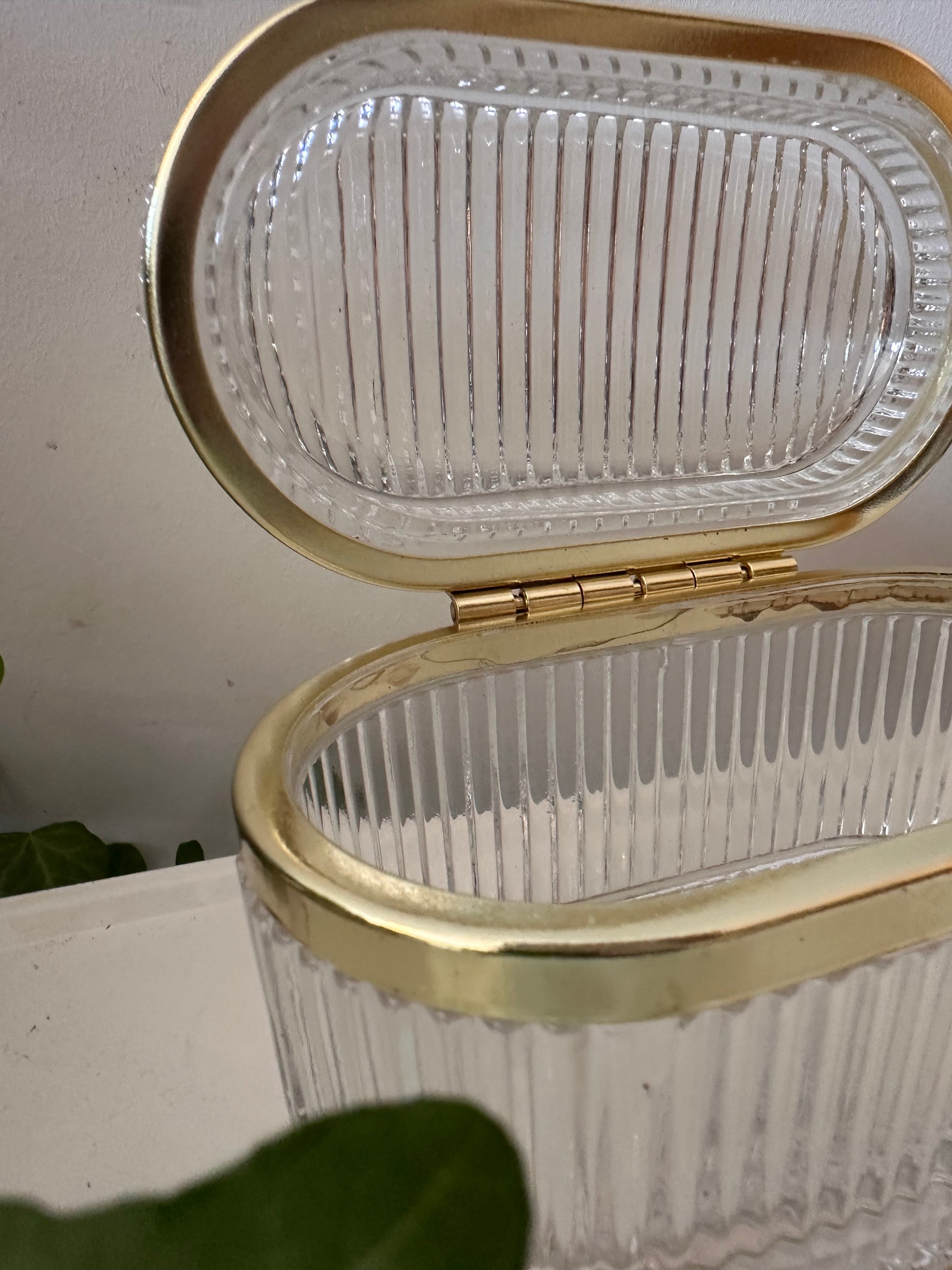 Prachtig vintage opbergdoosje van helder glas met strakke ribbelstructuur en een scharnierend deksel. Het doosje heeft een luxe messing rand die een chique touch geeft. Ideaal voor sieraden, kleine treasures of gewoon als blikvanger op je dressoir. Q521