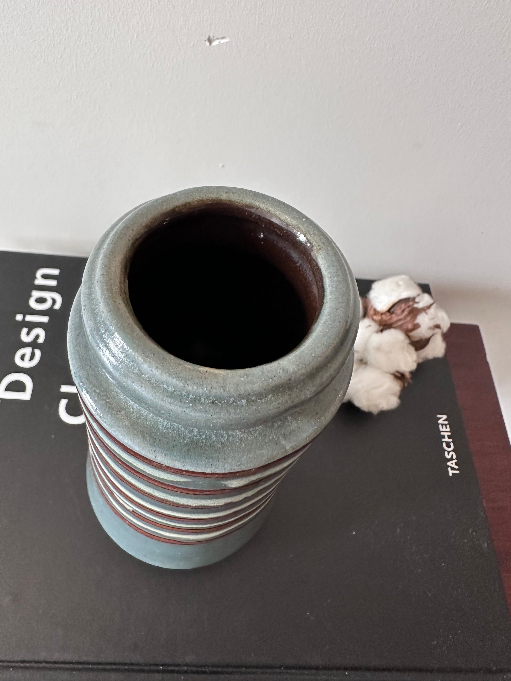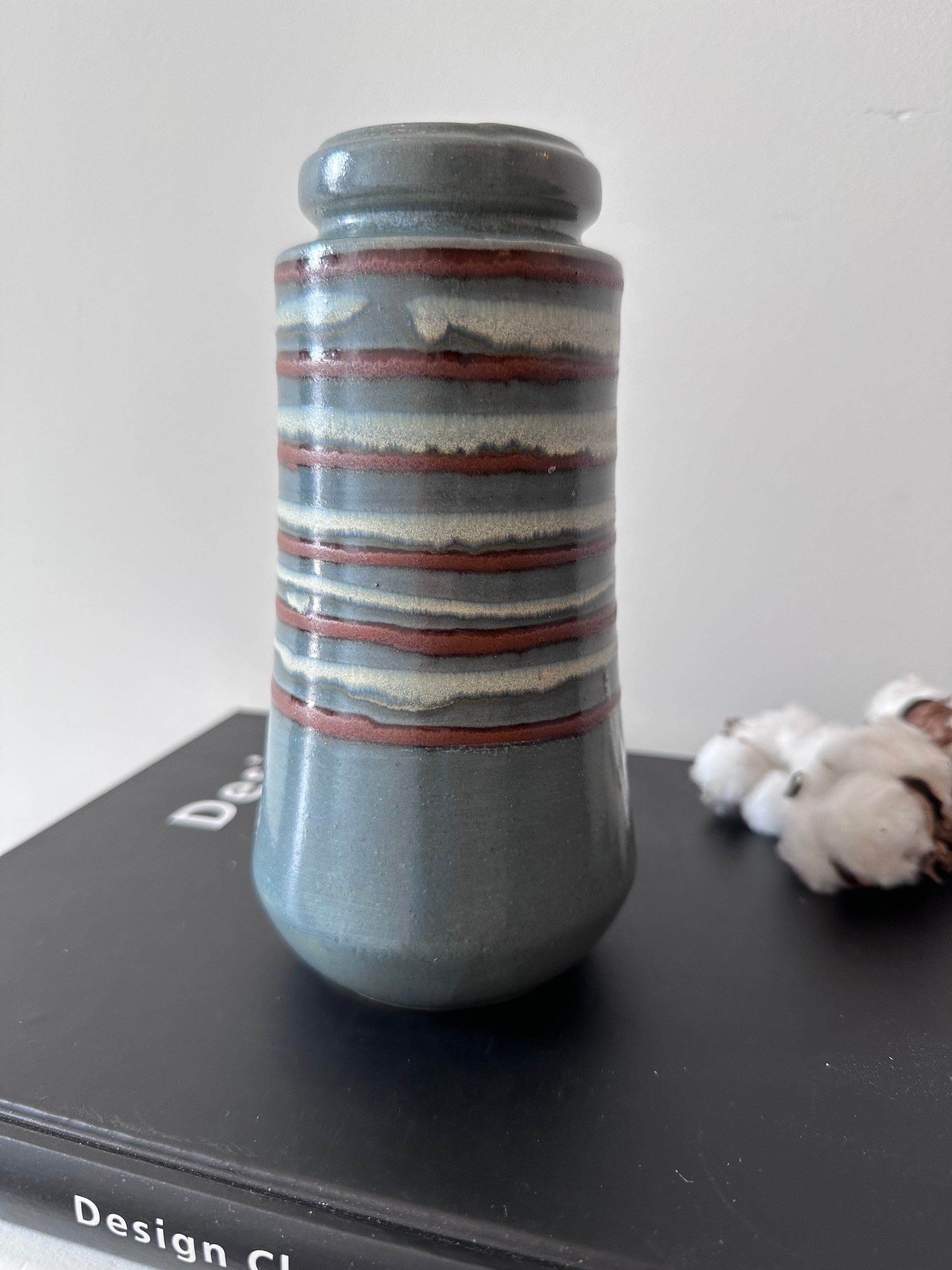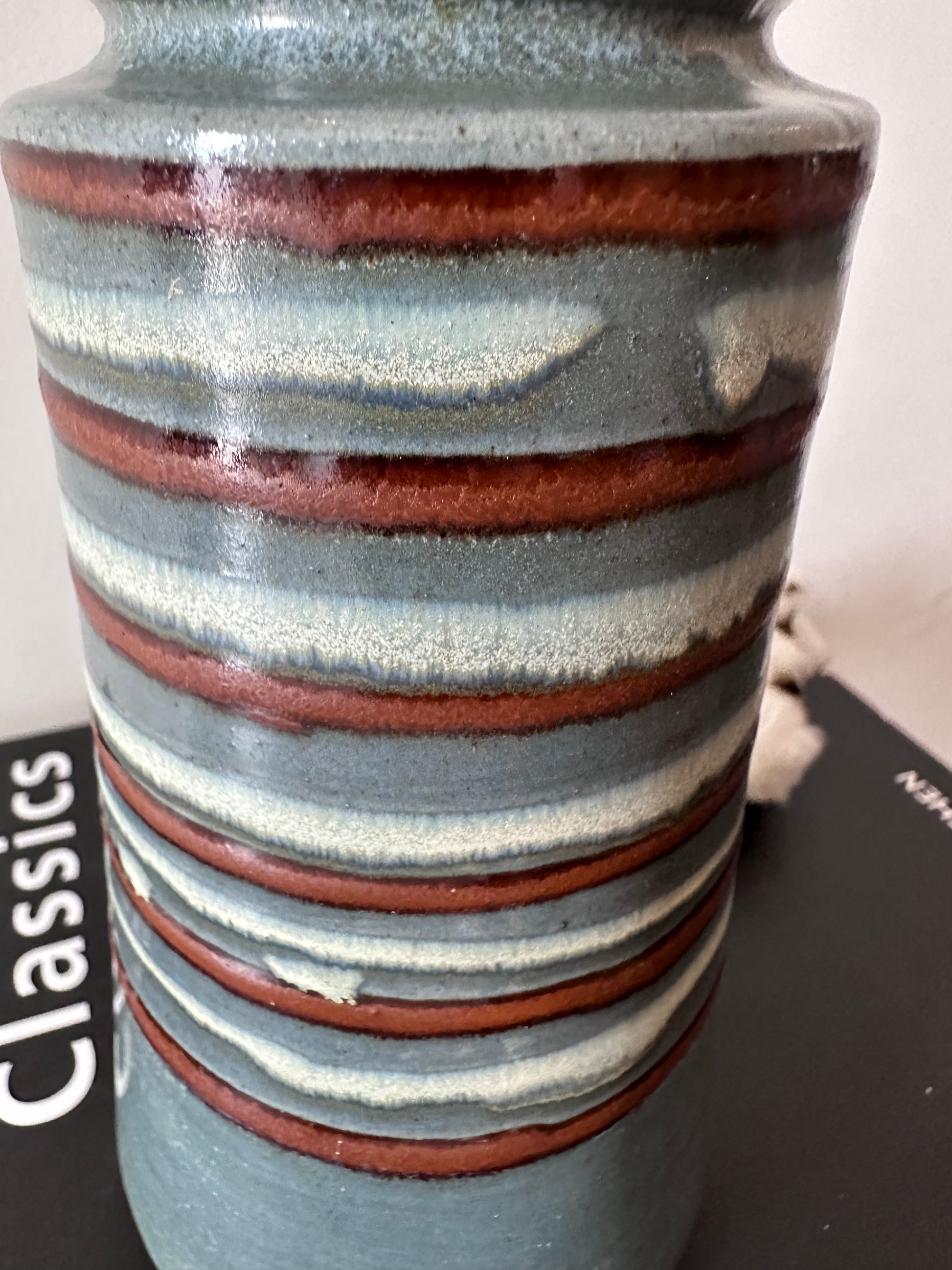 Een heel bijzondere vaas van West Germany keramiek . De vaas is grijs met een spiraal motief van bruin en wit. De vaas is gemerkt onder en komt uit de jaren ‘70.