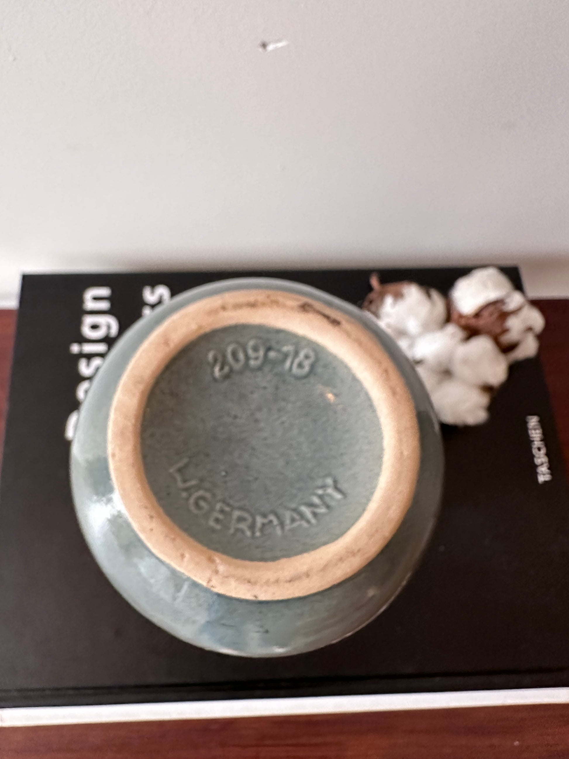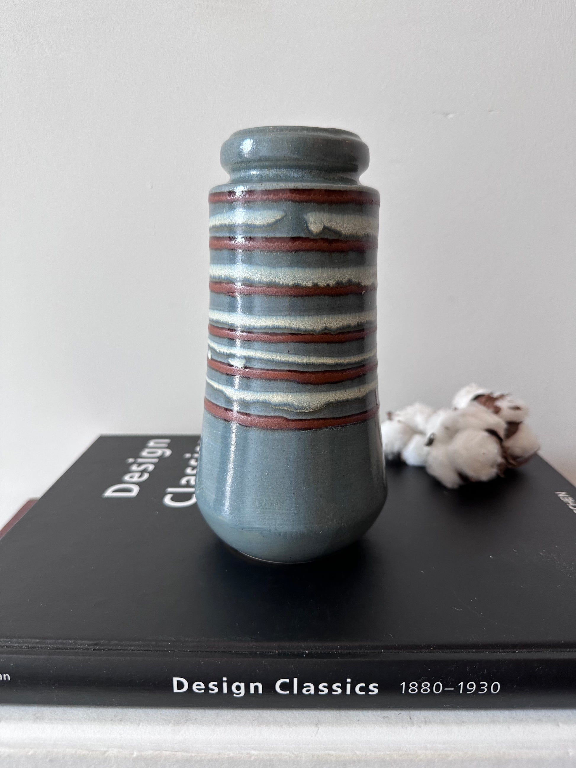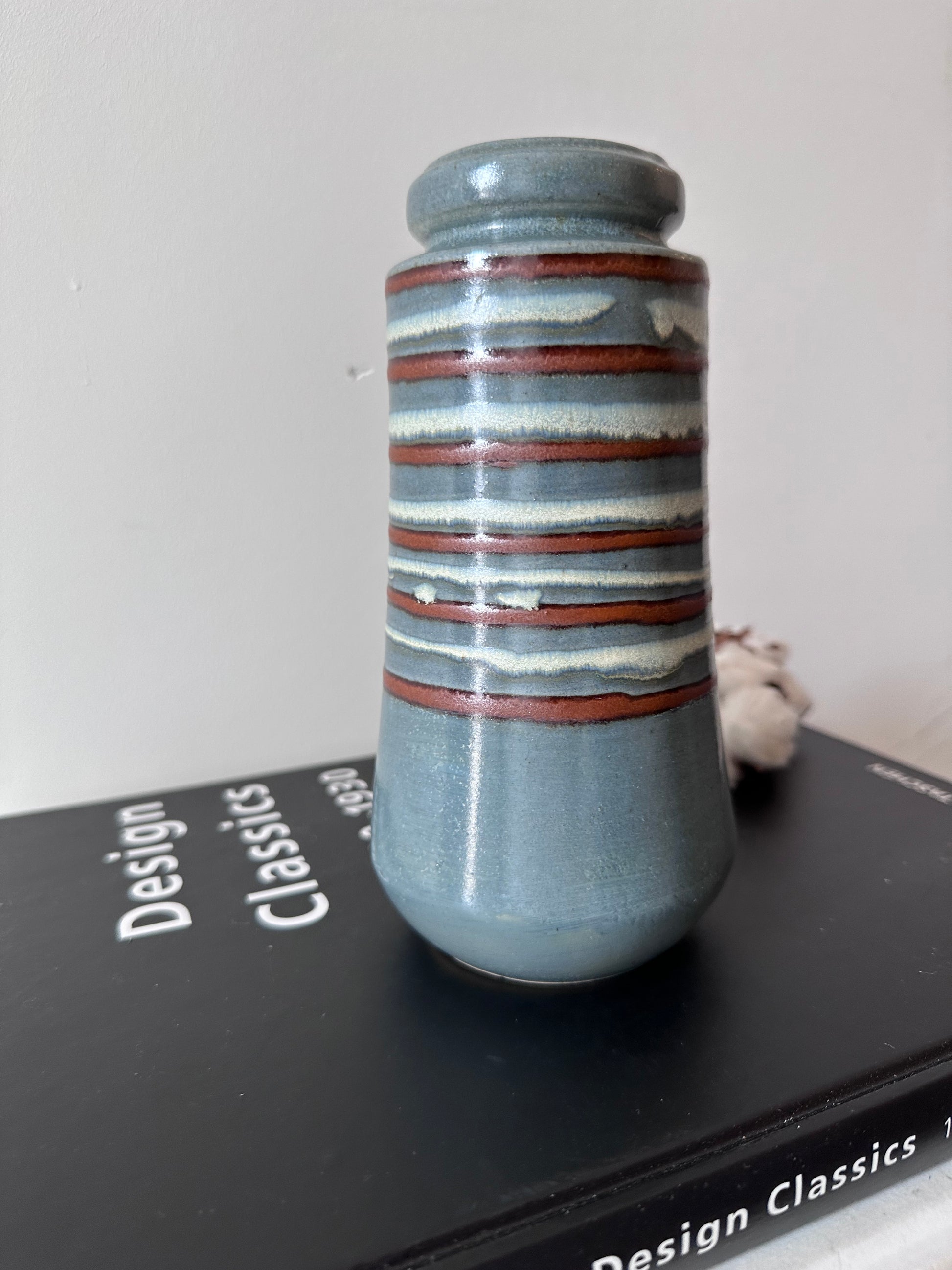 Een heel bijzondere vaas van West Germany keramiek . De vaas is grijs met een spiraal motief van bruin en wit. De vaas is gemerkt onder en komt uit de jaren ‘70.