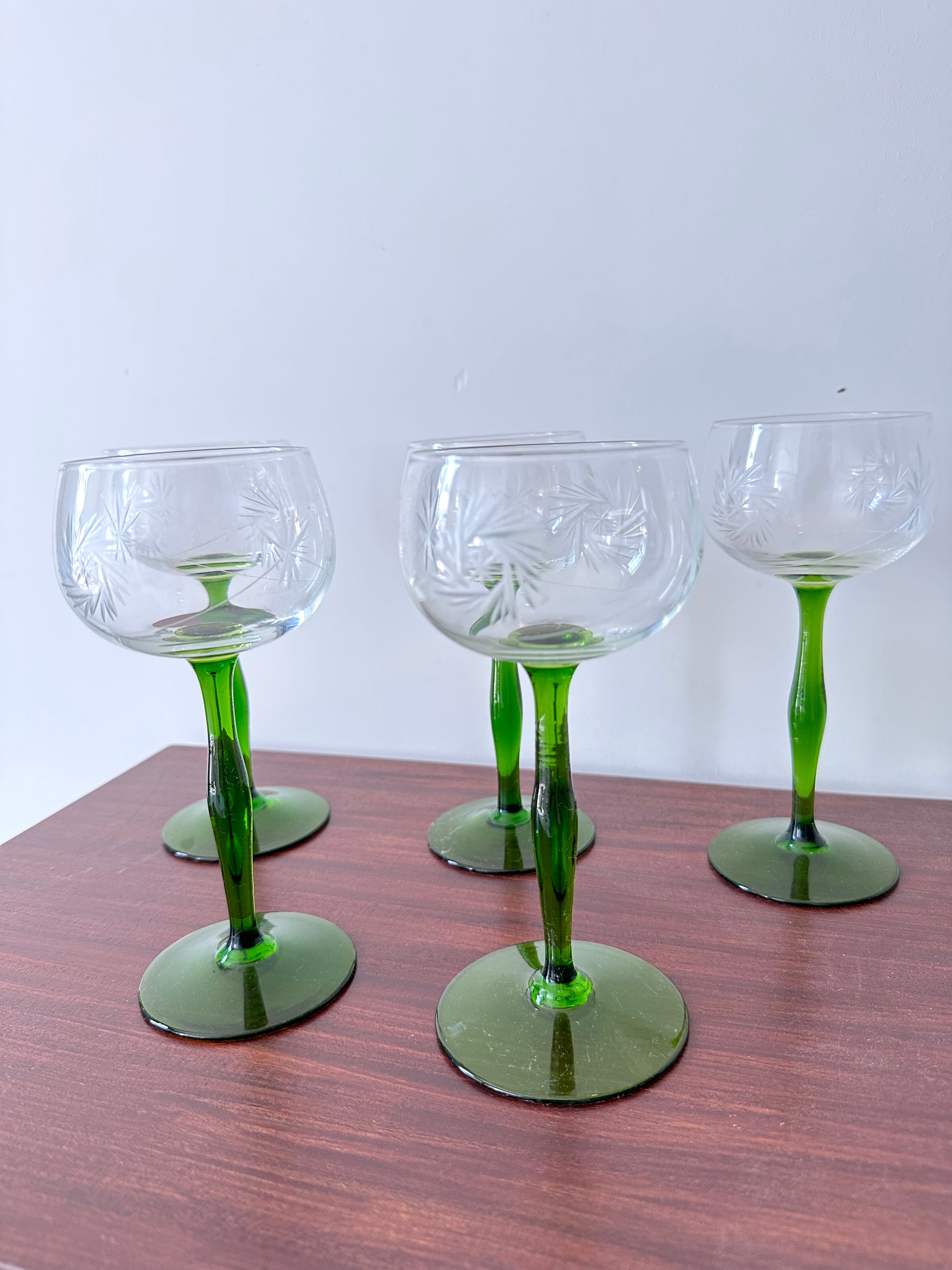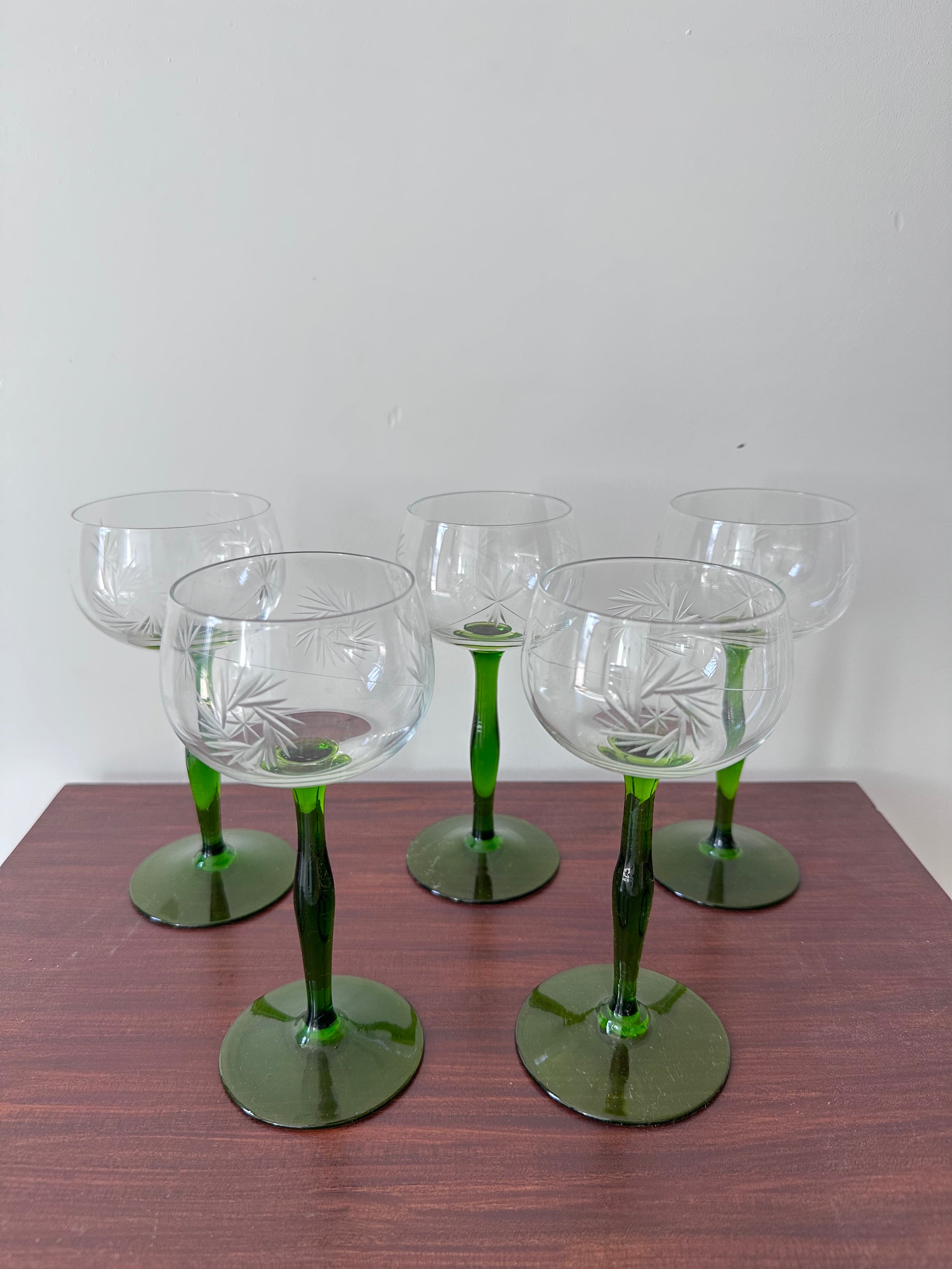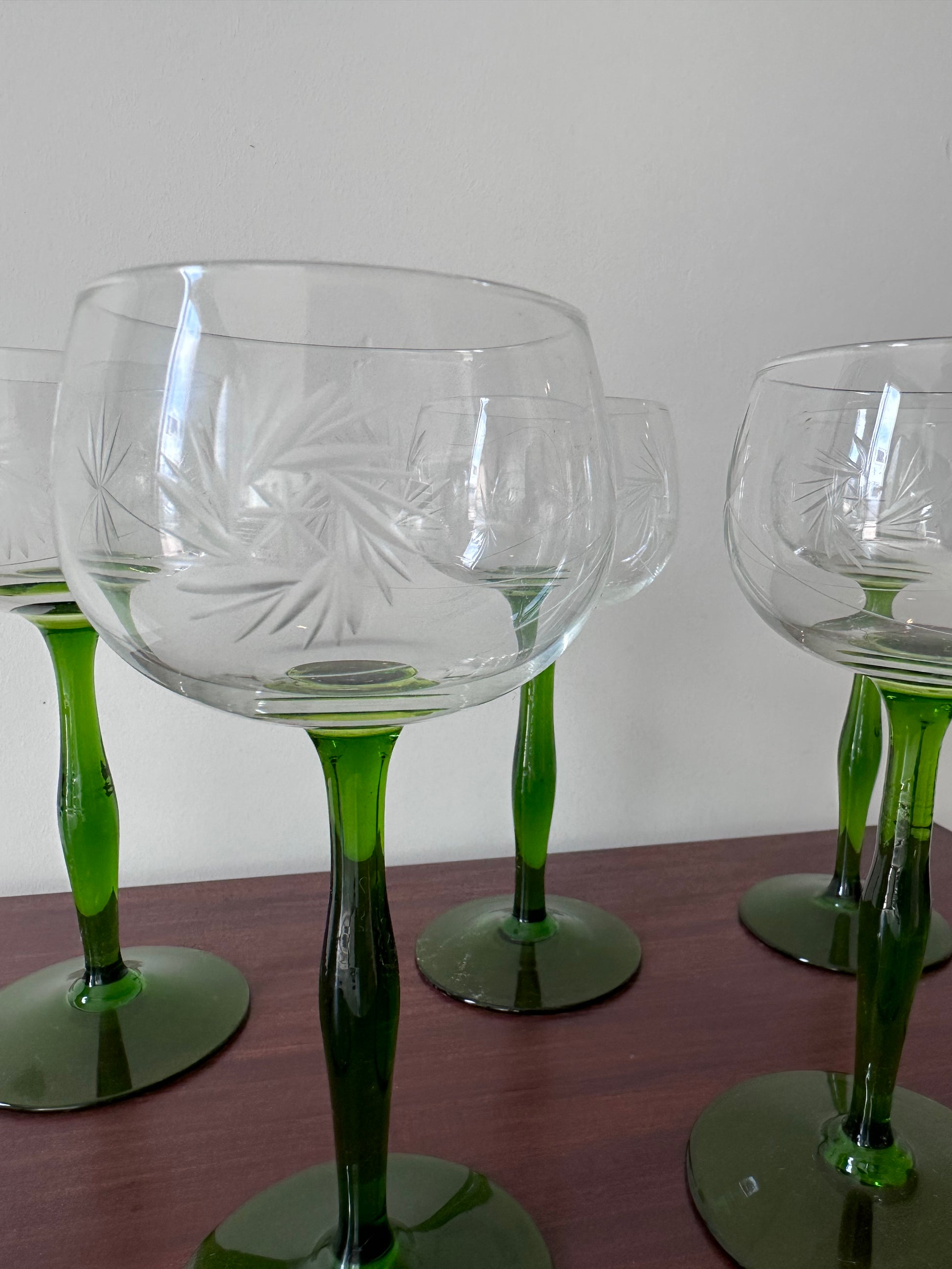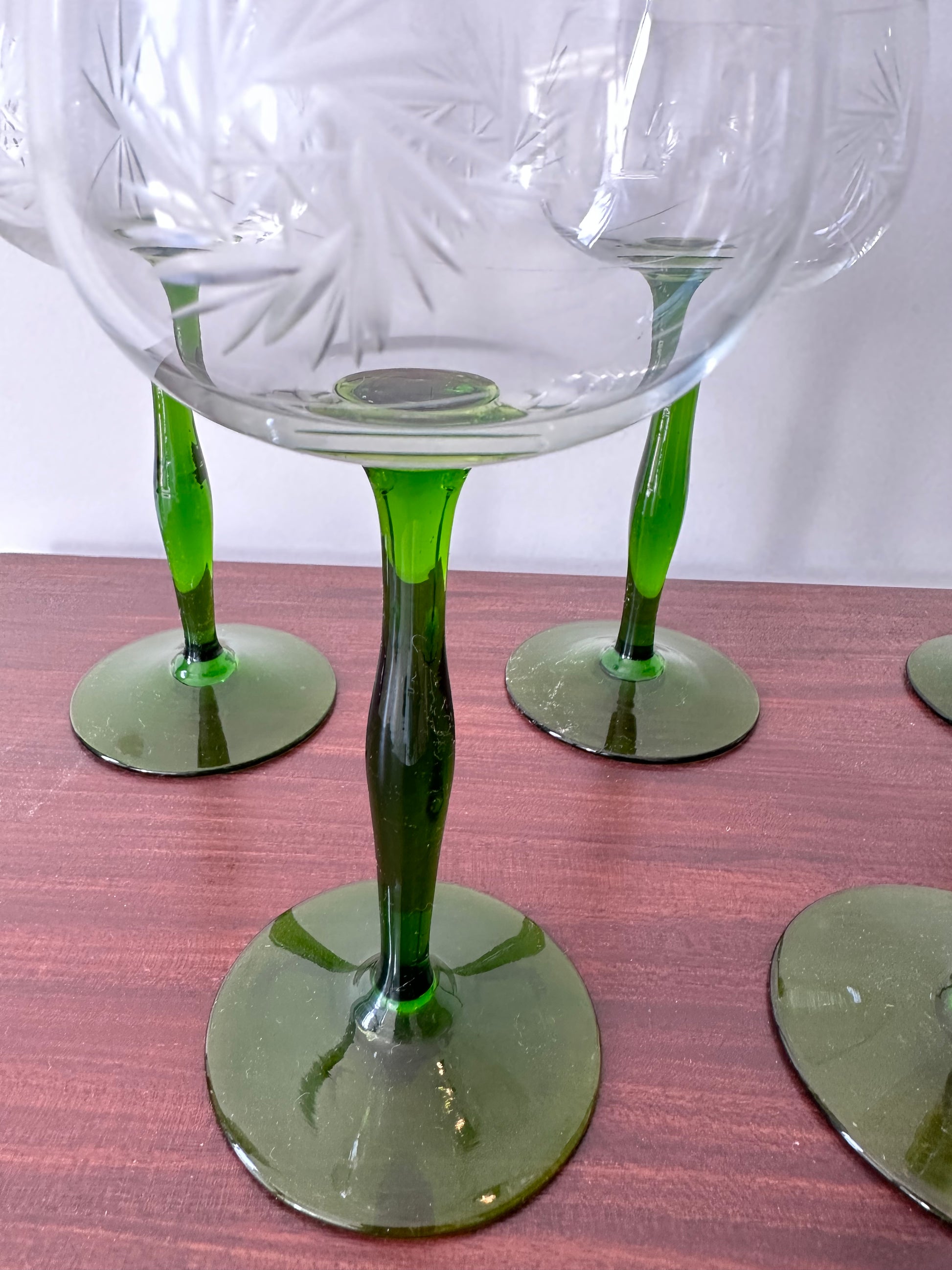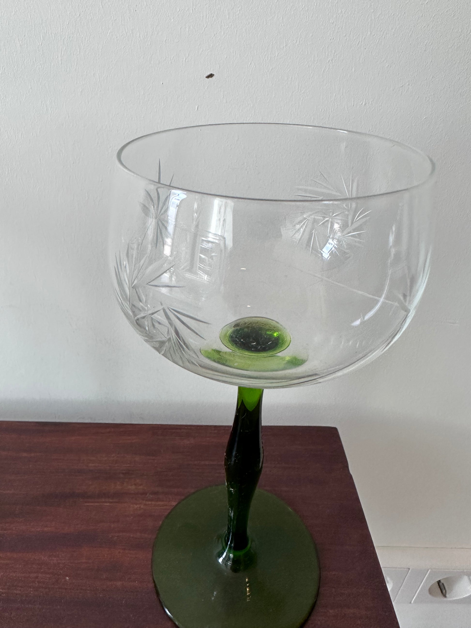 Supermooie kristallen wijnglazen op een prachtige groen voetbdienmooi gewelfd is. De glazen zijn mooi gegraveerd met wijnbladen.