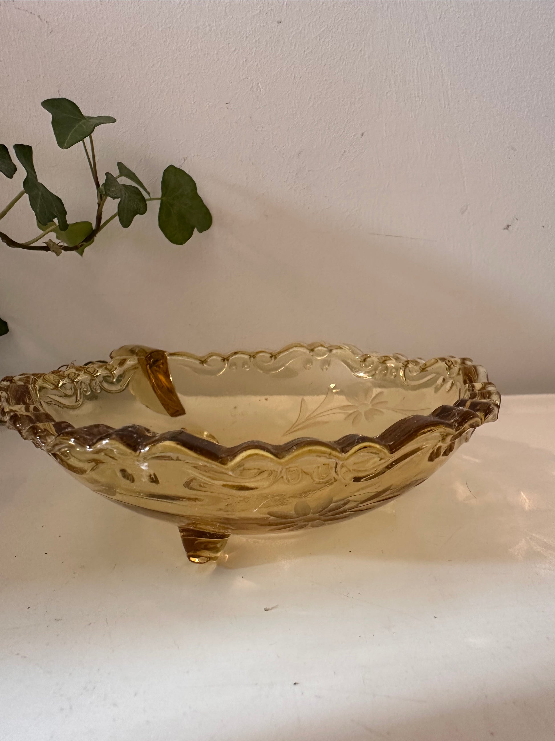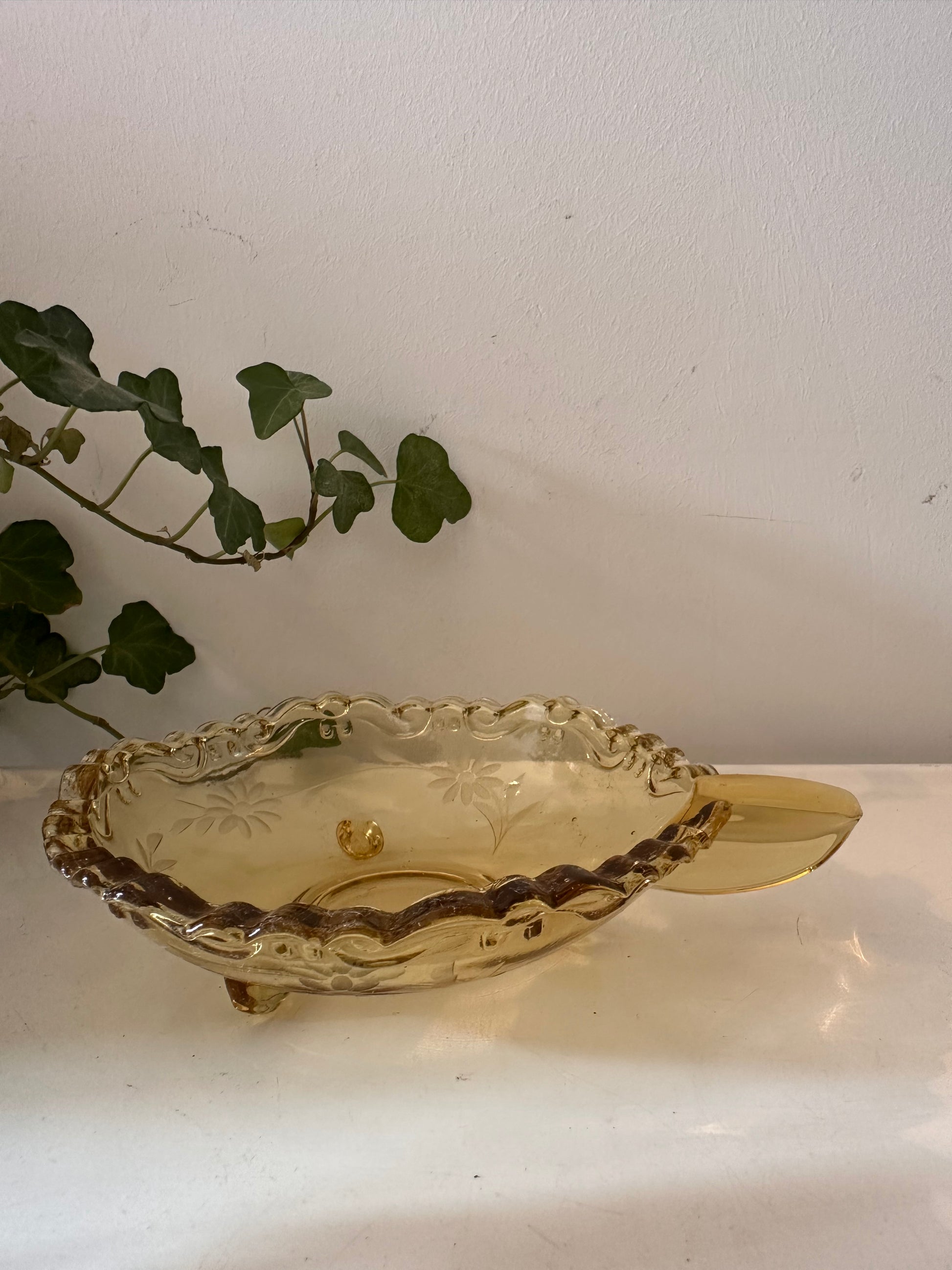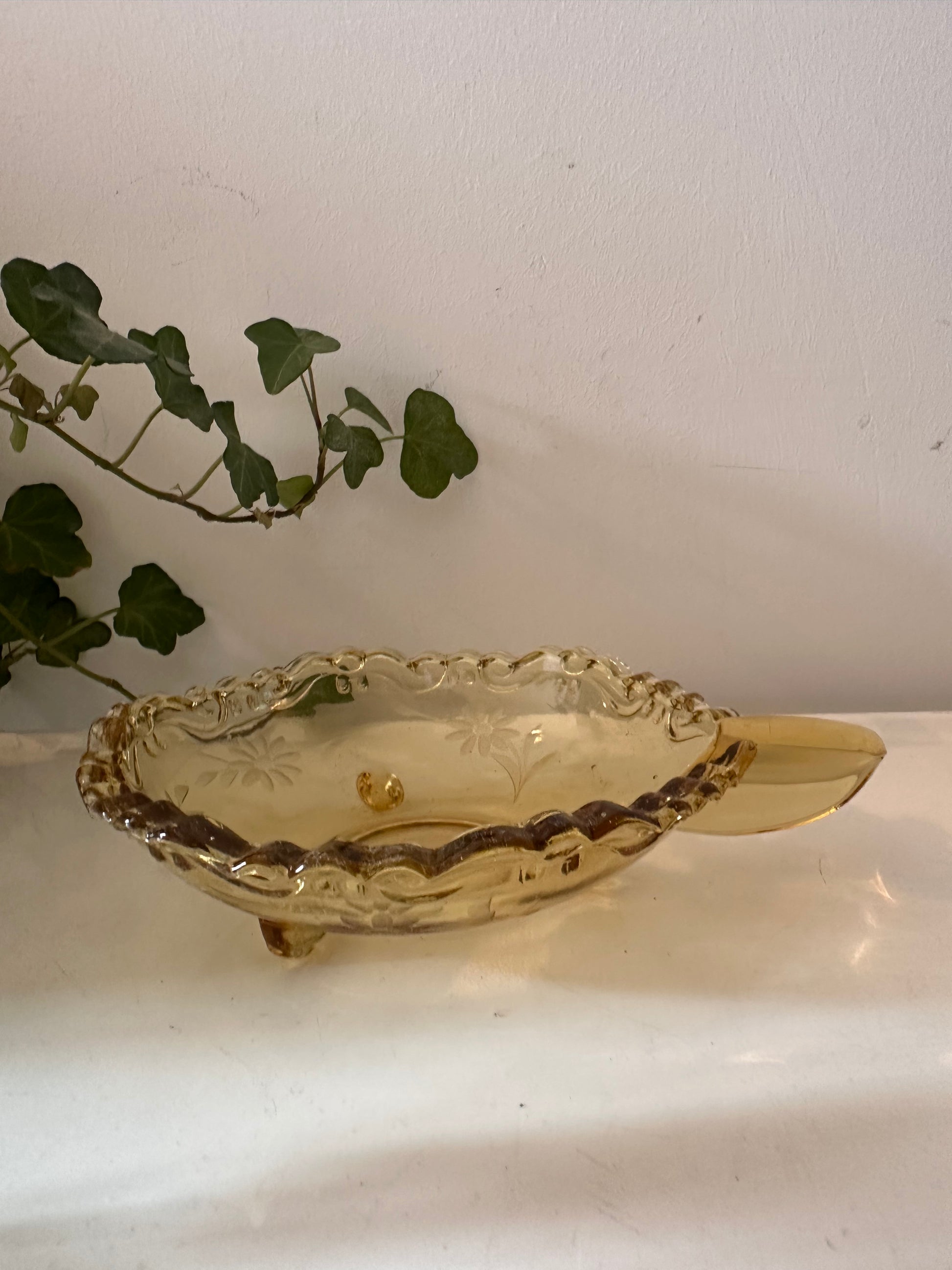 Hoe leuk is dit gele schaaltje met golfrand, ingeslepen bloemetjes en tuitvormig handvat? Gemaakt van dik persglas, staat op drie kleine pootjes. Een charmant detail op je tafel of in een vitrinekast, en helemaal in retrostijl. Q170