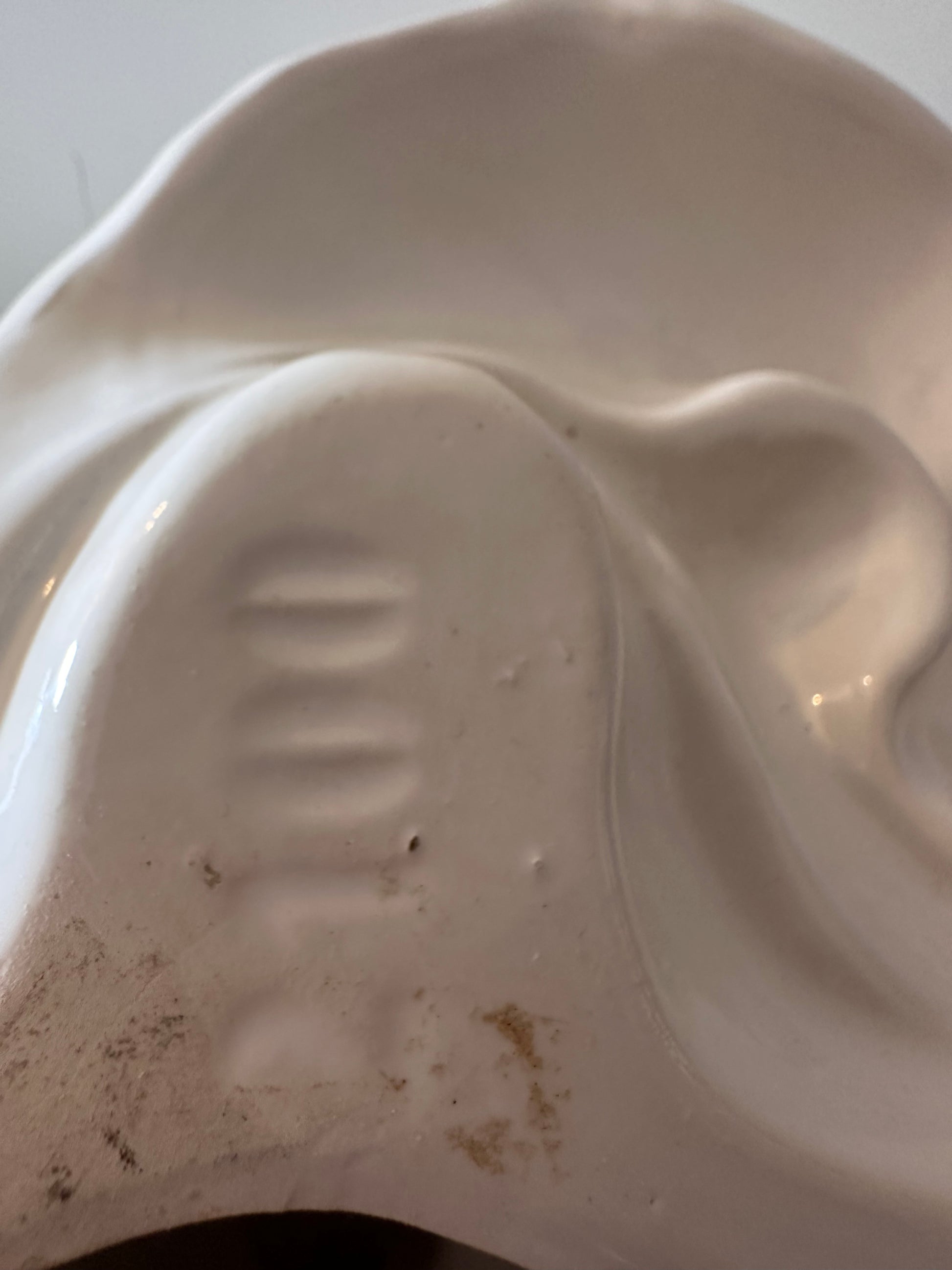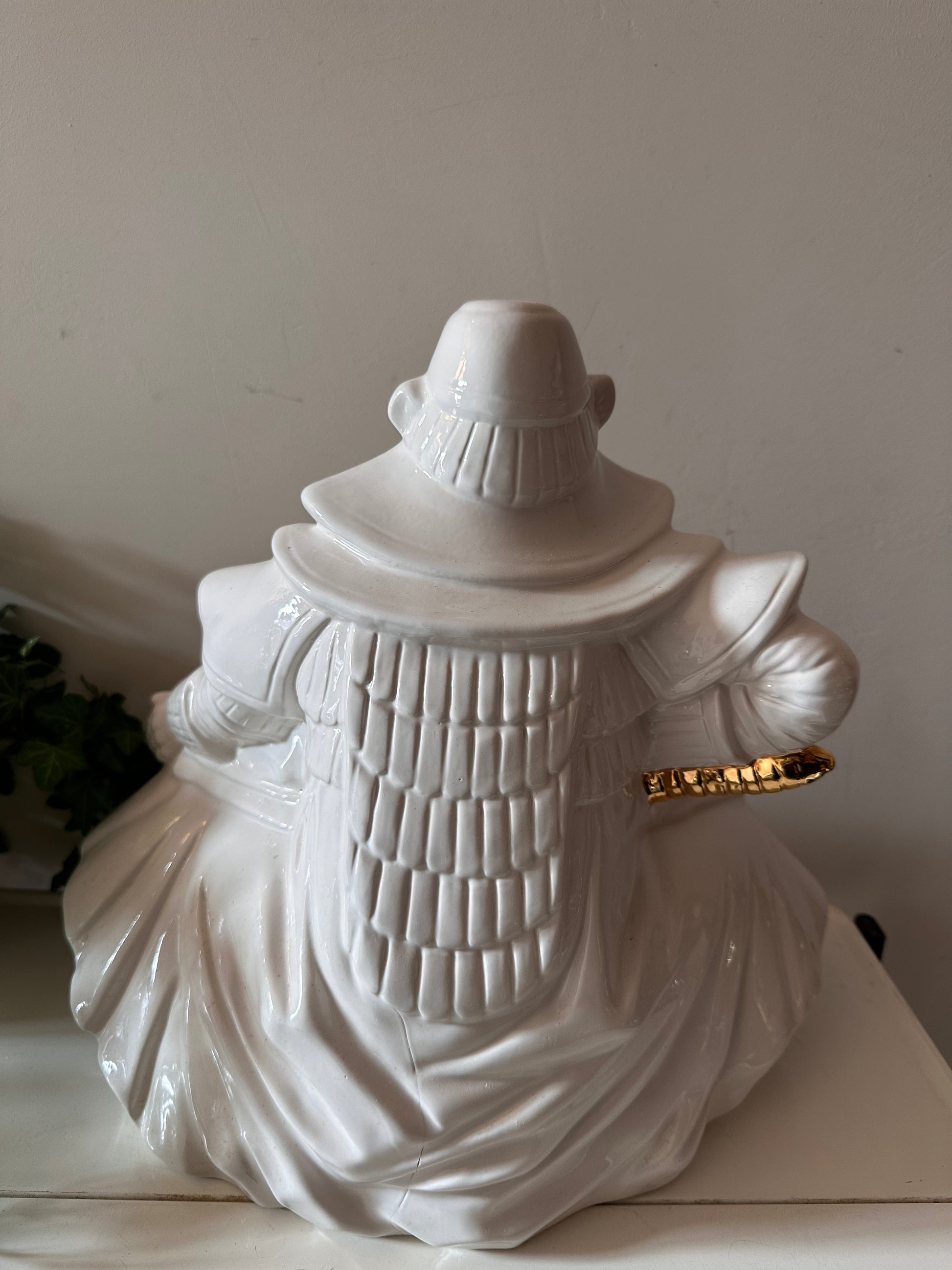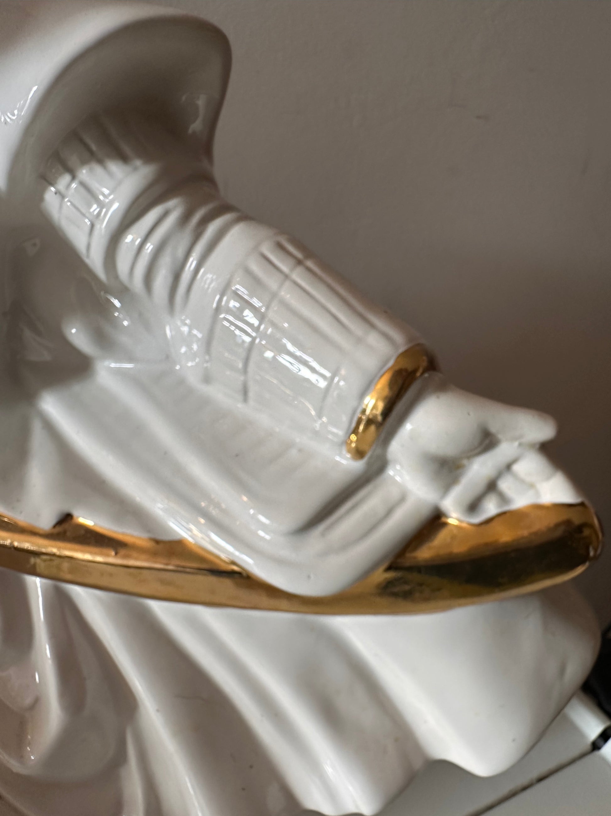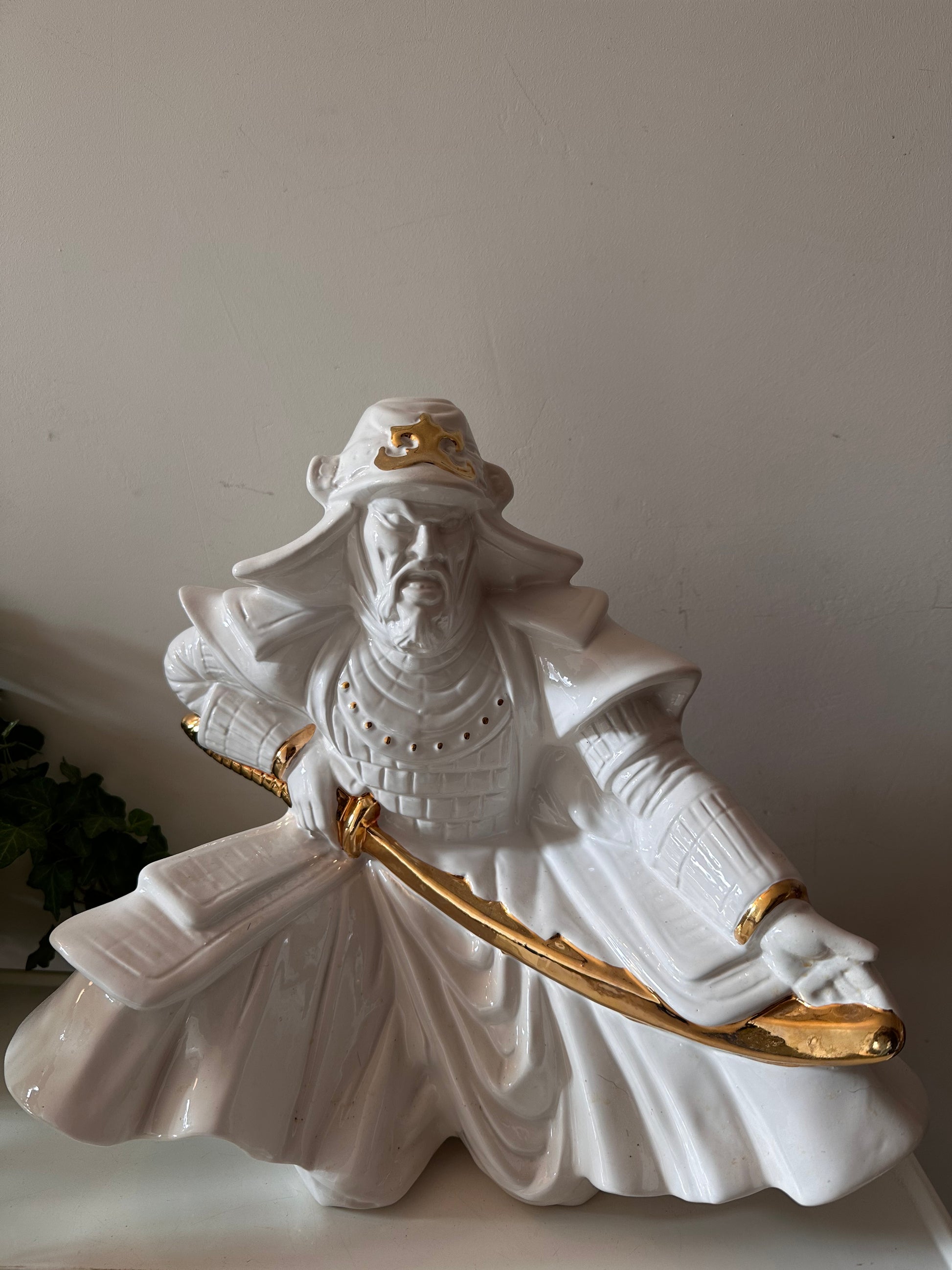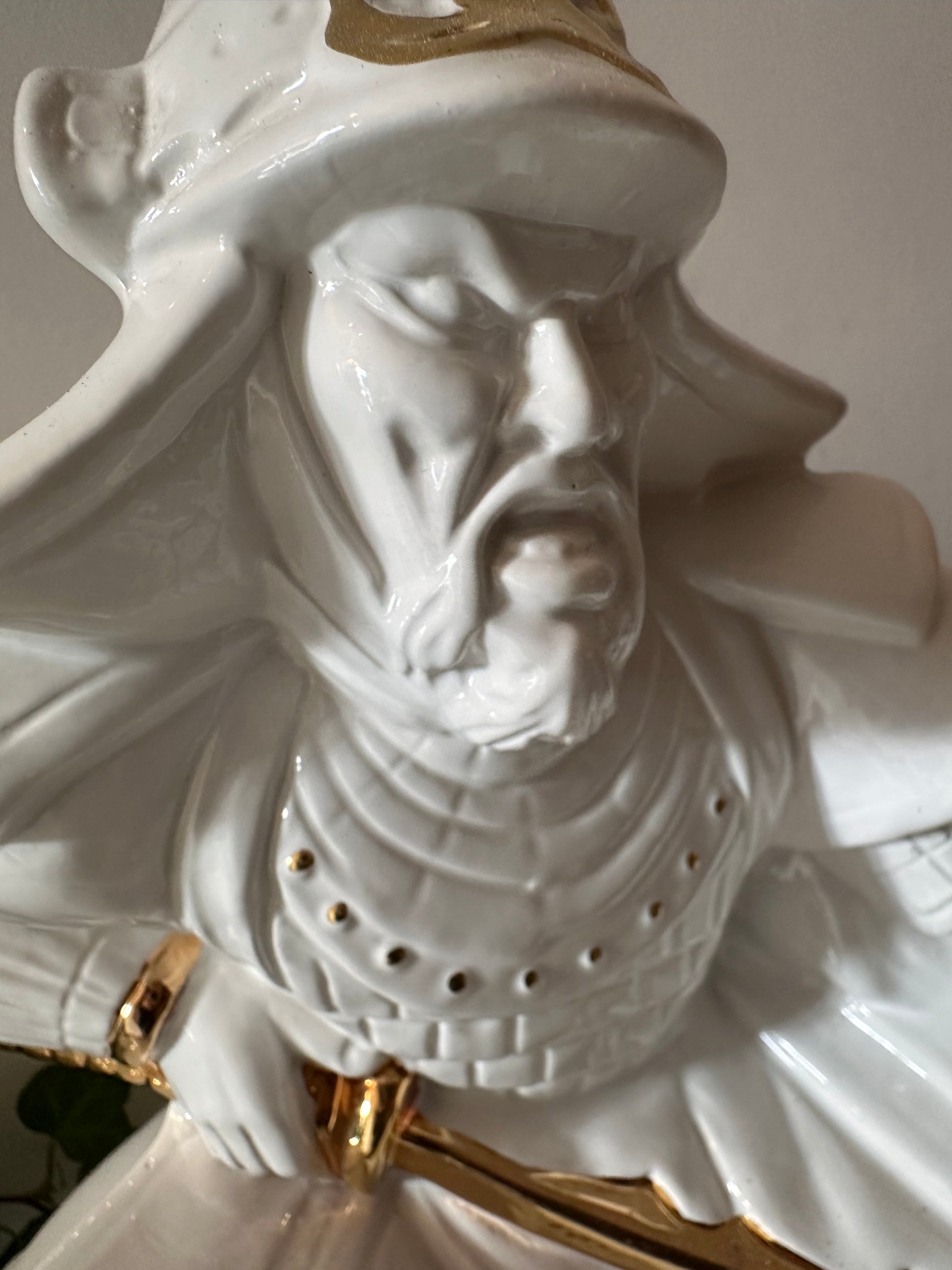 Waanzinnig mooi vintage beeld van een samoerai โ wit geglazuurd porselein met glanzende gouddetails op het zwaard en de helm. Een indrukwekkend stuk, met krachtige houding en vloeiende plooien in het gewaad. Gemerkt aan de onderzijde en gemaakt in de jaren 60/70, Italiaans atelierwerk. Een echt statement item!