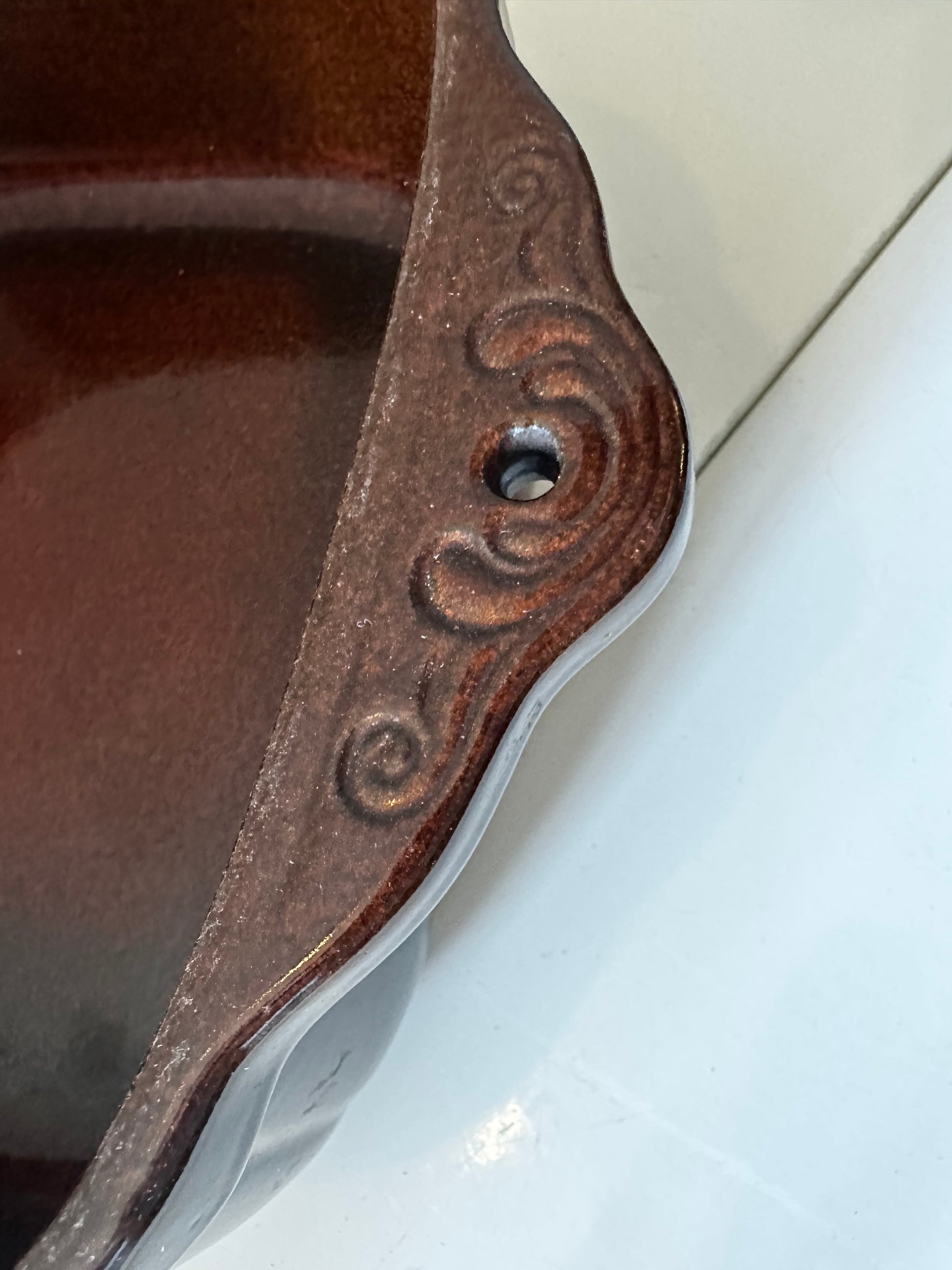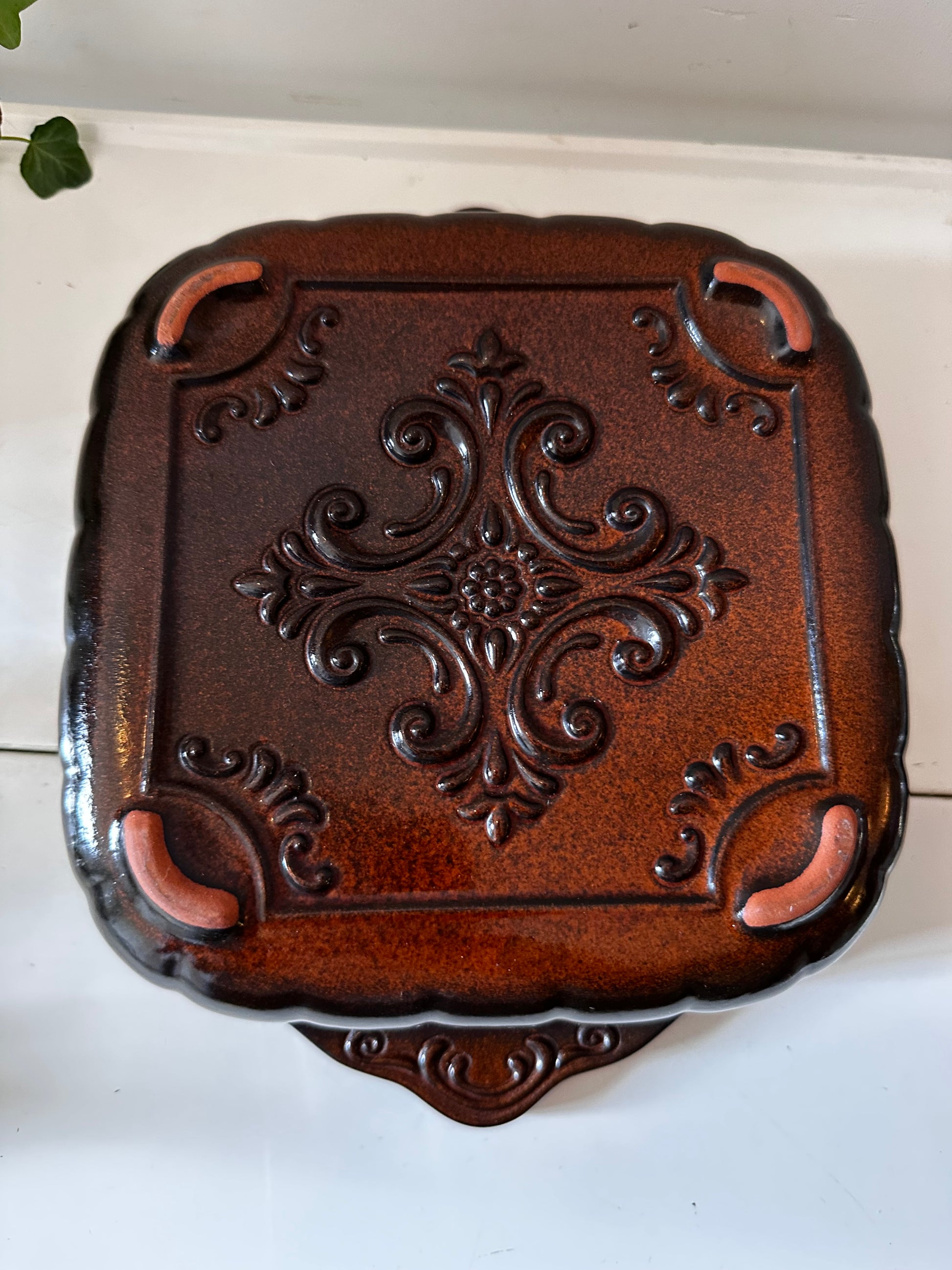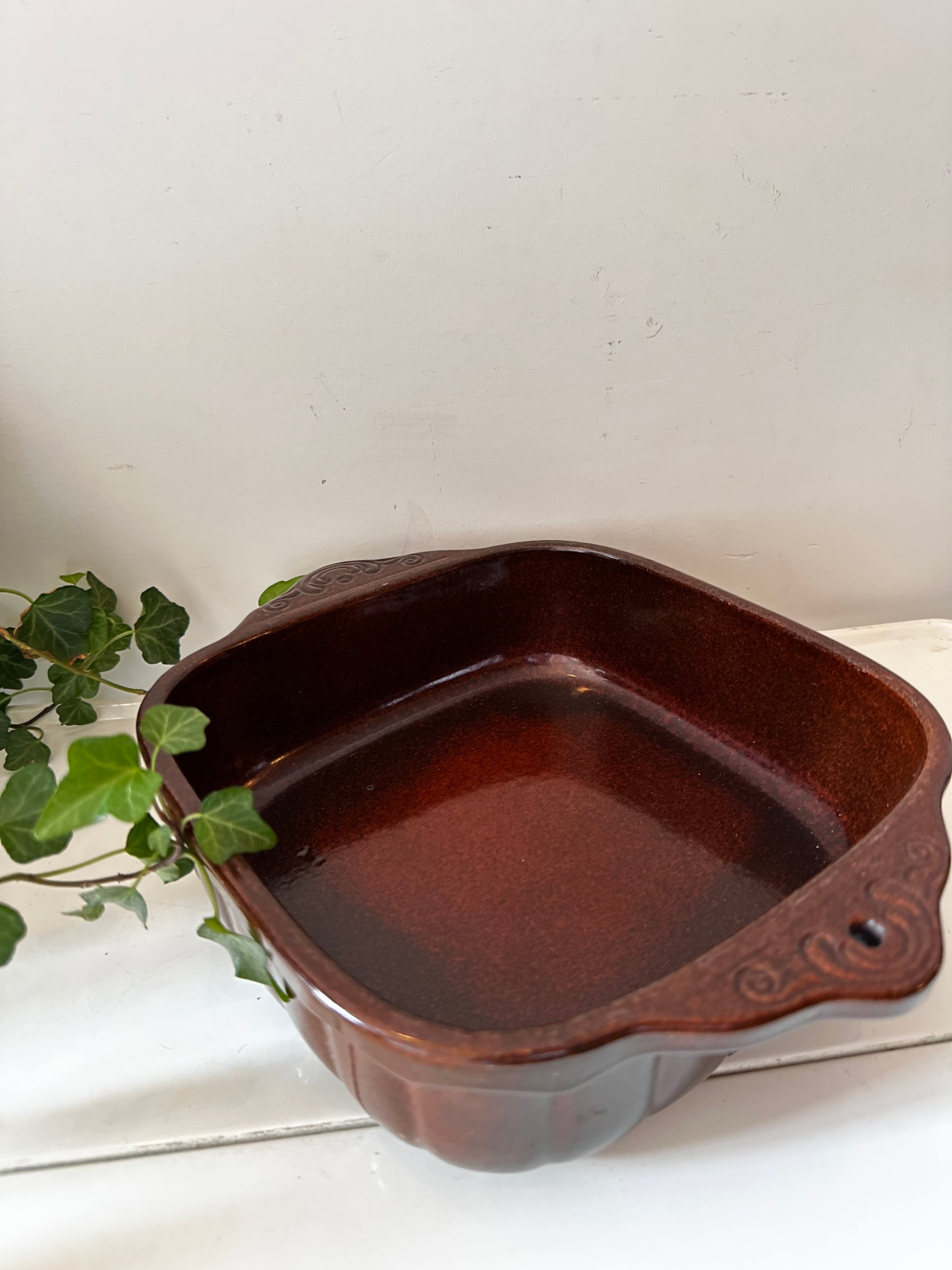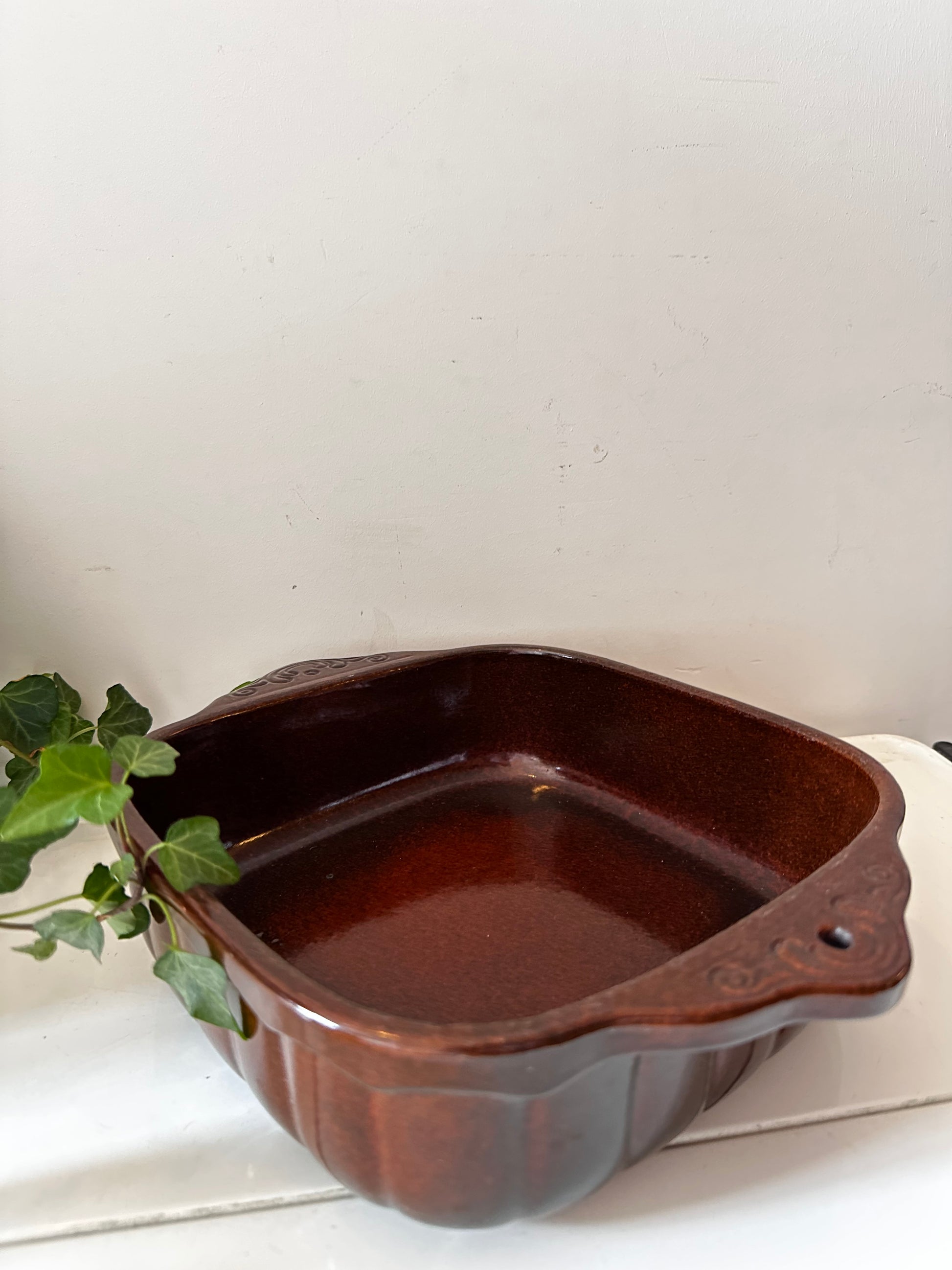Supermooie vintage ovenschaal van bruin geglazuurd keramiek met barokreliëf op de buitenzijde en bovenrand. Het model is vierkant met afgeronde hoeken, een golvende rand en een handig ophangoogje in het oor. Q56