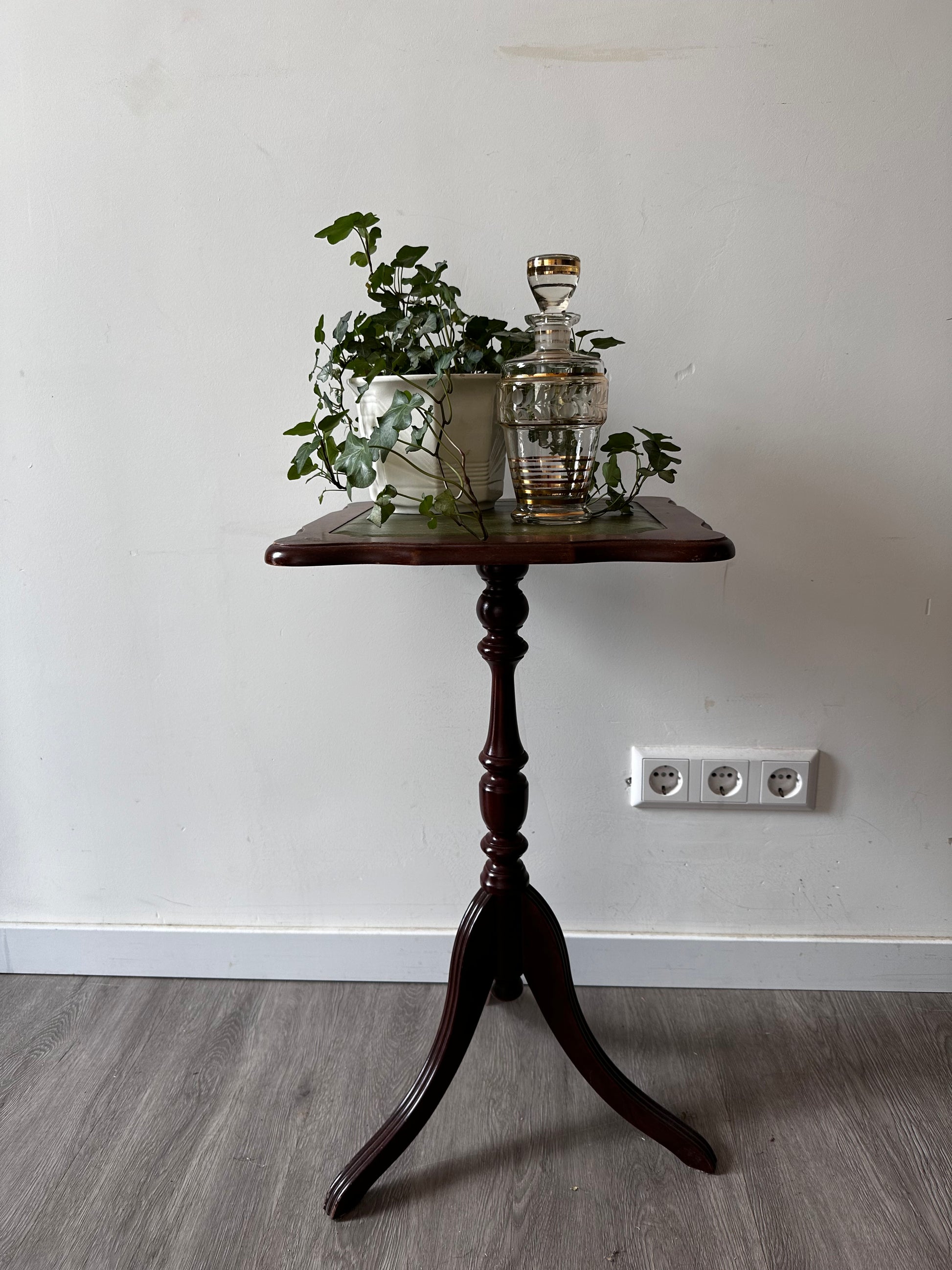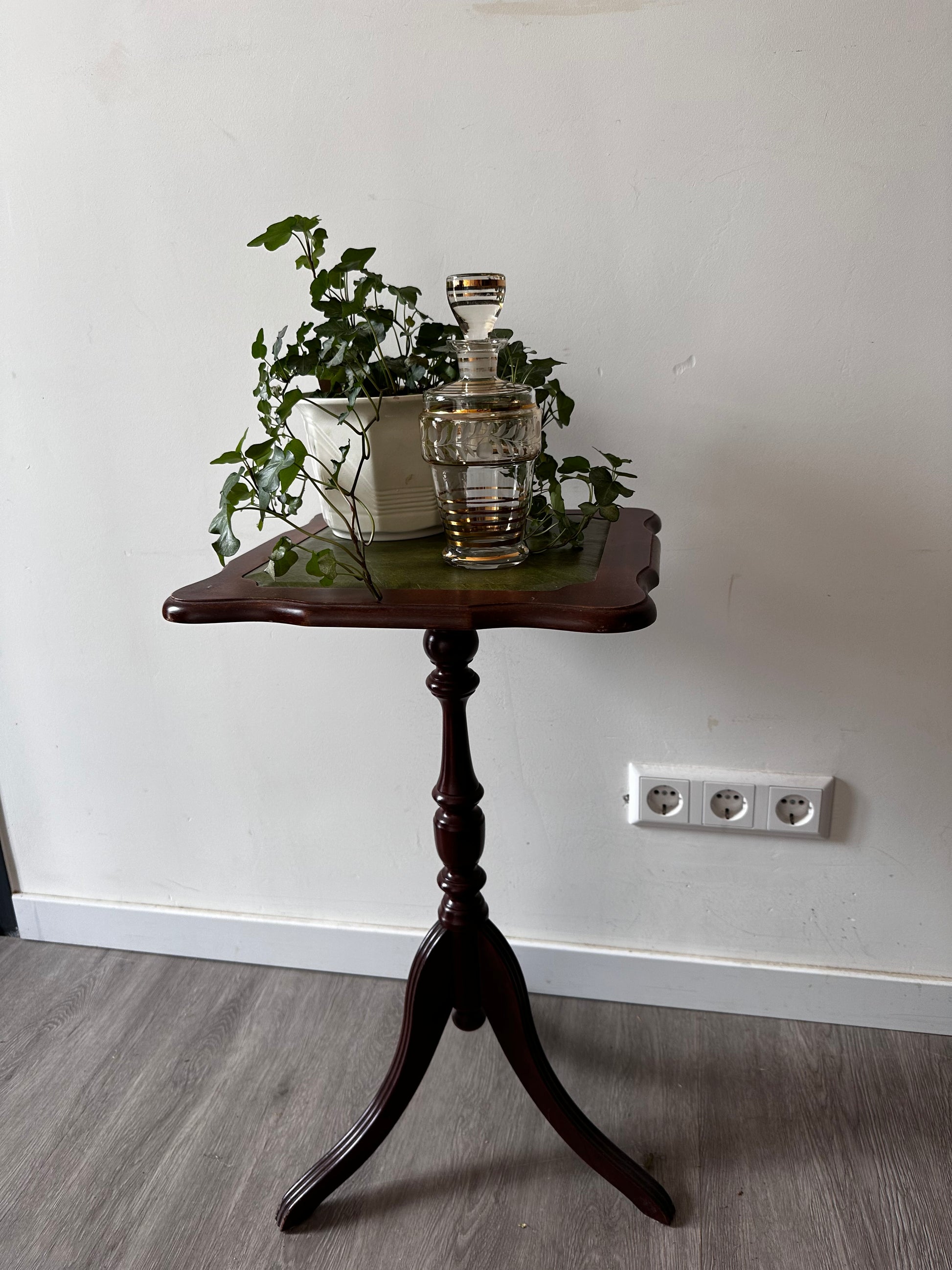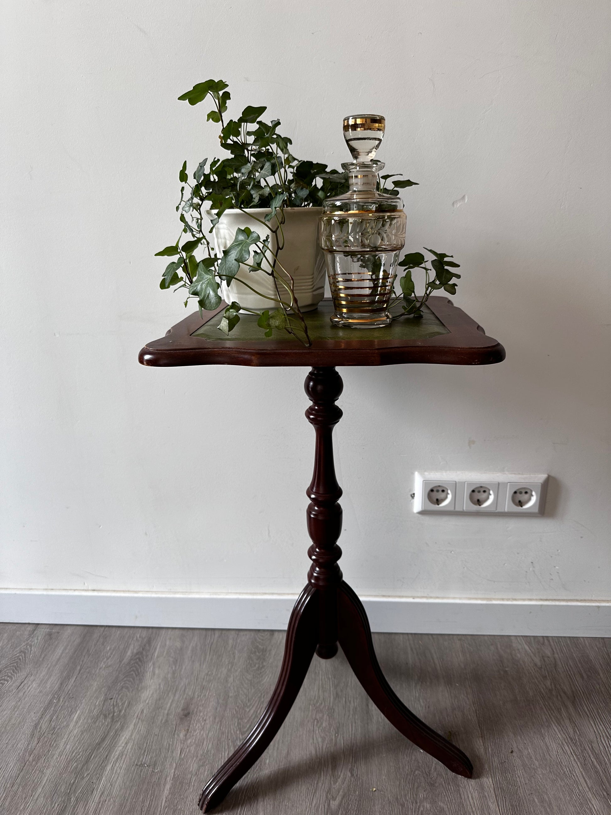 Super leuk vintage wijntafeltje met een groen leren inzetstuk. Het blad is vierkant met licht afgeronde vormen. Tafeltje heeft een centraal gedraaide poot met 3 sierlijk uitlopende poten. Het tafeltje is in een mooie vintage staat met lichte sporen van gebruik.