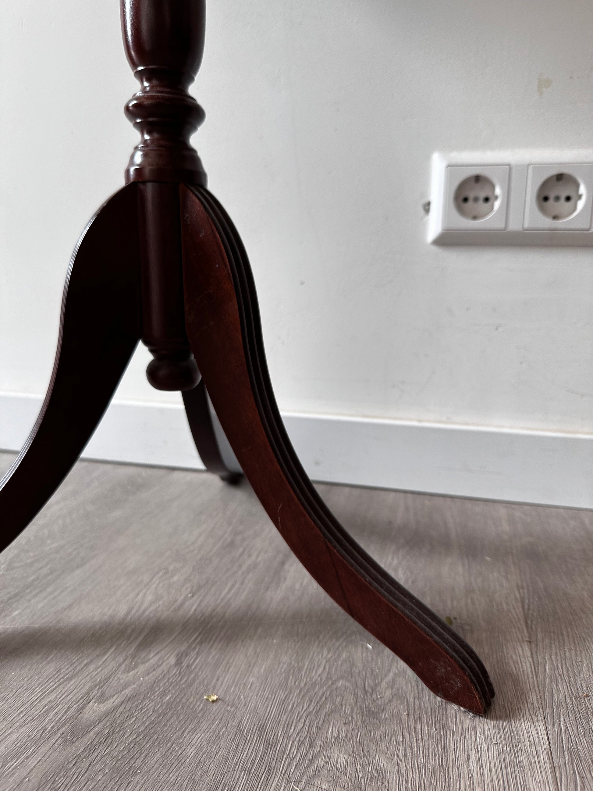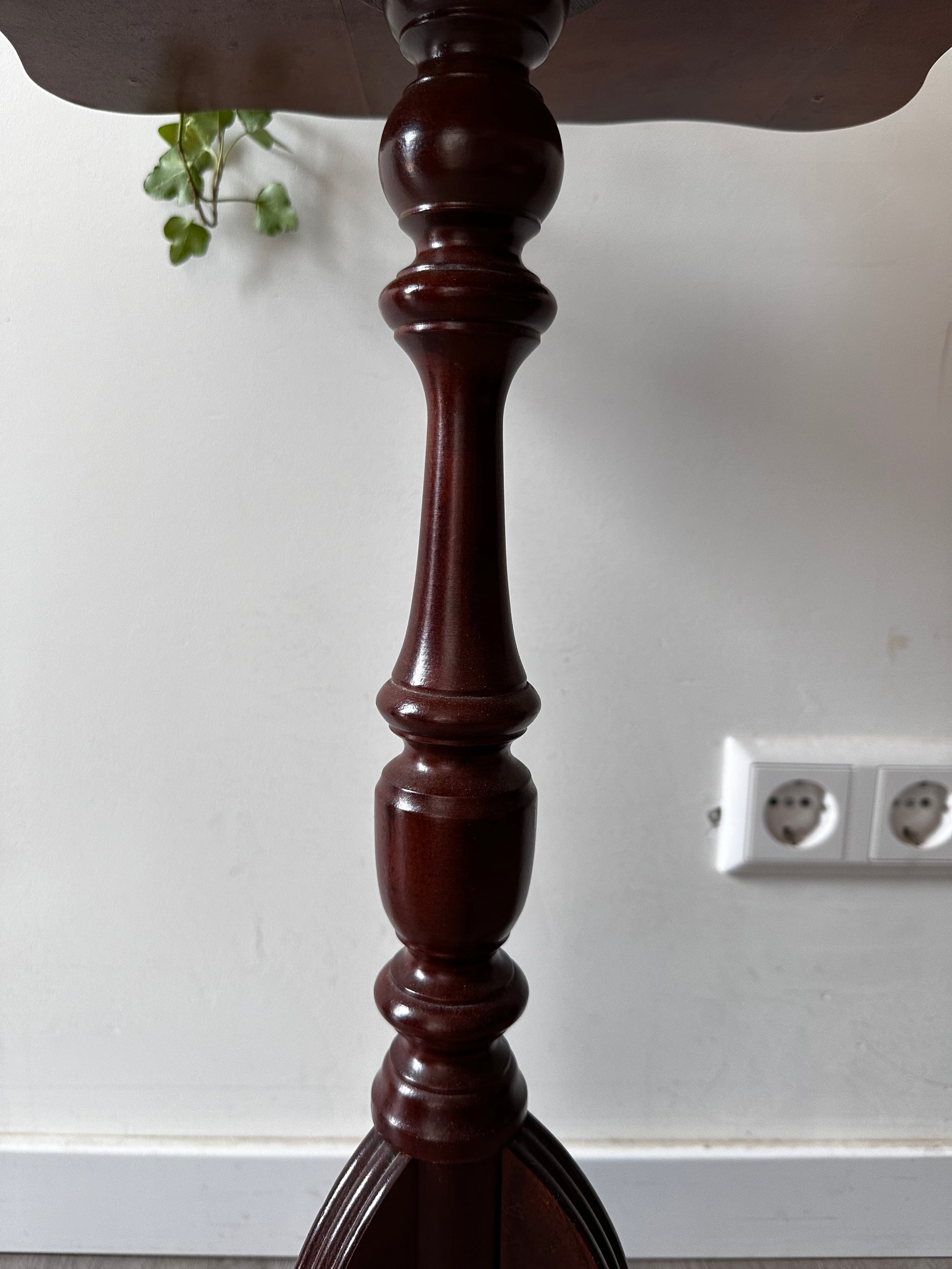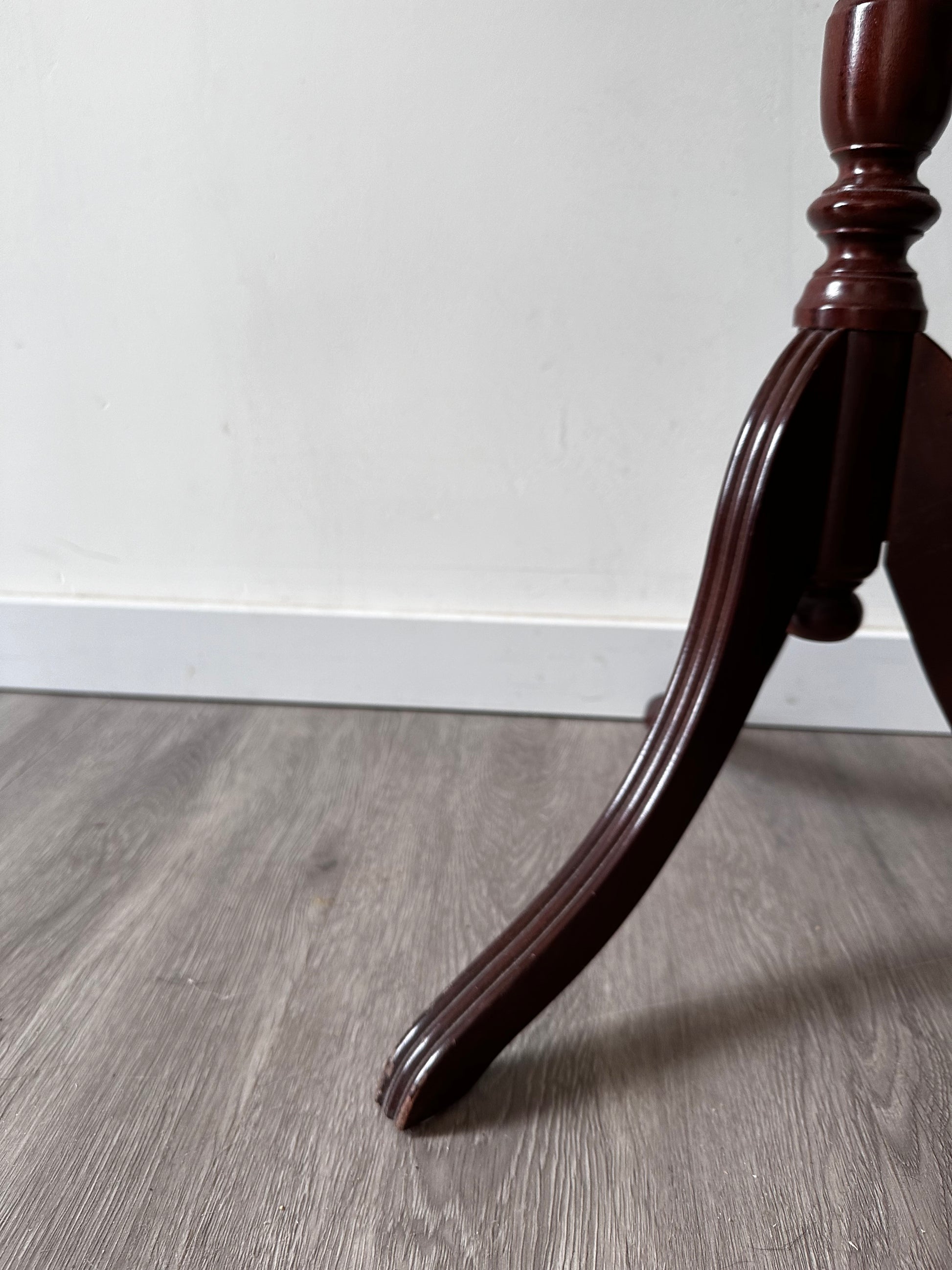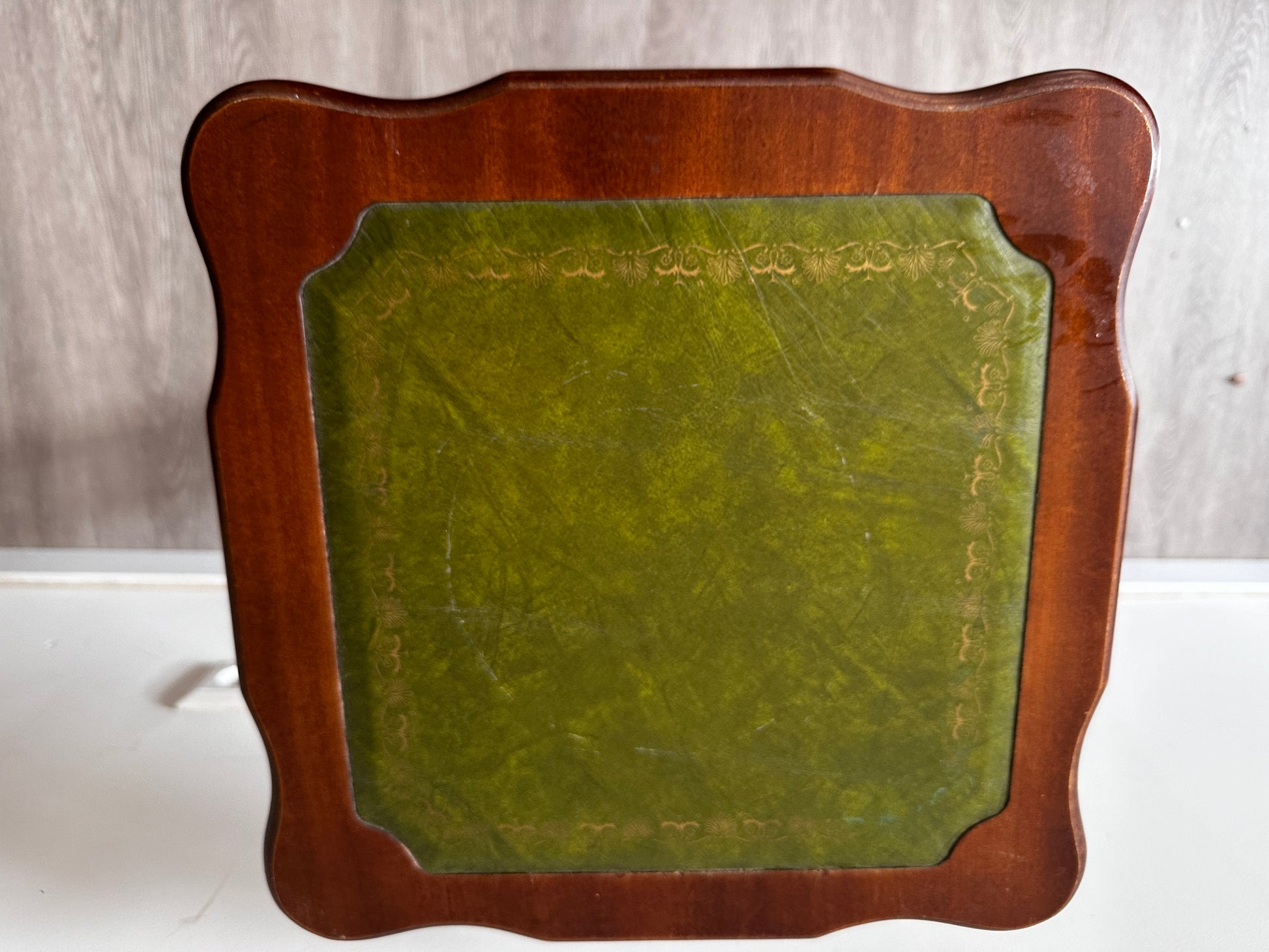 Super leuk vintage wijntafeltje met een groen leren inzetstuk. Het blad is vierkant met licht afgeronde vormen. Tafeltje heeft een centraal gedraaide poot met 3 sierlijk uitlopende poten. Het tafeltje is in een mooie vintage staat met lichte sporen van gebruik.