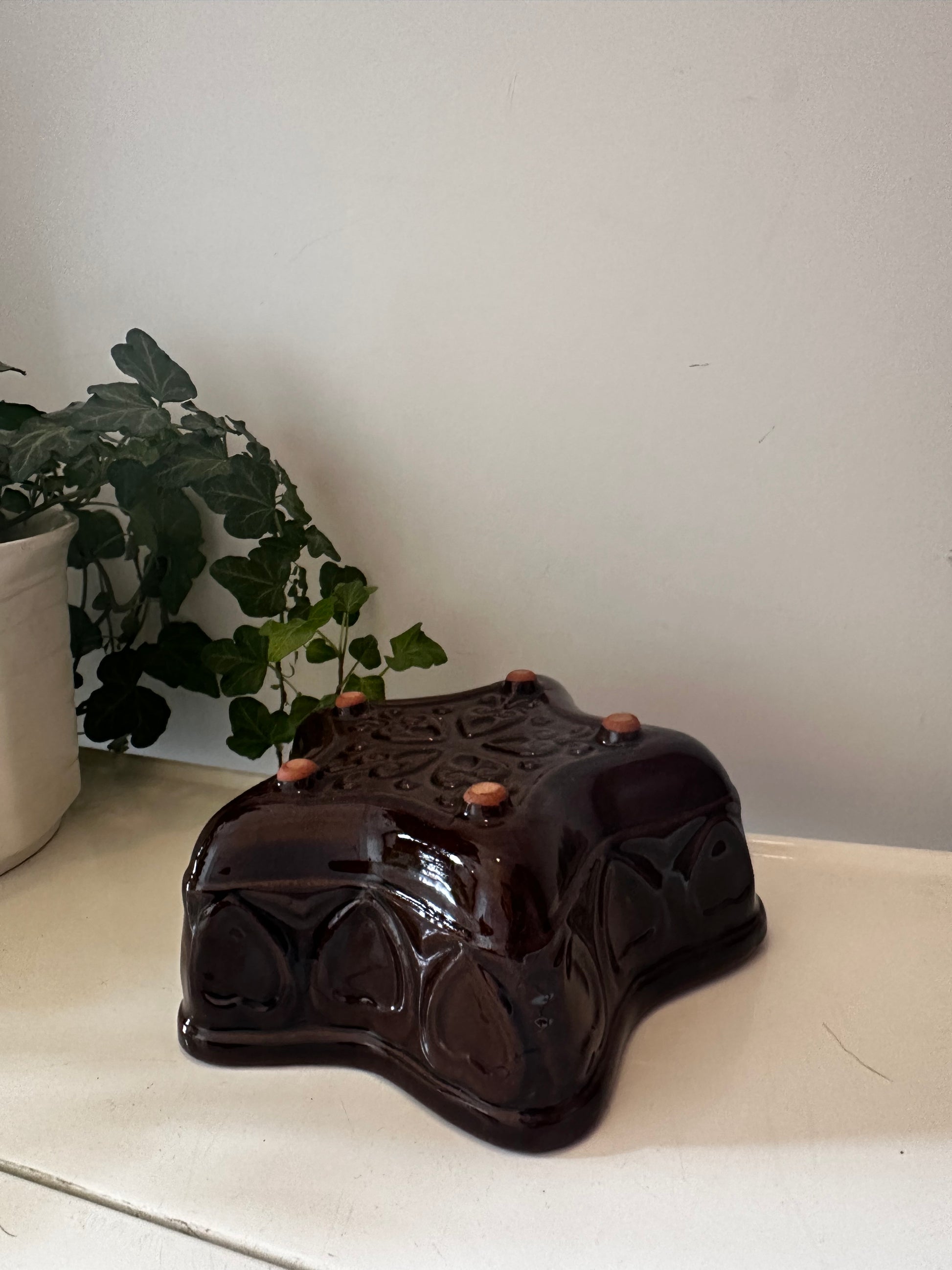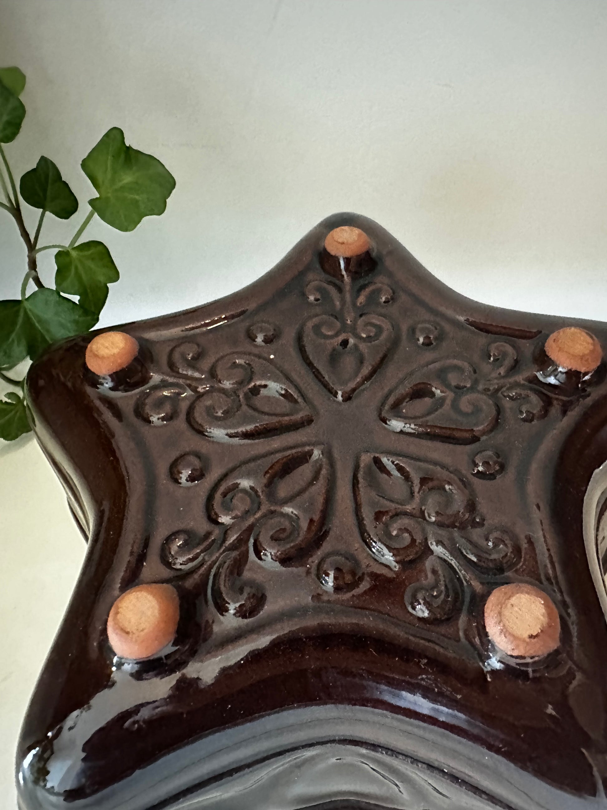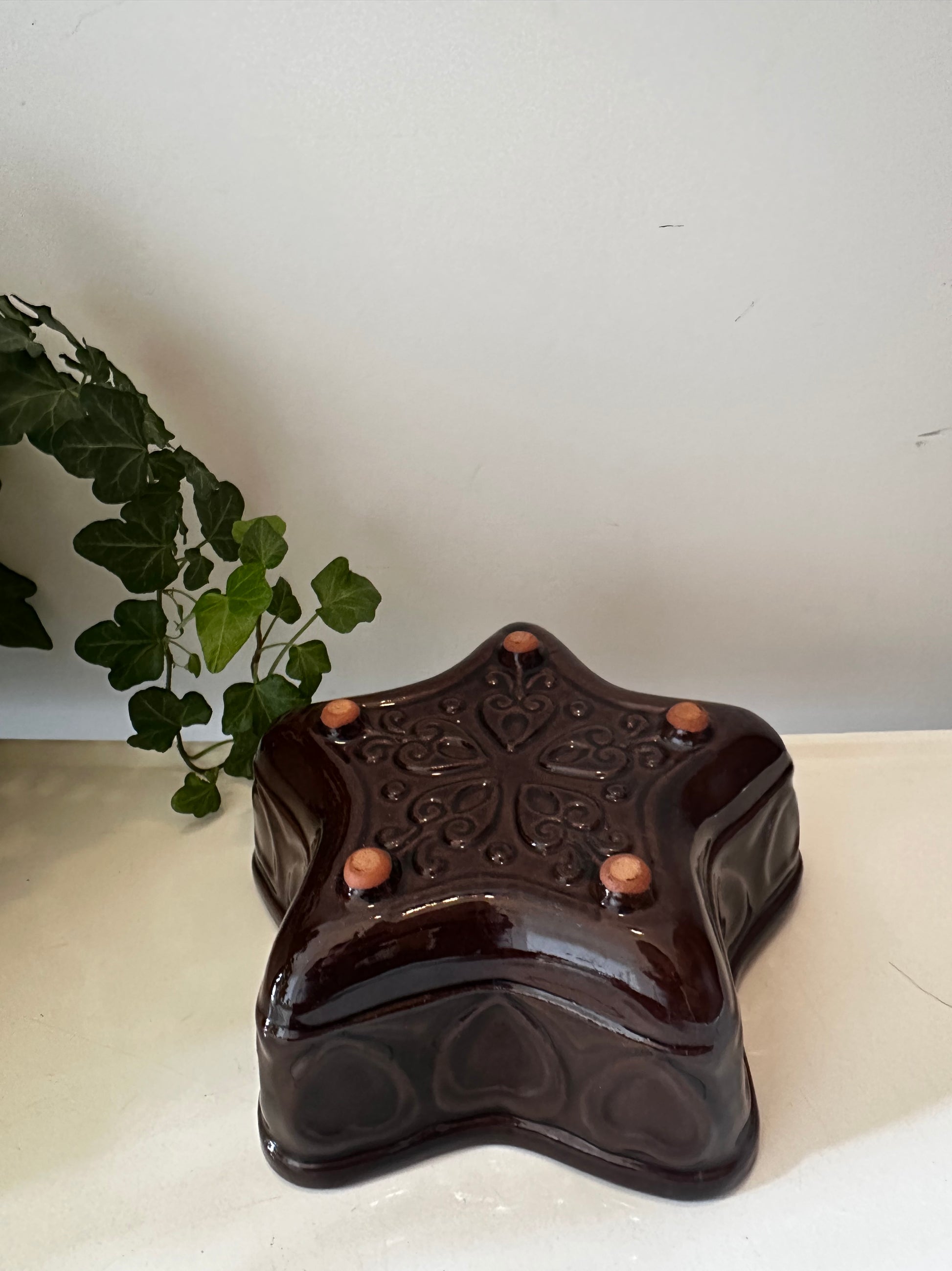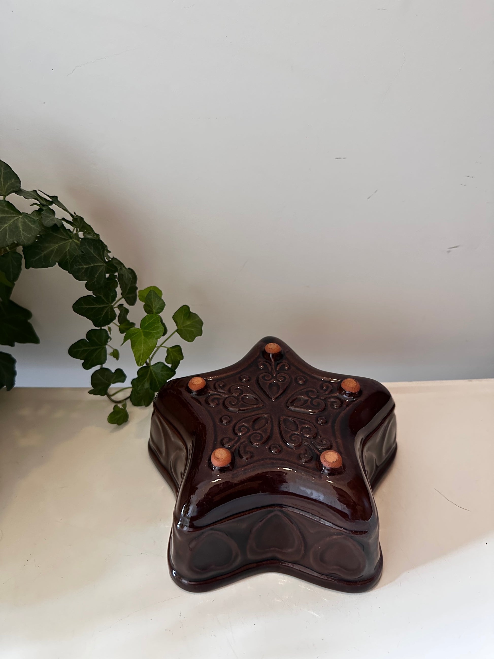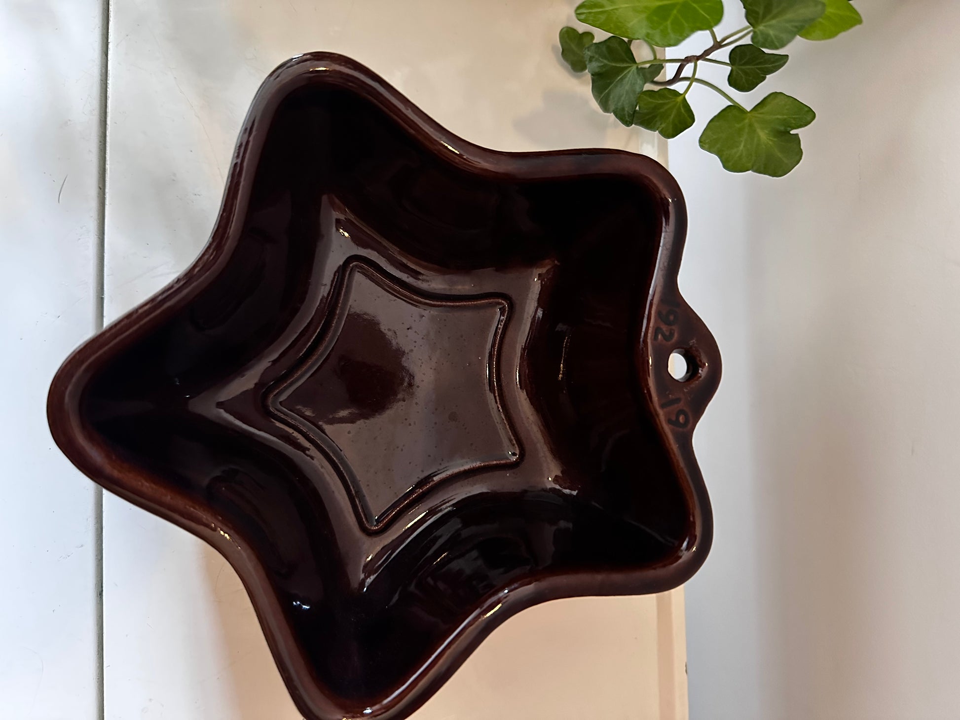 Bijzondere bakvorm van donkerbruin geglazuurd keramiek in de vorm van een ster. Gedecoreerd met reliëfpatroon aan de binnenzijde en typische hartmotieven rondom. Deze vorm komt uit Duitsland en is perfect voor traditionele baksels of als wanddecoratie in een landelijke of vintage keuken. Q942