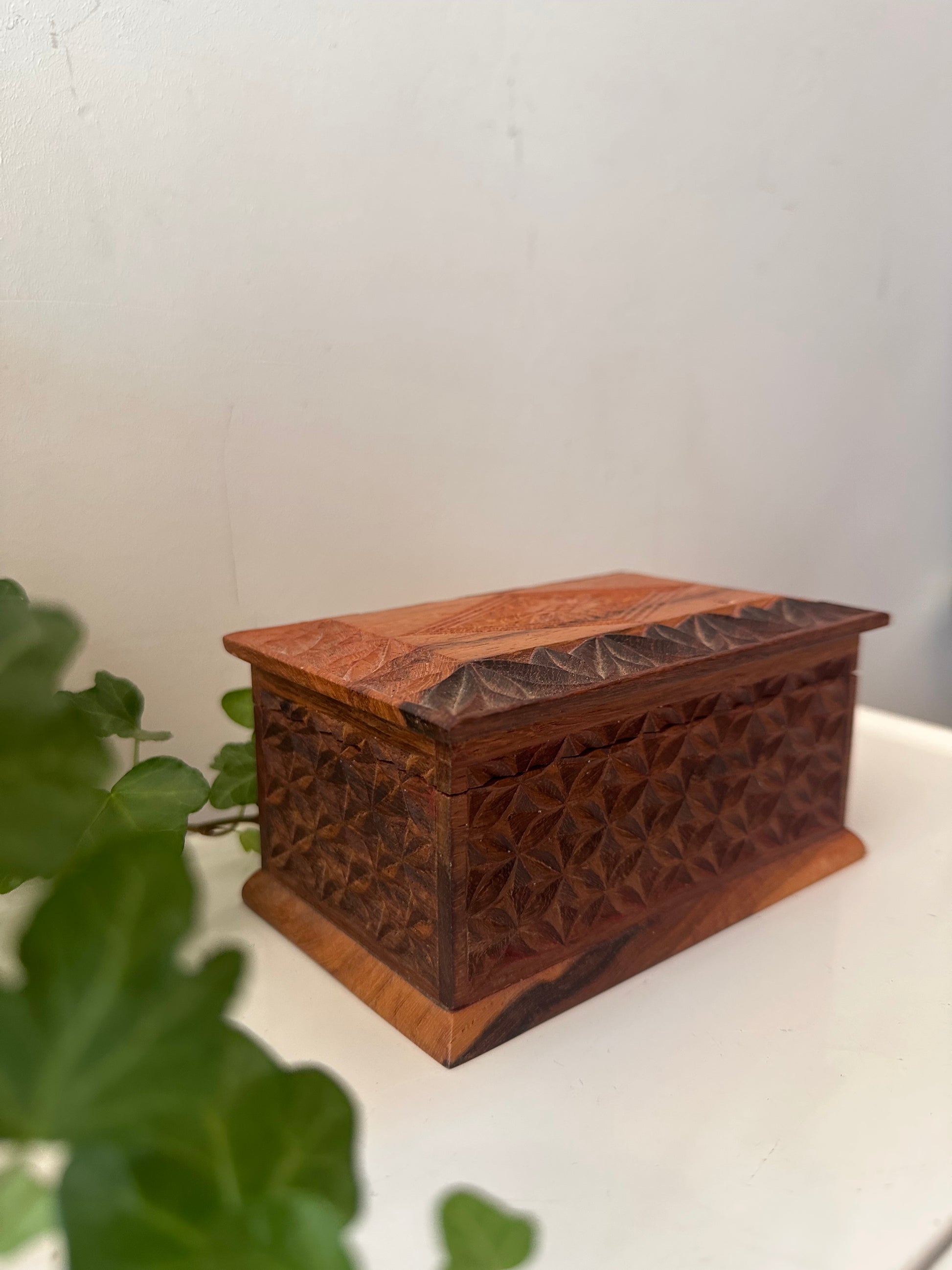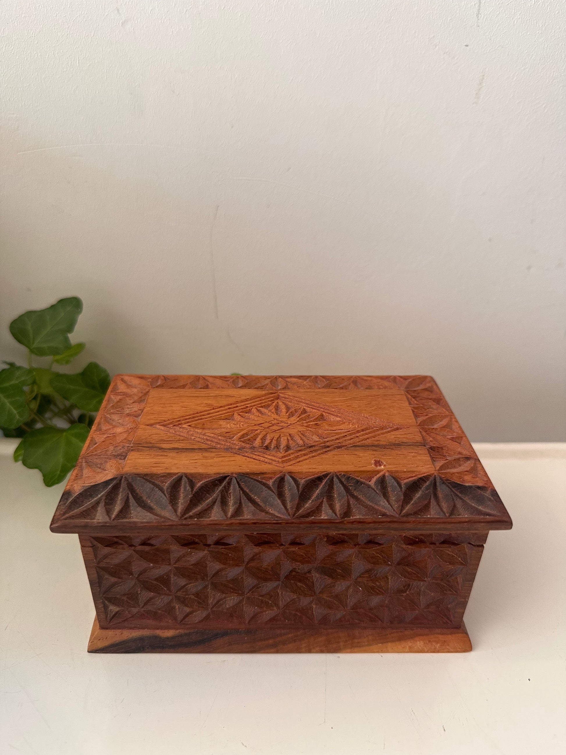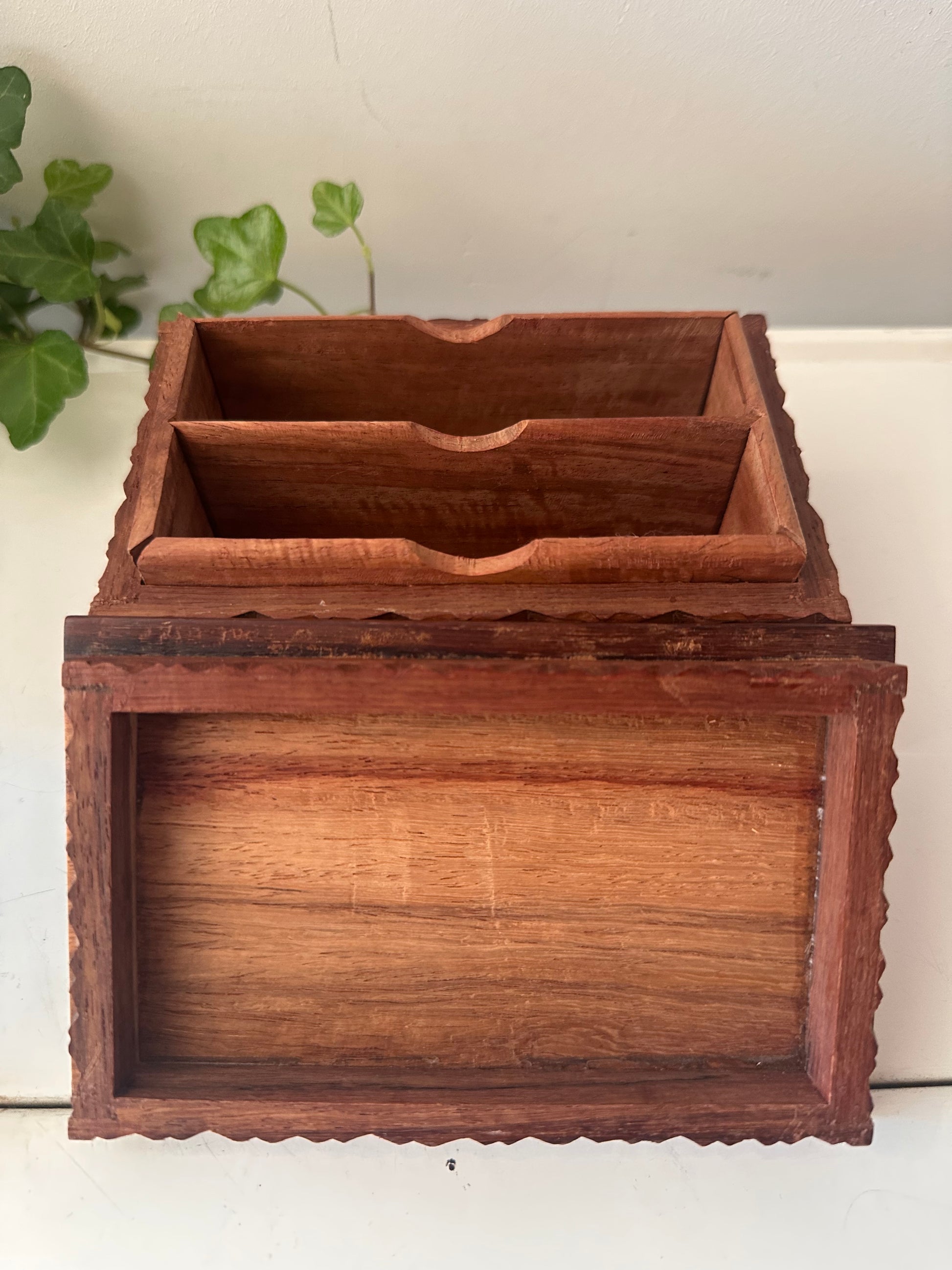 Mooi vintage doosje, gemaakt van hout met uitgesneden geometrisch patroon rondom. Het heeft een warme kleur en binnenin twee vakjes – handig om kleine spulletjes in op te bergen. Q509