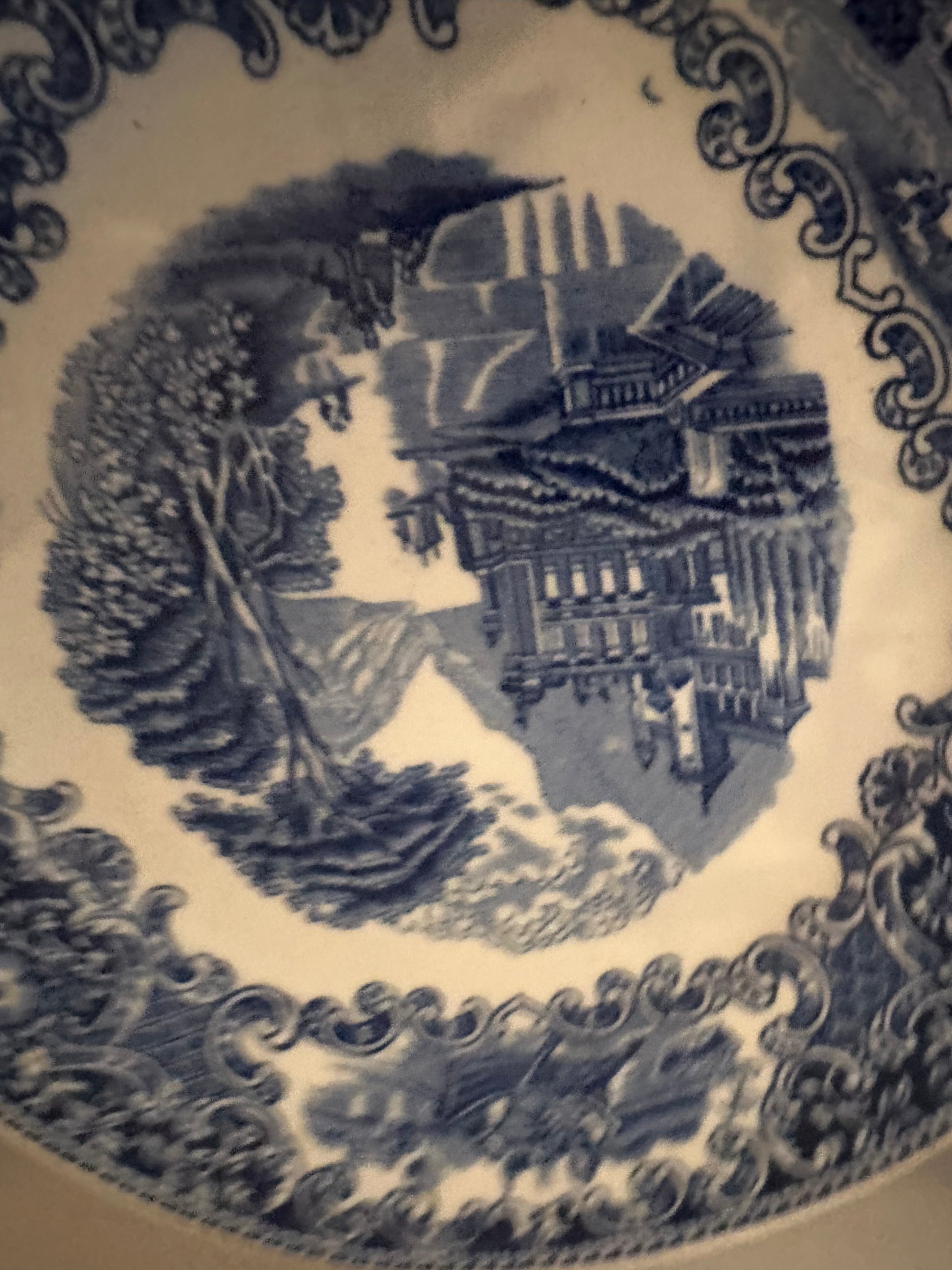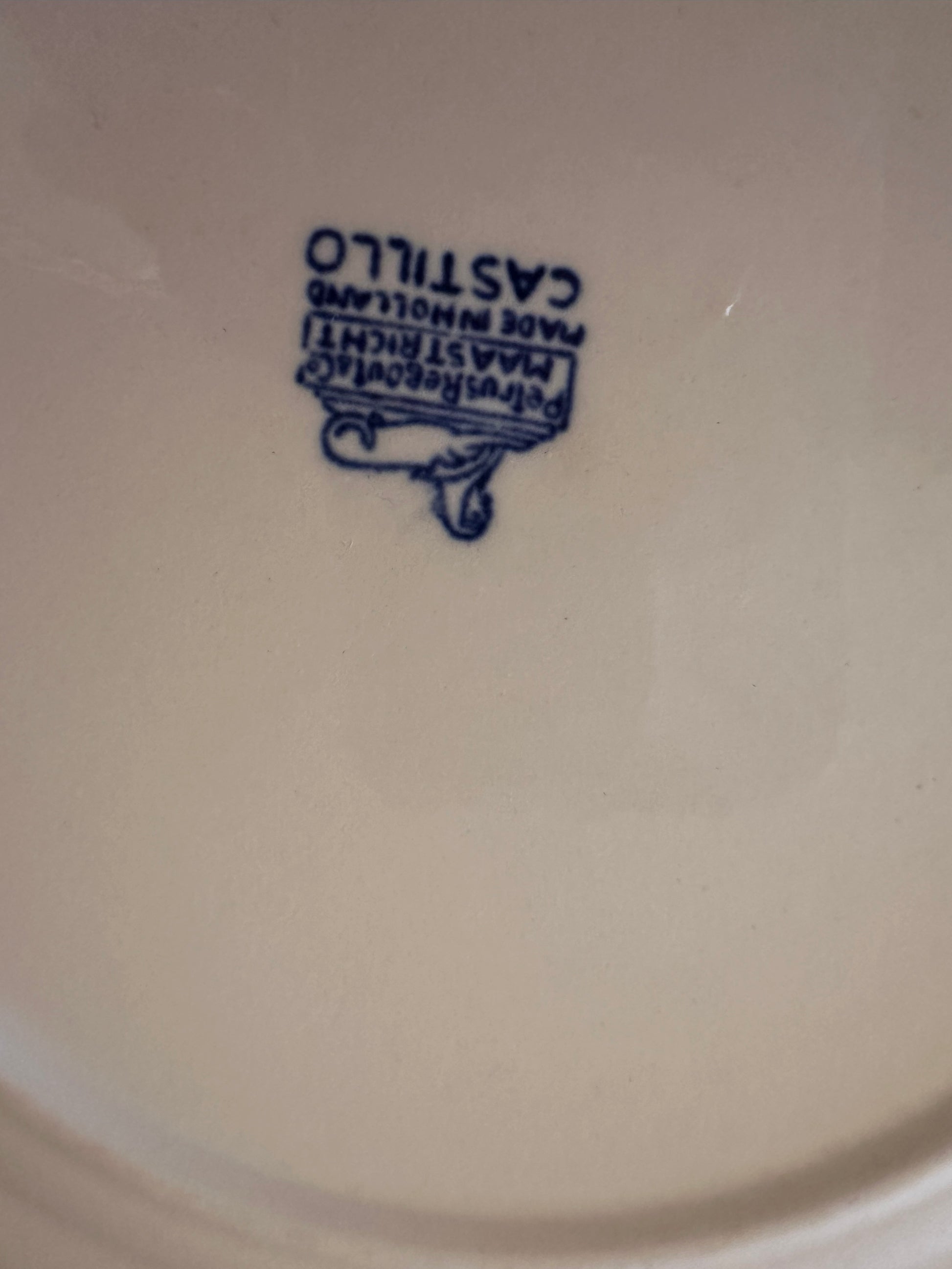 Superleuke set blauw-witte borden van Petrus Regout Maastricht, decor Castillo. Klassiek tafereel met kasteel en sierlijke rand, jaren 60–70 serviesstijl. Mooi voor gebruik, maar ook te gek als mix & match op tafel. Q615