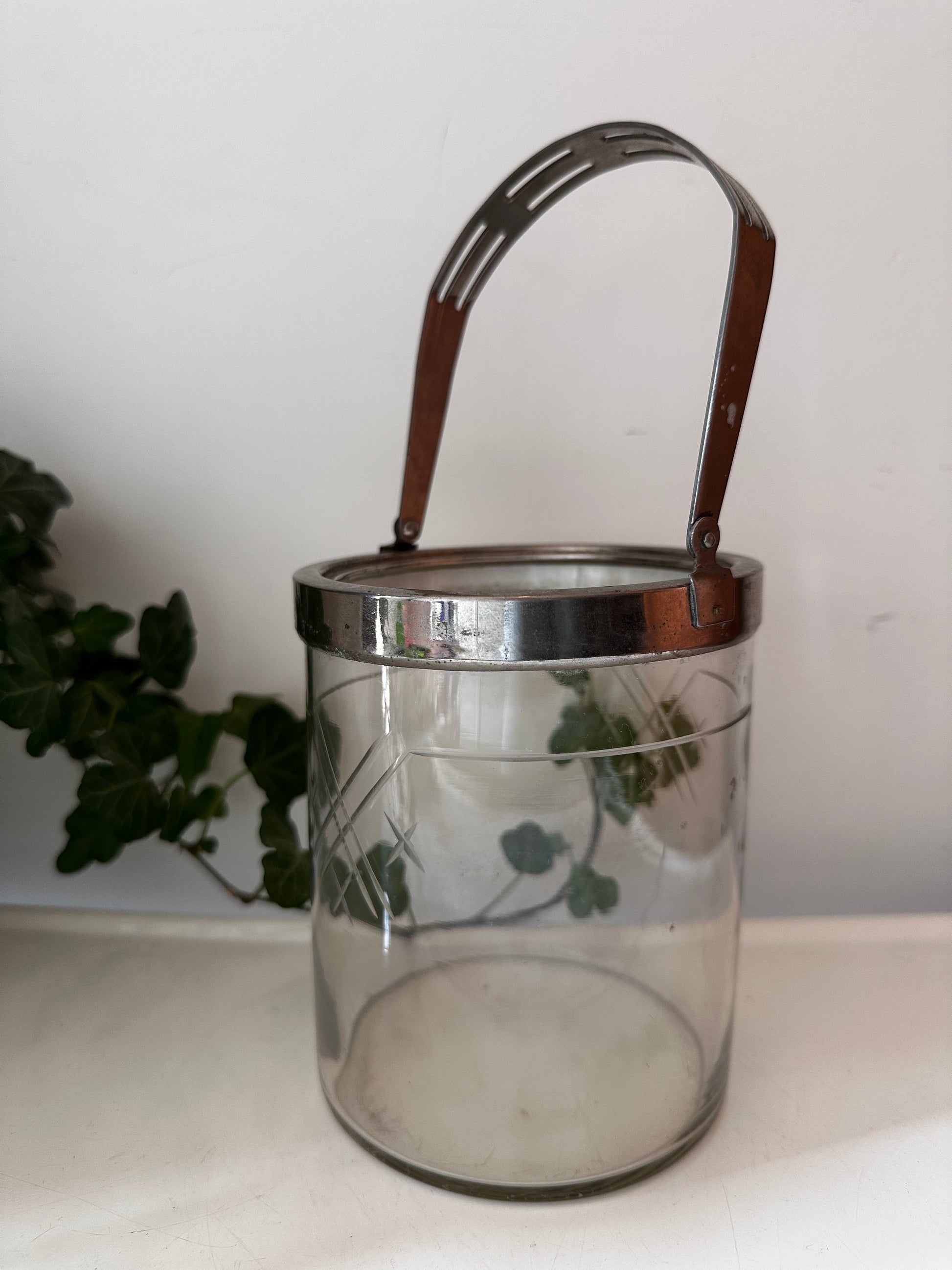 Toffe glazen ijsemmer met subtiele geslepen details en metalen hengsel. Leuk op een barcart of voor een zomerse borrel. Q965