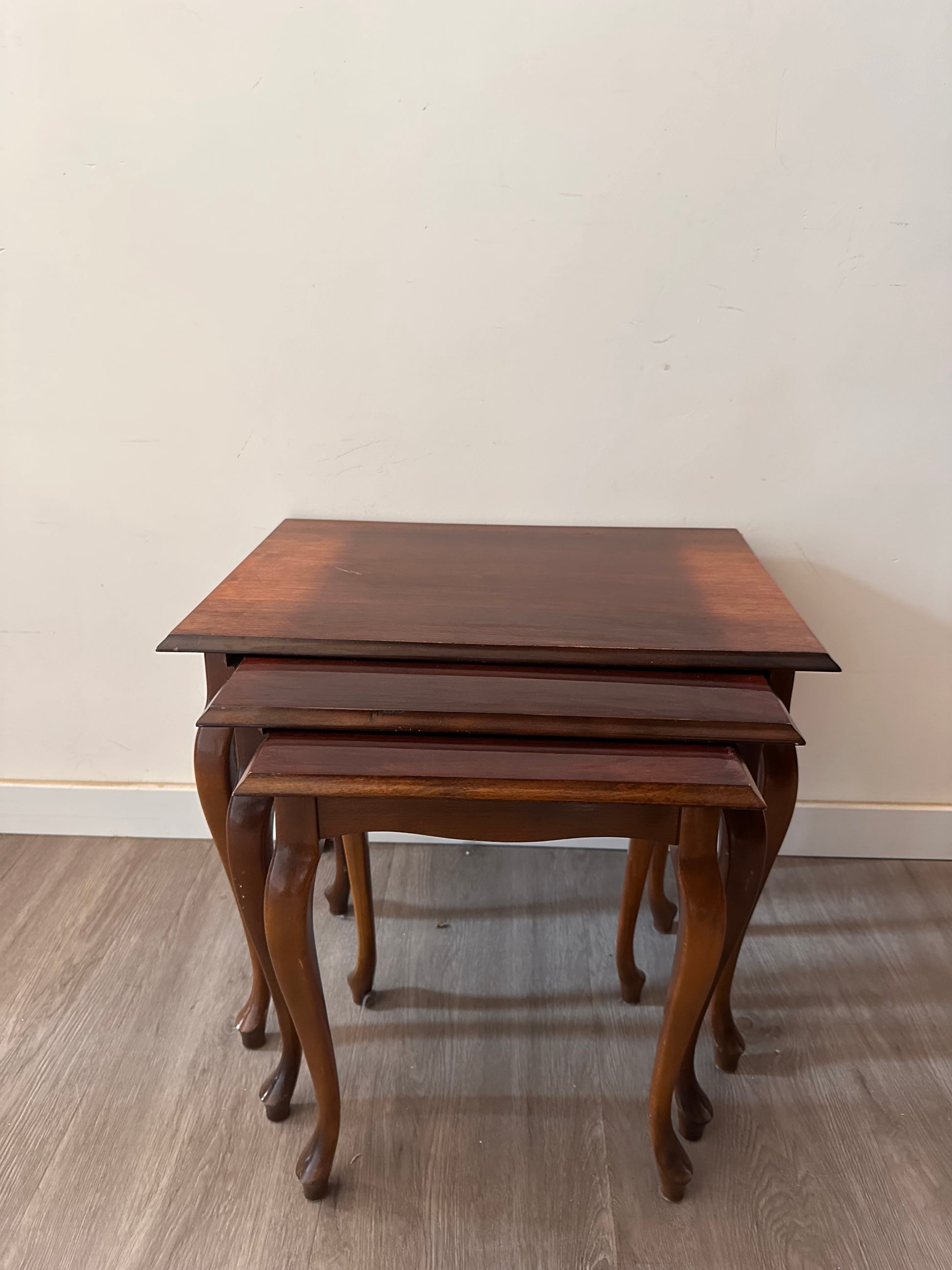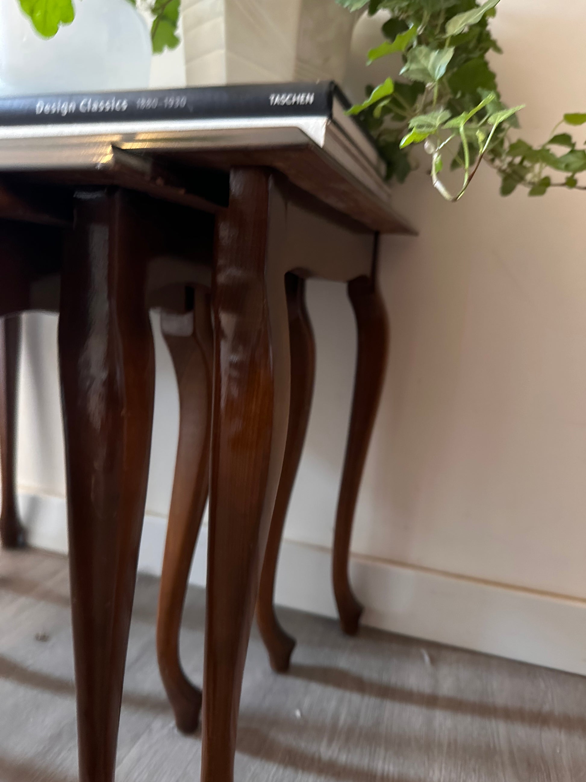 Vintage set bijzettafels uit ca. jaren ’60-’70, uitgevoerd in hout met fineer blad en de typische sierlijke Queen Anne-pootjes. Compact, stijlvol en praktisch – de tafeltjes schuiven makkelijk in elkaar en hebben die mooie klassieke look.