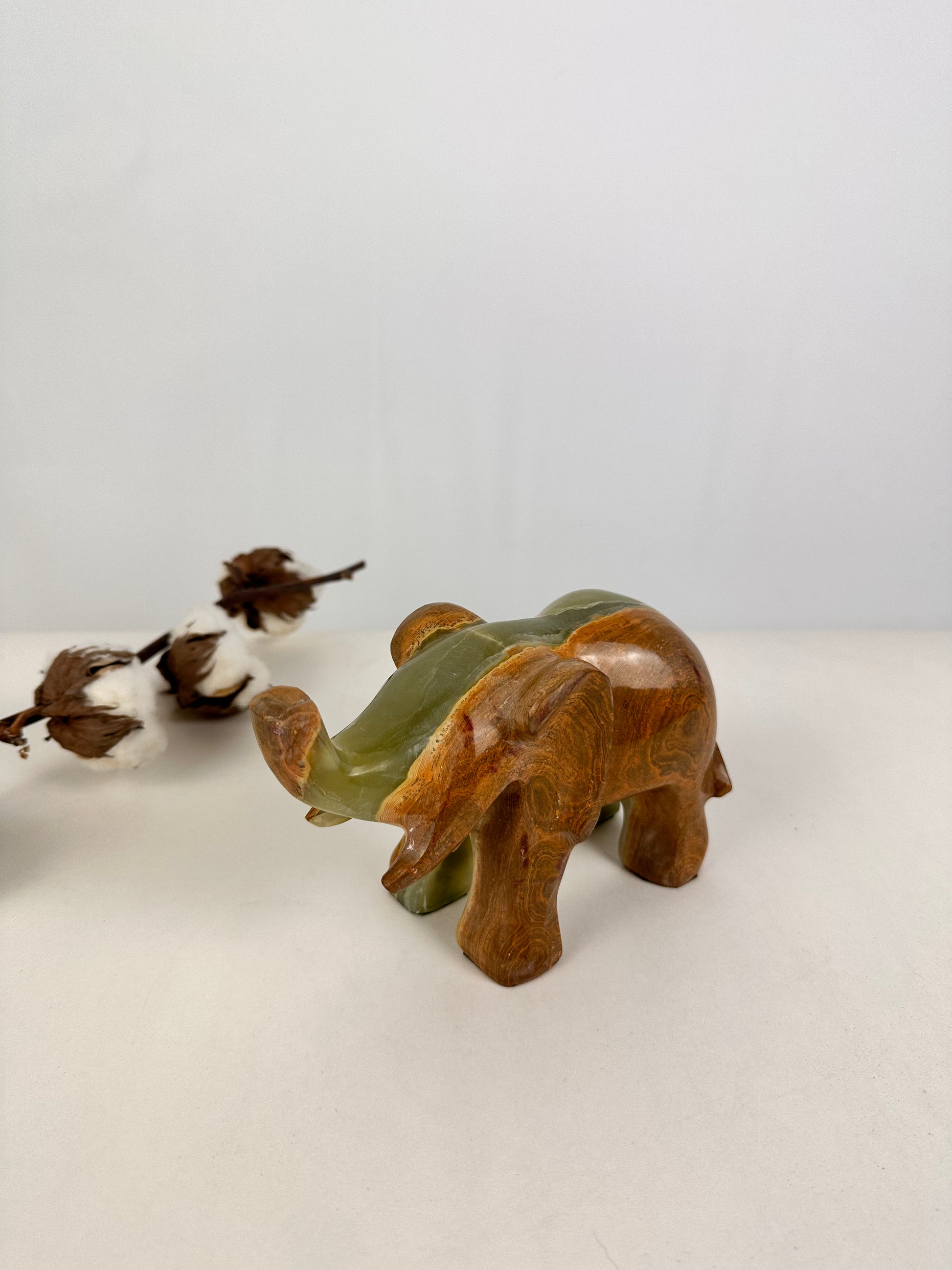 Wat een leukerd dit onyx olifantje. Hij is helemaal gaaf, heeft mooie groen bruine kleuren. Deze knapperd is 11 cm hoog en 16 cm breed.