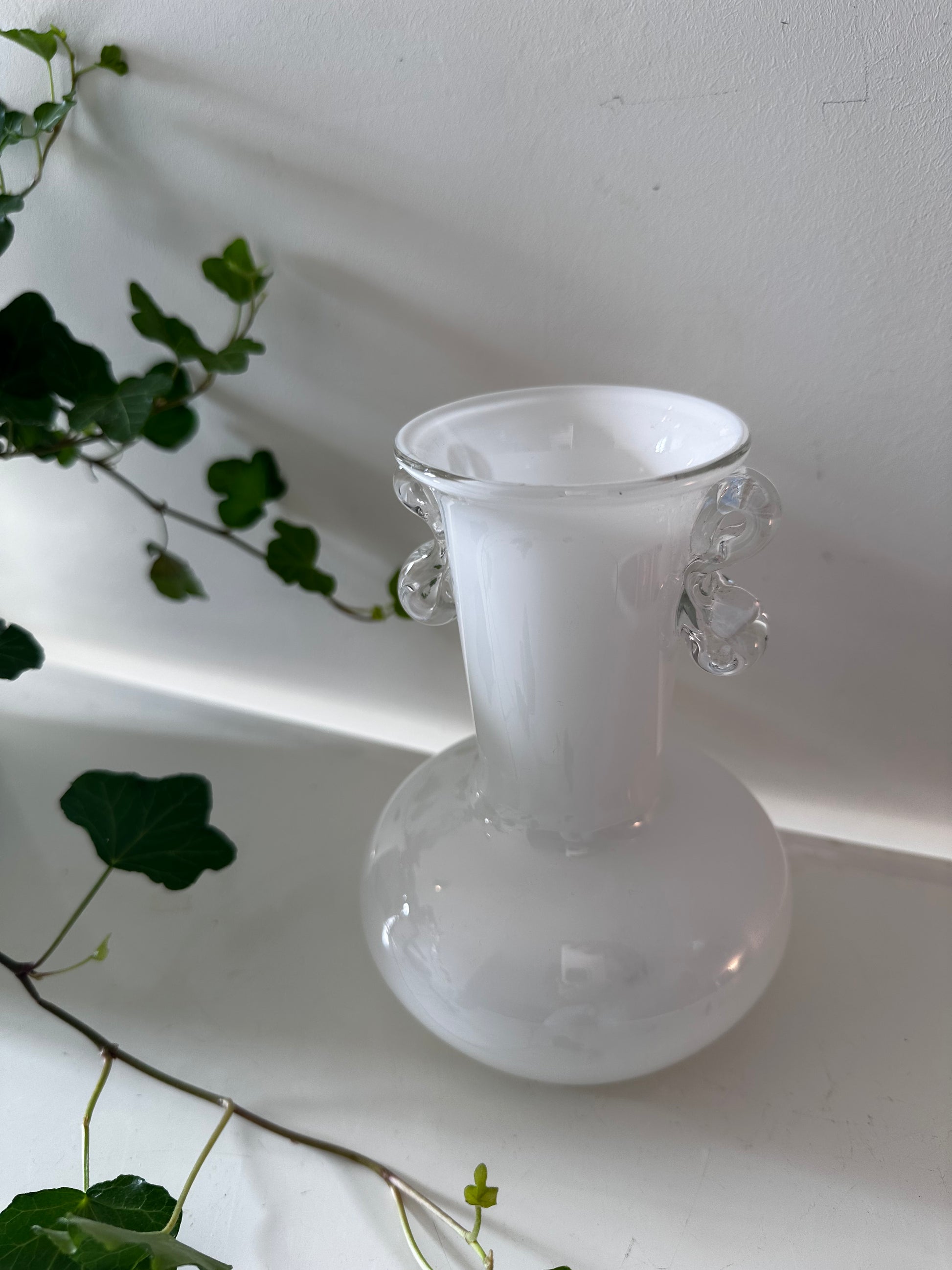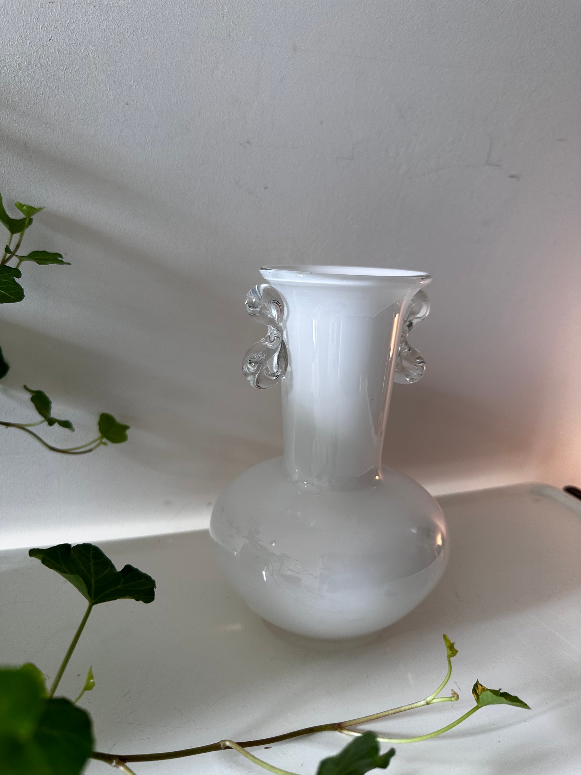 Een plaatje deze vaas. Prachtig wit Opaline glas. Vaas heeft een elegante mooie vorm. Bol onder en dan slank uitlopend naar de hals. Aan de zijkant van transparant glas twee fraaie handvaatjes.
